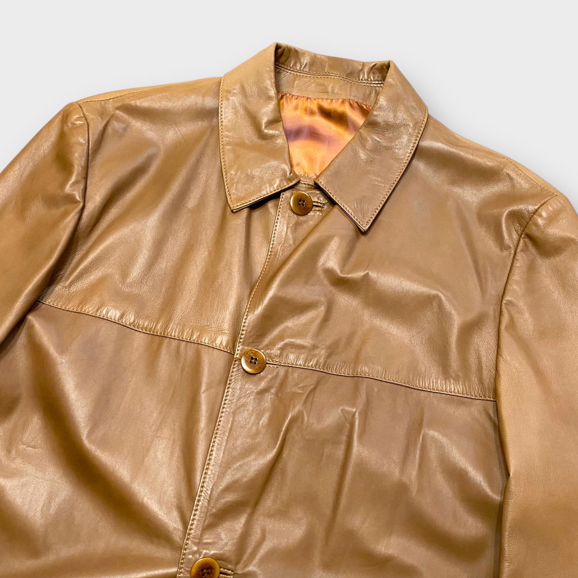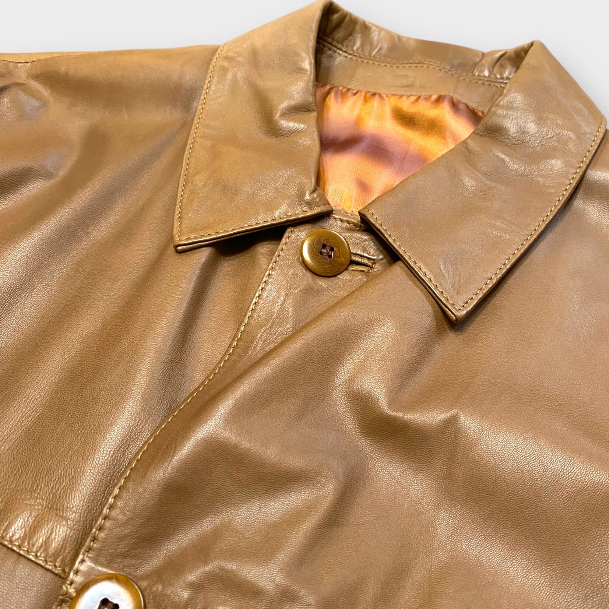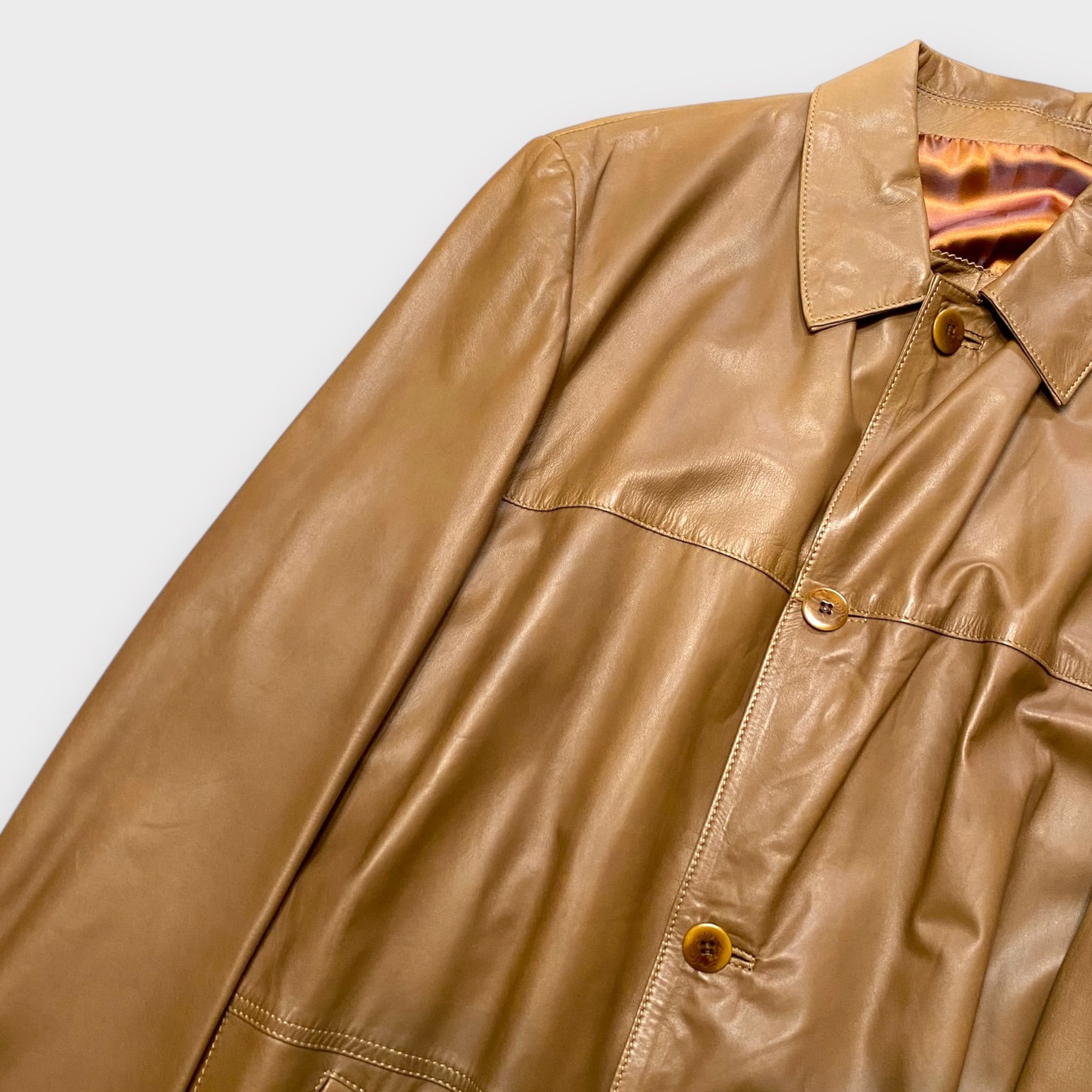 贅沢な質感が魅力の「80s- best unique smooth leather jacket」は、一際目を引く一着です。このレザージャケットは、非常に上質なレザーを使用しており、鮮やかなタマムシのライニングが施されています。その美しい配色と洗練されたデザインが、独自のスタイルを演出します。