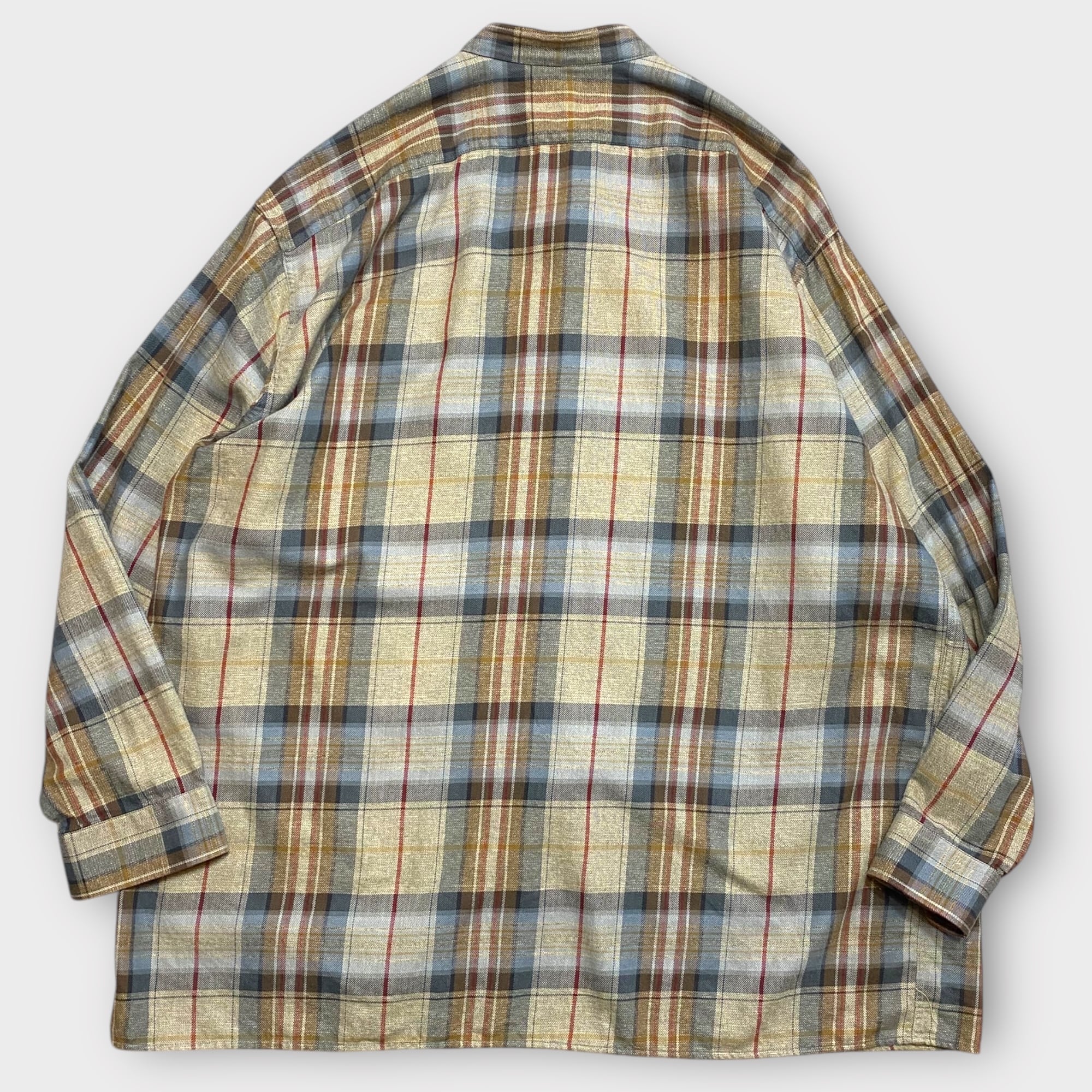 落ち着いたベージュ系のチェック柄が美しいスタンドカラーシャツです。このシャツは、ビッグサイズでデザインされており、裾はスクエアカットになっています。