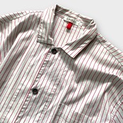 00s DKNY stripe pajamas setupは、ライトグレーベースに赤いストライプが美しい洗練されたパジャマです。ゆったりめのサイジングが特徴で、パンツには便利なポケットとボタンフライが付いており、街着としても活躍するアイテムです。