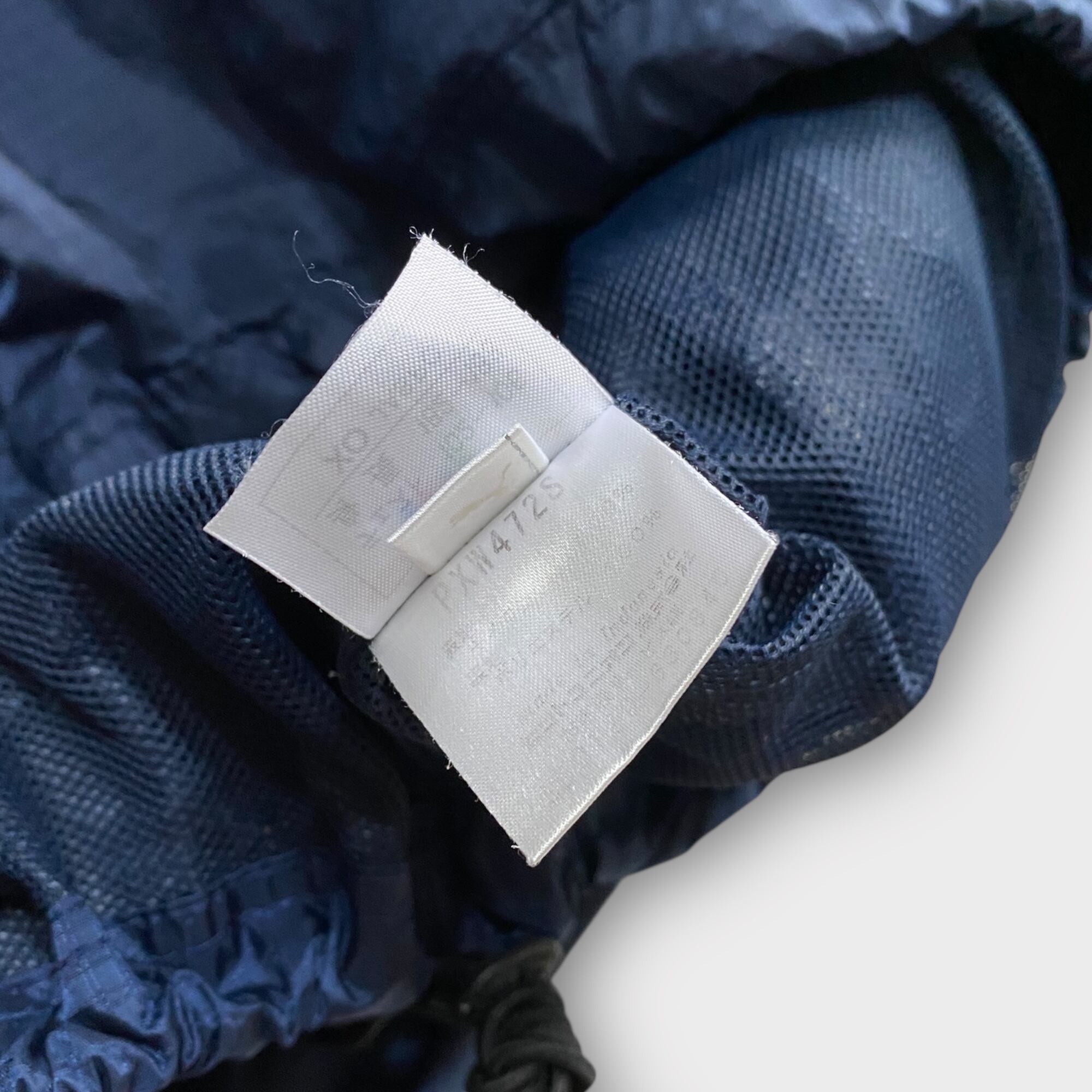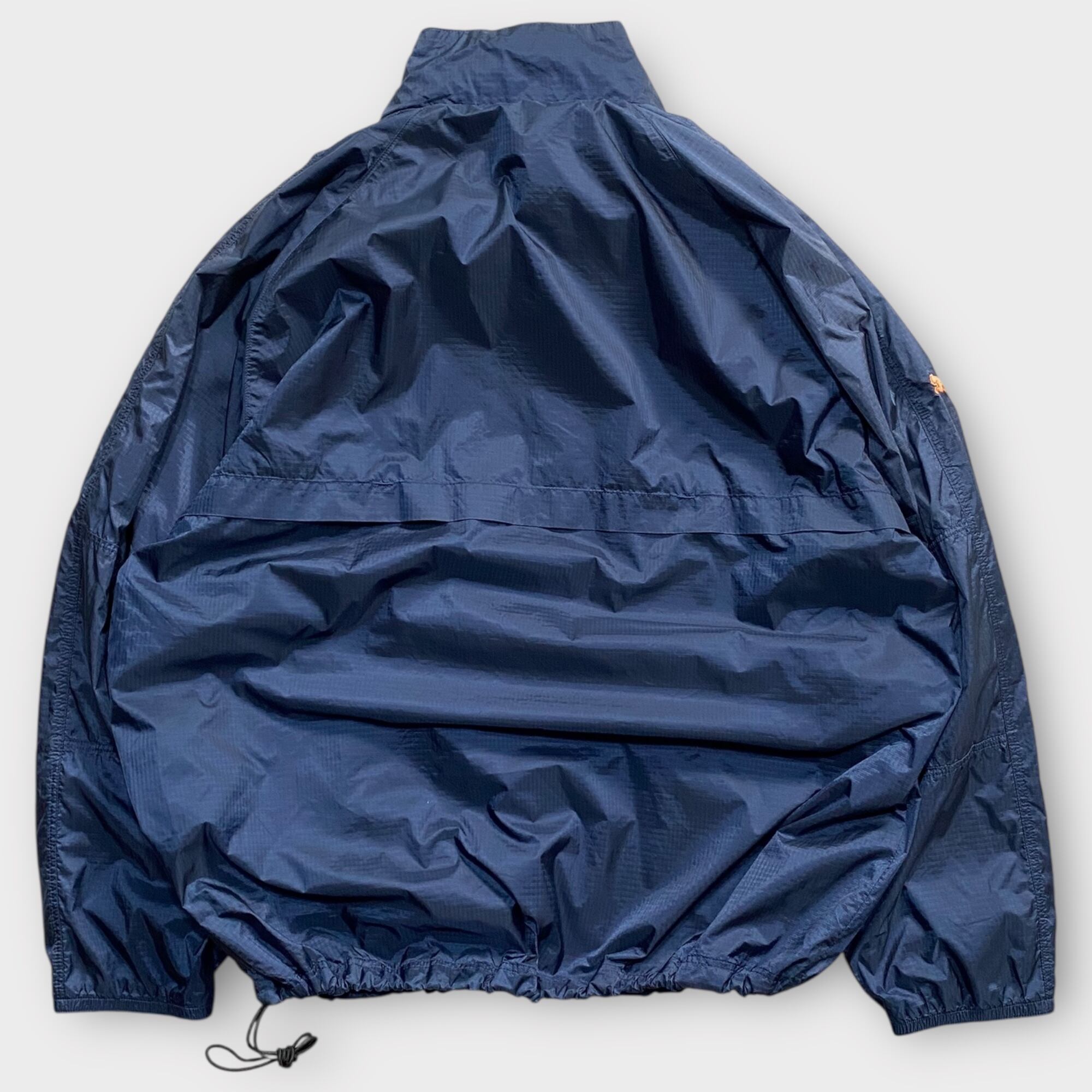 90s- puma pullover nylon ジャケットは、襟から八の字に開く斬新なジップが魅力のナイロンプルオーバーです。ネイビーをベースにしたオレンジの配色が印象的で、懐かしさと新しさが融合したデザインが特徴です。