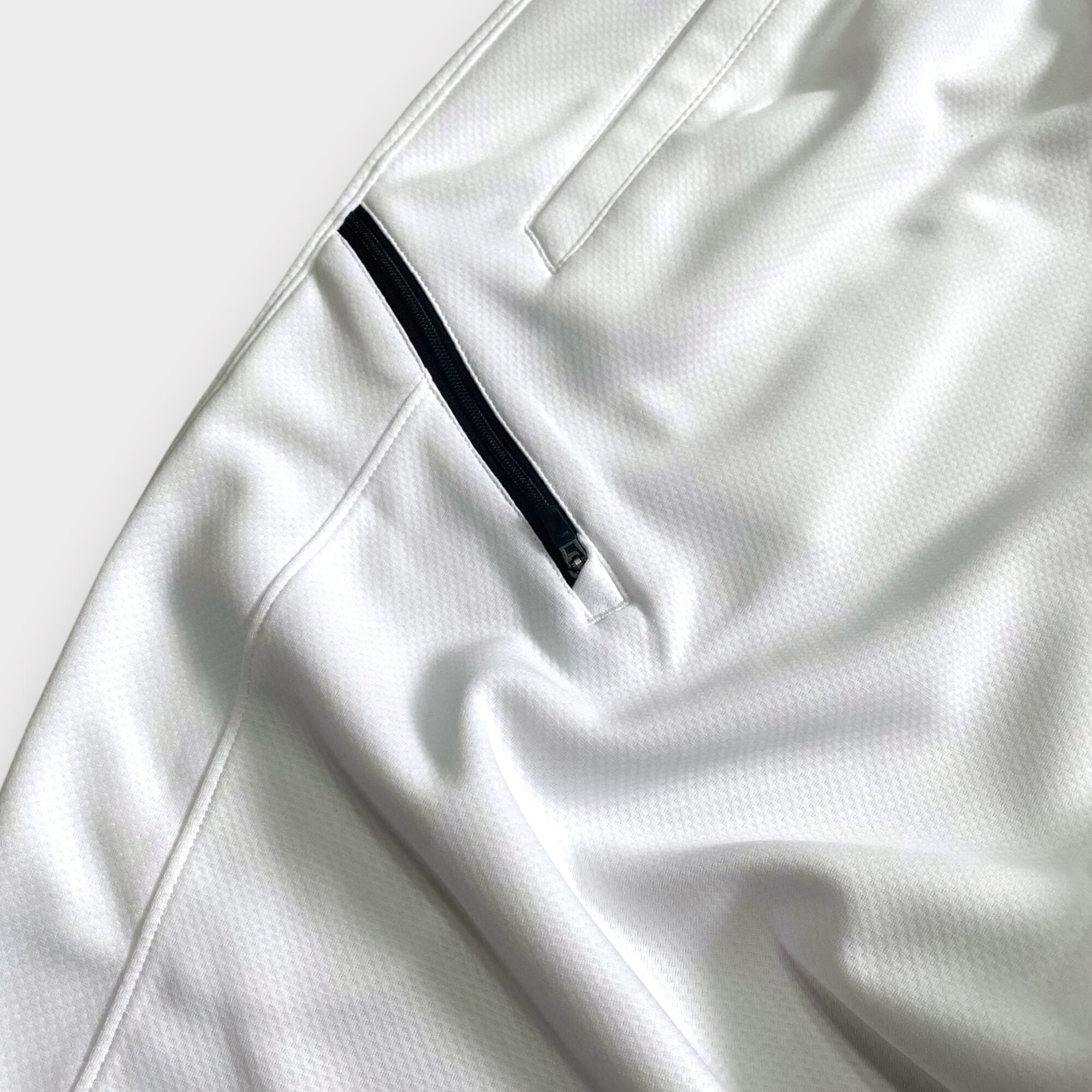 爽やかでトレンディな印象を与える00s- nike white mesh shortsは、長めのレングスが魅力的なナイキのメッシュショーツです。斜めのジップとスウッシュがさりげなくも際立つデザインで、あらゆるシーンでのスタイリングにアクセントを加えます。