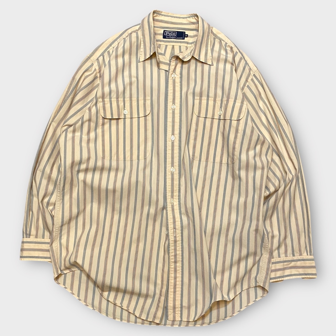 クラシックな魅力を感じる90s- polo ralph stripe shirtは、柔らかなベージュベースのストライプが特徴の一着です。小ぶりな襟や両胸のフラップポケットがデザインのアクセントとなり、シンプルながらも洗練された印象を与えます。