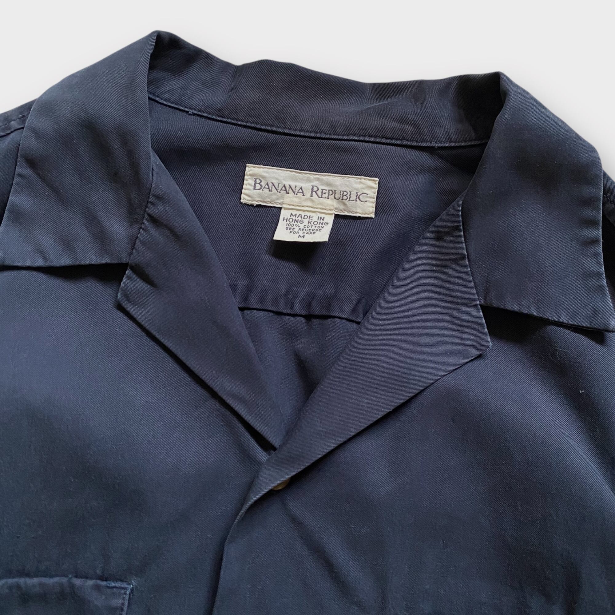 洗練されたネイビーカラーが印象的な90s- BANANA REPUBLICのコットンオープンカラーシャツは、長袖と両フラップポケットが特徴的な一着です。ラウンドの裾がスタイルに動きを与え、さらなる魅力を引き立てています。