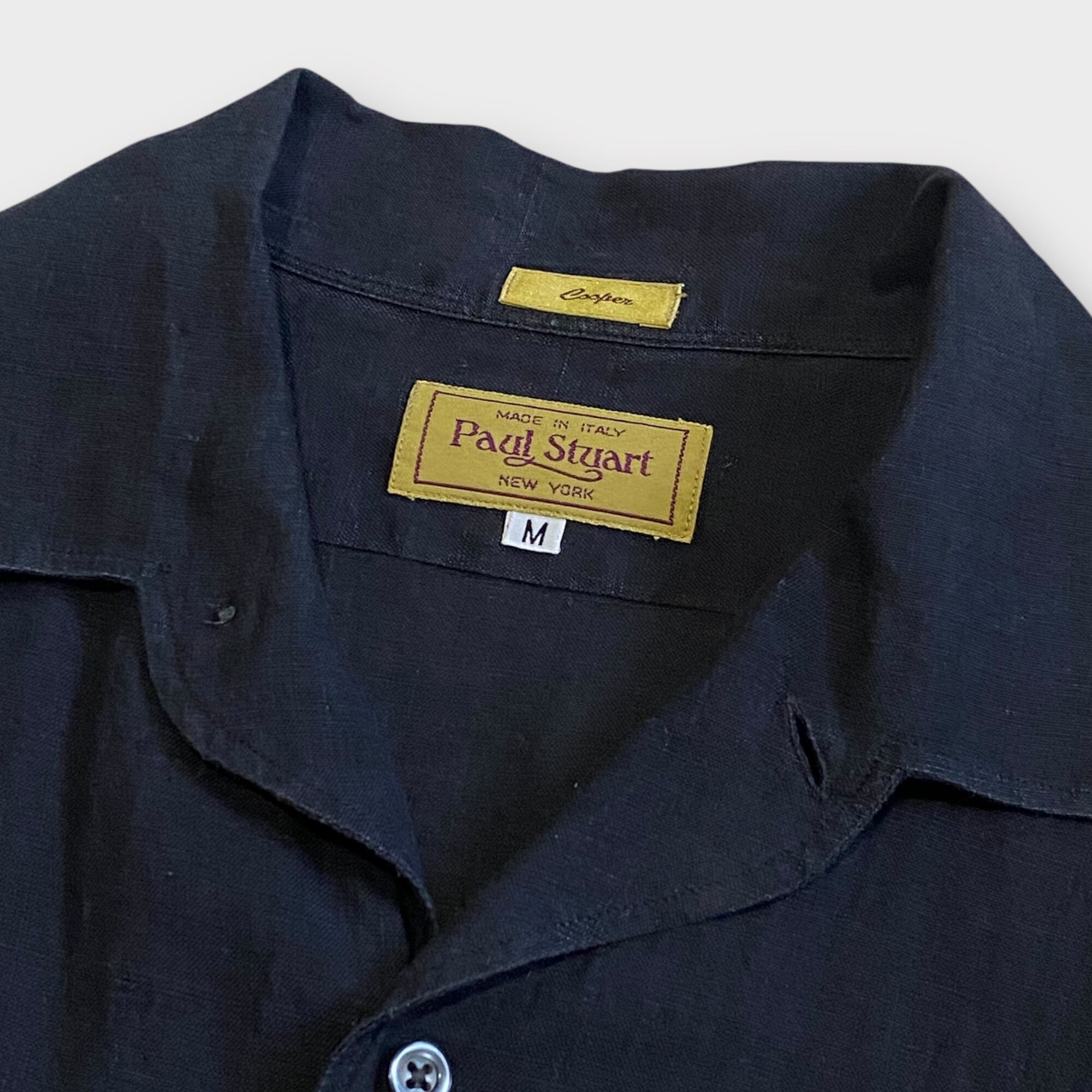 洗練されたイタリア製の90s- paul stuart black linen shirtは、上質なブラックリネン素材が魅力のオープンカラー長袖シャツです。このシャツは、90年代のスタイルをリッチに再現しており、トレンドに敏感なあなたのワードローブにぴったりの一着です。