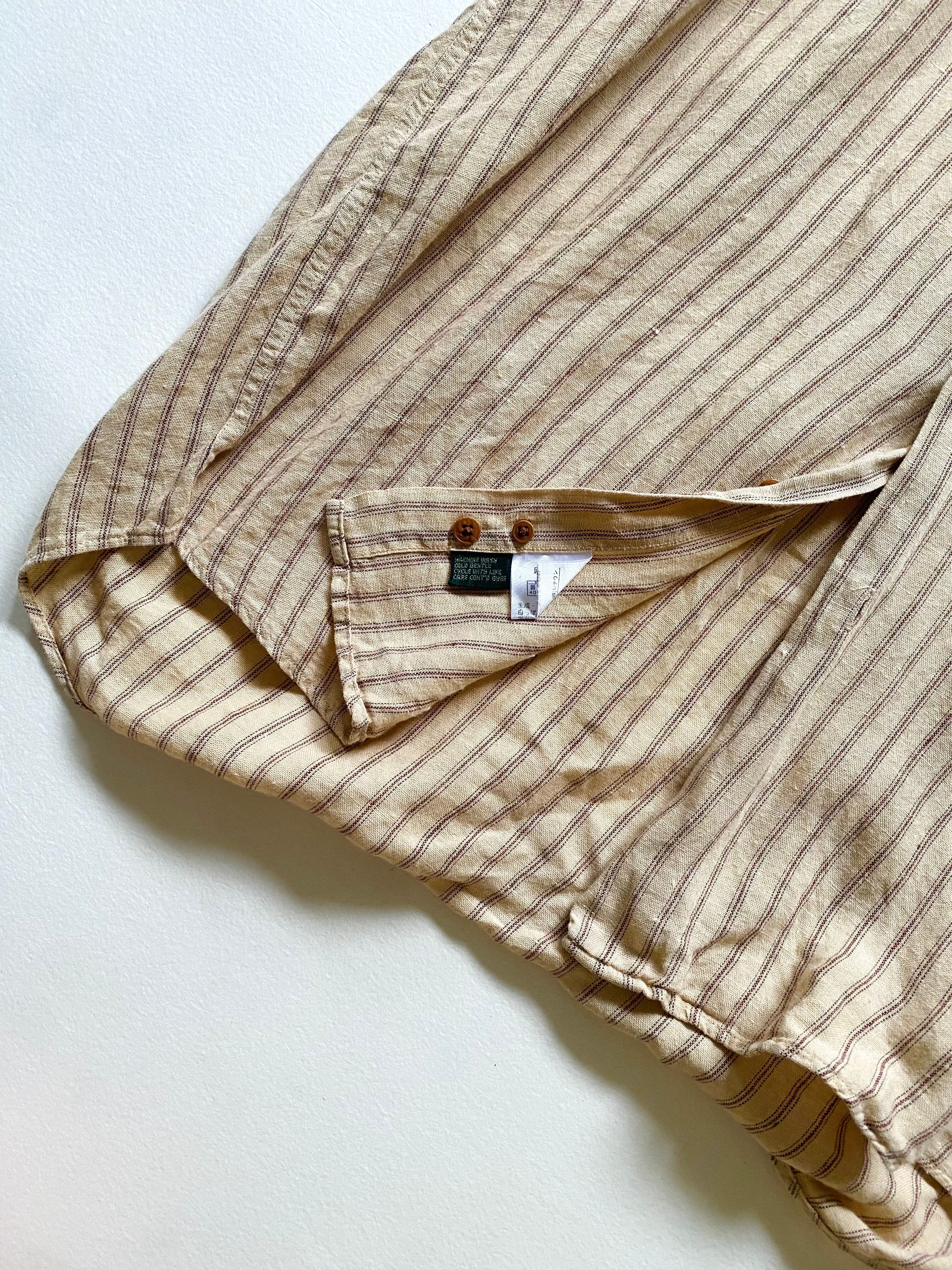 90s- j.crew linen stripe shirtは、ベージュベースに施されたストライプが印象的なリネンのスタンドカラーシャツです。リネン特有のネップ感が加わり、一層の雰囲気を醸し出しています。シンプルながらも洗練されたデザインは、様々なスタイリングにマッチします。