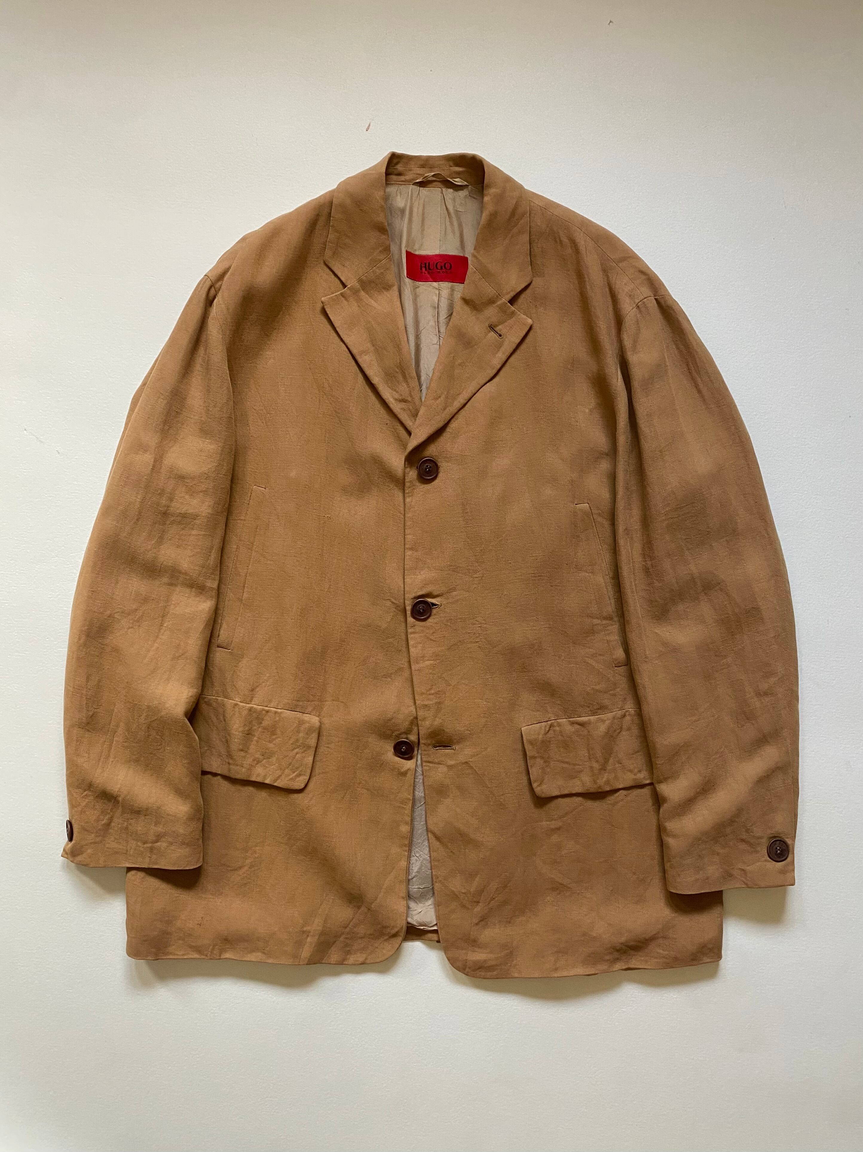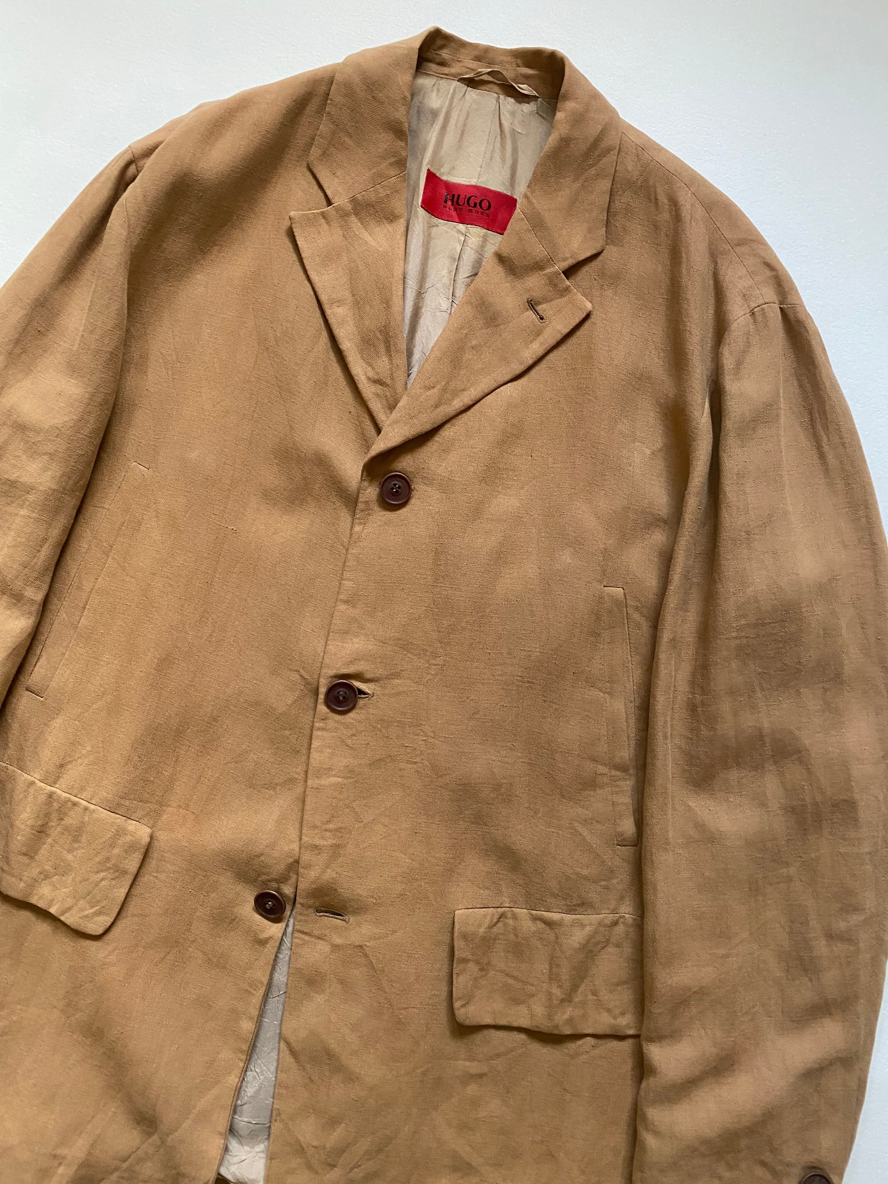 HUGO BOSSのウールリネン3Bジャケットは、洗練されたデザインと素晴らしいクオリティを兼ね備えた一着です。軽やかな生地感が特徴で、よく見るとヘリンボーンの織りが施され、さりげないお洒落を演出します。ハンドウォーマーポケットがついており、ハーフコートのように着用できるため、季節やシーンに応じてアレンジが効くのも魅力です。