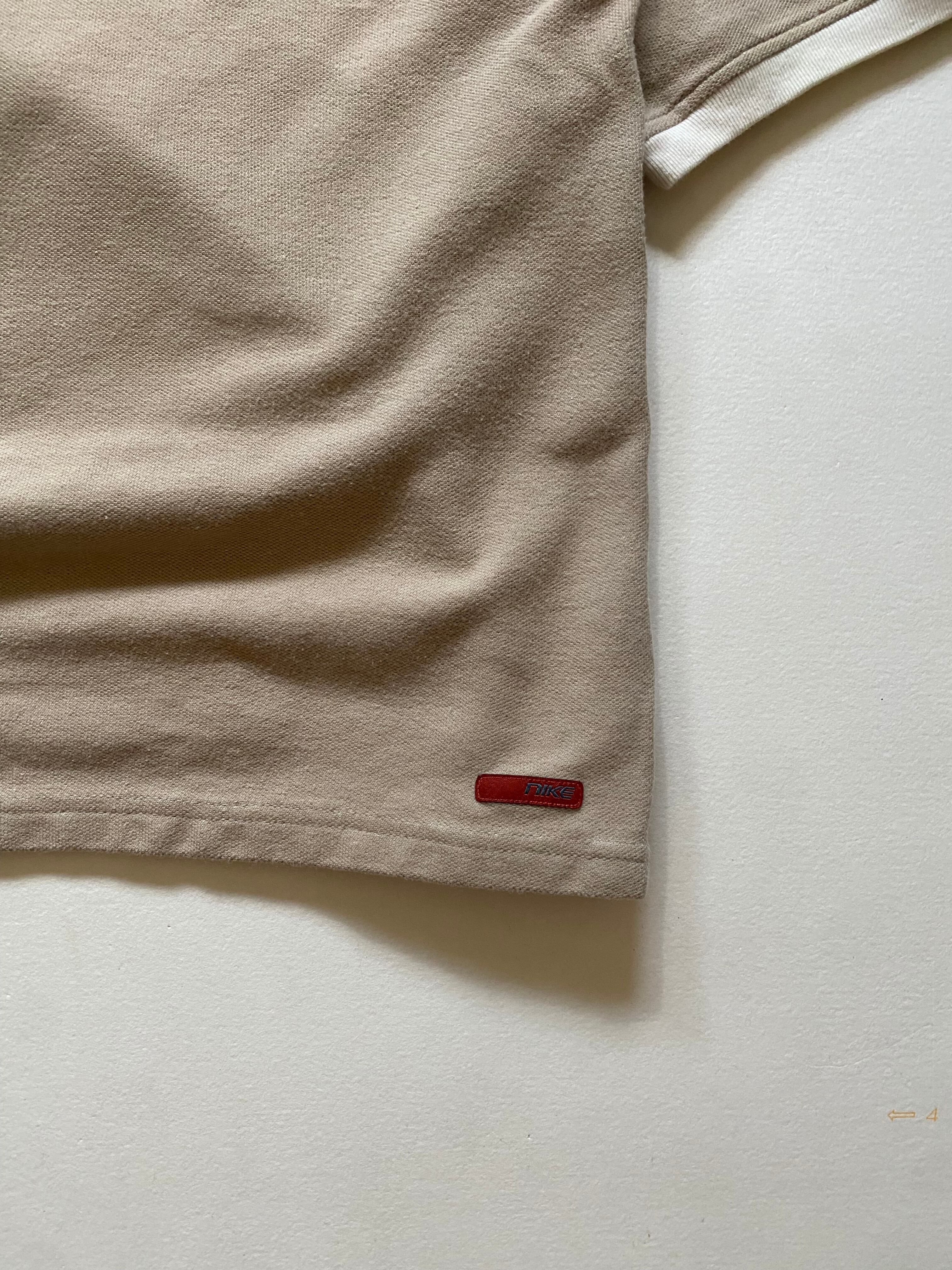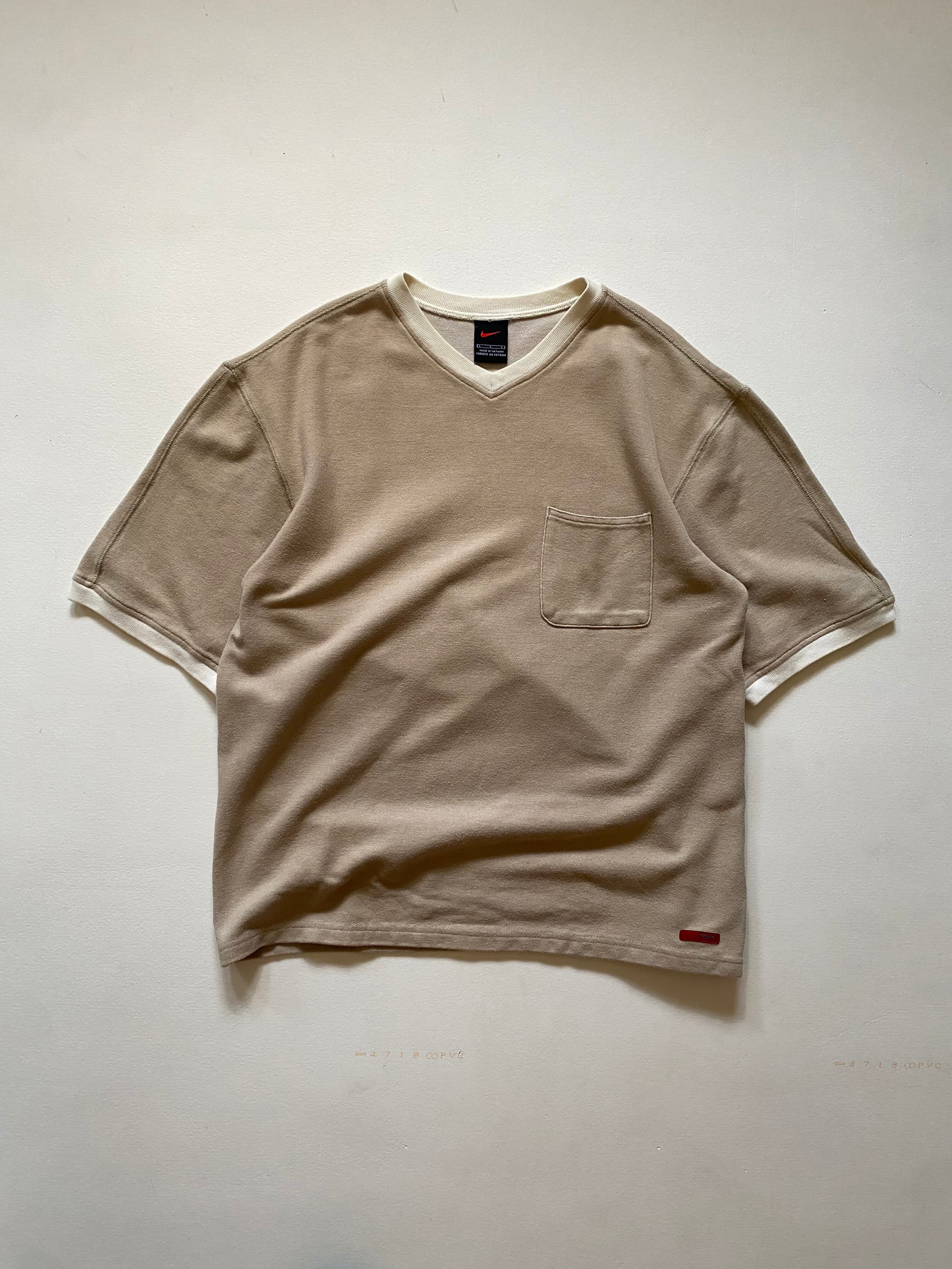 絶妙なベージュカラーとお洒落なツートントリムが魅力の00s- Nike VネックTシャツ。ポケットや肩のスウッシュがアクセントとなり、細部にまでこだわった一枚です。このTシャツは、シンプルながらもおしゃれを楽しむことができ、幅広いコーディネートに対応できます。