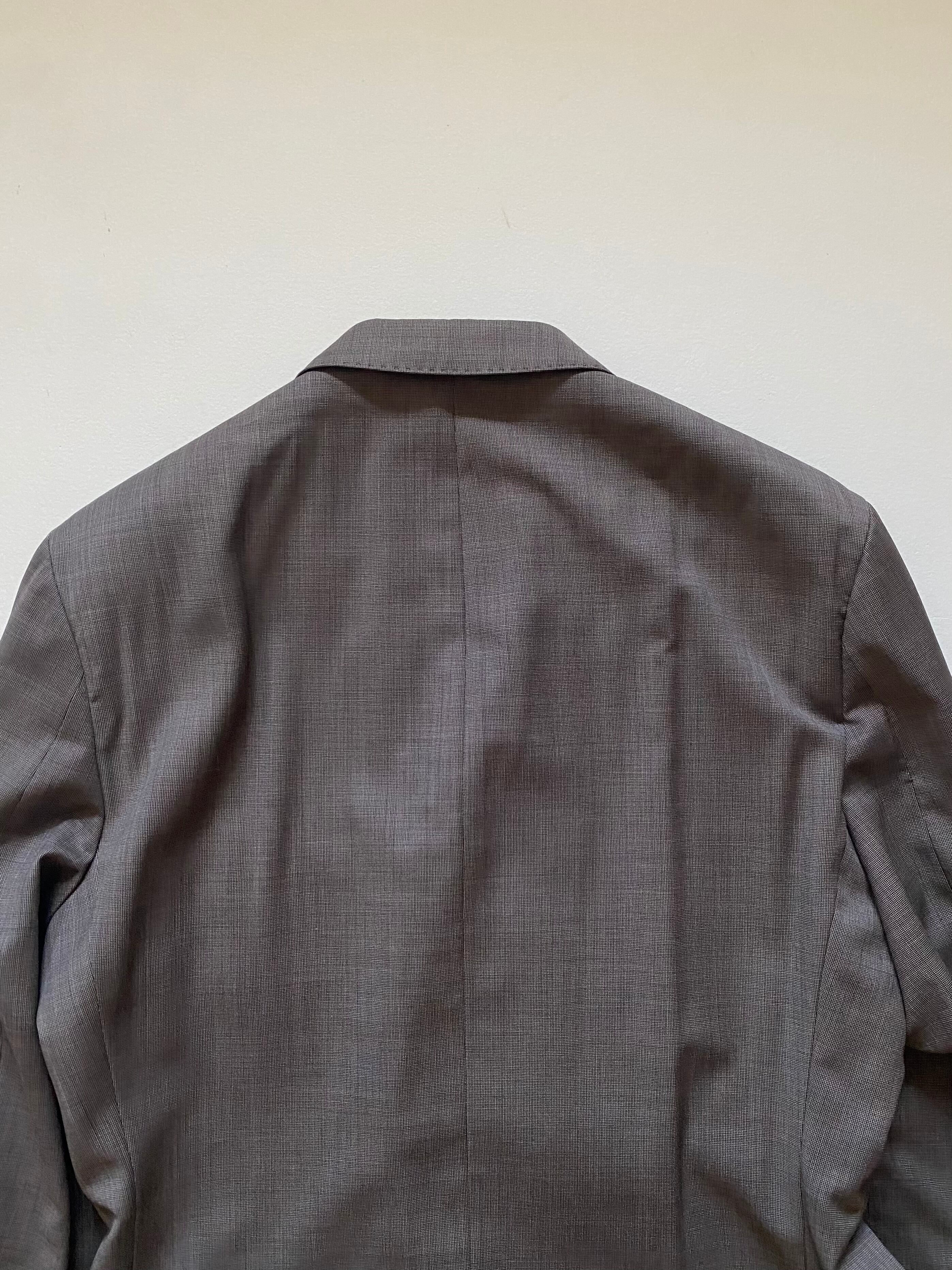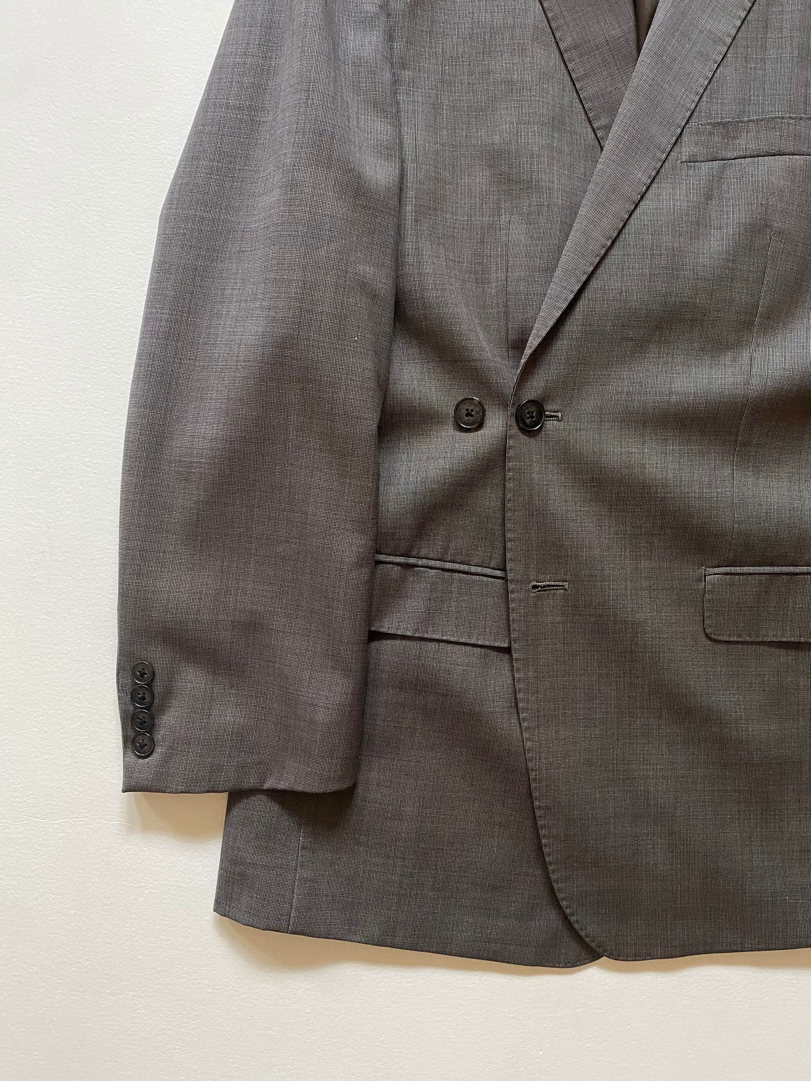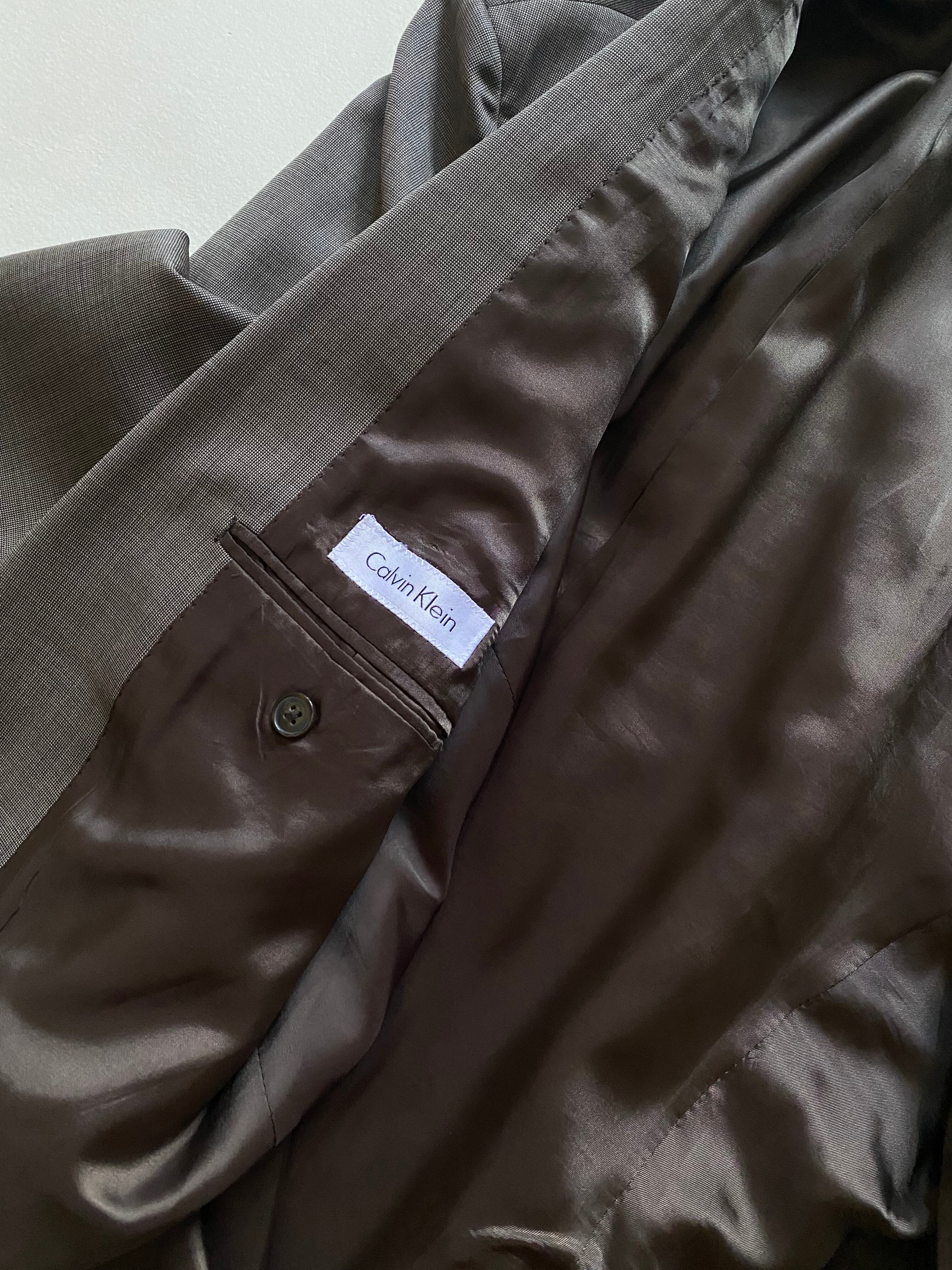 洗練されたグレージュカラーが魅力の00s- Calvin Klein suit set up。落ち着いた色合いはどんな場面にもマッチし、フォーマルなイベントにぴったりです。特筆すべきは、ジャケットのボタンが脇に移動されているため、シングルスタイルながらダブルのように着用できるユニークなデザインです。