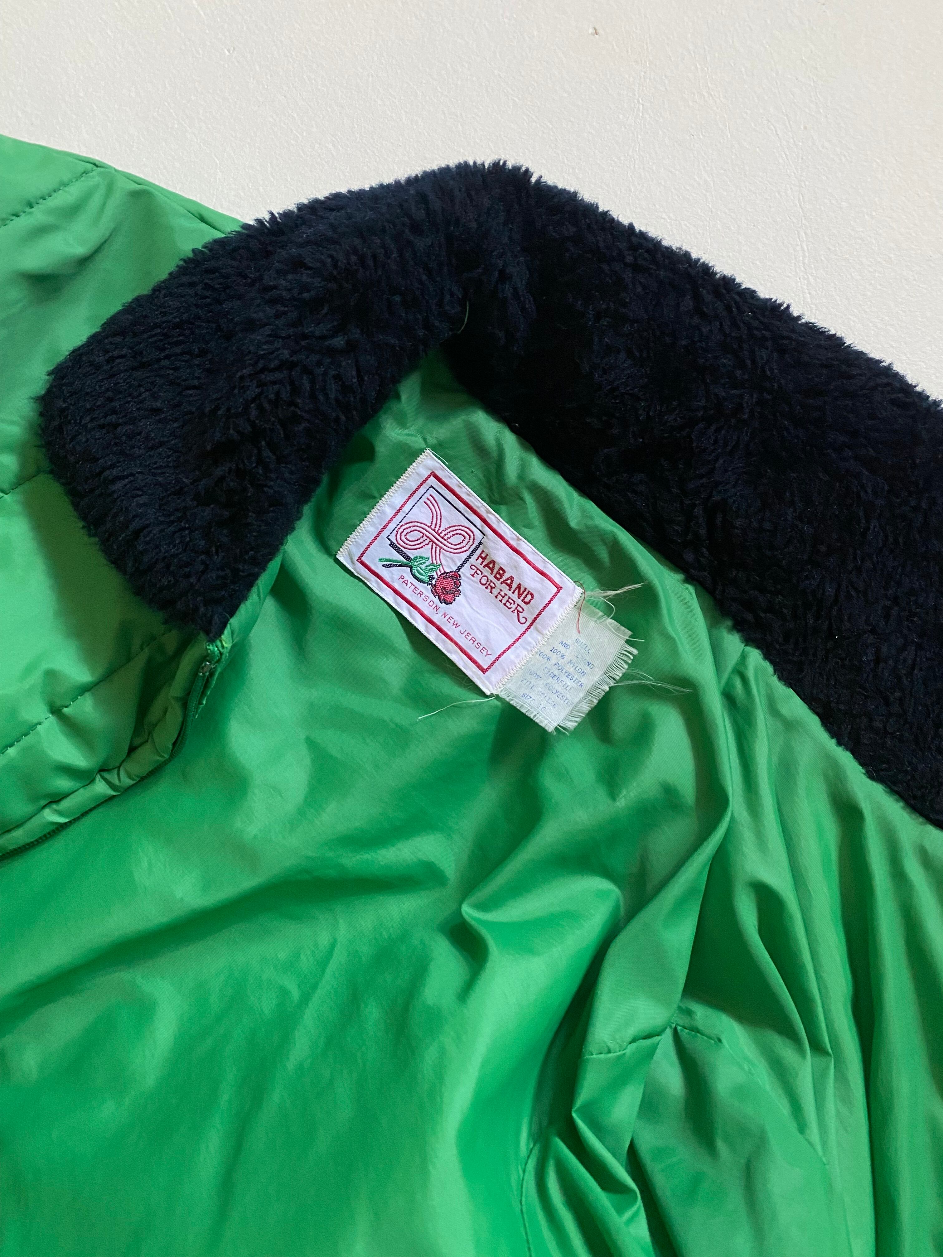 鮮やかなグリーンのキルティングとブラックのボア襟が特徴的なアイテムです。軽やかで暖かいこのジャケットは、機能性とデザイン性を兼ね備え、コーディネートのアクセントとして大活躍します。