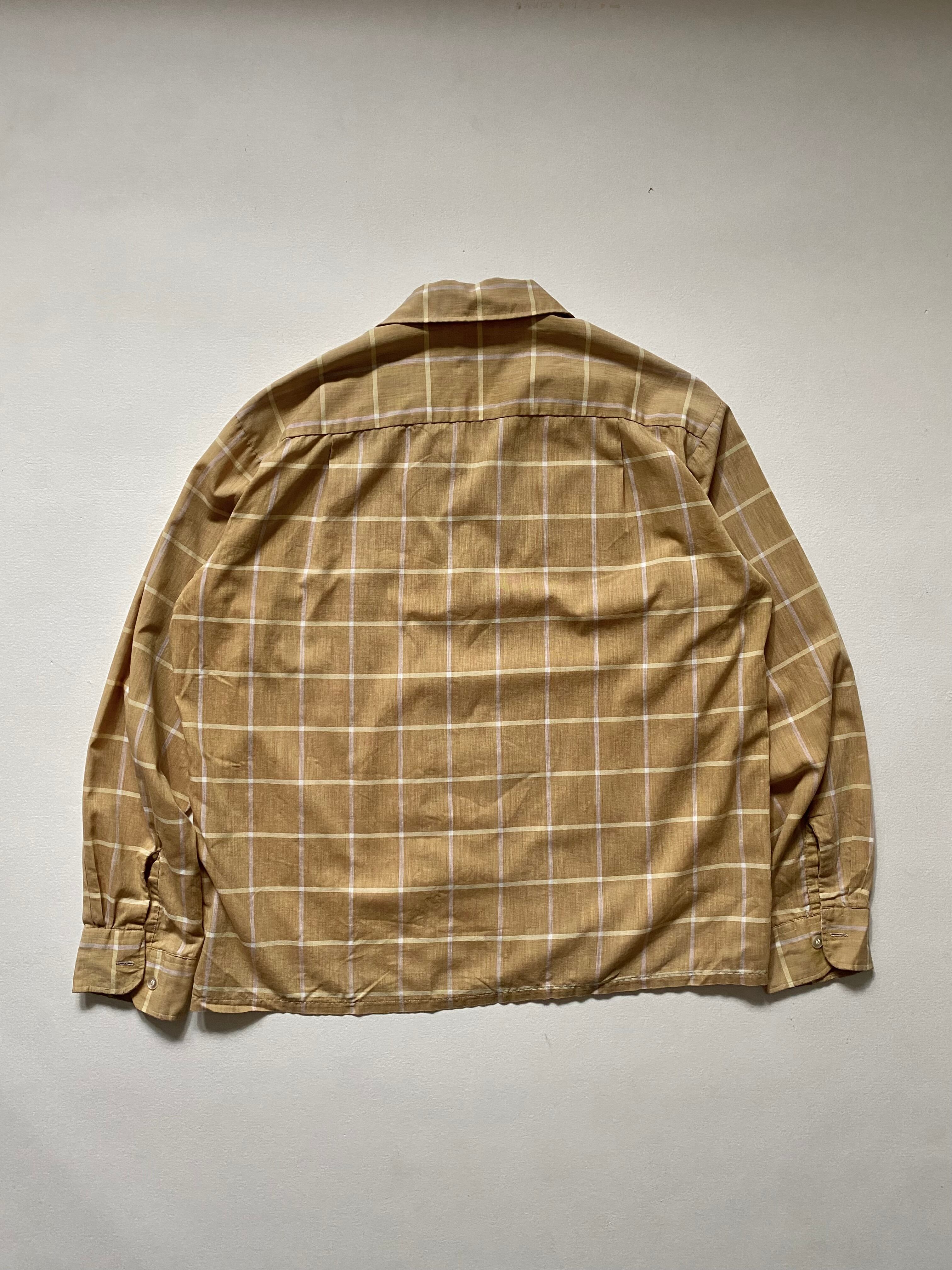 落ち着いたイエロートーンのチェックが特徴的な、60s- cotton polyester open collar shirt。コットン75%の混紡素材が心地よく、シャリ感が少ないのも嬉しいポイントです。