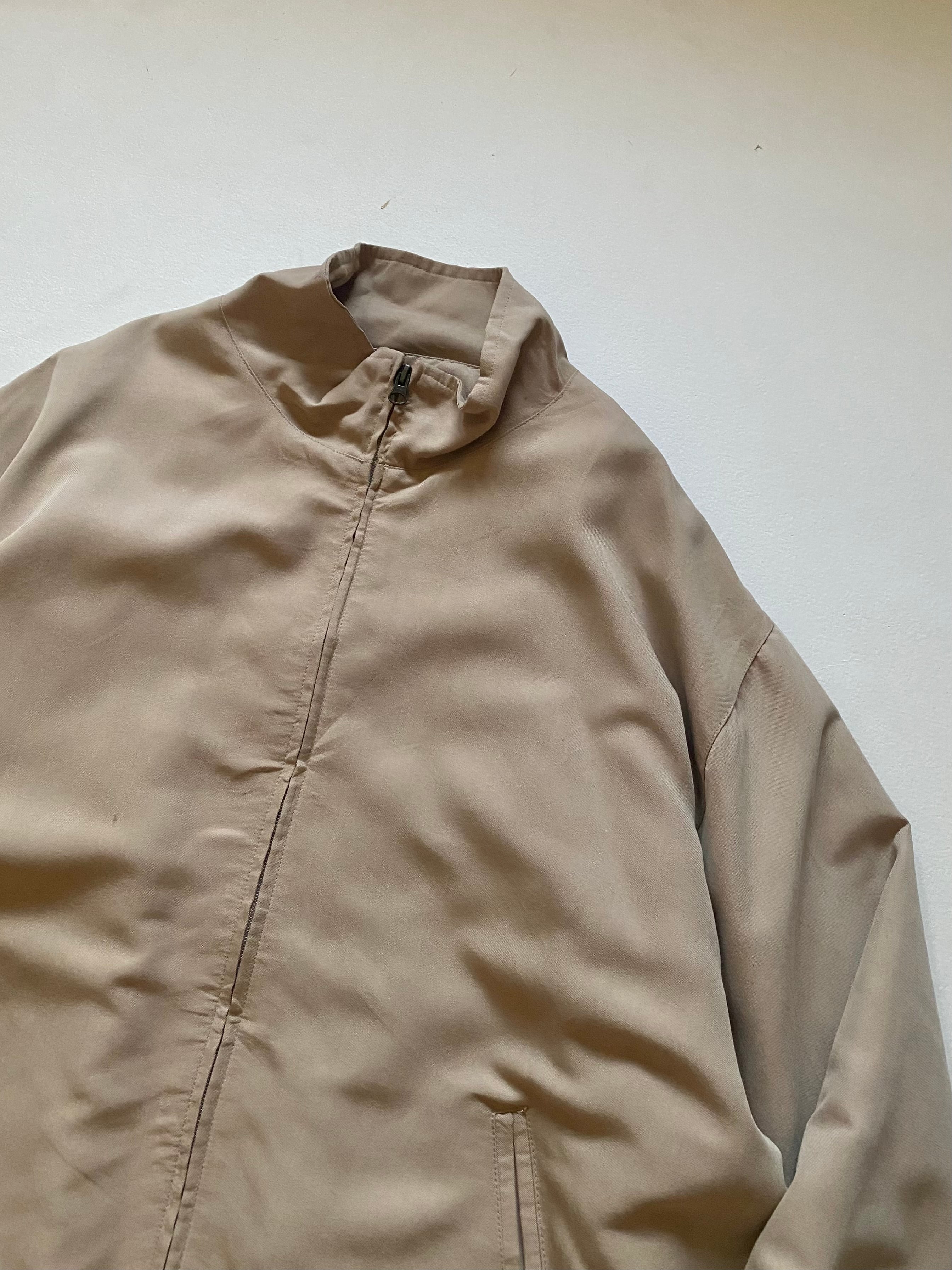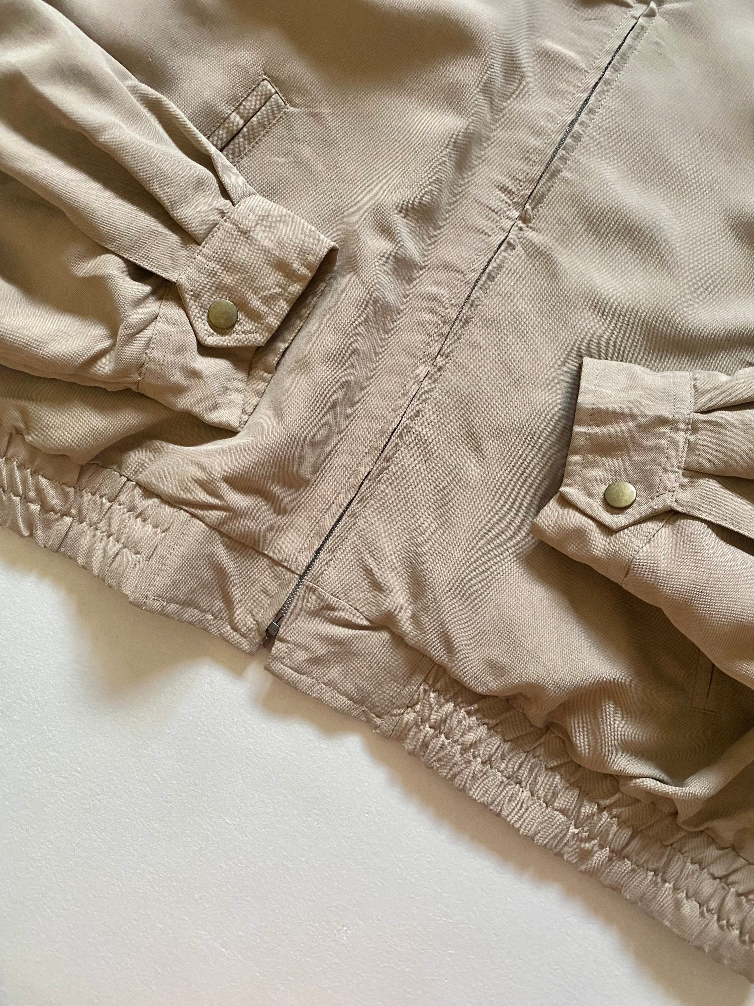 オーバーサイズのスイングトップ。軽やかなレーヨンポリエステル素材を使用しており、ポリエステルならではのハリ感と玉虫のようなツヤを兼ね備えています。無地のベージュは、どんなスタイルにも合わせやすく、シンプルながらおしゃれを演出します。
