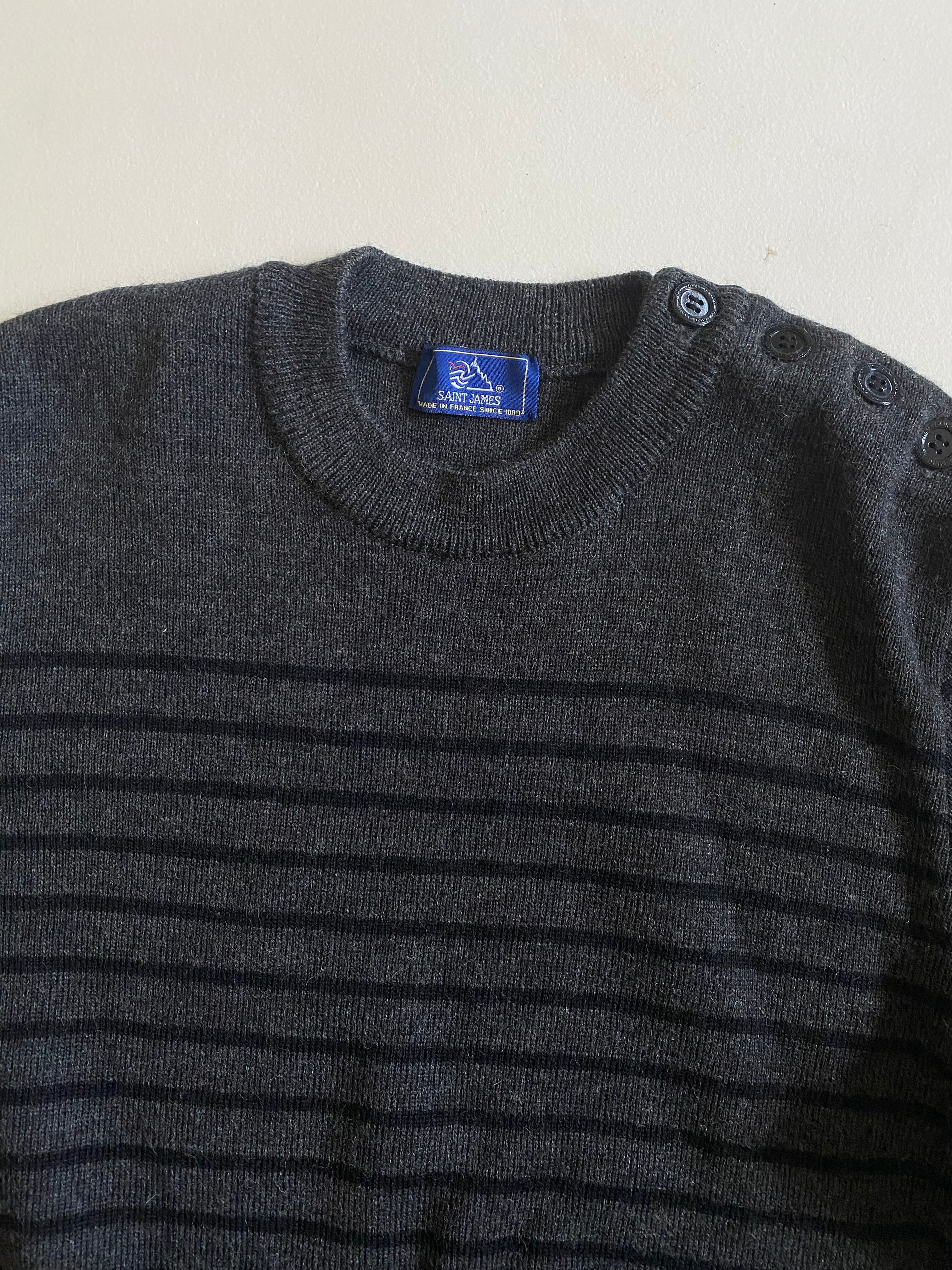 90年代のセントジェームスによるボーダーウールセーターです。このセーターは、チャコールグレーにブラックのボーダーが印象的で、シンプルながらも洗練されたデザインが魅力です。しっかりとしたウール素材が心地よい温もりを提供し、着心地も抜群です。