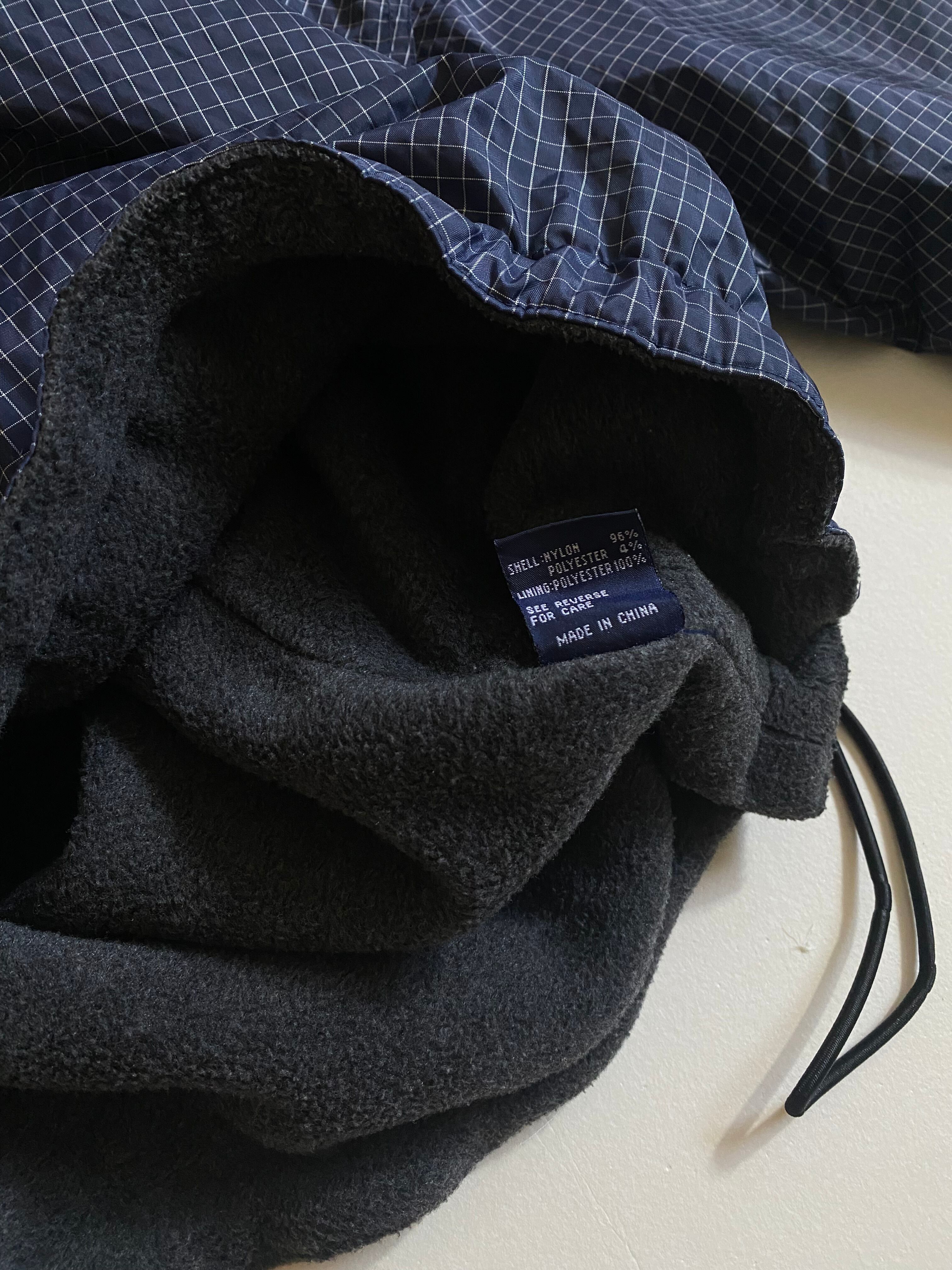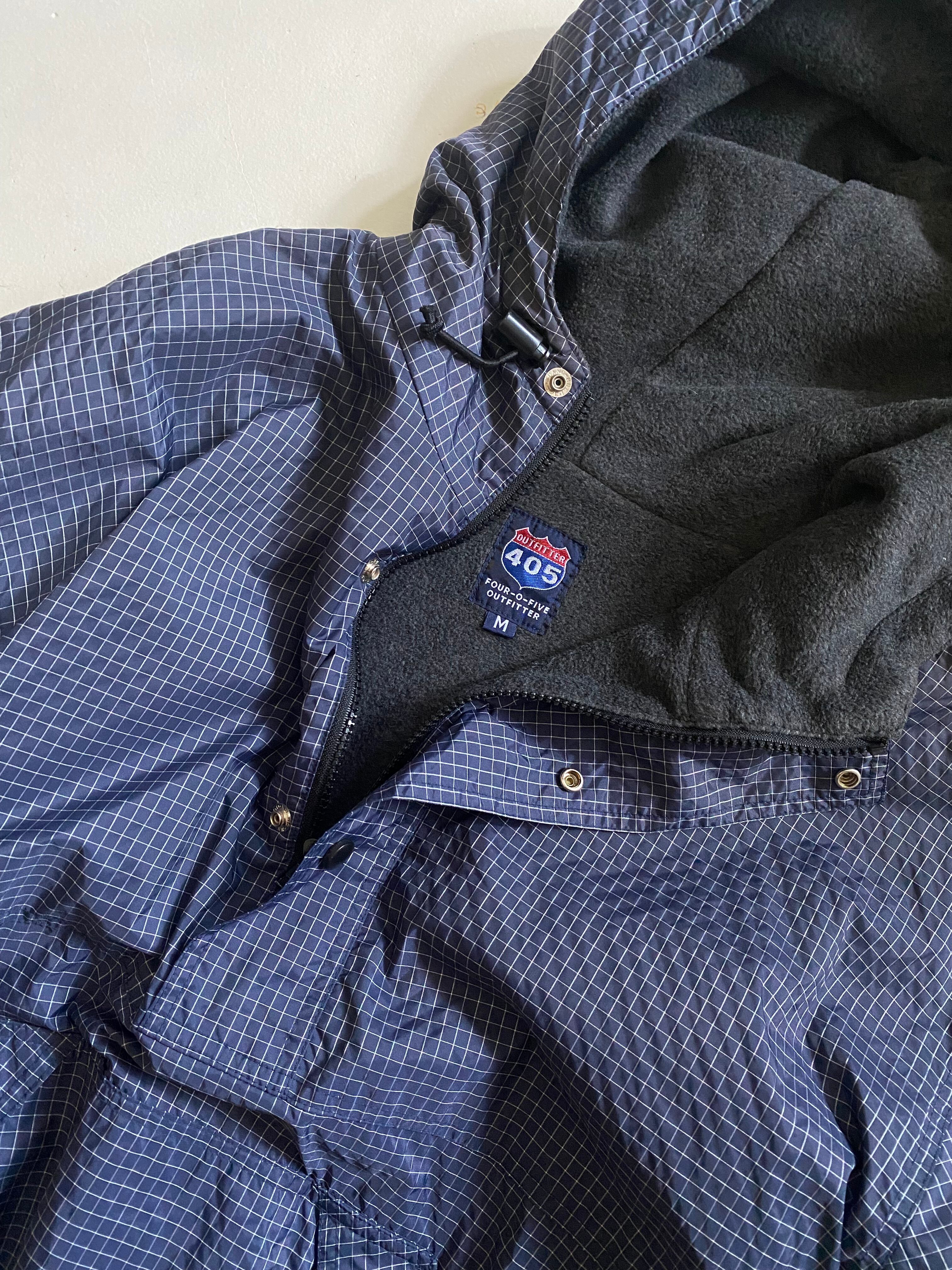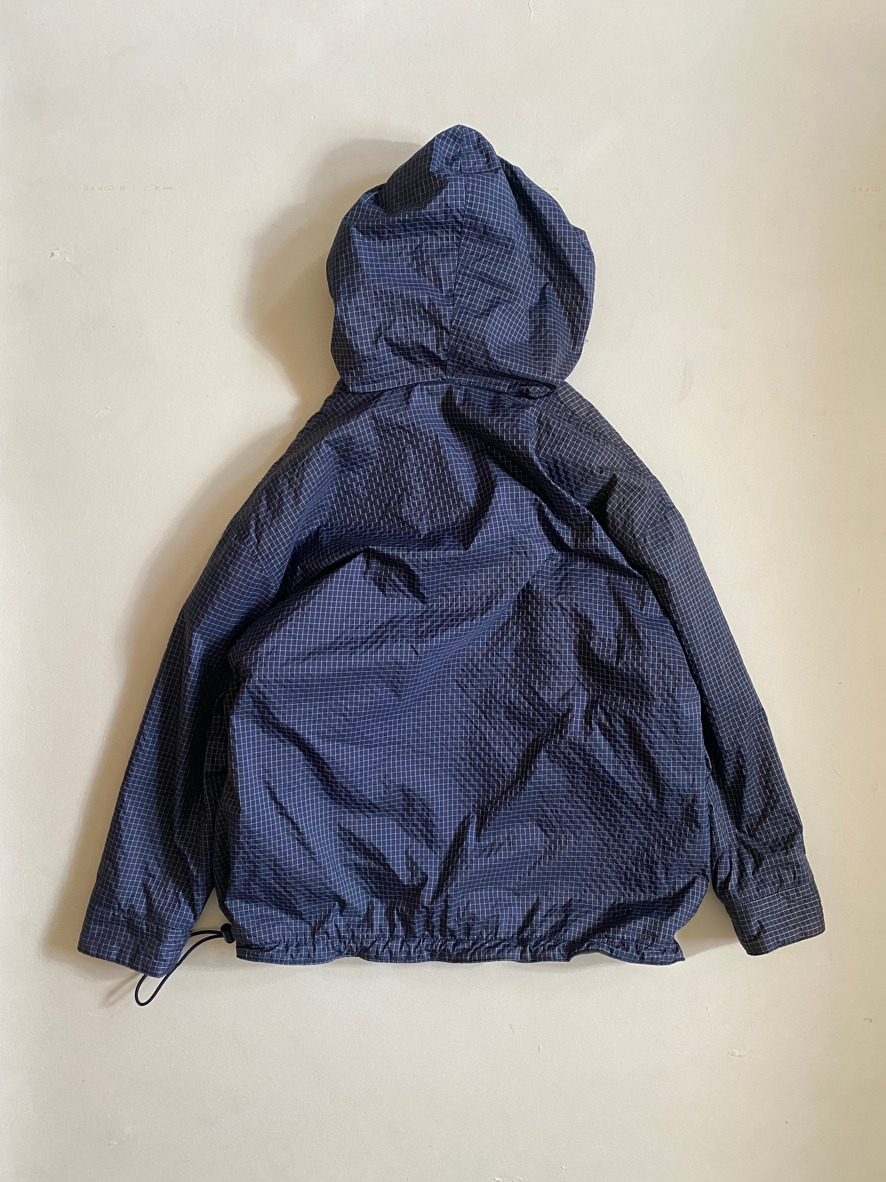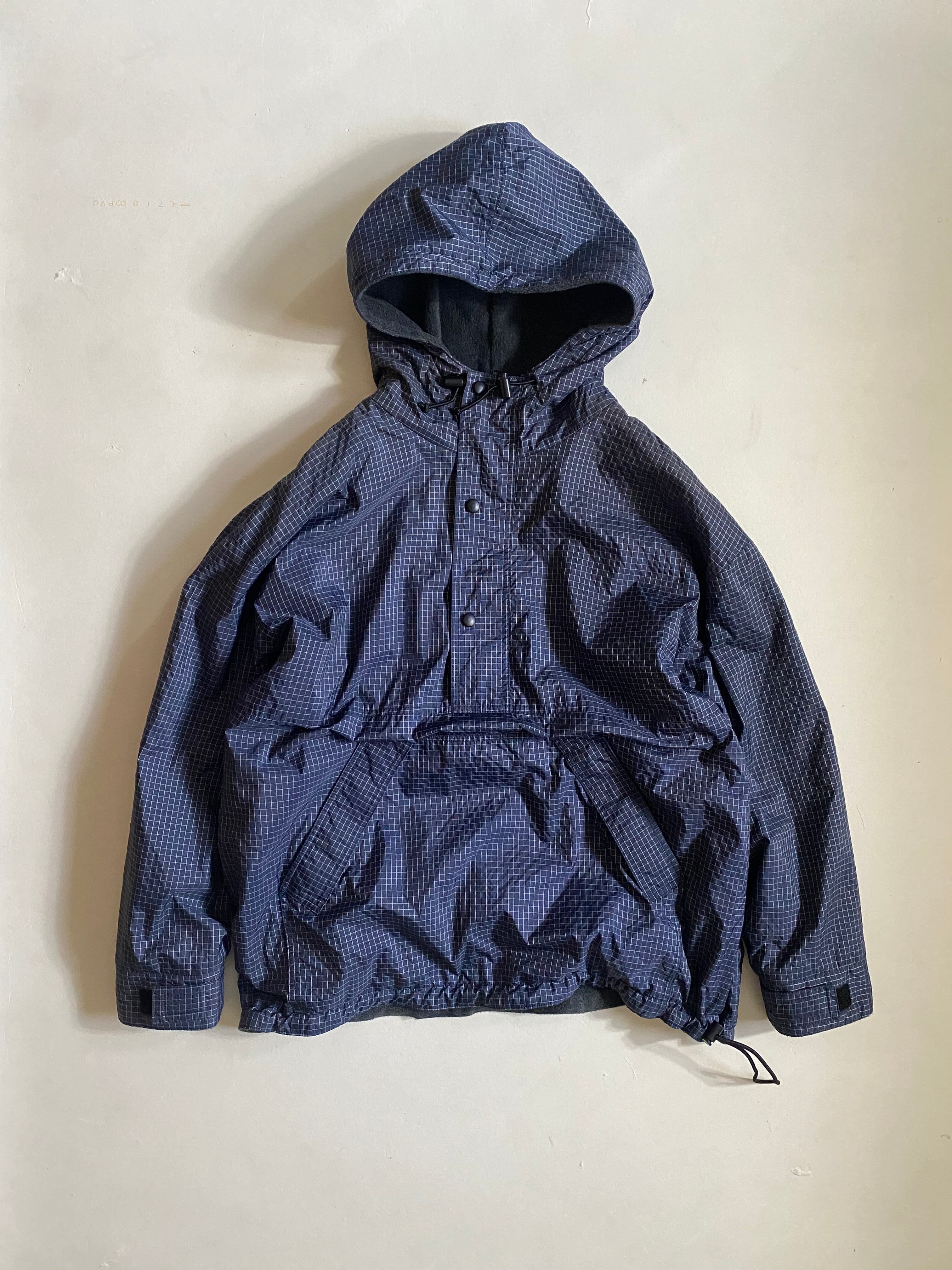90sフリースライニングナイロンアノラックパーカーです。このパーカーは、細かいチェック柄のナイロンシェルが特徴的で、シティーな雰囲気を演出する一着です。フリース地のライニングが施されており、温かさと快適さを兼ね備えています。