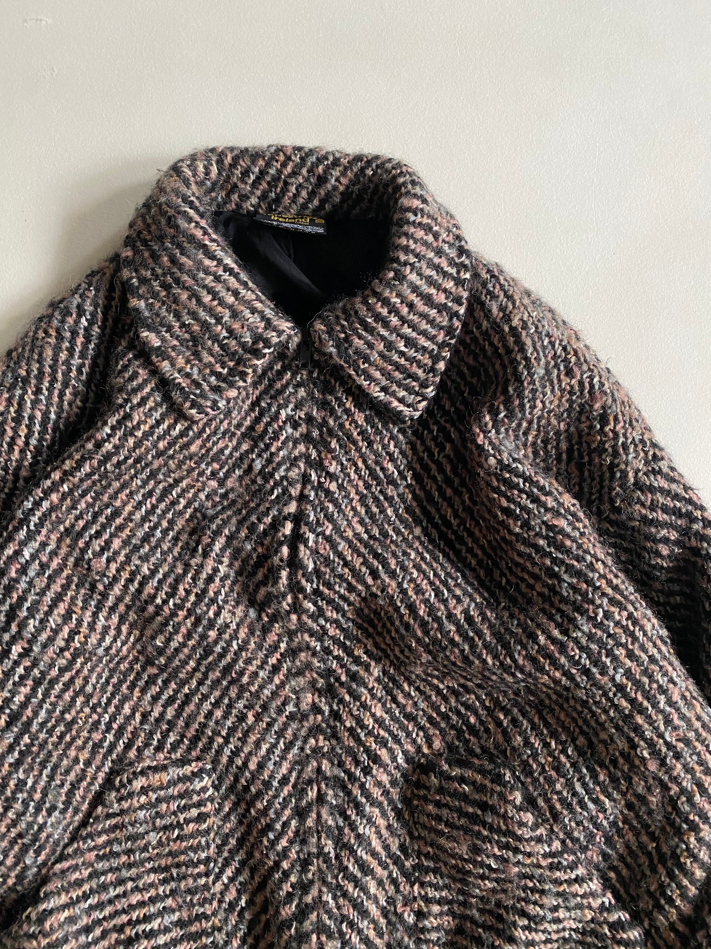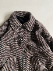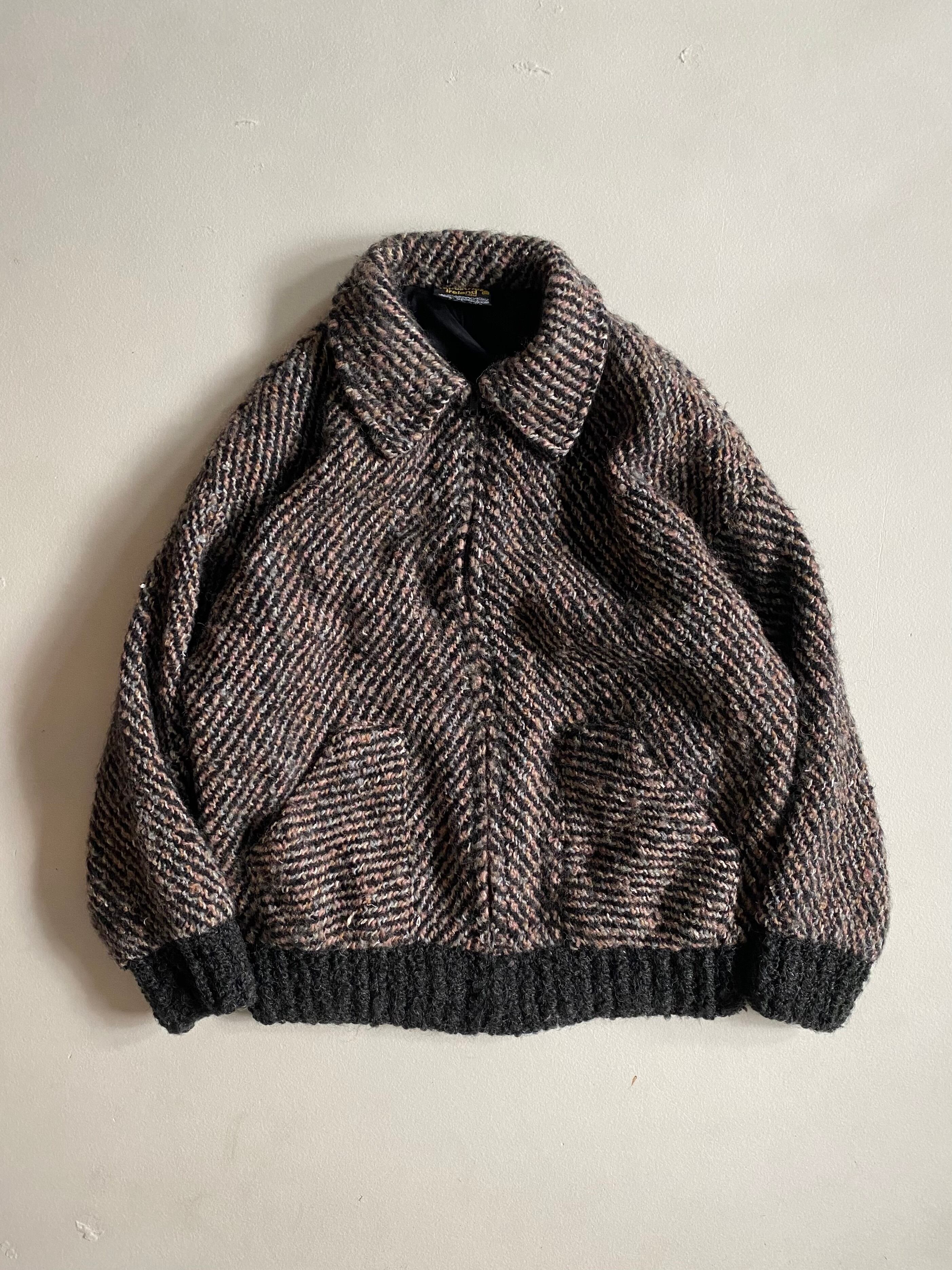 アイルランドメイドのニットブルゾン。このブルゾンは、ふわっとした厚手のニット素材を使用しており、心地よい温かさと独特の風合いが魅力の一着です。ミックス感のある色合いと大ぶりの襟がポイントで、可愛らしさを演出します。