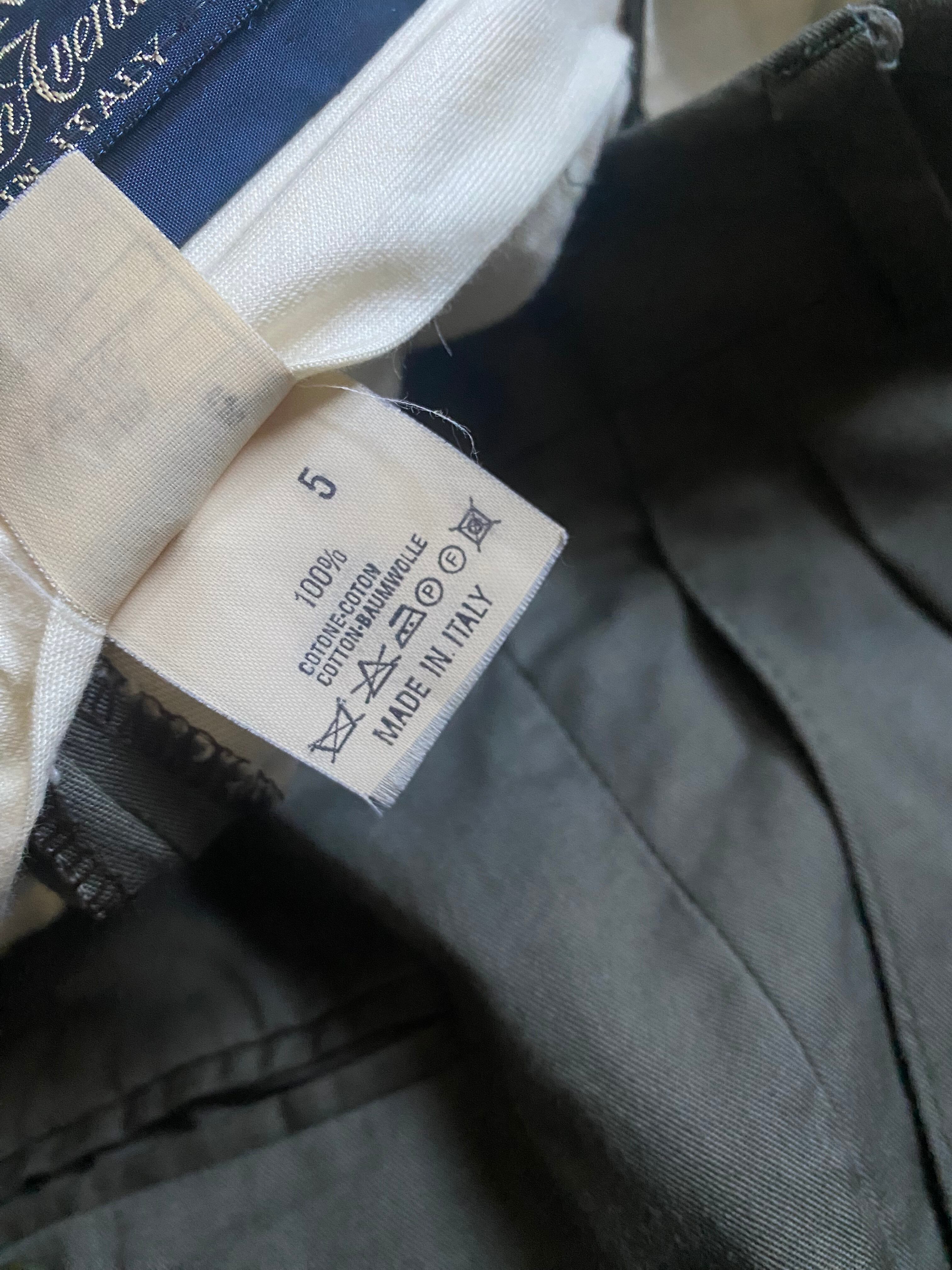 オリーブグリーンカラーのコットンスラックスです。このスラックスは、落ち着いた色合いと絶妙な太さが魅力で、イタリアメイドの高いクオリティが感じられます。