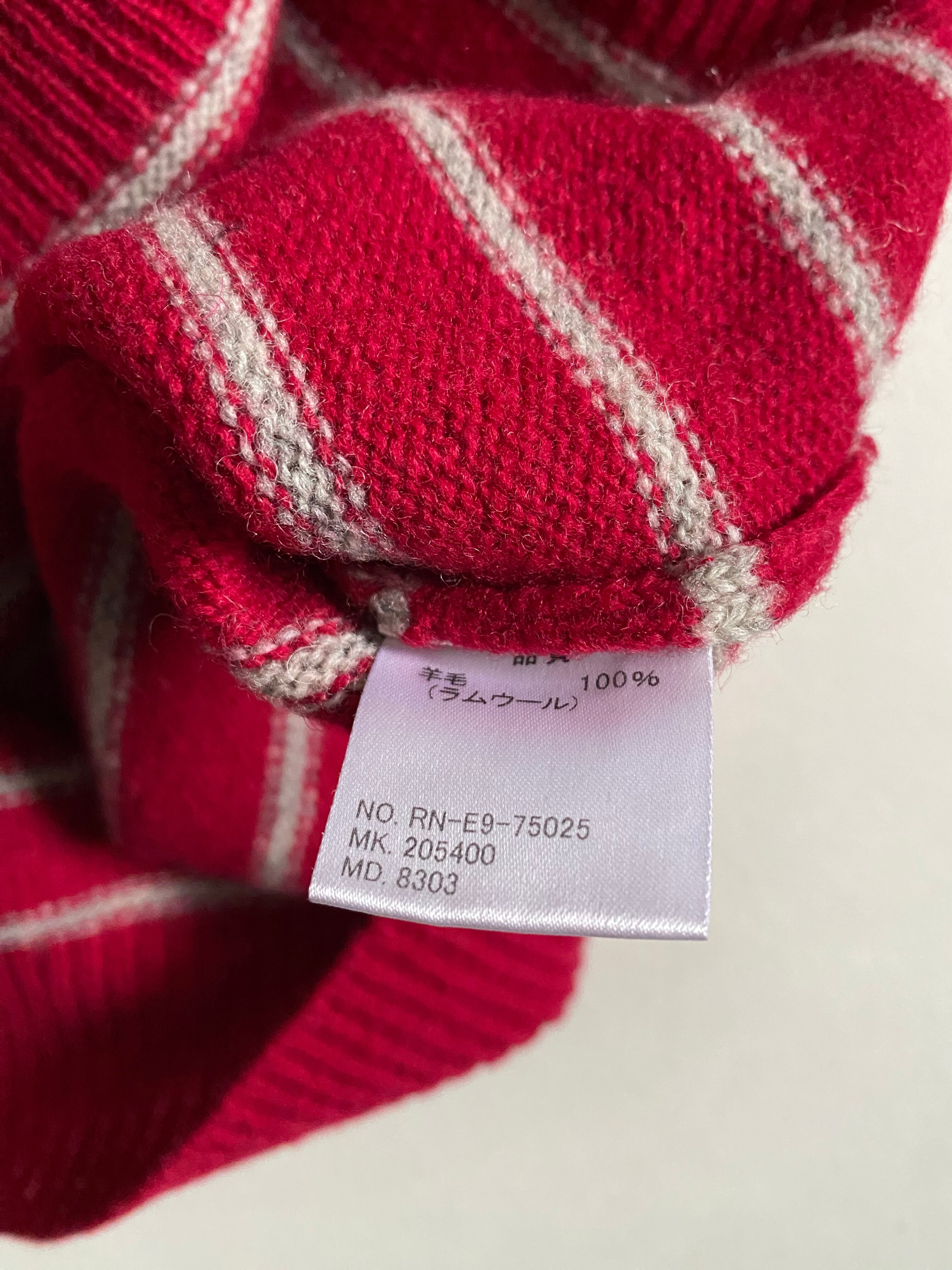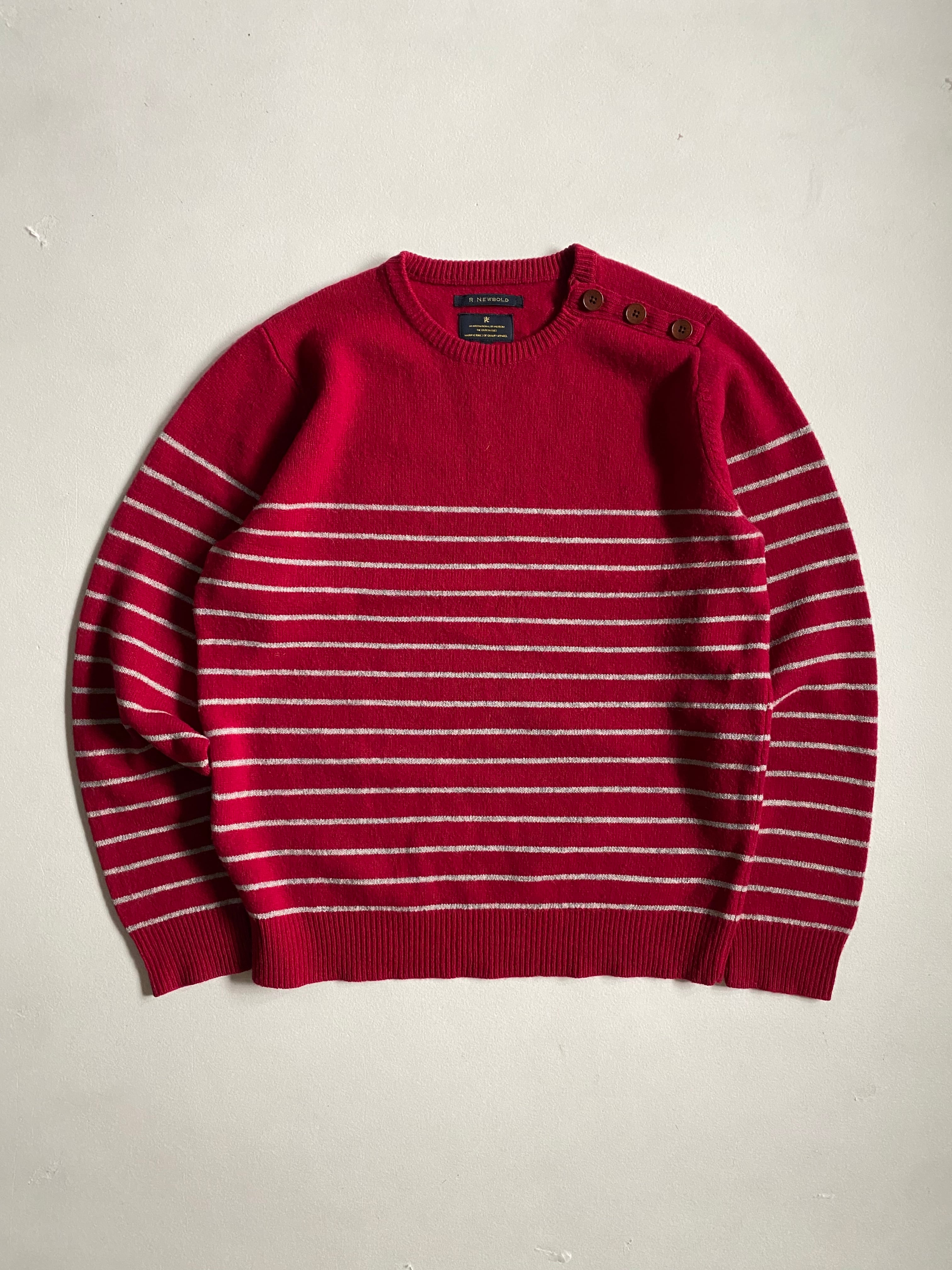 00s- r.newbold boarder button sweaterです。素敵なレッドカラーのボーダーにボタンデザインが絶妙にマッチしている魅力的なアイテムです。柔らかな素材感と暖かさがあり、秋冬のコーディネートにぴったりの一着となっています。