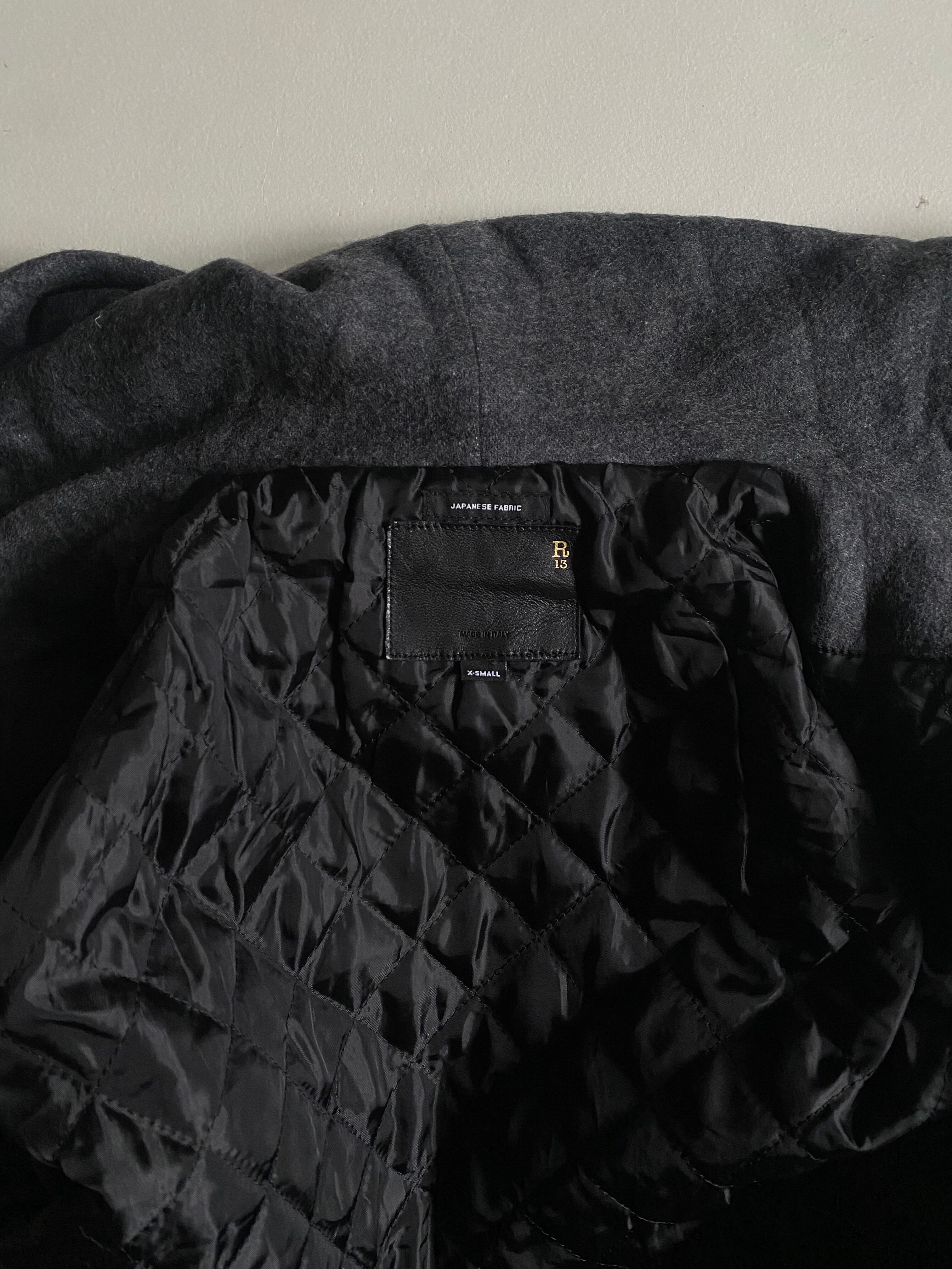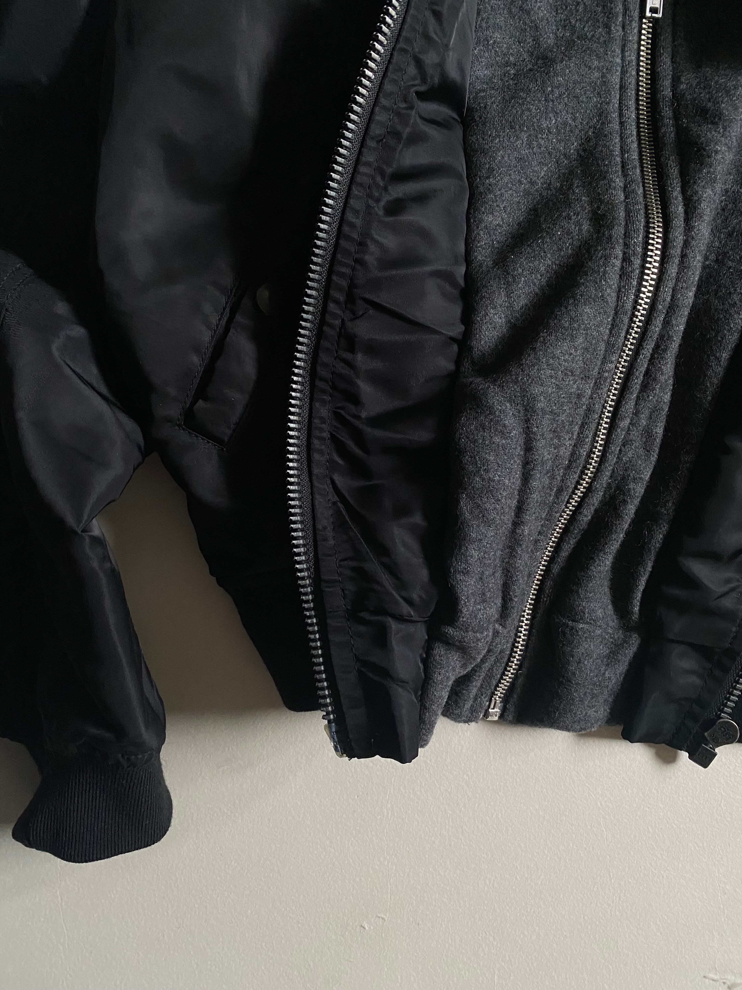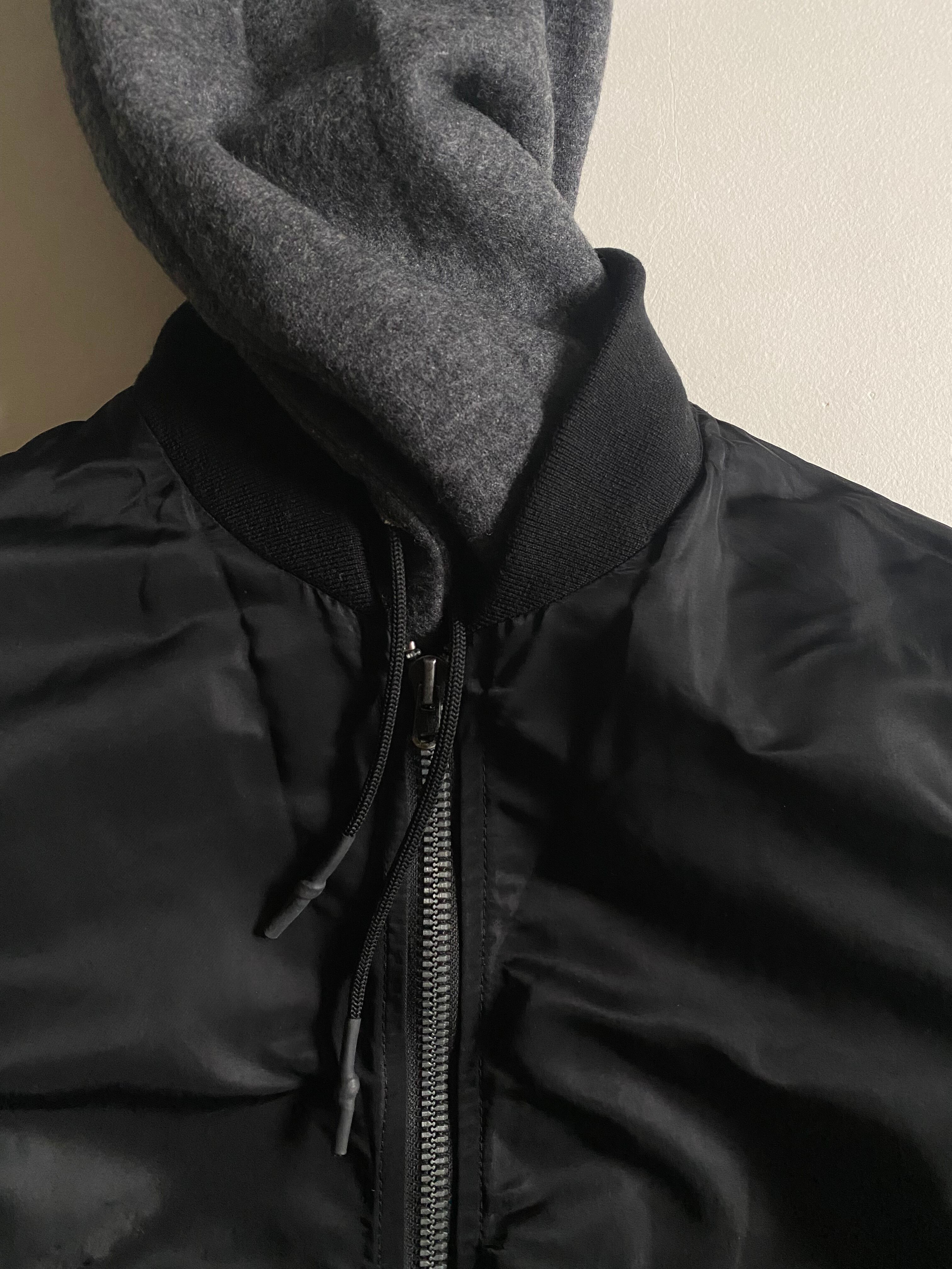 R13 hoodie docking ma1 jacketです。MA1タイプのブラックブルゾンにグレーのフードがフェイクレイヤードされたデザインが特徴で、スタイリッシュでありながらもリラックス感を演出します。ジャパンファブリックを使用し、イタリアで作られたこのジャケットは、品質の高さを感じさせる一品です。