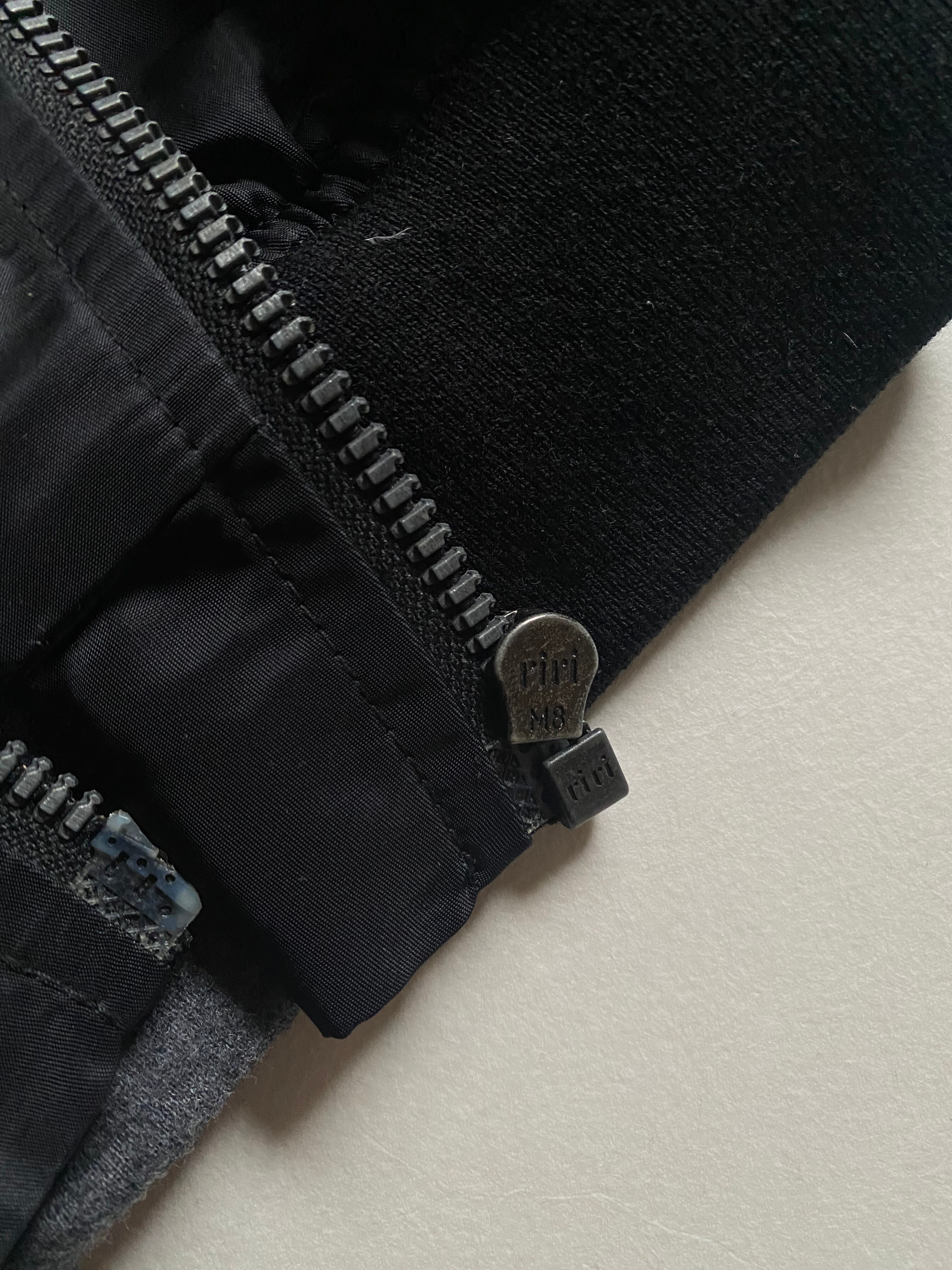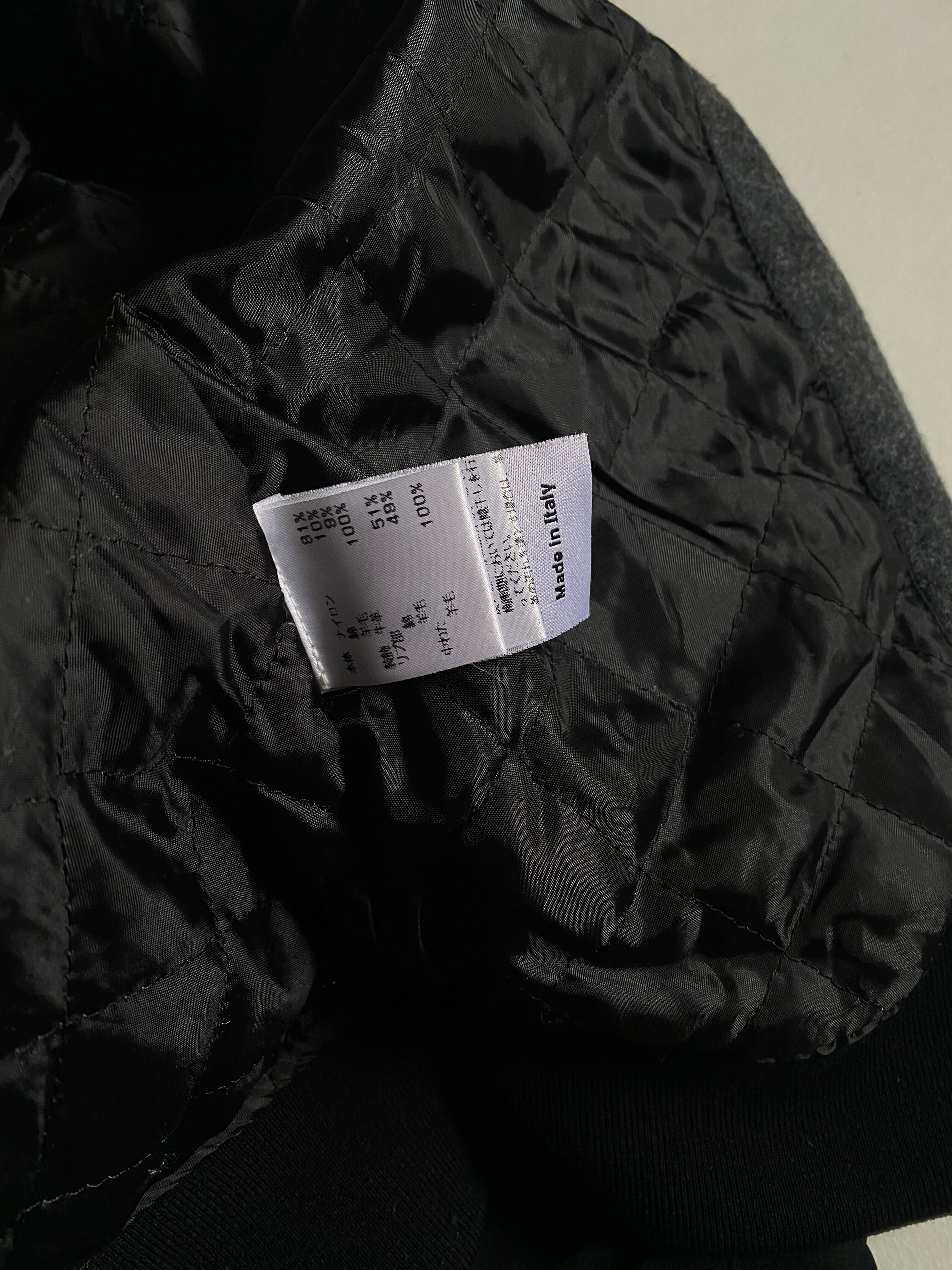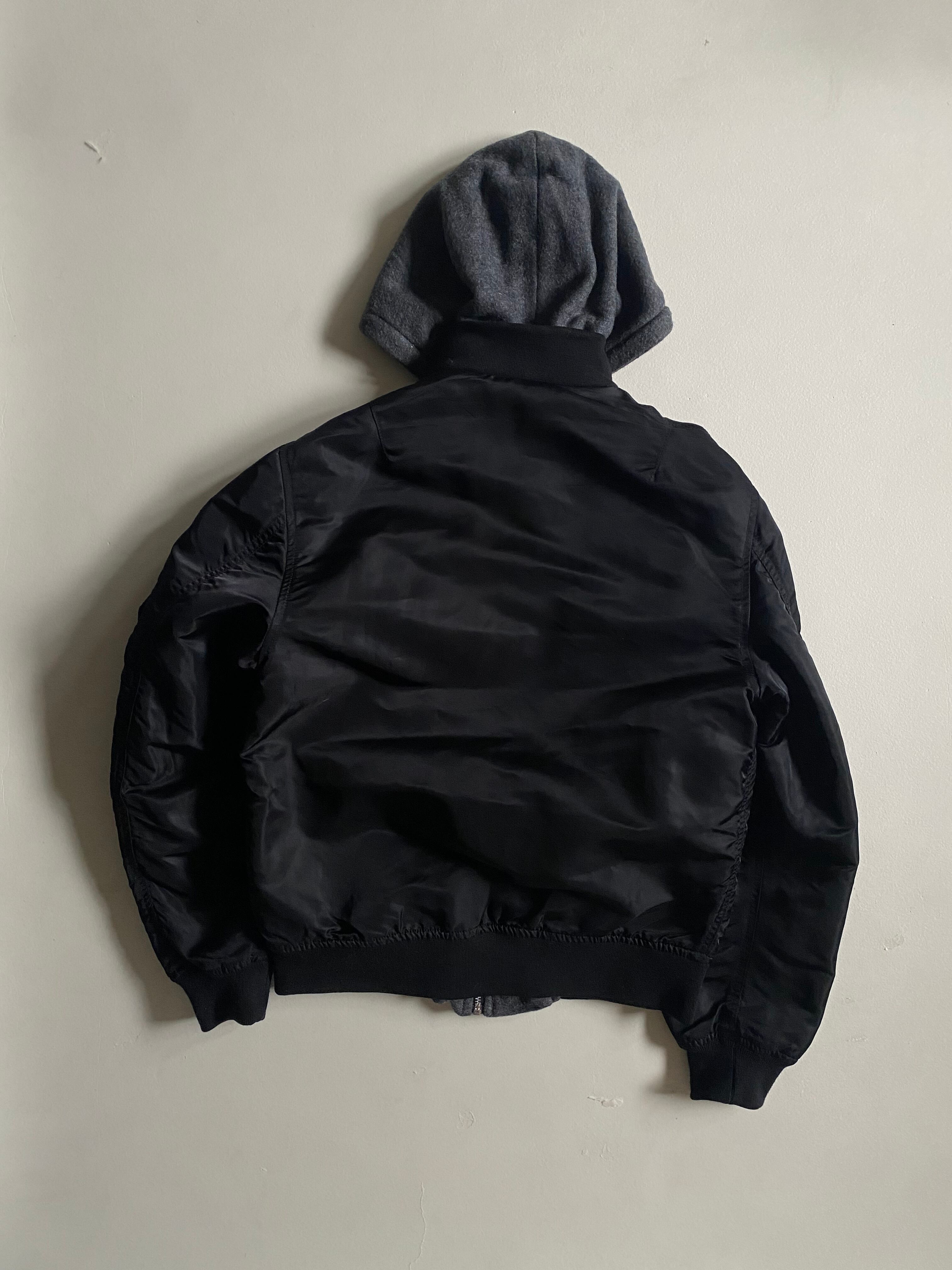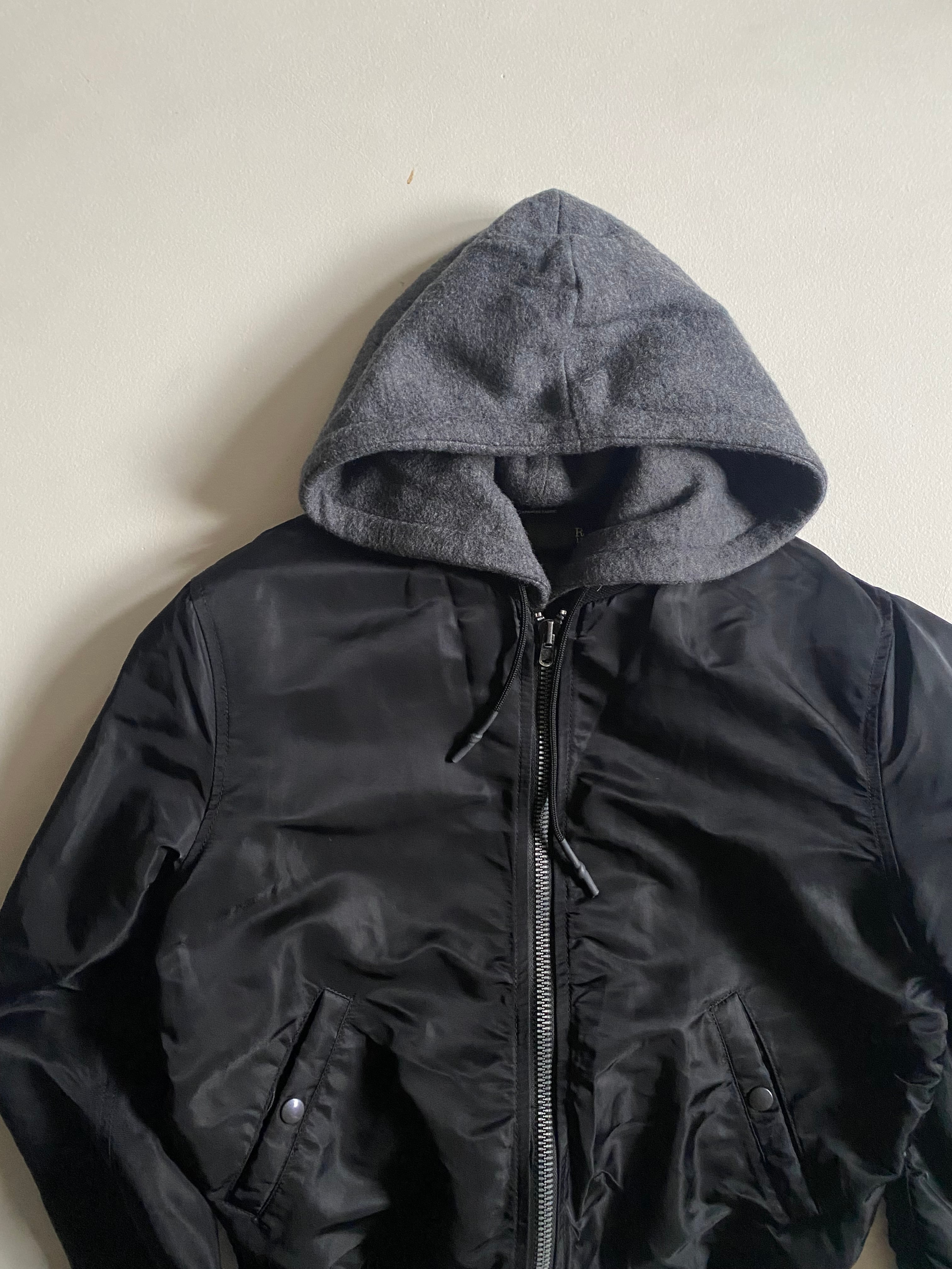 R13 hoodie docking ma1 jacketです。MA1タイプのブラックブルゾンにグレーのフードがフェイクレイヤードされたデザインが特徴で、スタイリッシュでありながらもリラックス感を演出します。ジャパンファブリックを使用し、イタリアで作られたこのジャケットは、品質の高さを感じさせる一品です。