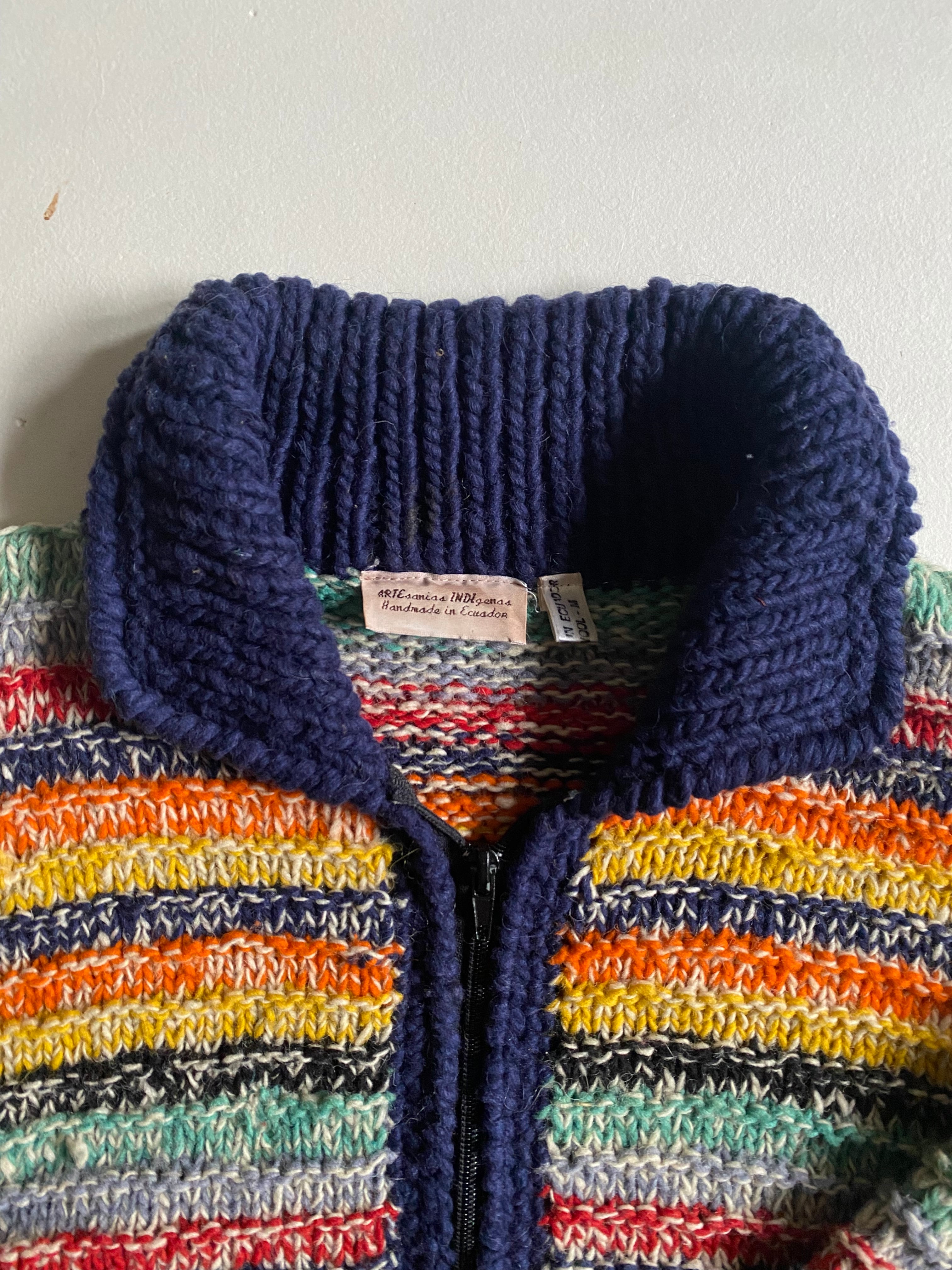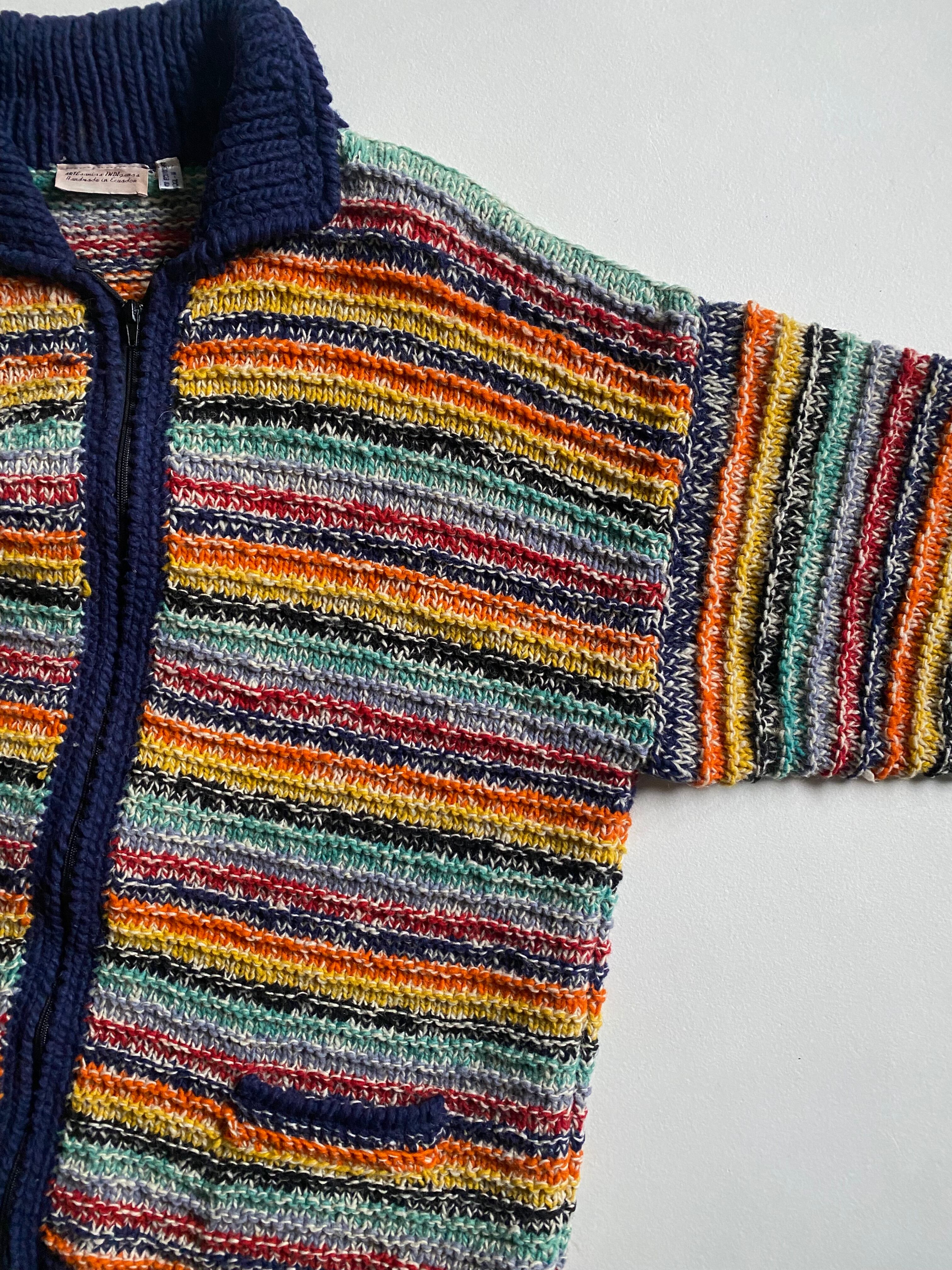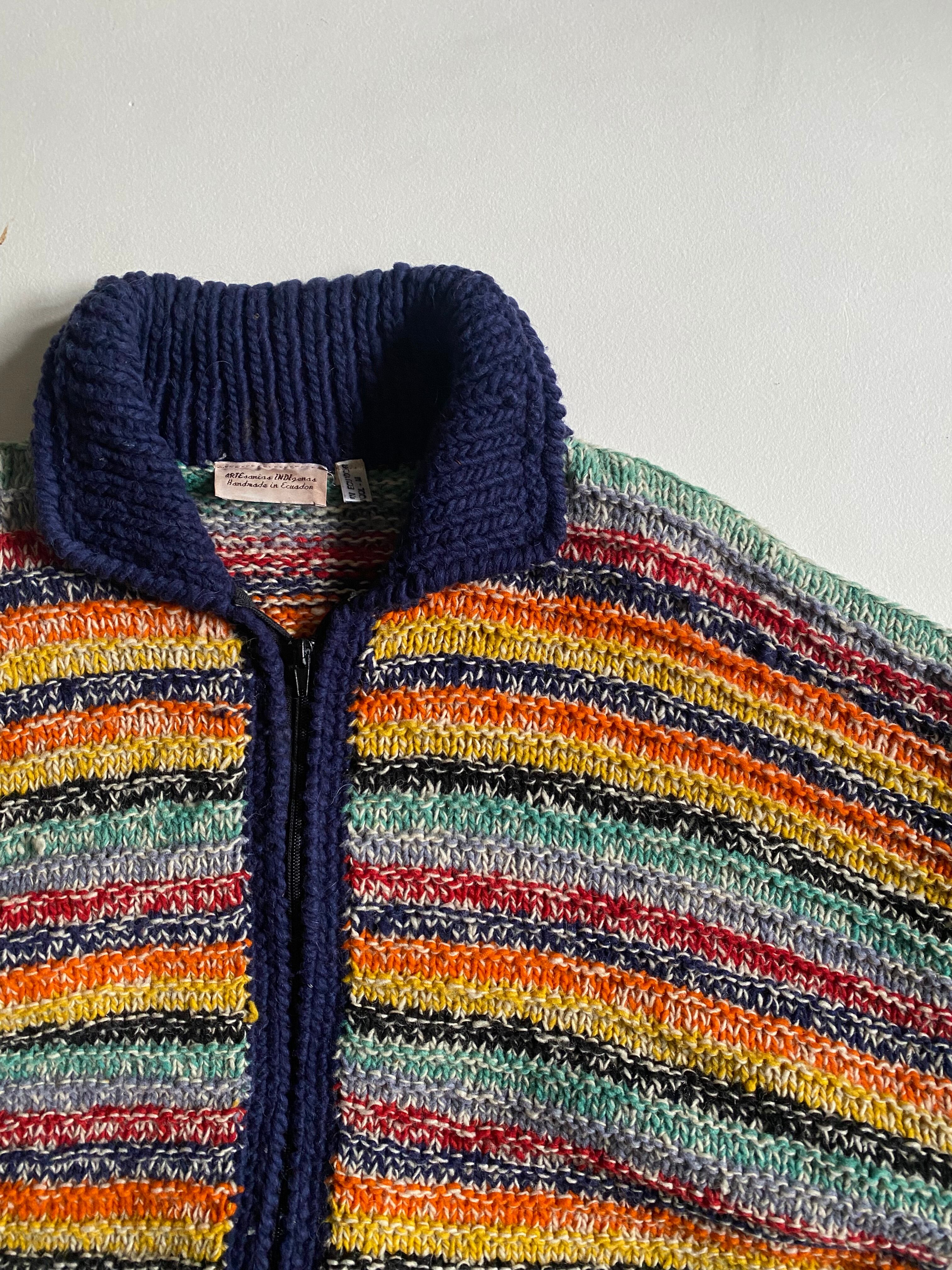 エクアドルハンドメイドのニットブルゾンです。フルジップ仕様に加え、カラフルな配色が施されており、見る人の目を引く華やかさが特徴です。ヴィンテージ のエッセンスを感じさせるデザインは、カジュアルながらも個性的なスタイルを演出します。
