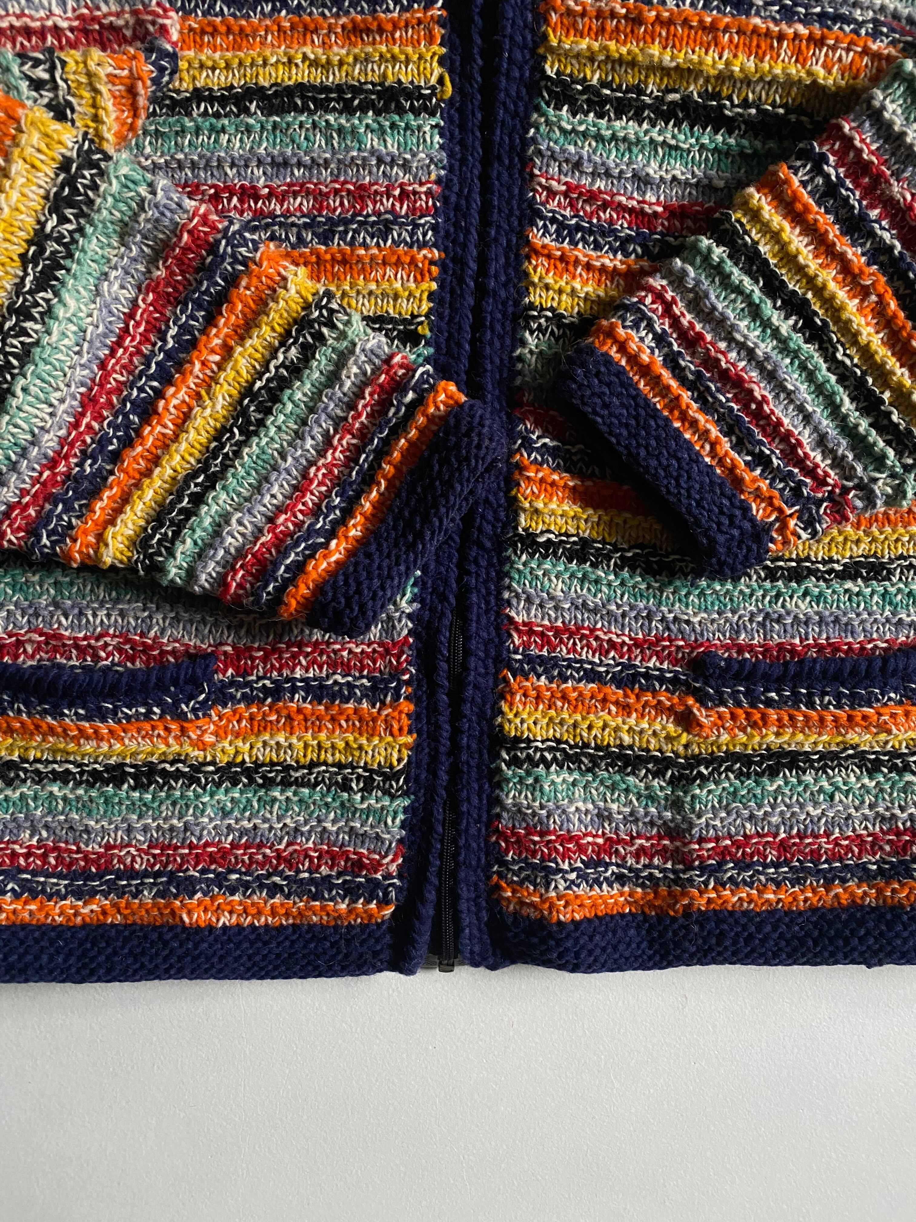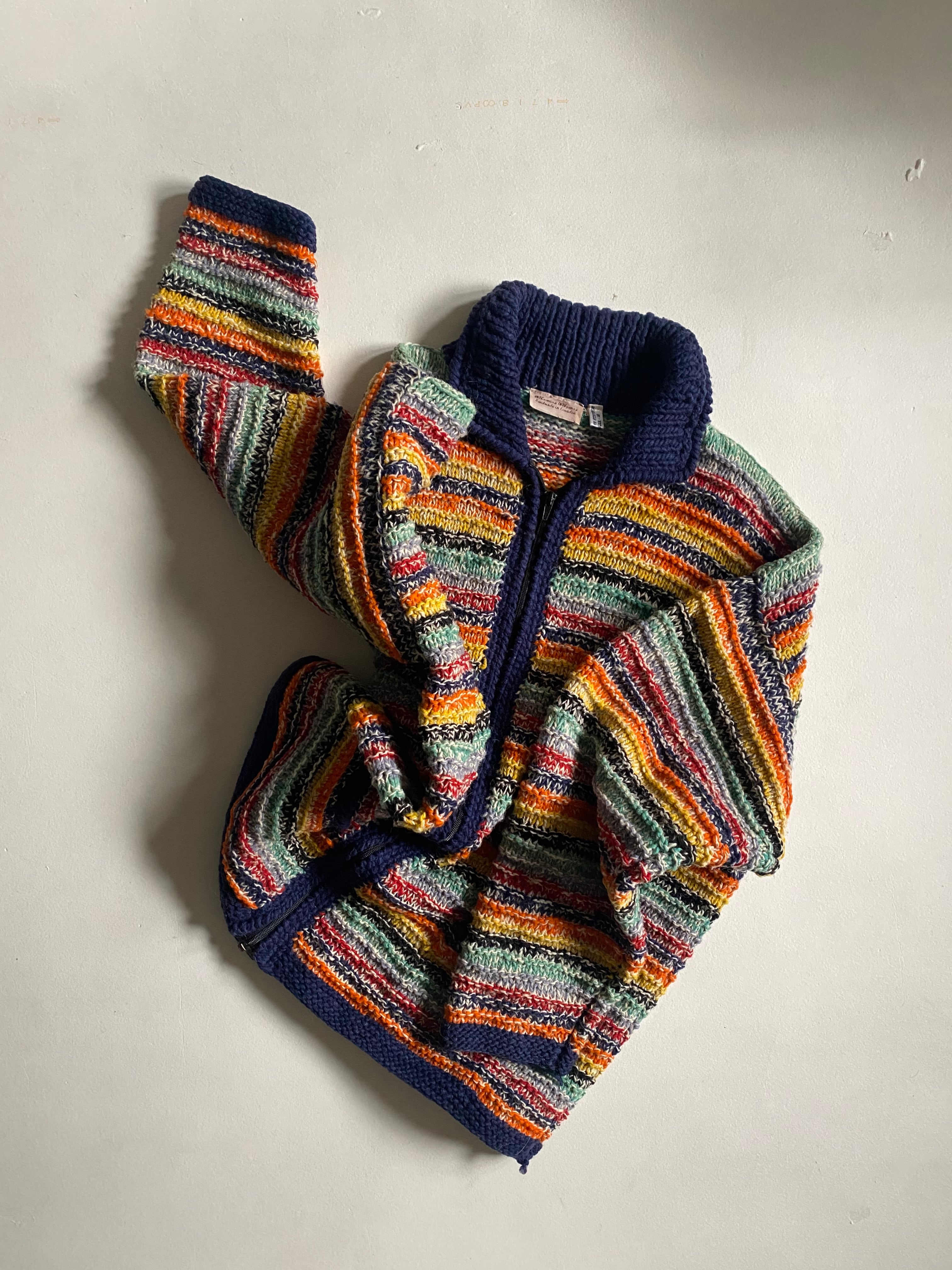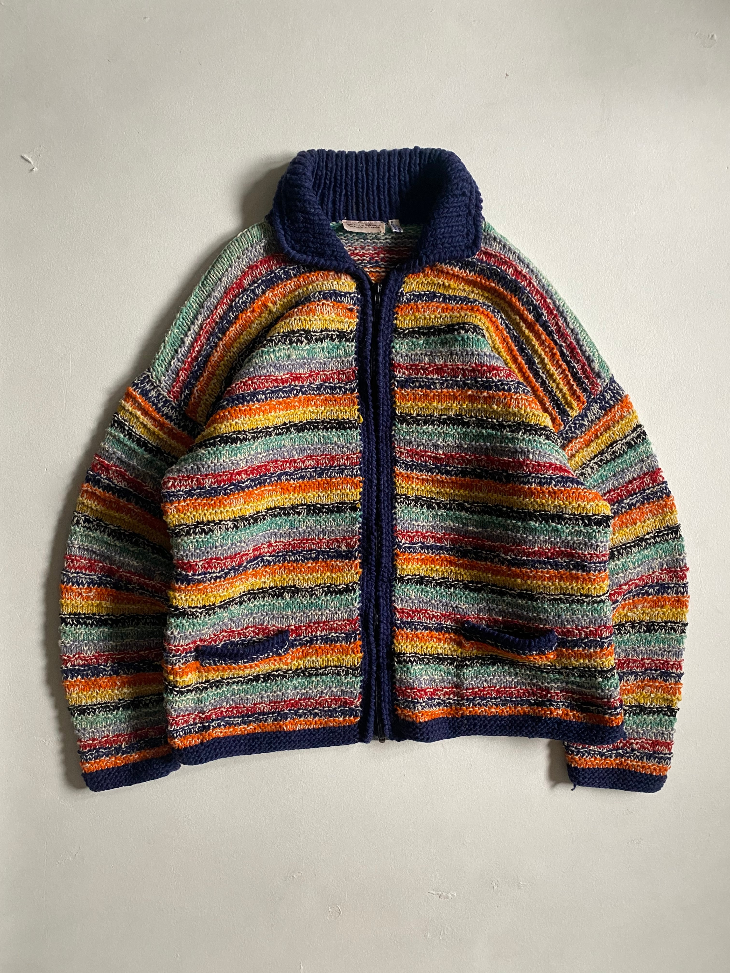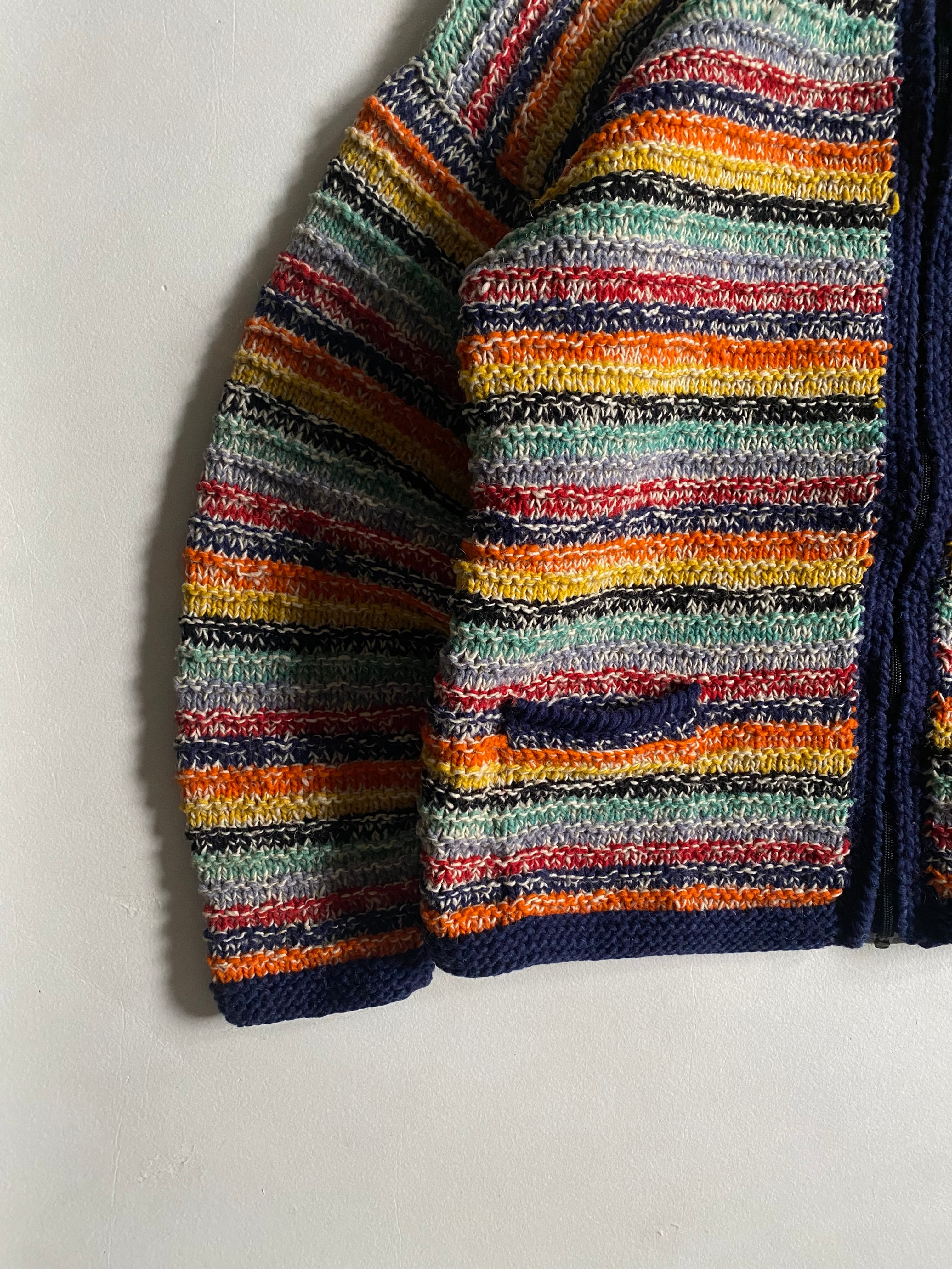 エクアドルハンドメイドのニットブルゾンです。フルジップ仕様に加え、カラフルな配色が施されており、見る人の目を引く華やかさが特徴です。ヴィンテージ のエッセンスを感じさせるデザインは、カジュアルながらも個性的なスタイルを演出します。