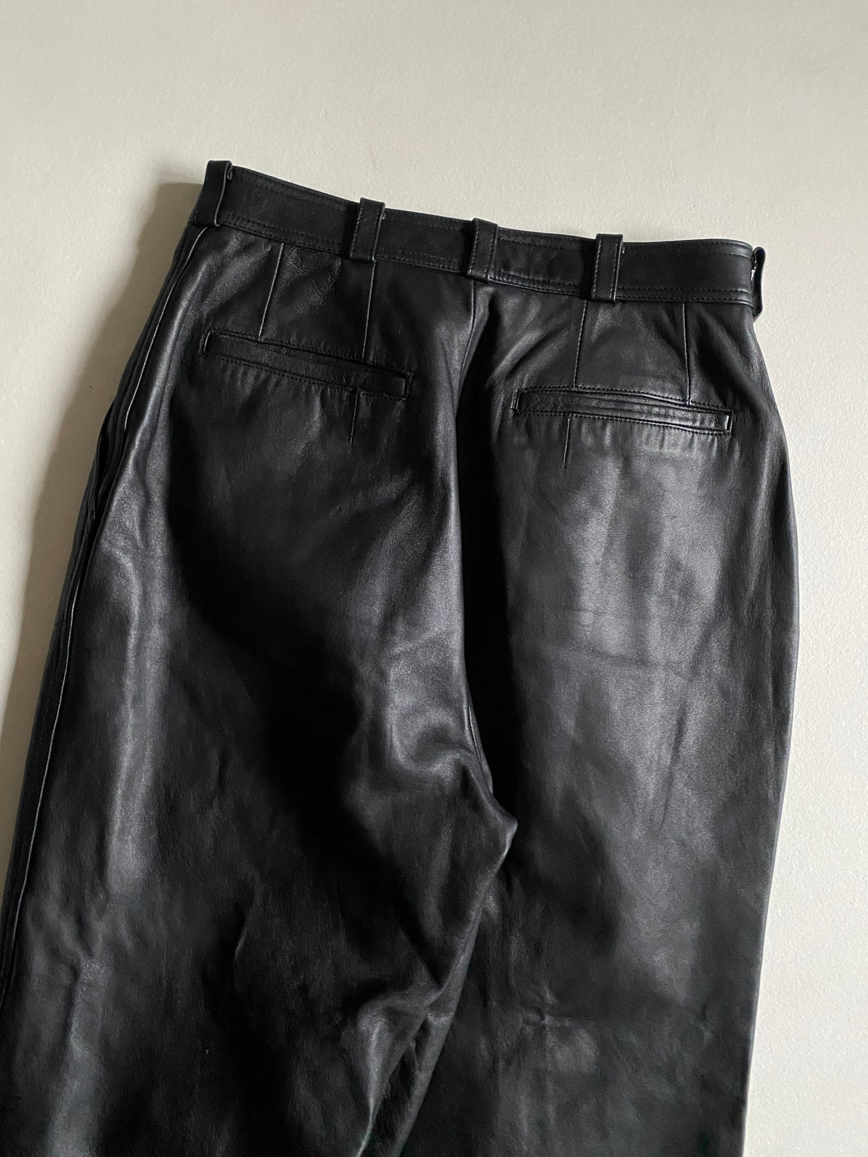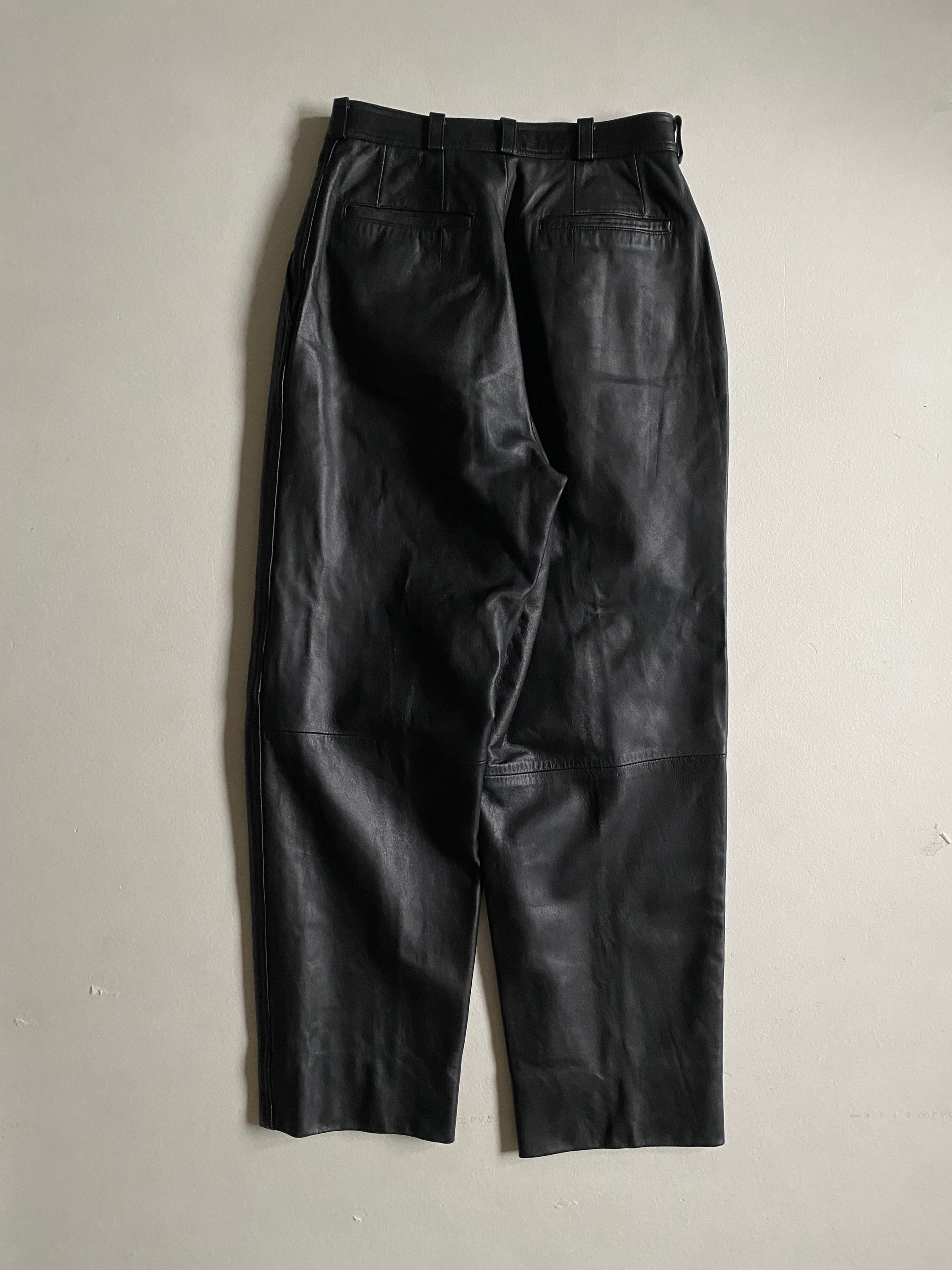 90s-ツータックレザーパンツは、洗練されたシルエットを持つブラックのラムレザー製です。このパンツは、ツータックデザインが特徴で、スタイリッシュなラインを描きます。どんなスタイルにも合わせやすく、カジュアルからフォーマルまで幅広いシーンで活躍すること間違いなしです。