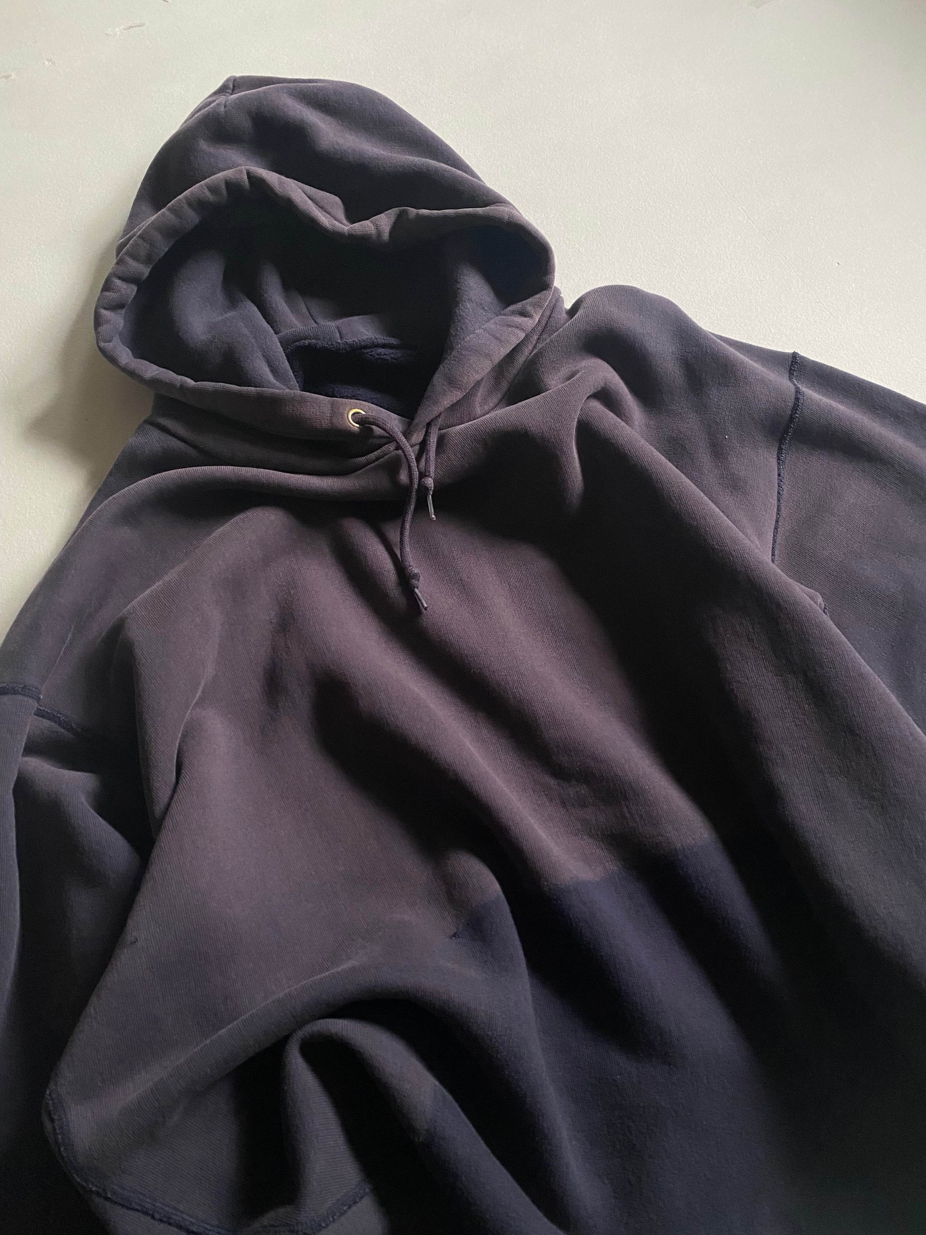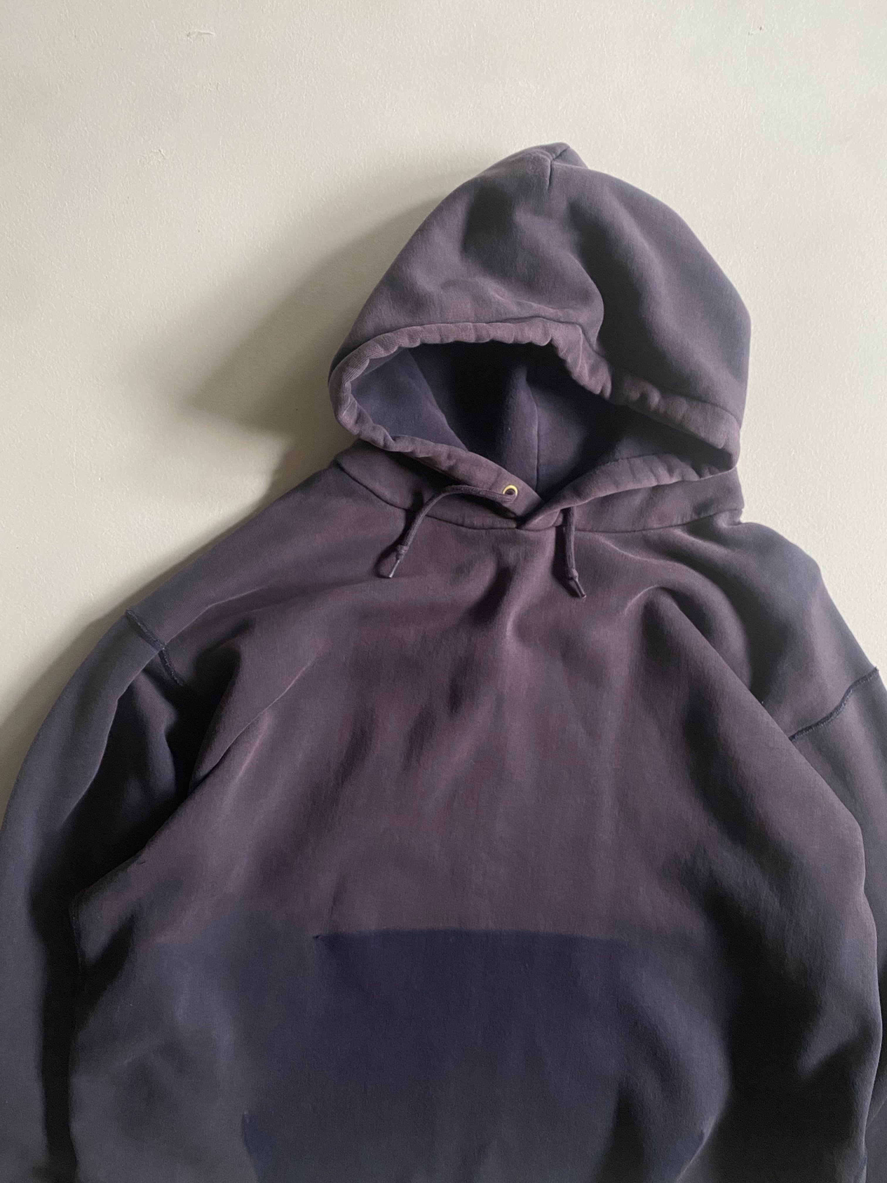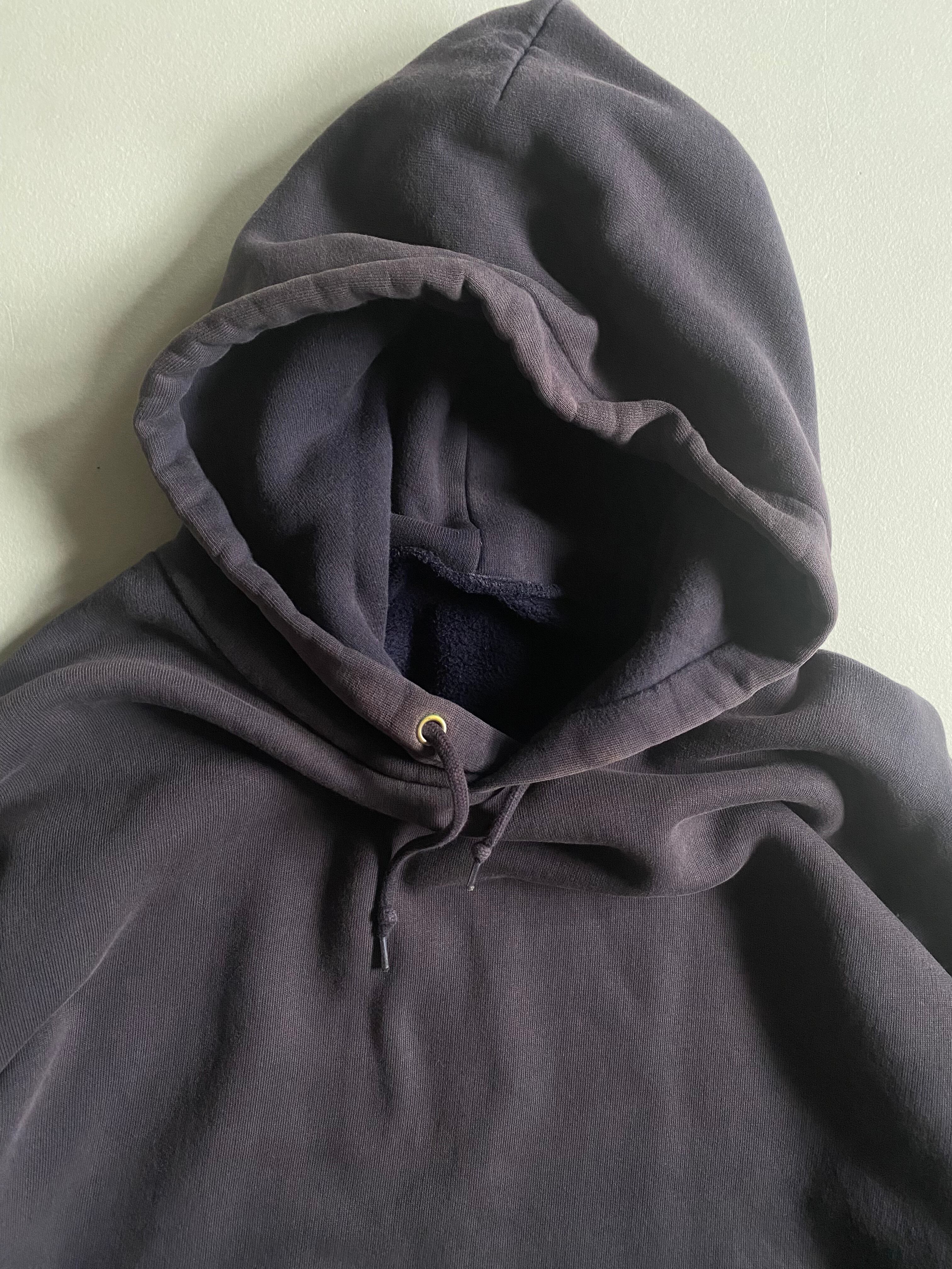 00s- god fade hoodieは、茄子紺の神フェードが魅力的なフーディです。独特なデザインのポケットと切りっぱなしの裾が特徴で、カジュアルながらもトレンド感溢れるアイテムとなっています。このフーディは、リラックスした着心地とスタイリッシュな印象を与える一着です。