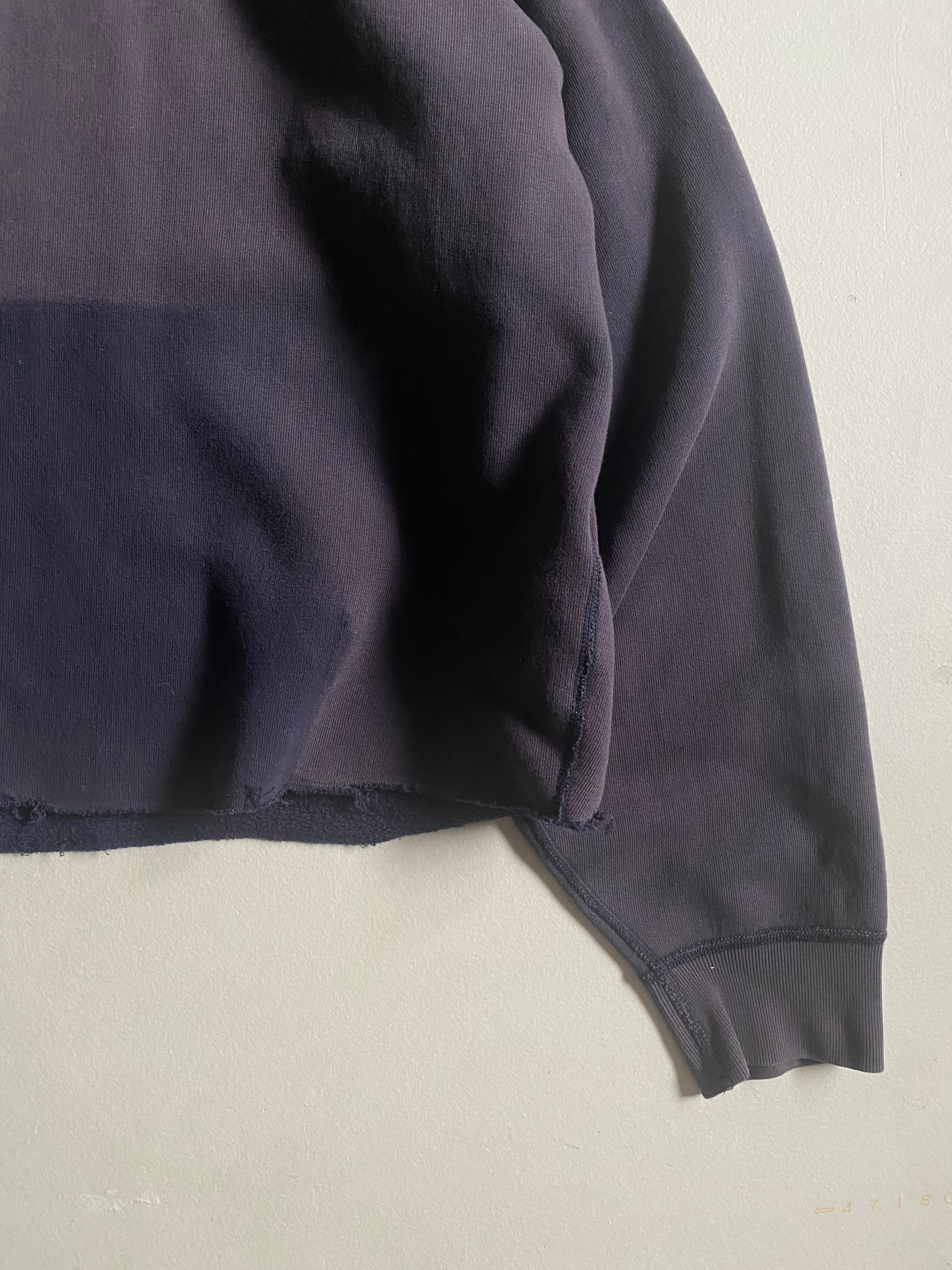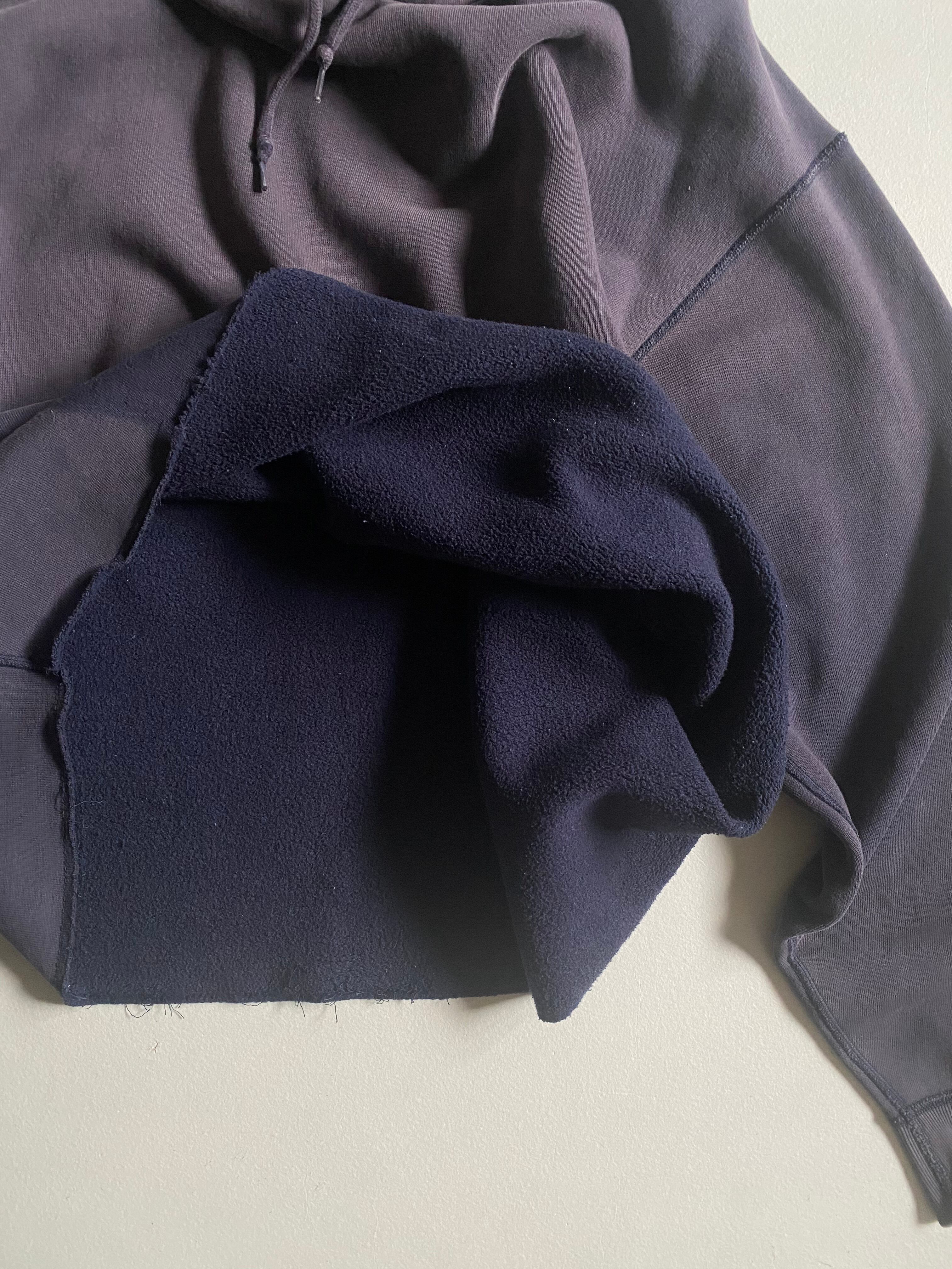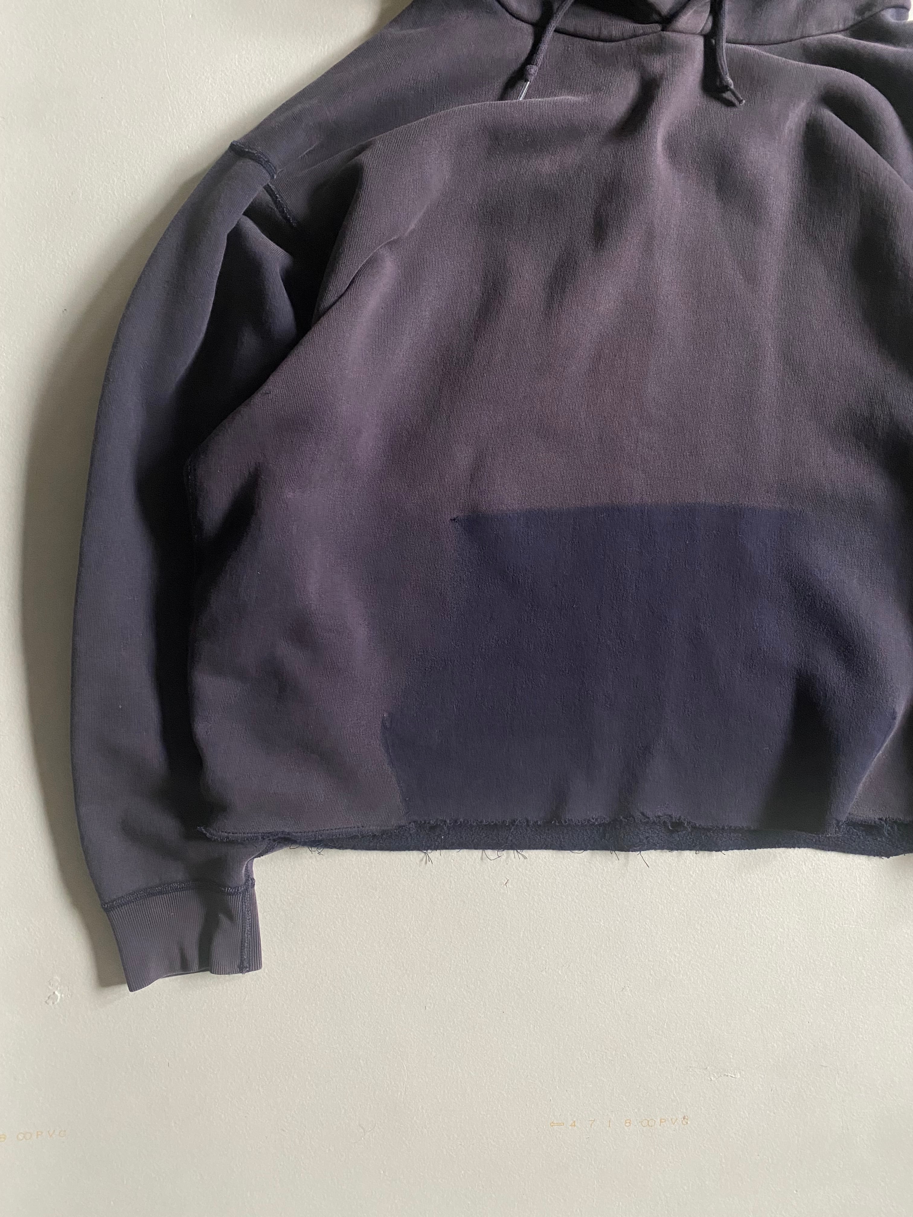 00s- god fade hoodieは、茄子紺の神フェードが魅力的なフーディです。独特なデザインのポケットと切りっぱなしの裾が特徴で、カジュアルながらもトレンド感溢れるアイテムとなっています。このフーディは、リラックスした着心地とスタイリッシュな印象を与える一着です。