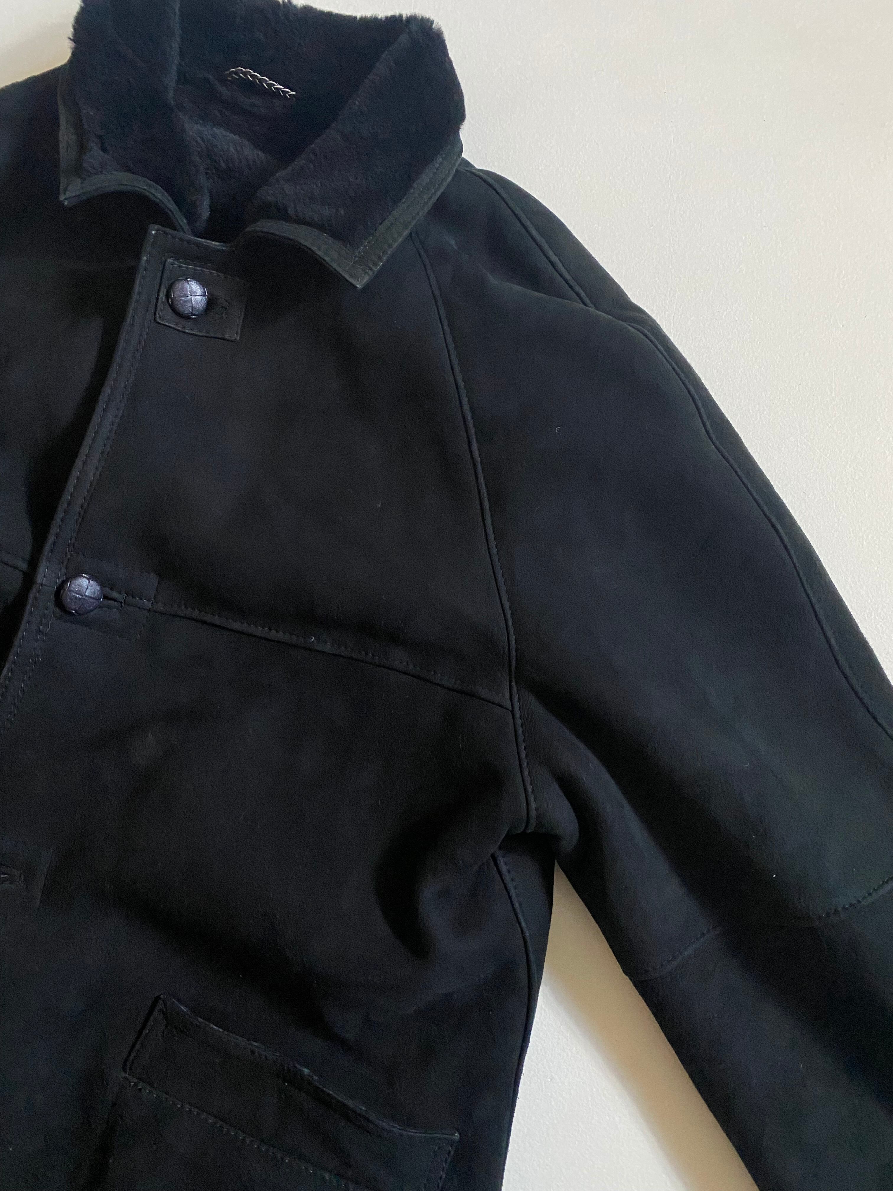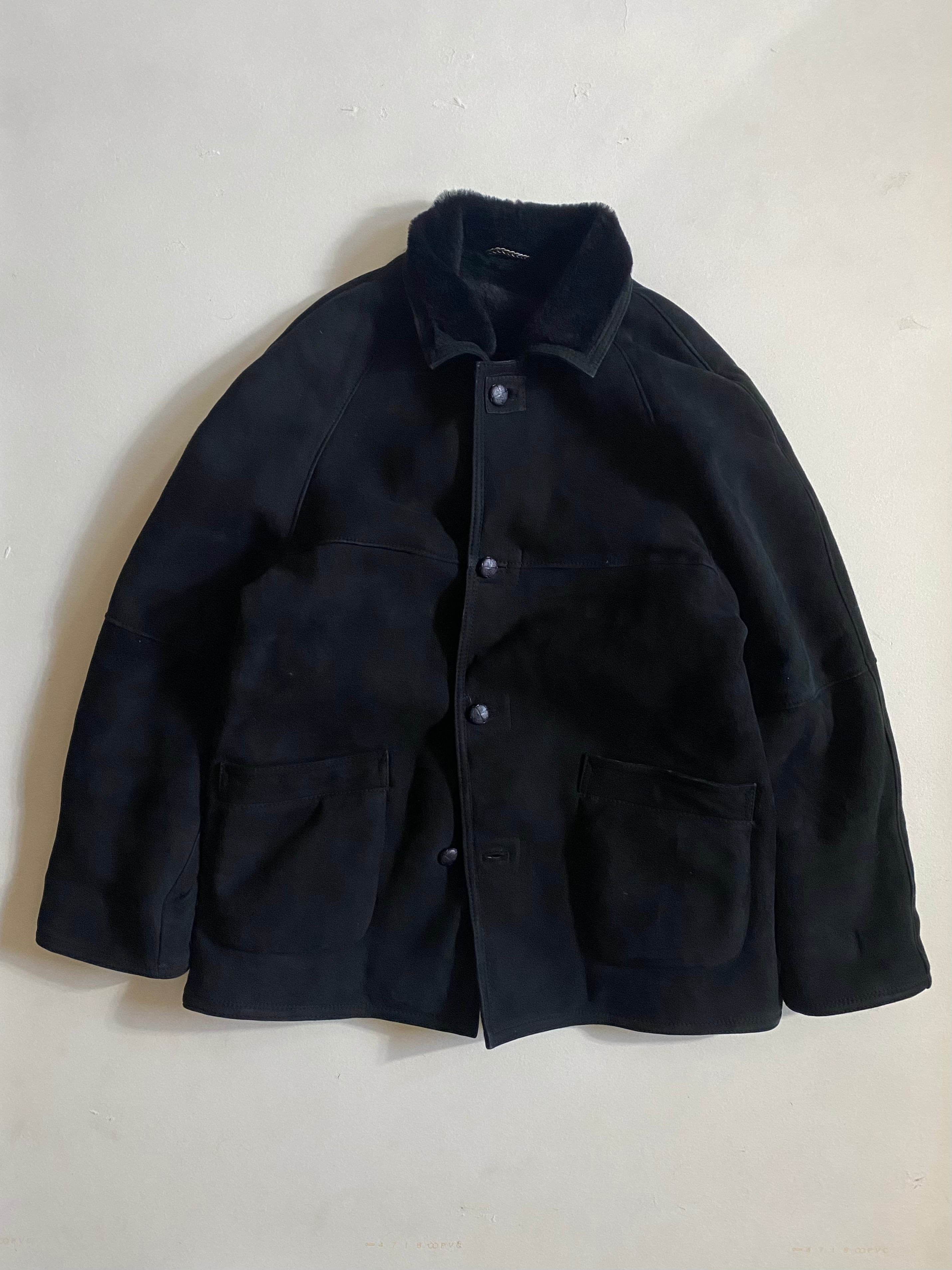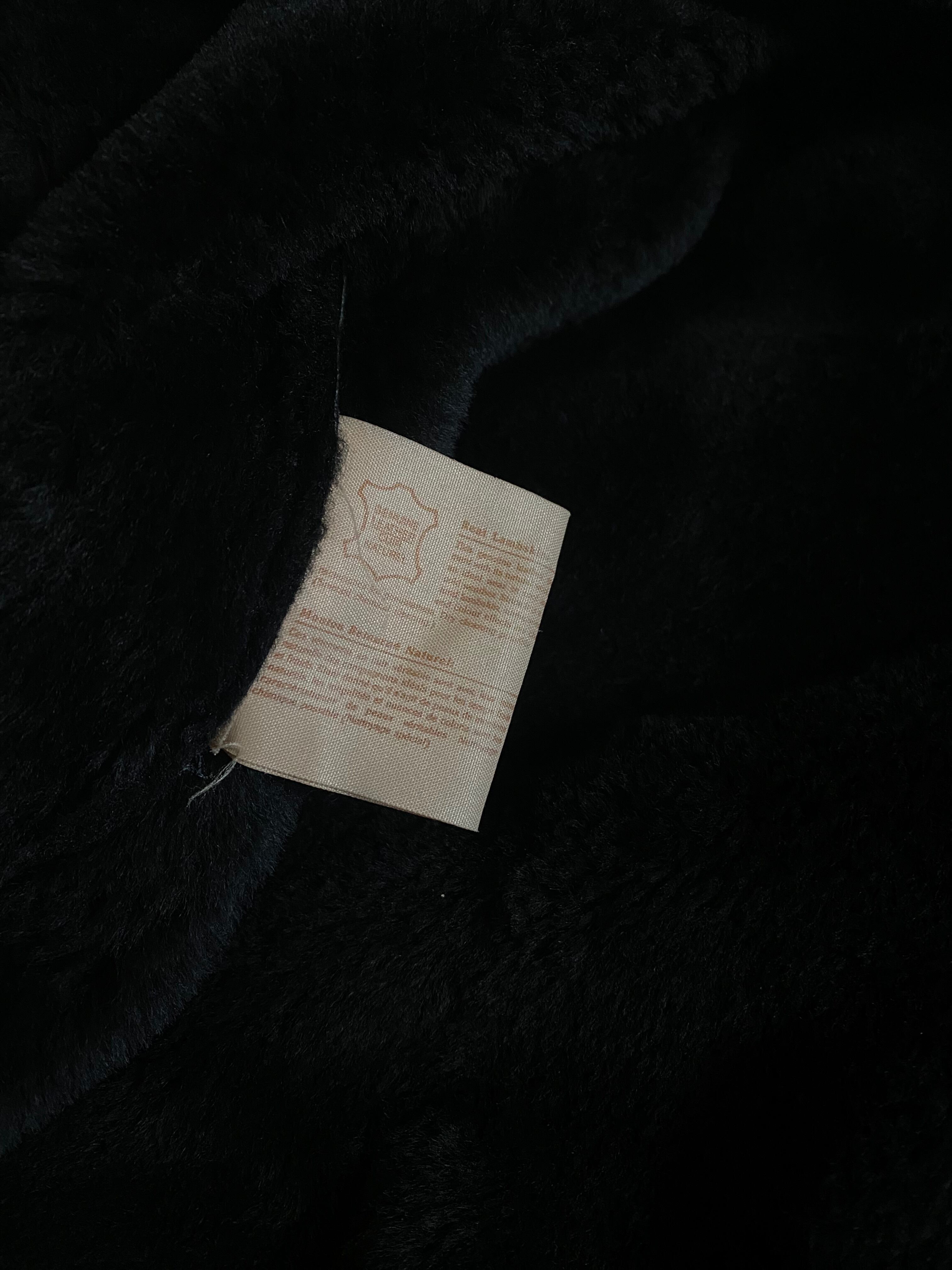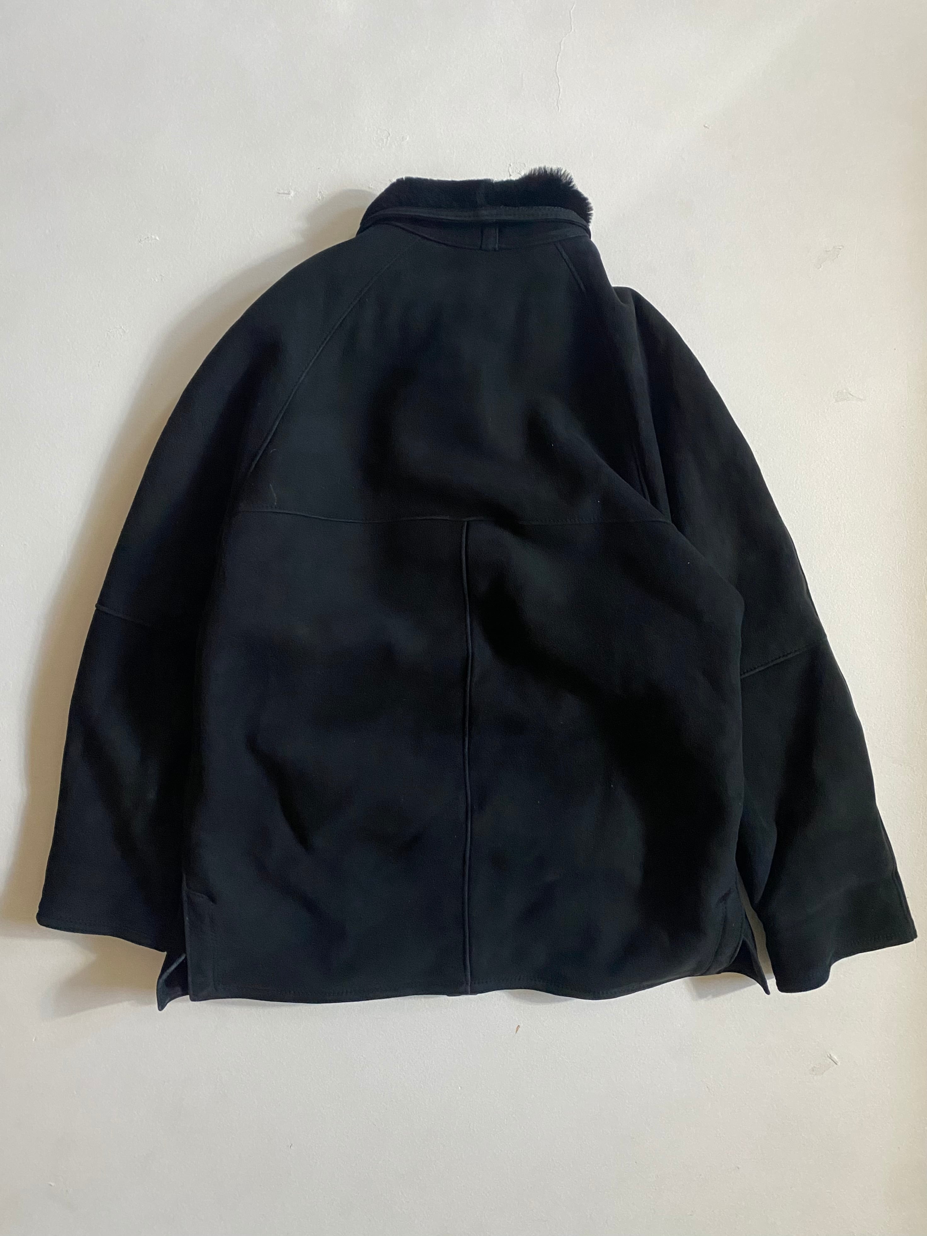 柔らかなブラックムートンコートは、スタイリッシュな印象を与える一着です。ラグランスリーブのデザインにより、オーバーサイズでも肩が張らず、快適な着心地を実現しています。暖かみのある素材感と洗練されたシルエットは、さまざまなスタイルにマッチします。