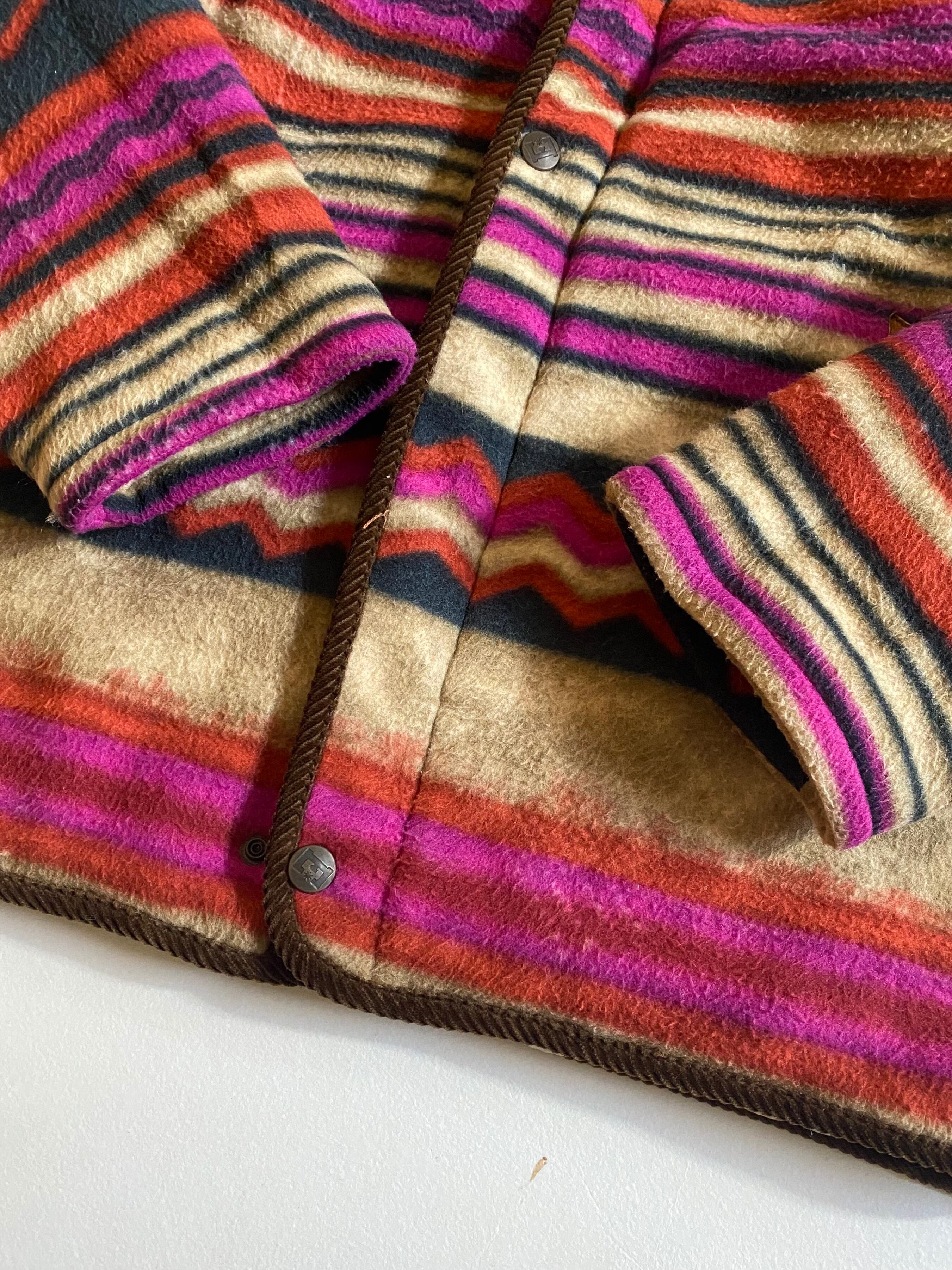 鮮やかなマルチカラーのストライプとジグザグ模様(ピンク、パープル、ベージュ、ネイビー、レッド、オレンジ系)。伝統的なナバホブランケット柄をモチーフにした大胆なパターンで、袖から裾まで全面に広がっています。