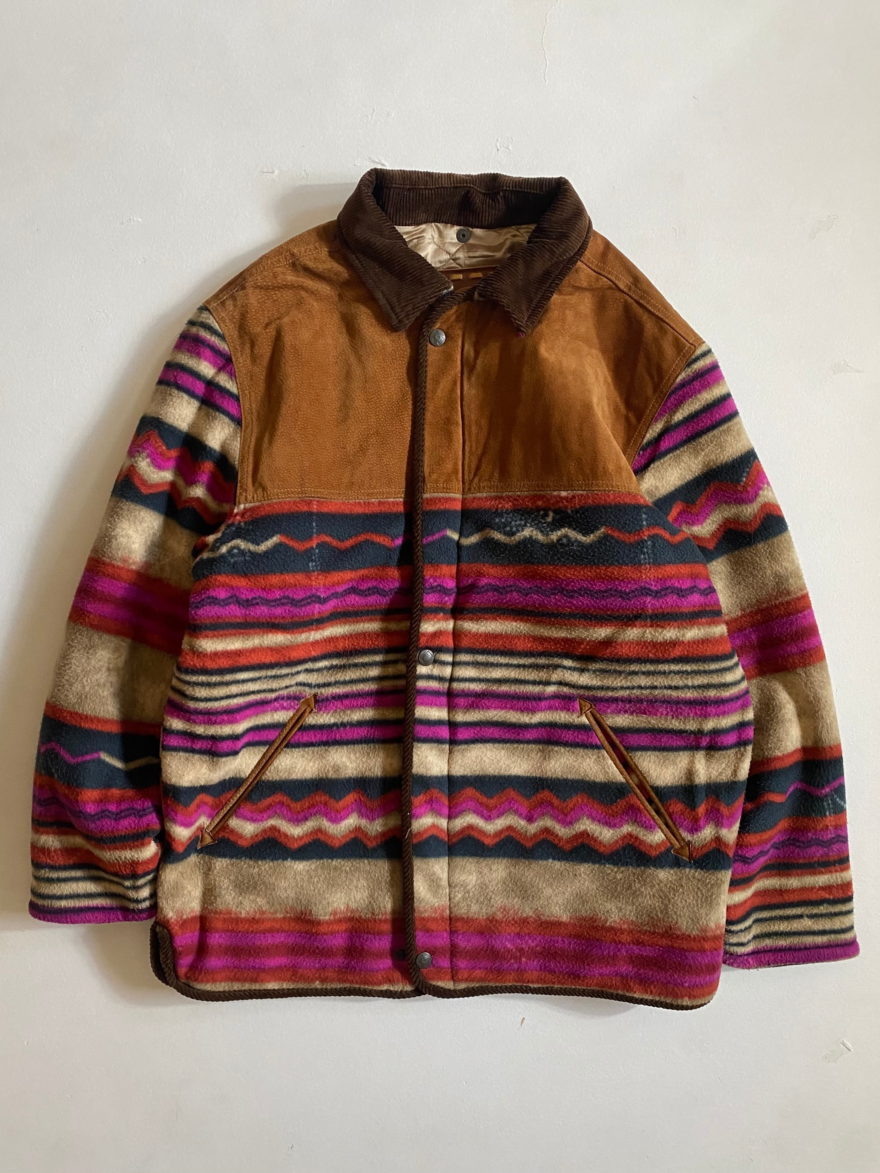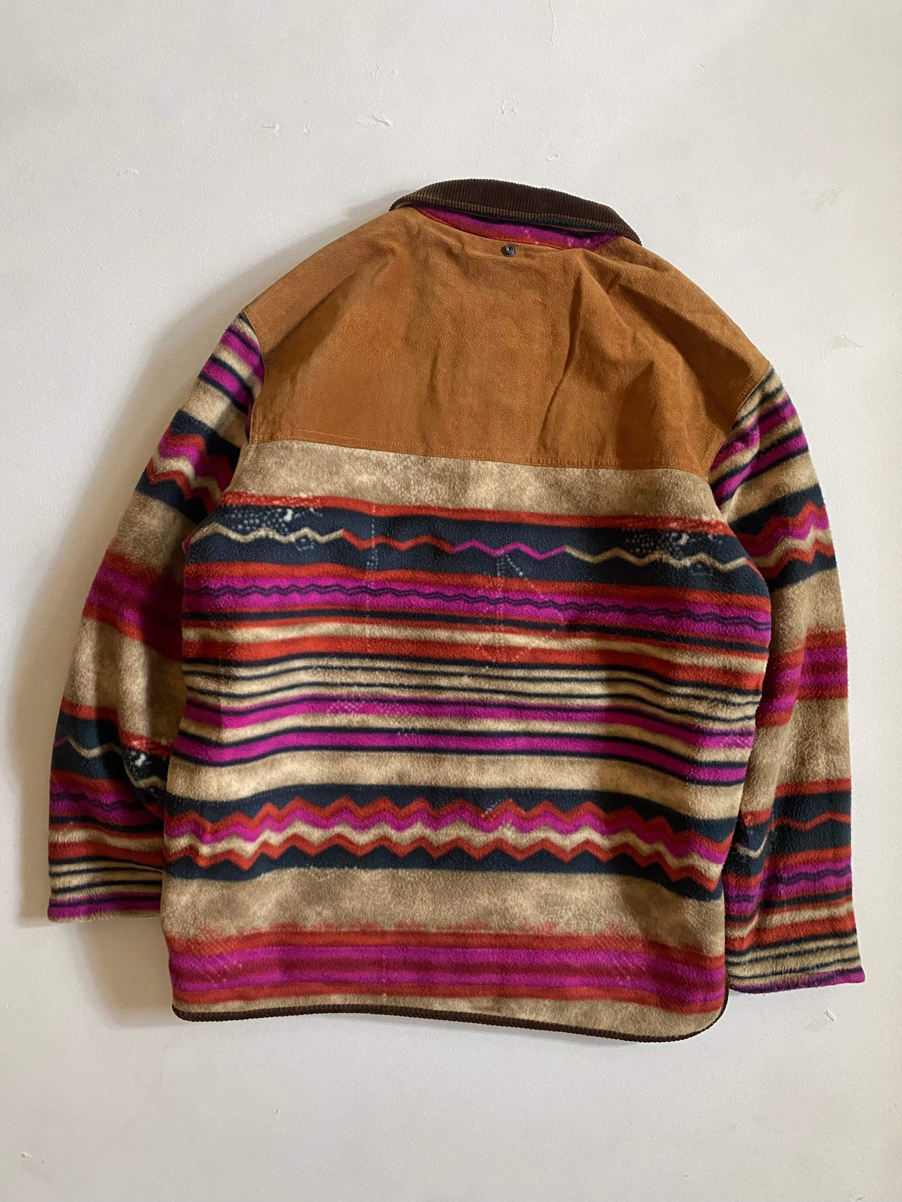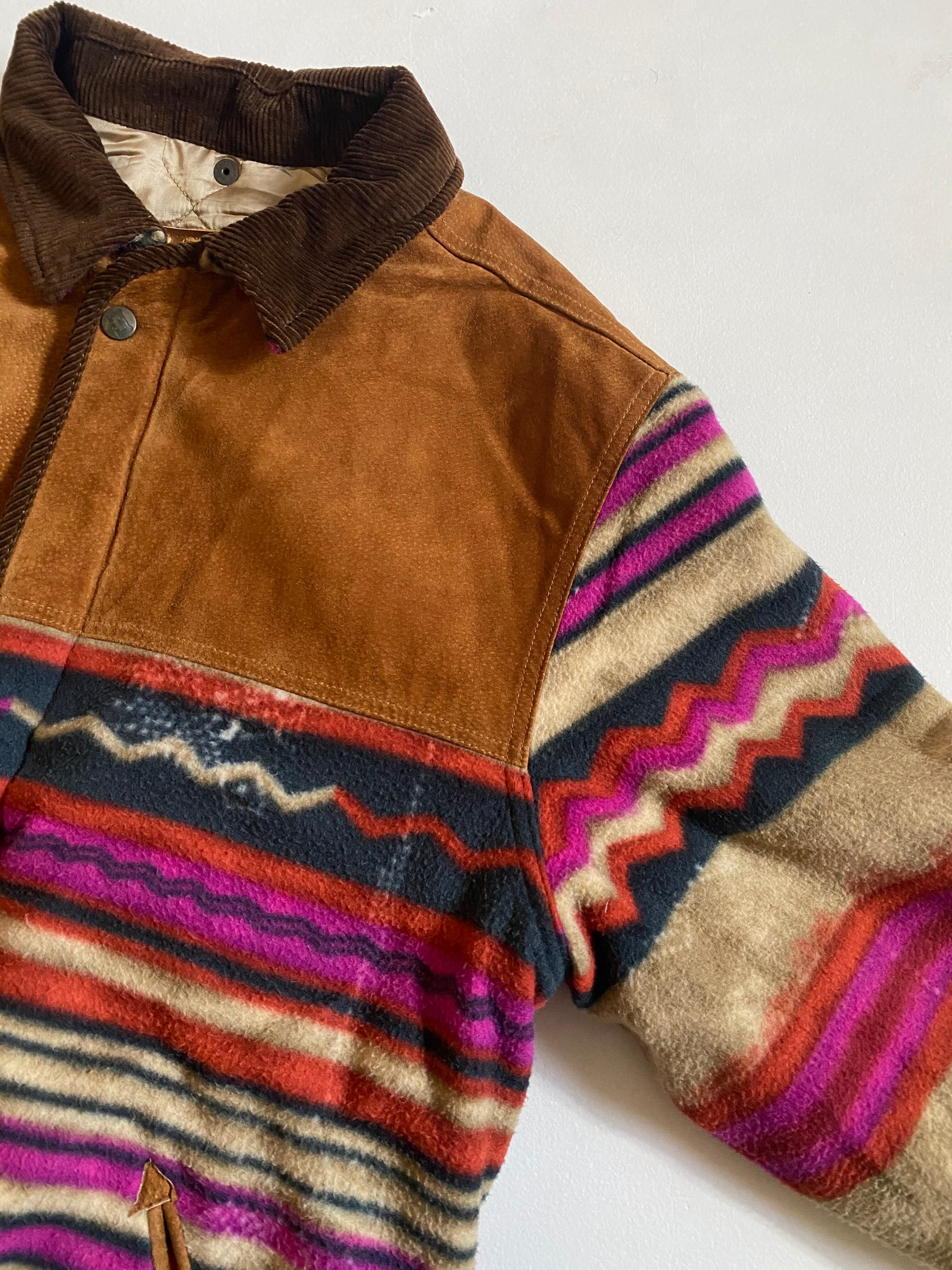 ヴィンテージスタイルのアズテック柄フリースジャケットです。1990年代頃のサウスウェスタンデザインを彷彿とさせるクラシックな一着で、ネイティブアメリカン風の幾何学模様が特徴的です。