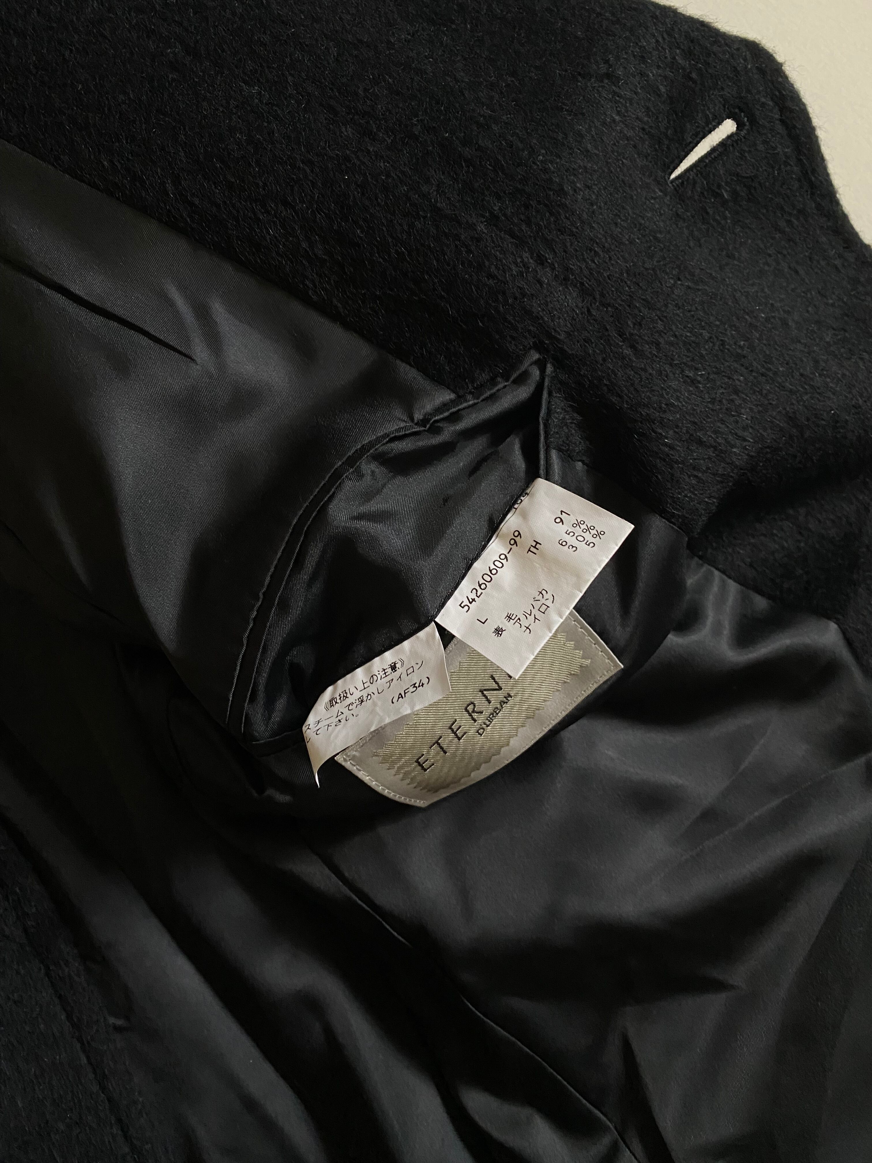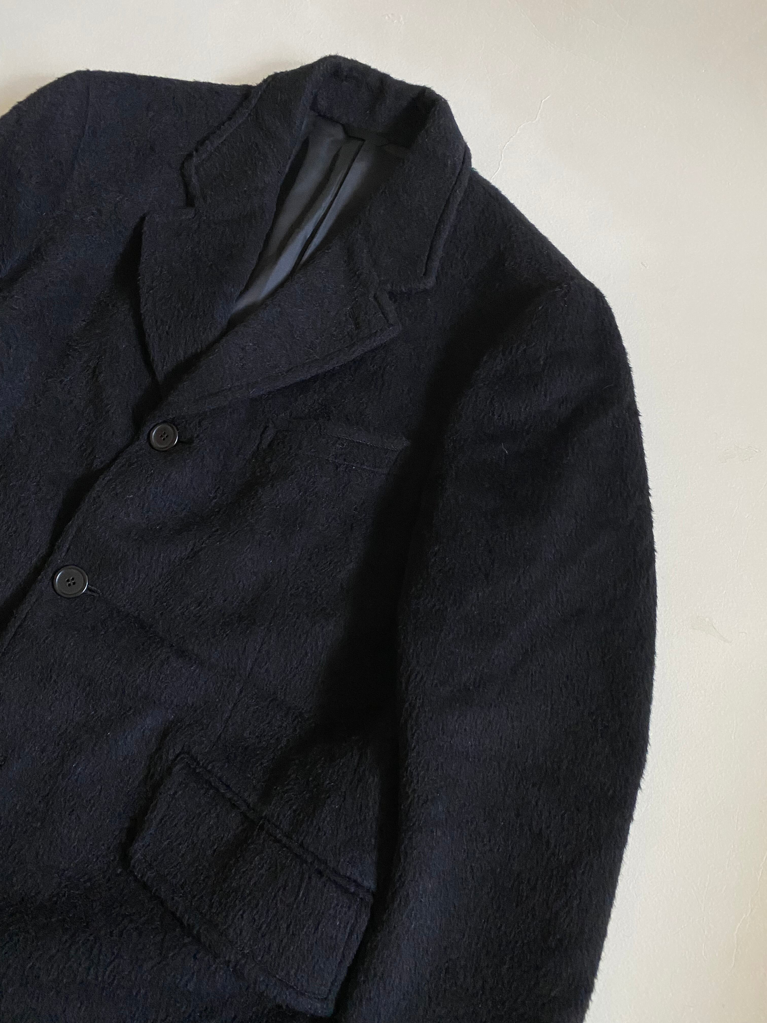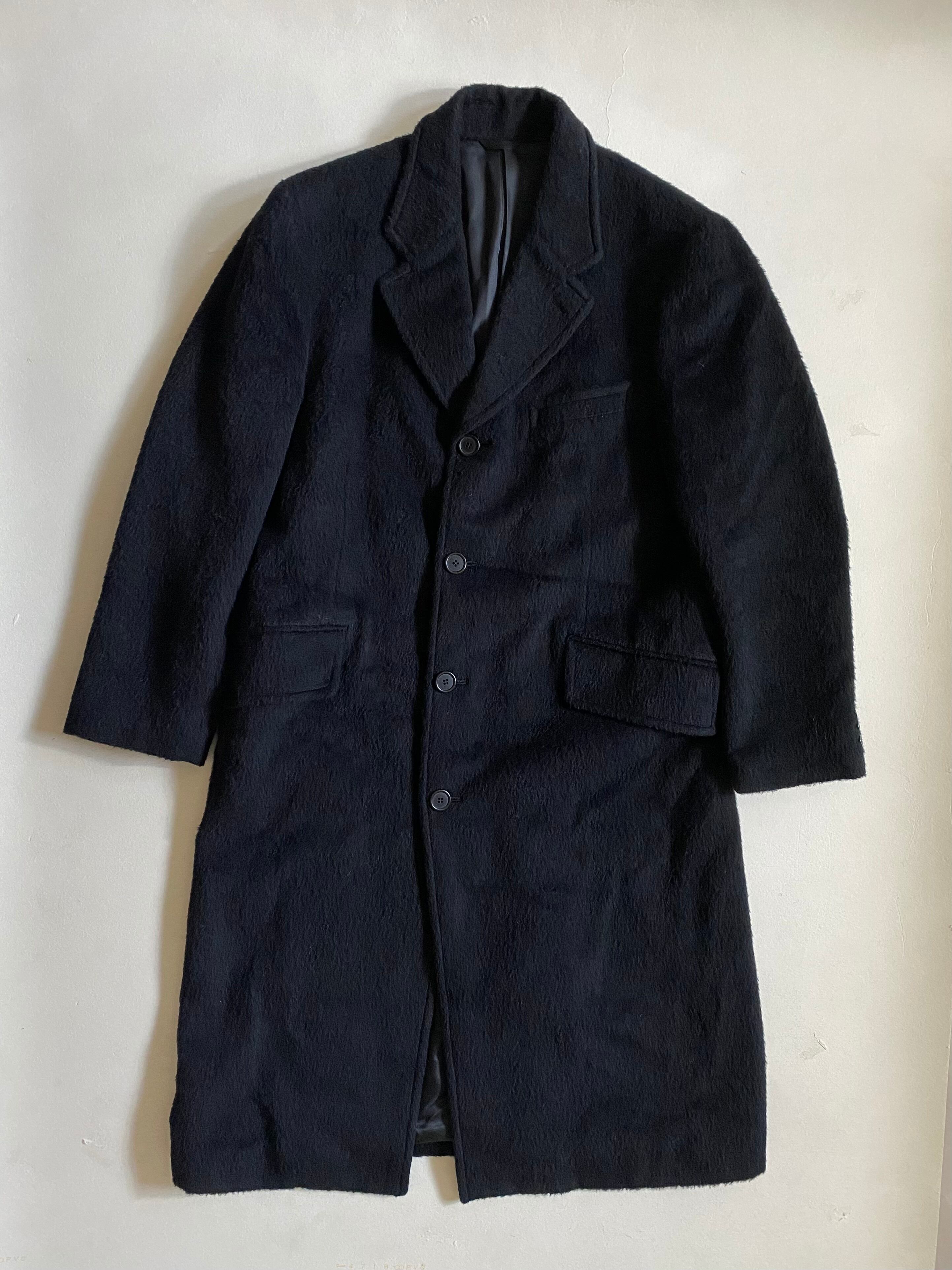 クラシックなシングルブレストのチェスターコートで、ブラックのウール地に起毛加工が施された、温かみのあるテクスチャーが特徴的なヴィンテージアイテムです。