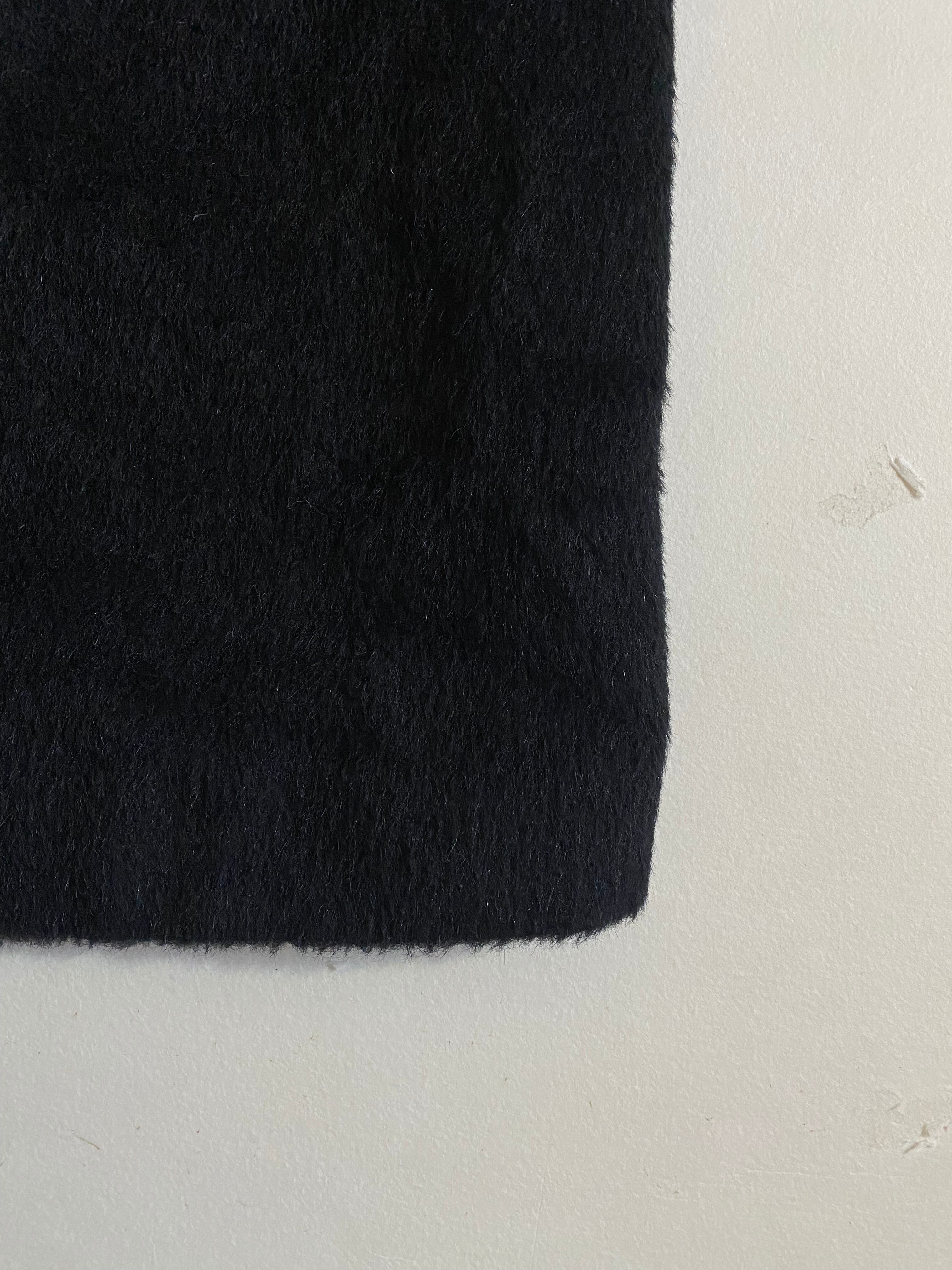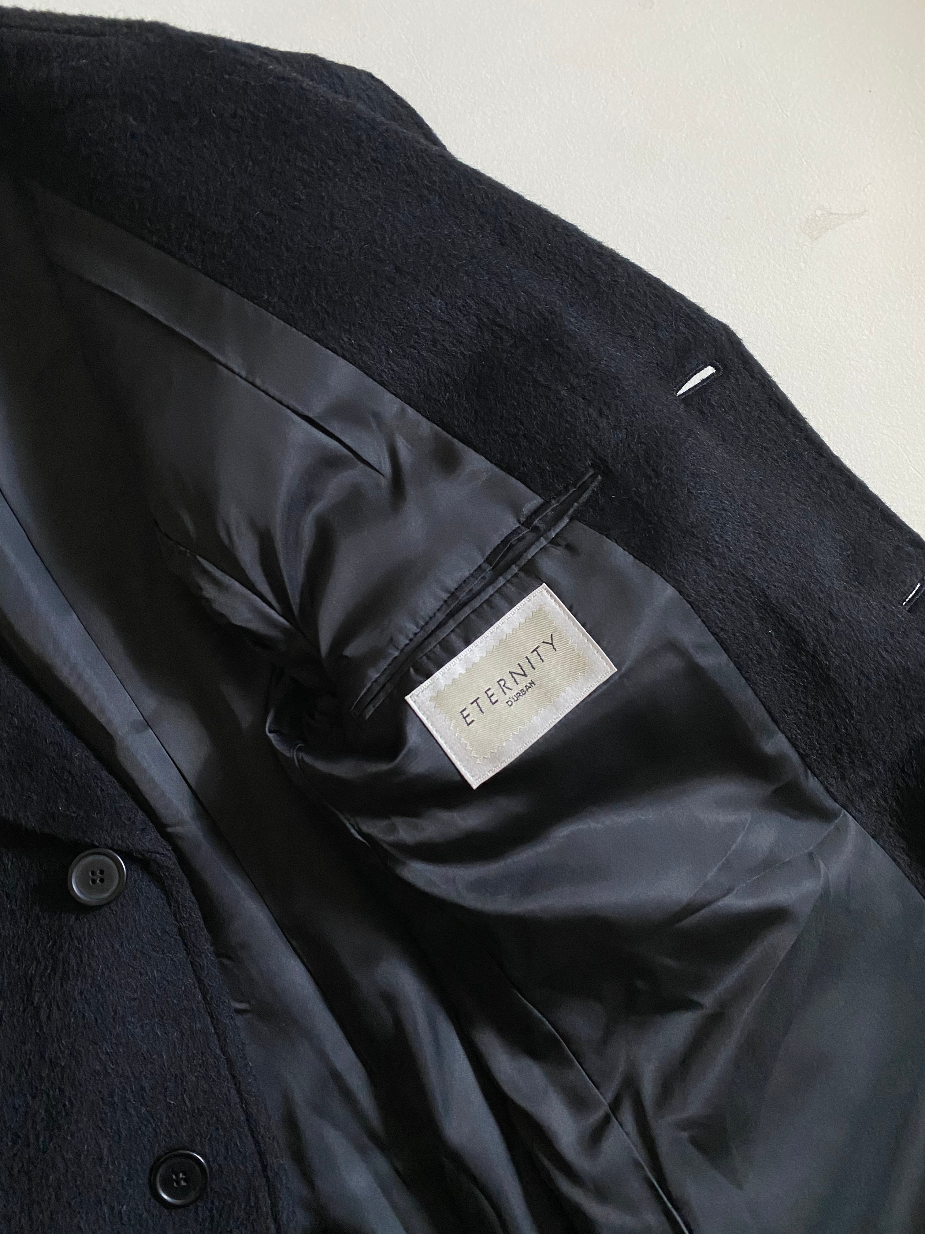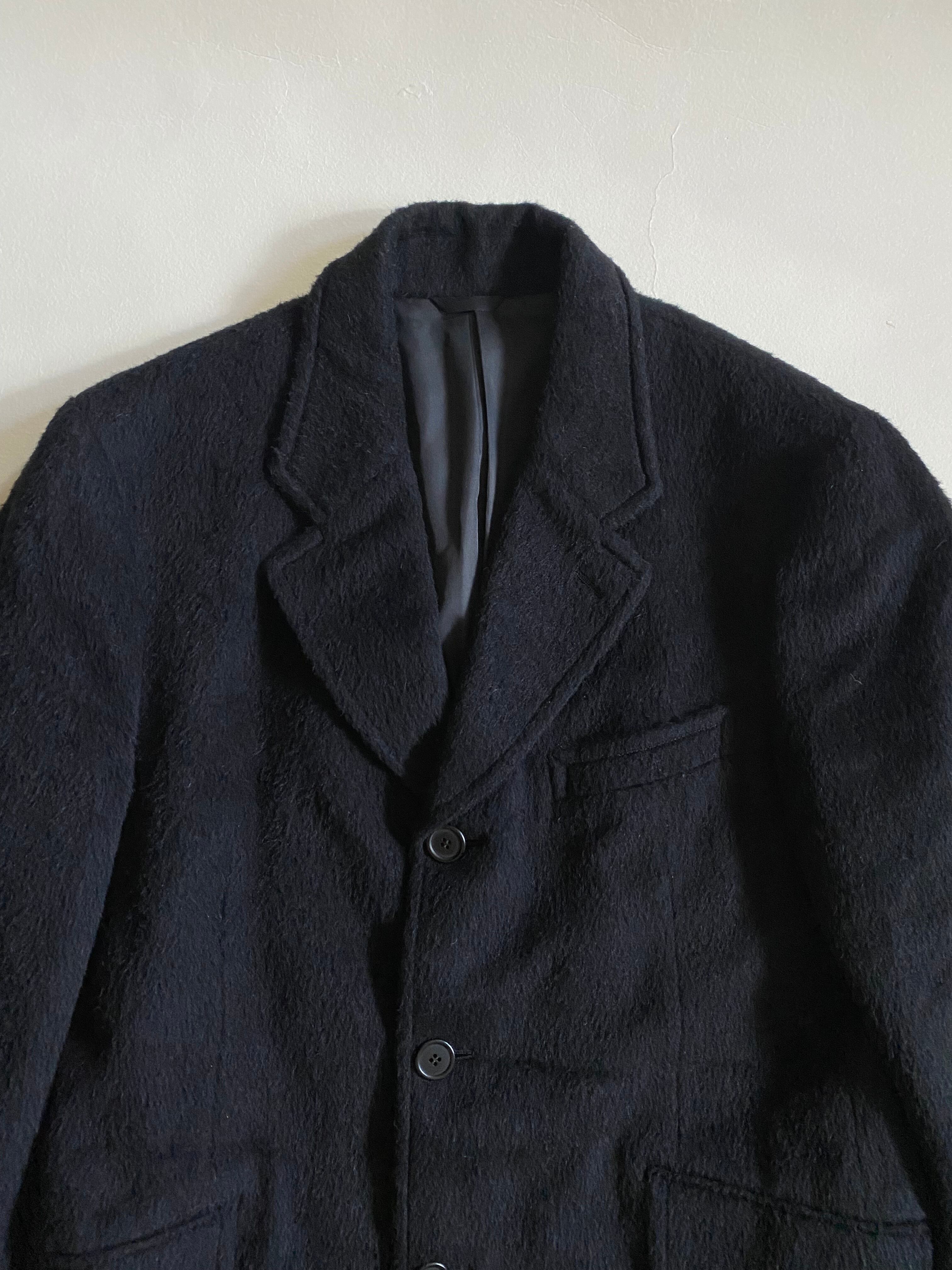 クラシックなシングルブレストのチェスターコートで、ブラックのウール地に起毛加工が施された、温かみのあるテクスチャーが特徴的なヴィンテージアイテムです。