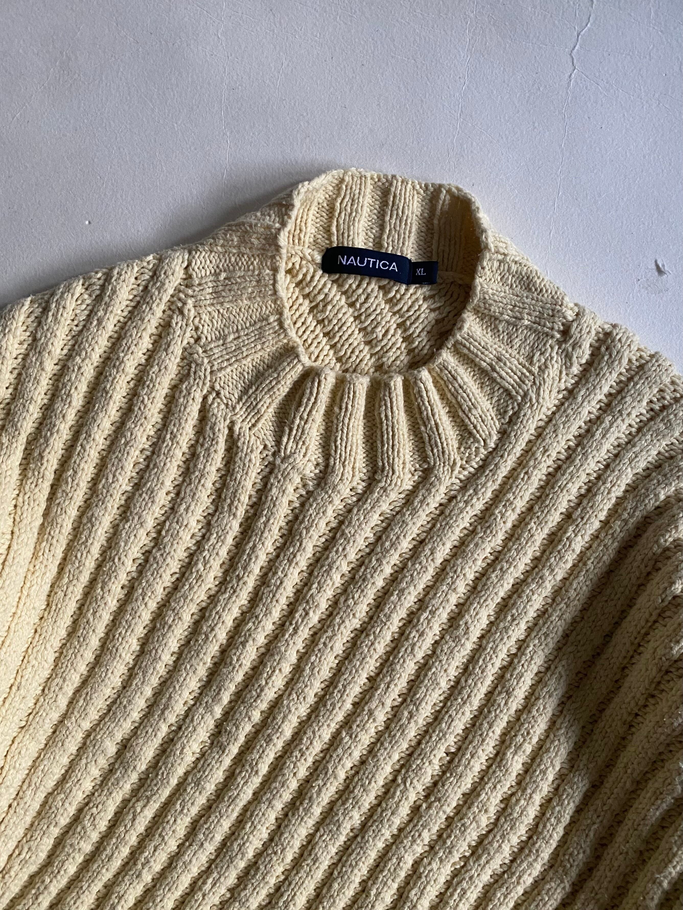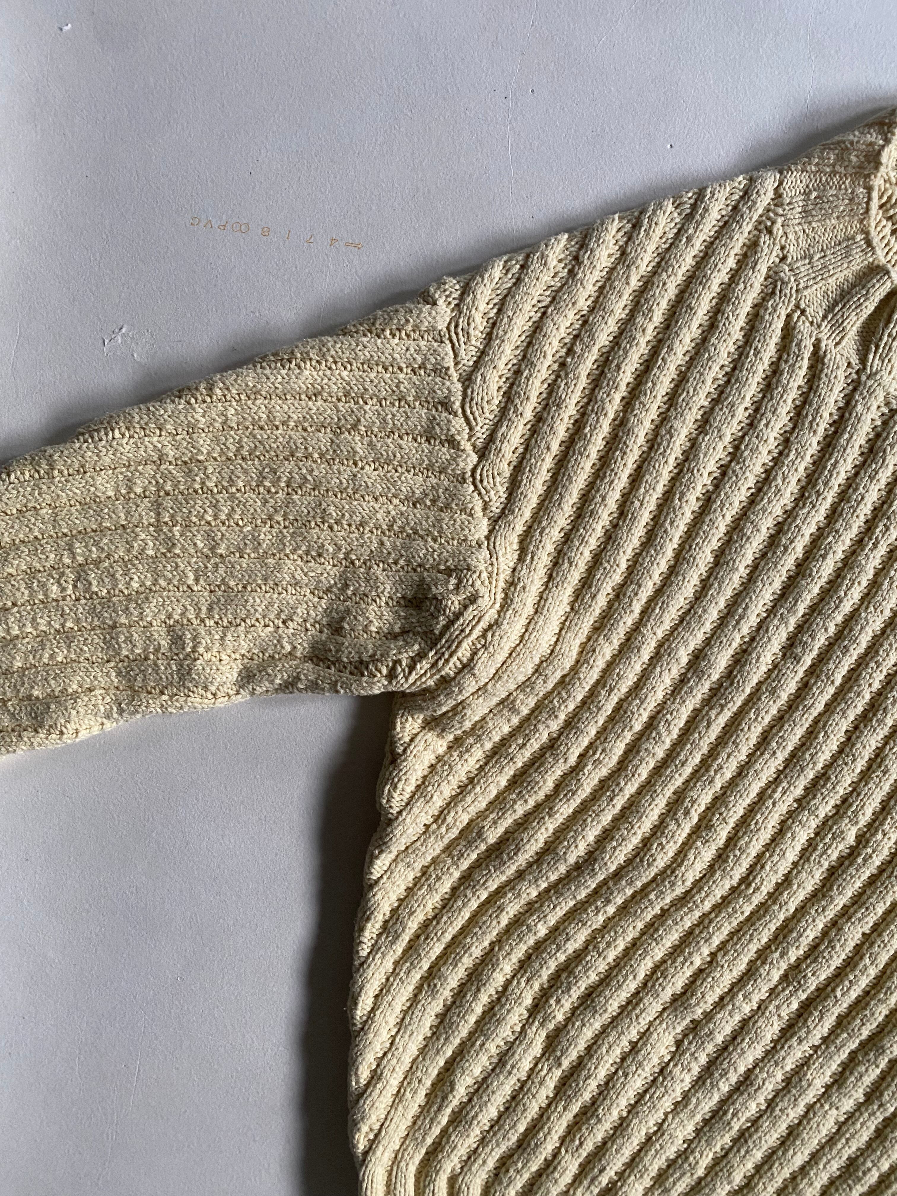 柔らかなクリームカラーのボディに、特徴的な斜行したリブ編みが施され、立体感のある独特のテクスチャーが魅力。クラシックなフィッシャーマンセーターを思わせるトラディショナルなデザインで、ナチュラルな風合いがコーディネートを上品に引き立てます。