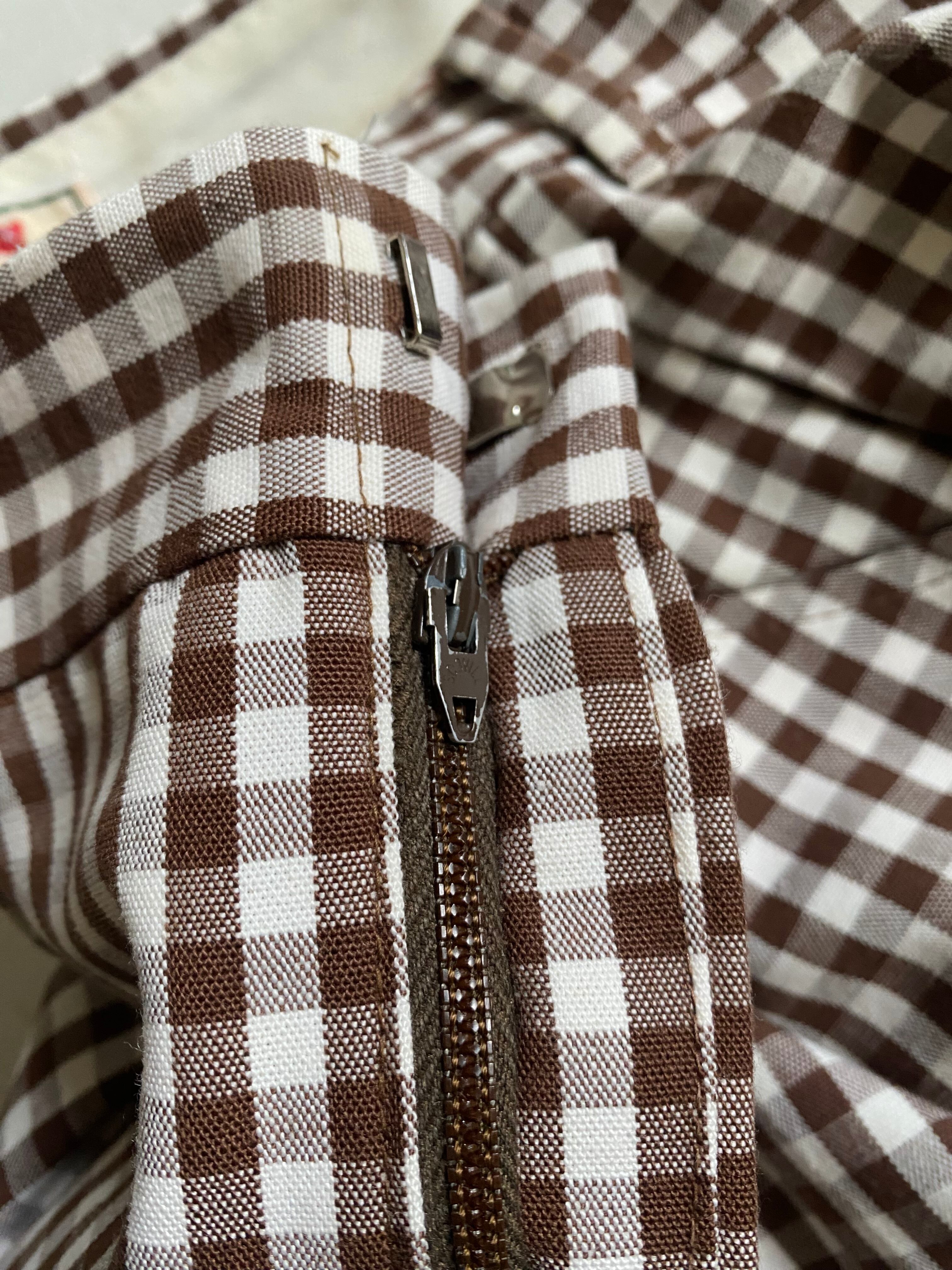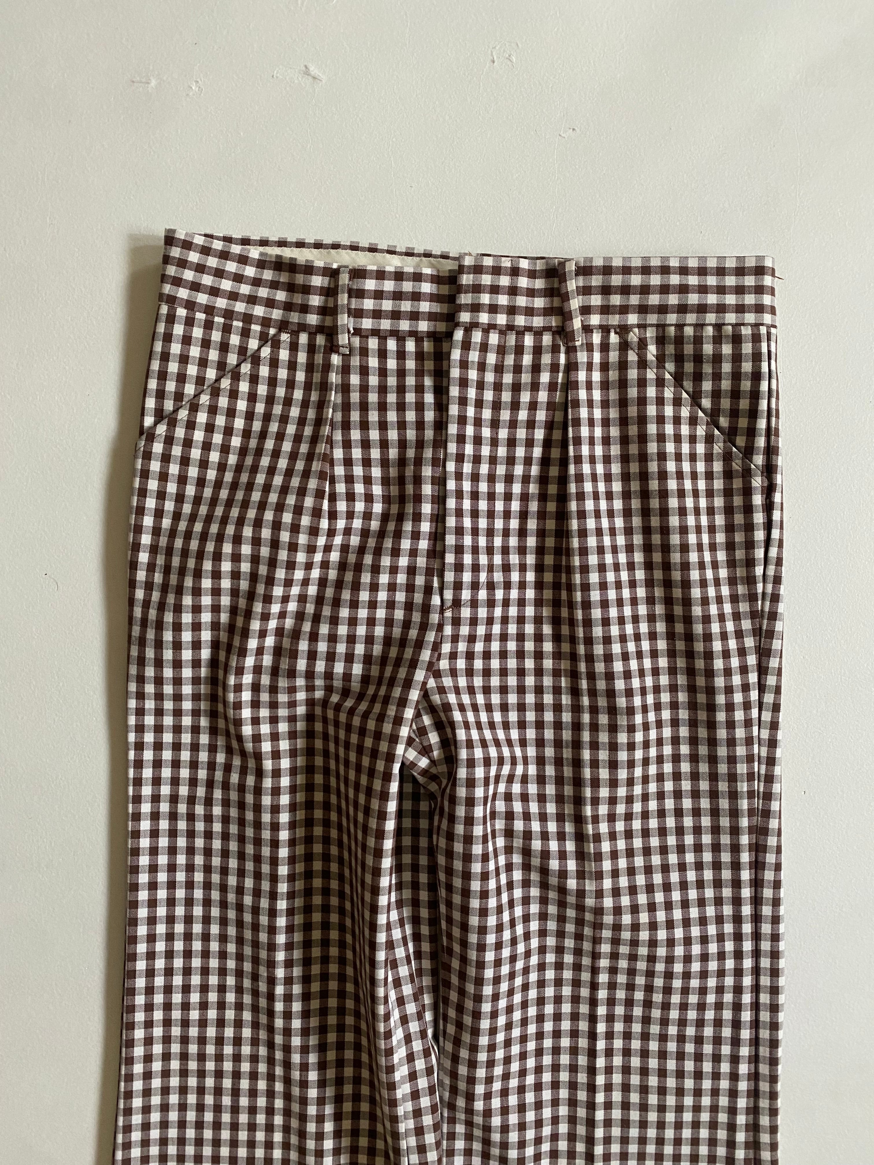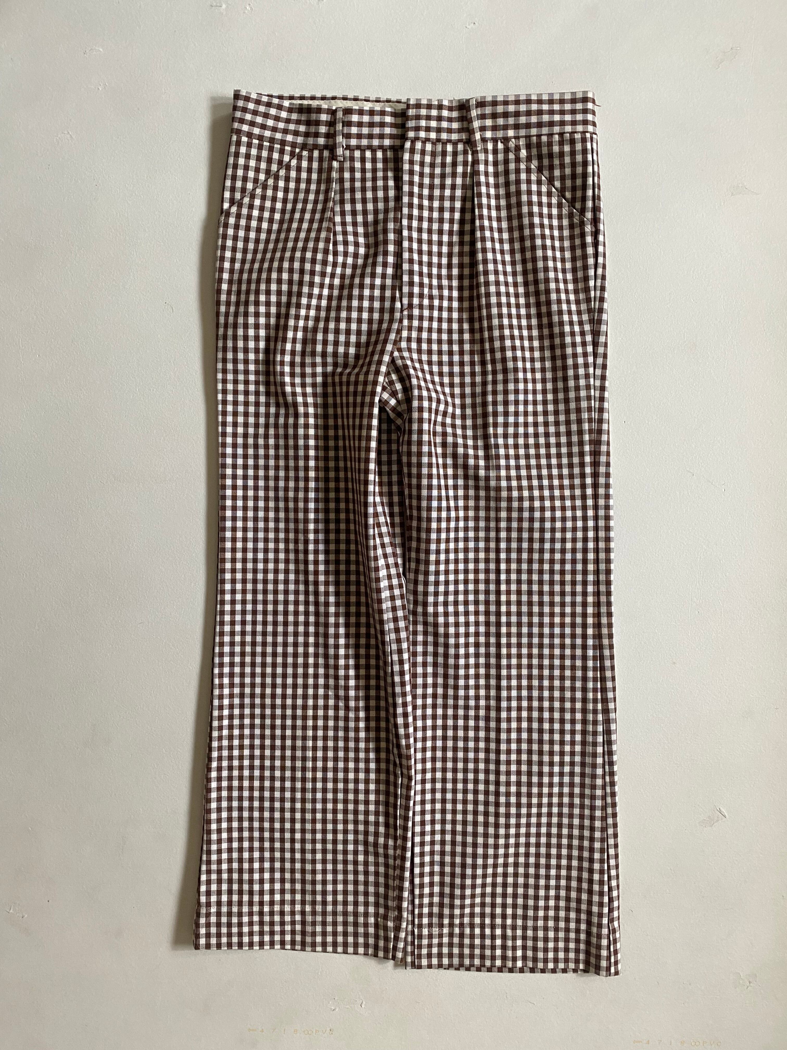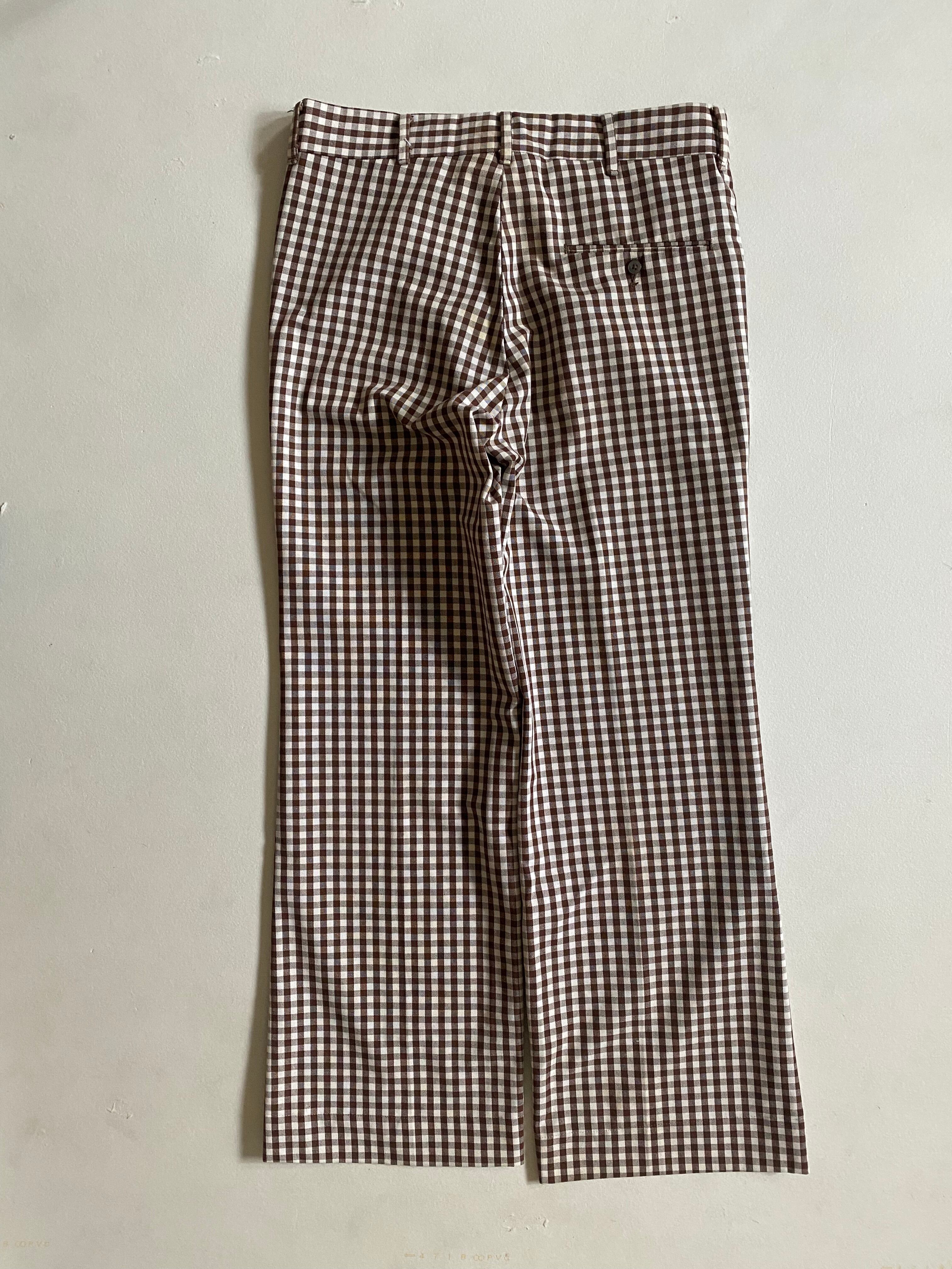 クラシックなブラウンホワイトのチェック柄が印象的なスラックスです。軽やかなコットンポリ素材を使用しており、季節を問わず快適に着用できるアイテムに仕上がっています。