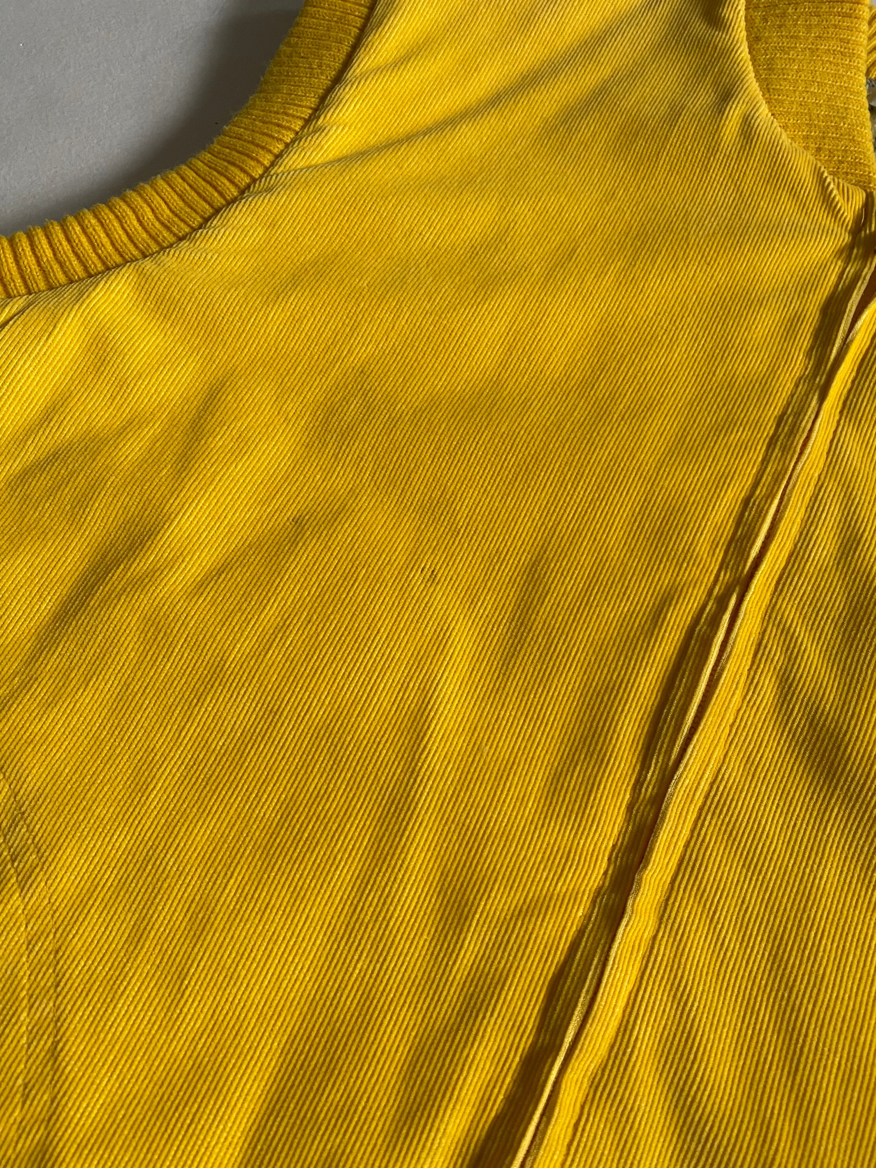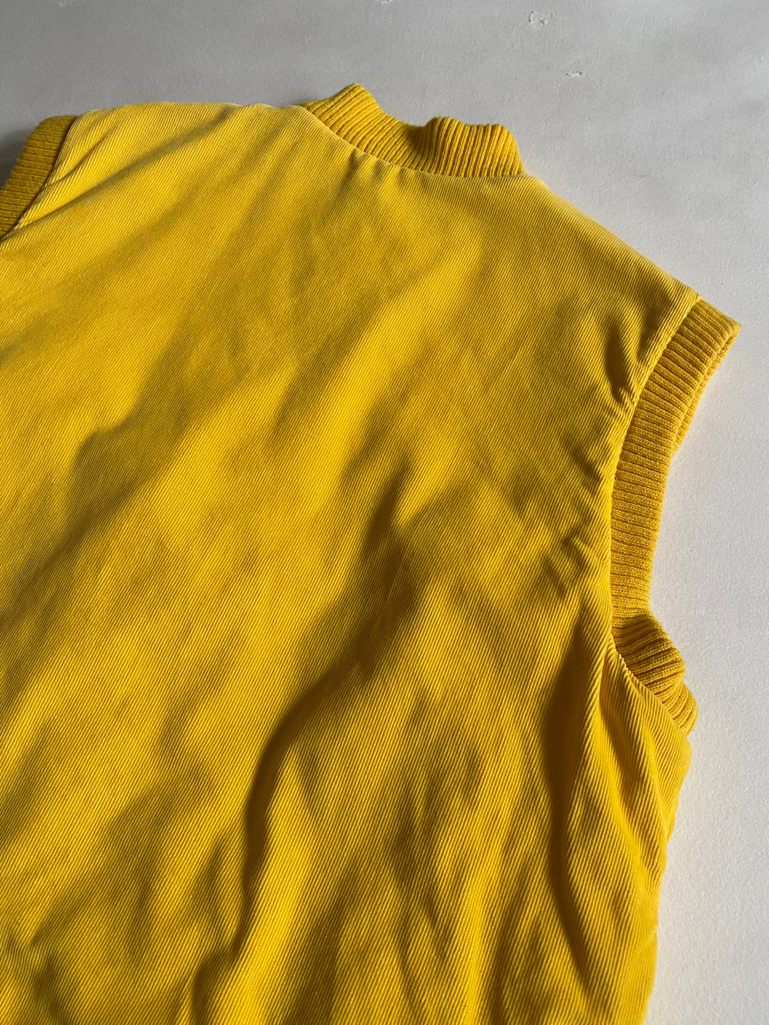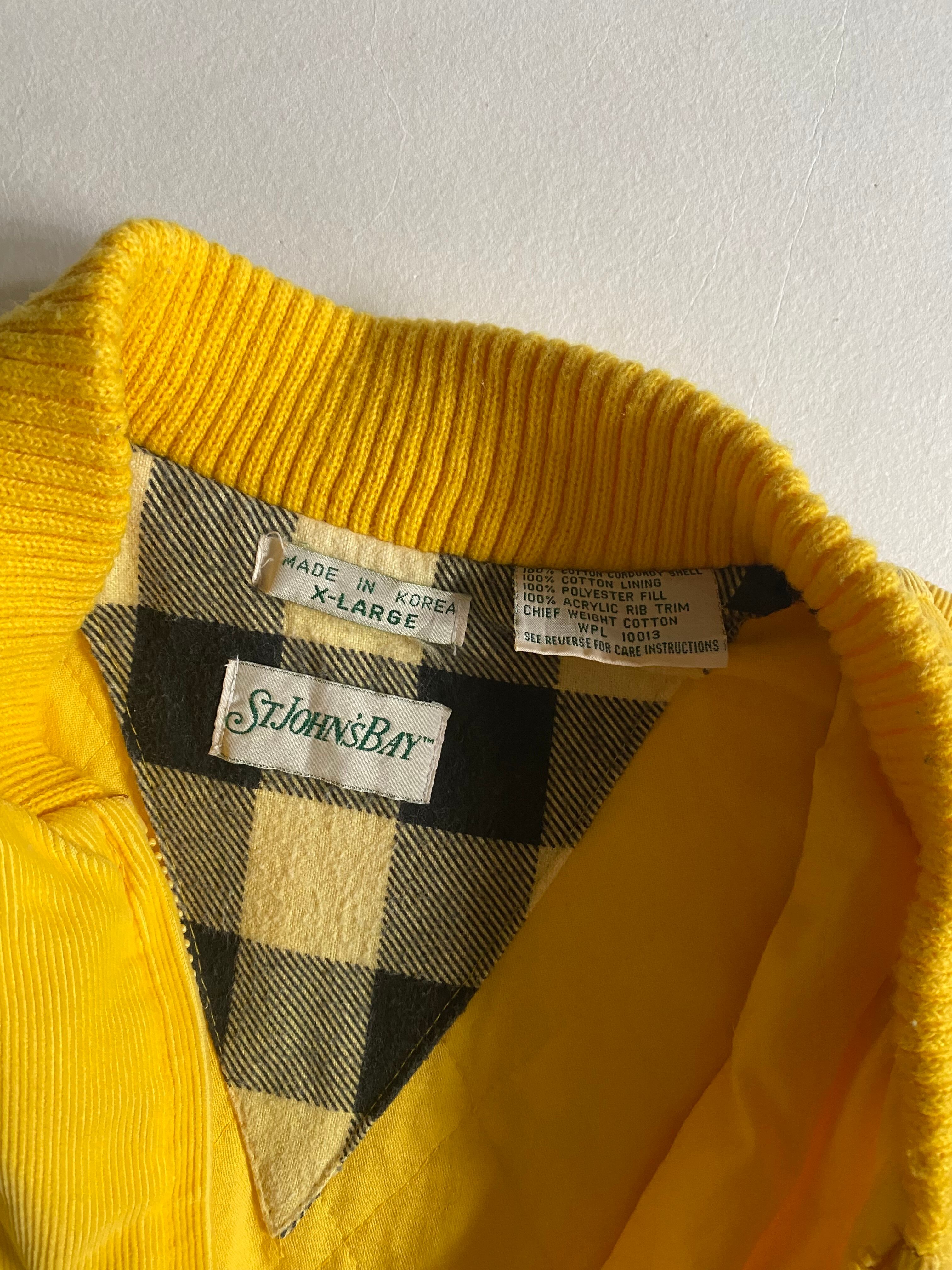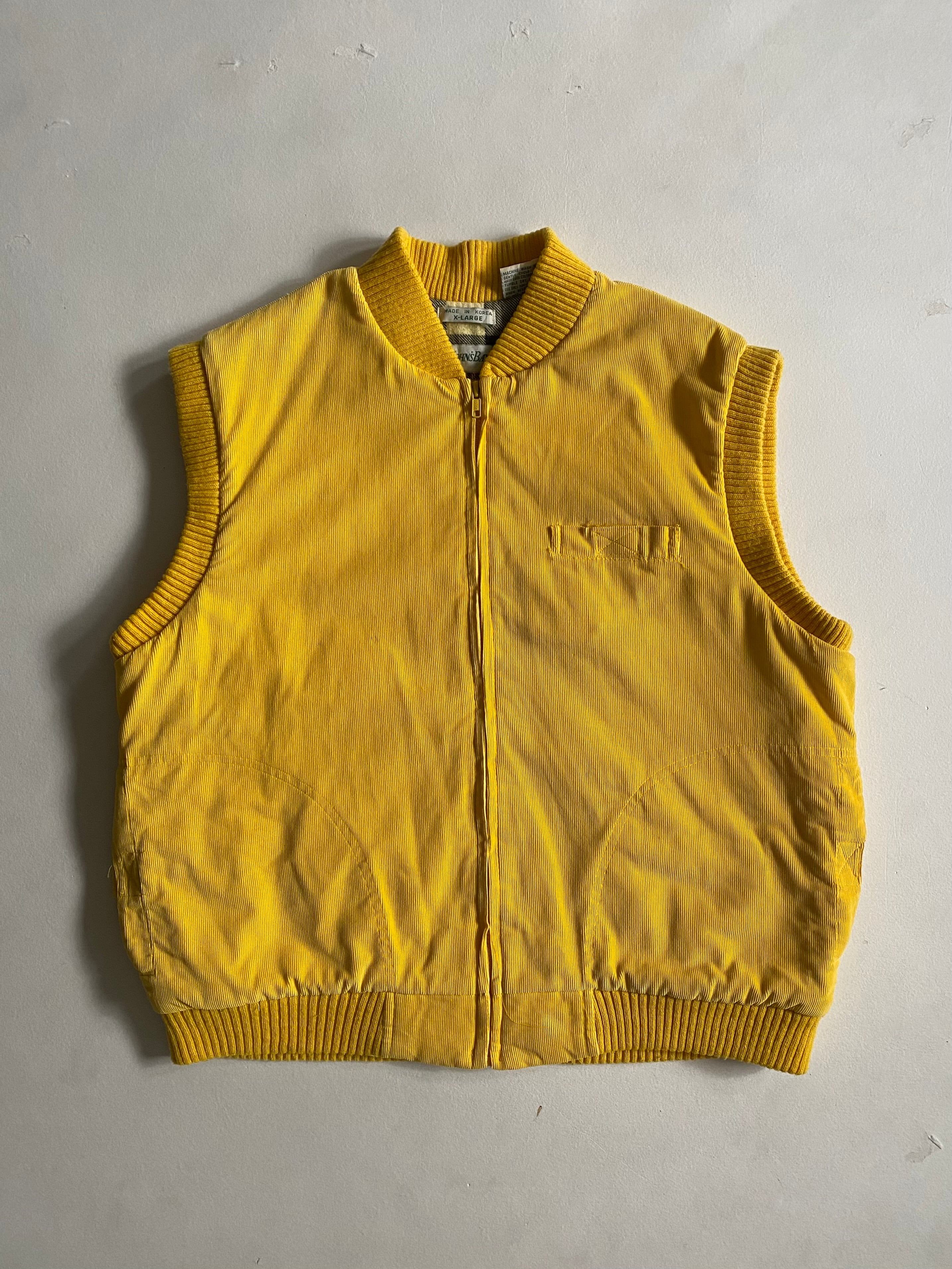 キュートなイエローカラーが目を引く、STjohnsbayのコーデュロイベスト。ふんわりとした中綿入りが特徴的で、細畝のコーデュロイ素材がクリーンな印象を演出しています。太めのリブ使いがアクセントとなり、シンプルながらも存在感のあるデザインです。