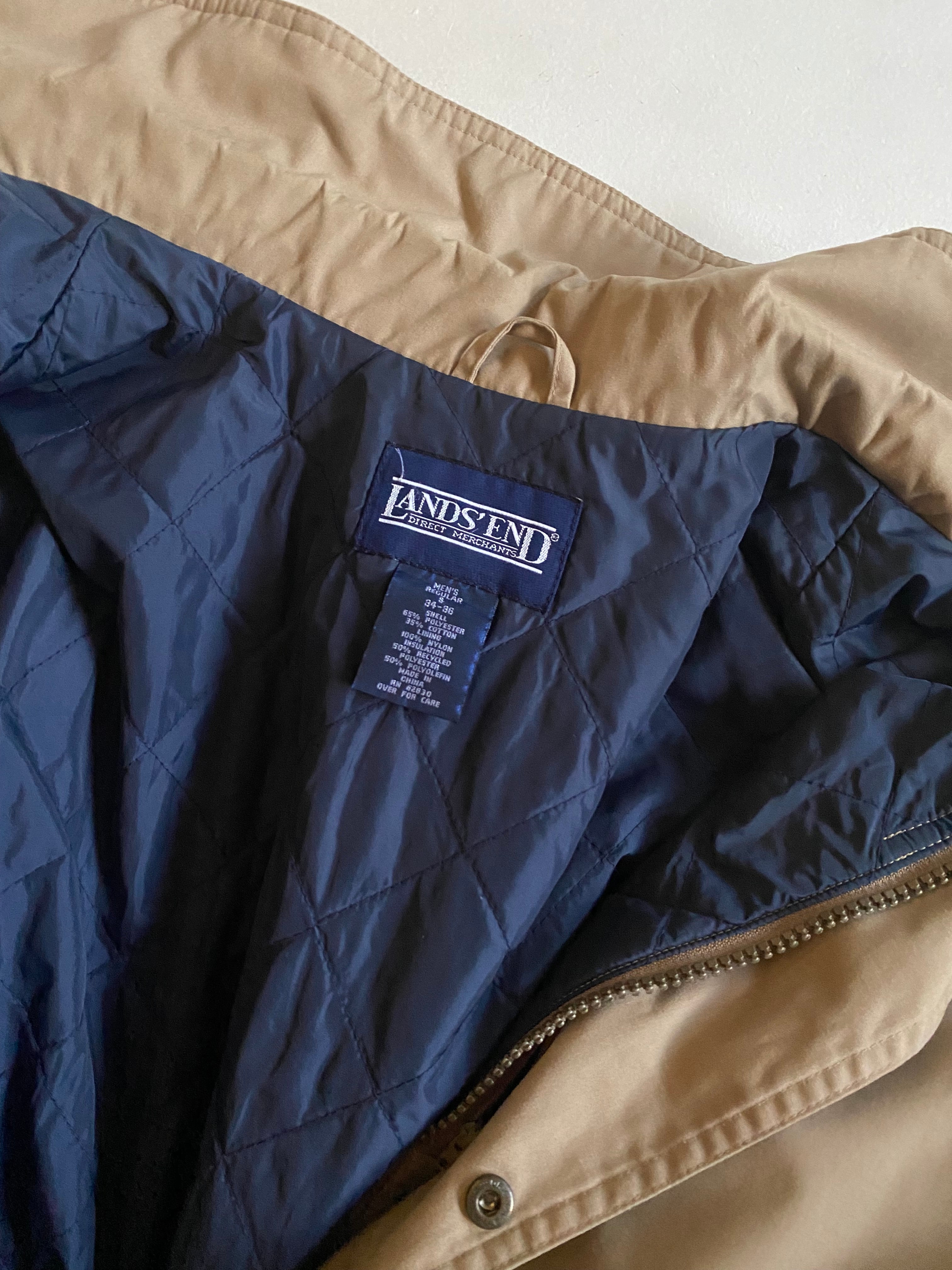 00s- landsend hunting jacketは、キルティングのライナーが施されたスタイリッシュなハンティングジャケットです。袖のプリーツやスタンドカラーというデザインが、トラディショナルな雰囲気を醸し出しつつも、現代的な洗練さを演出しています。