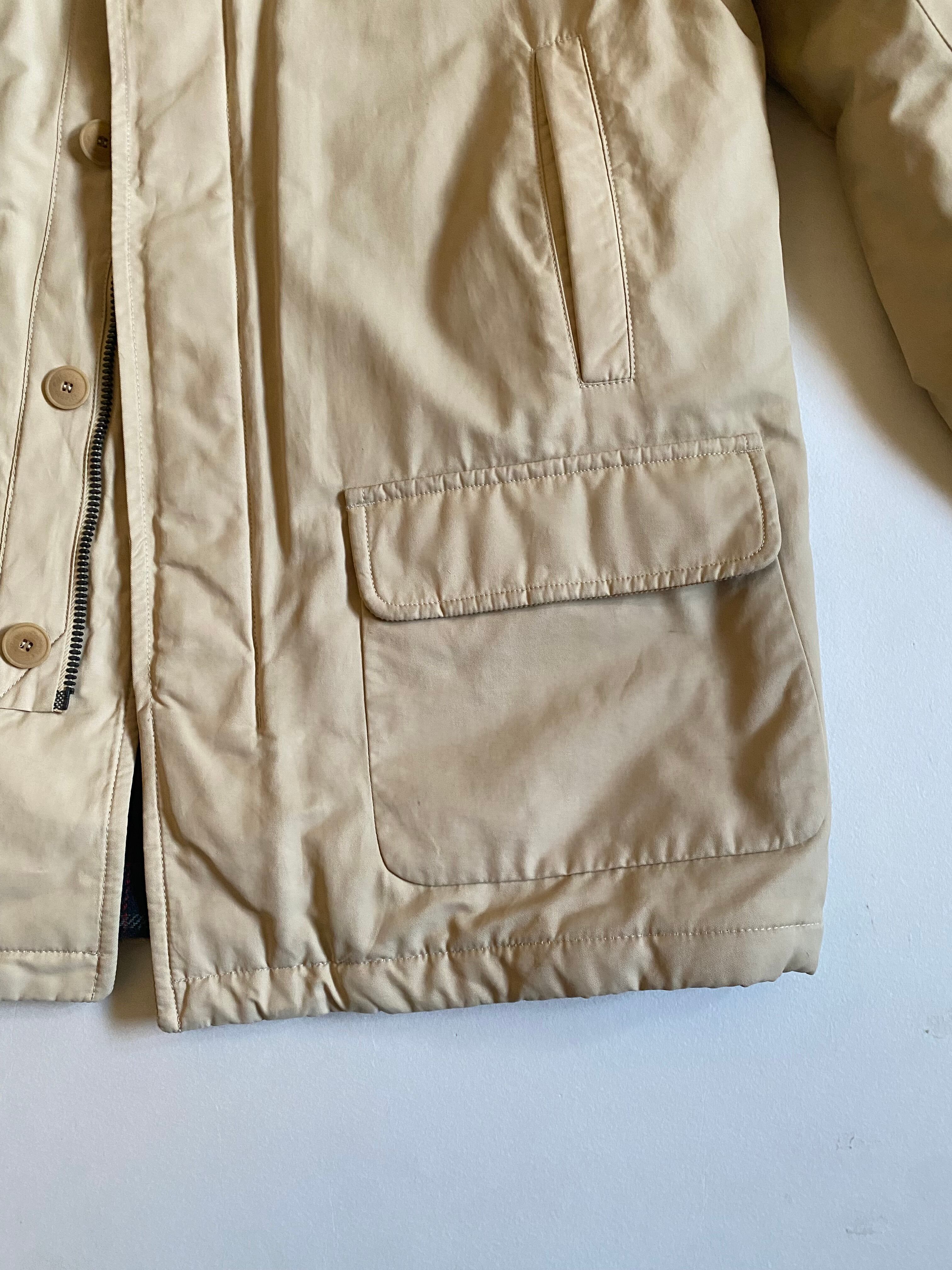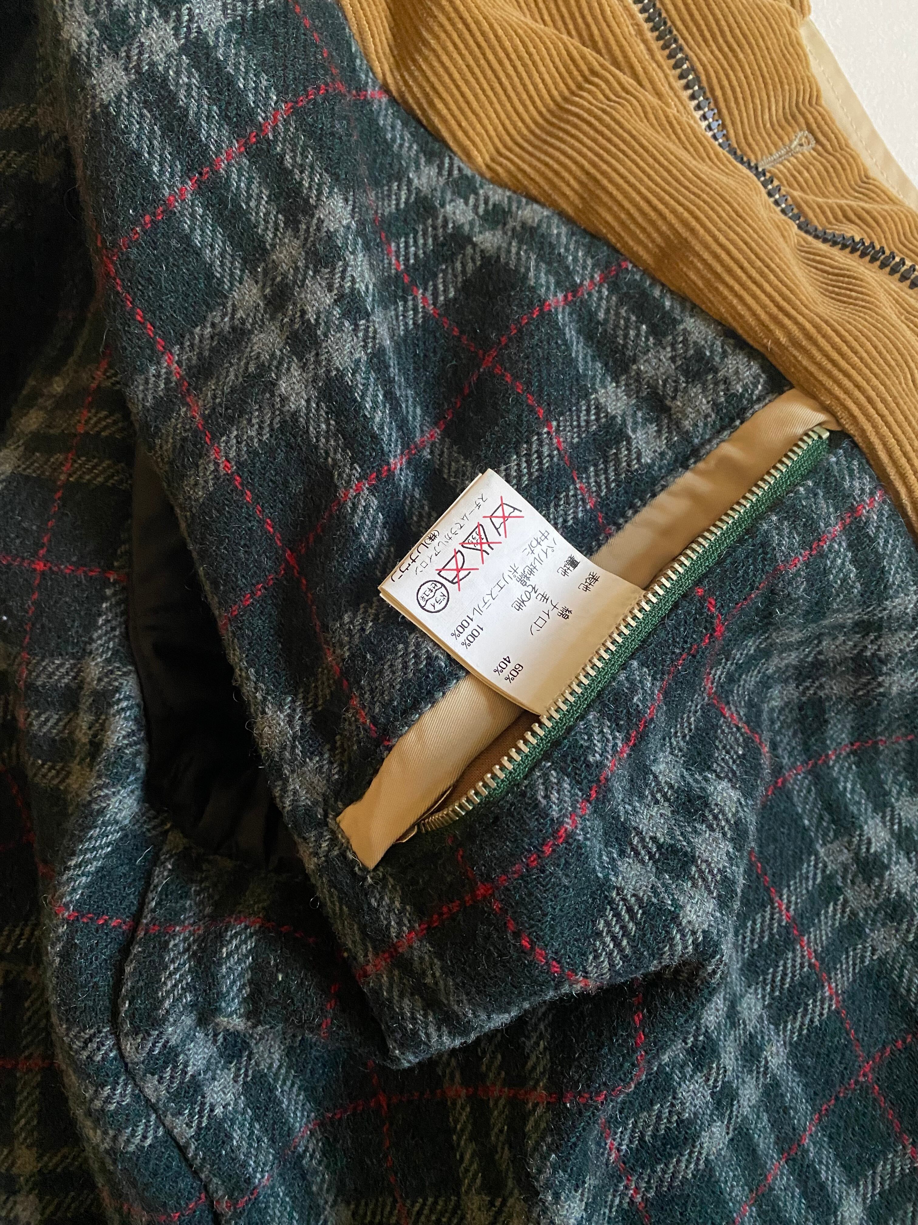 00s- henrry cottons hunting jacket italyは、イタリア製の高品質なハンティングジャケットです。珍しく表にロゴが無いシンプルなデザインが、洗練された印象を与えます。イエローベージュの色合いとチェックのライニングが、さりげないアクセントです。