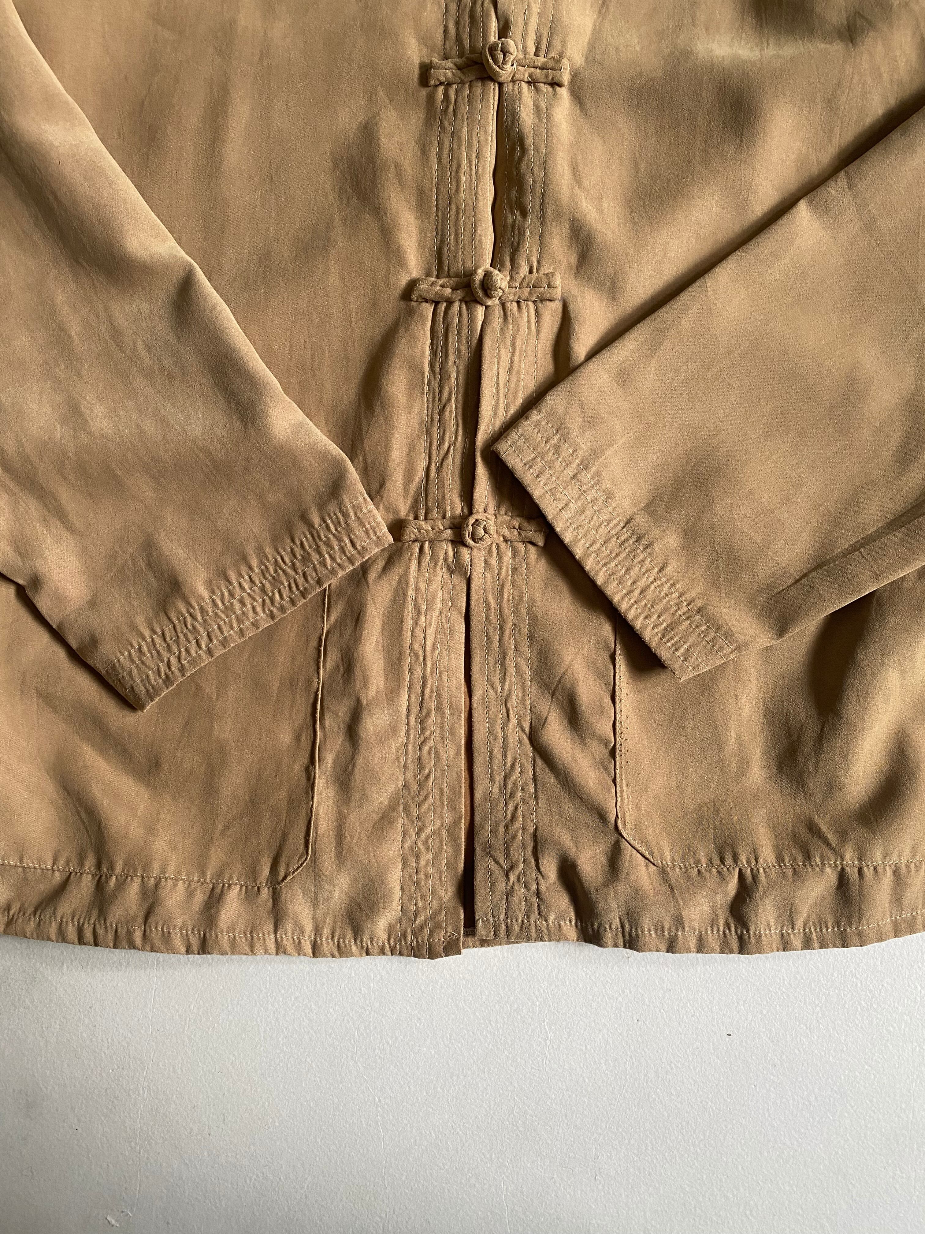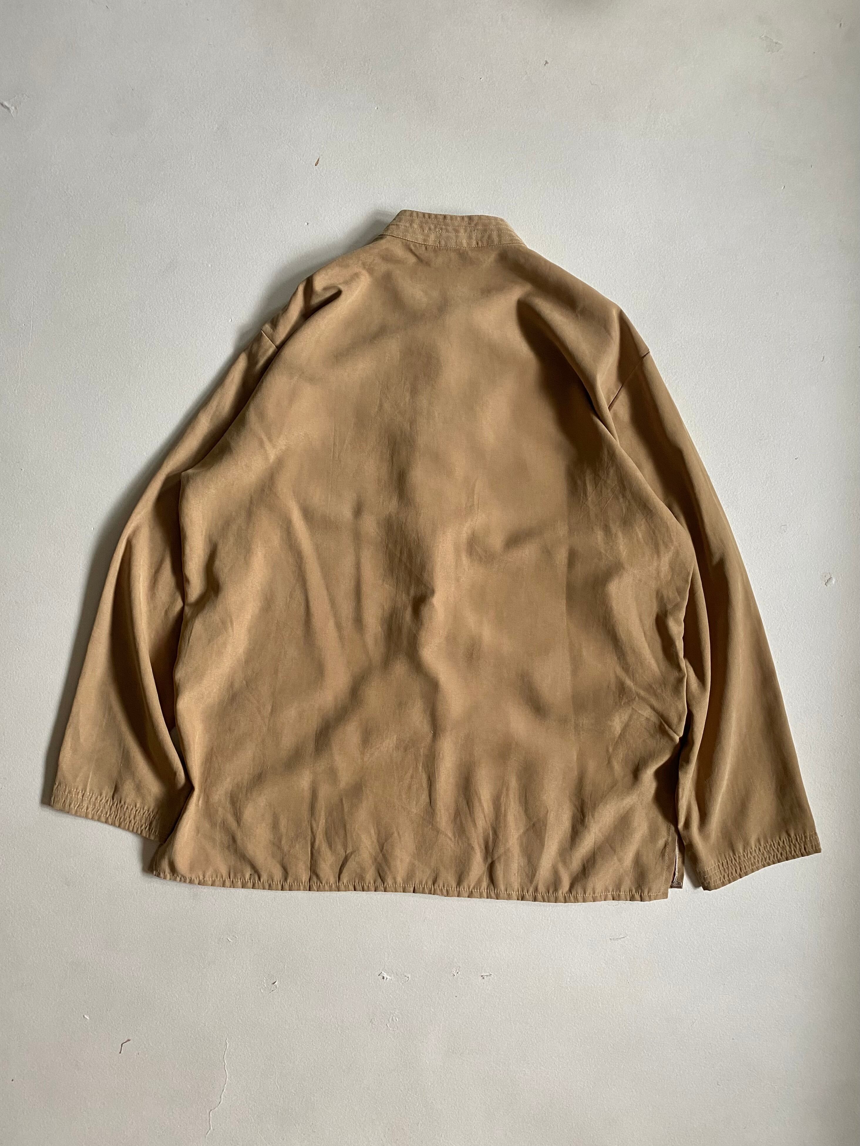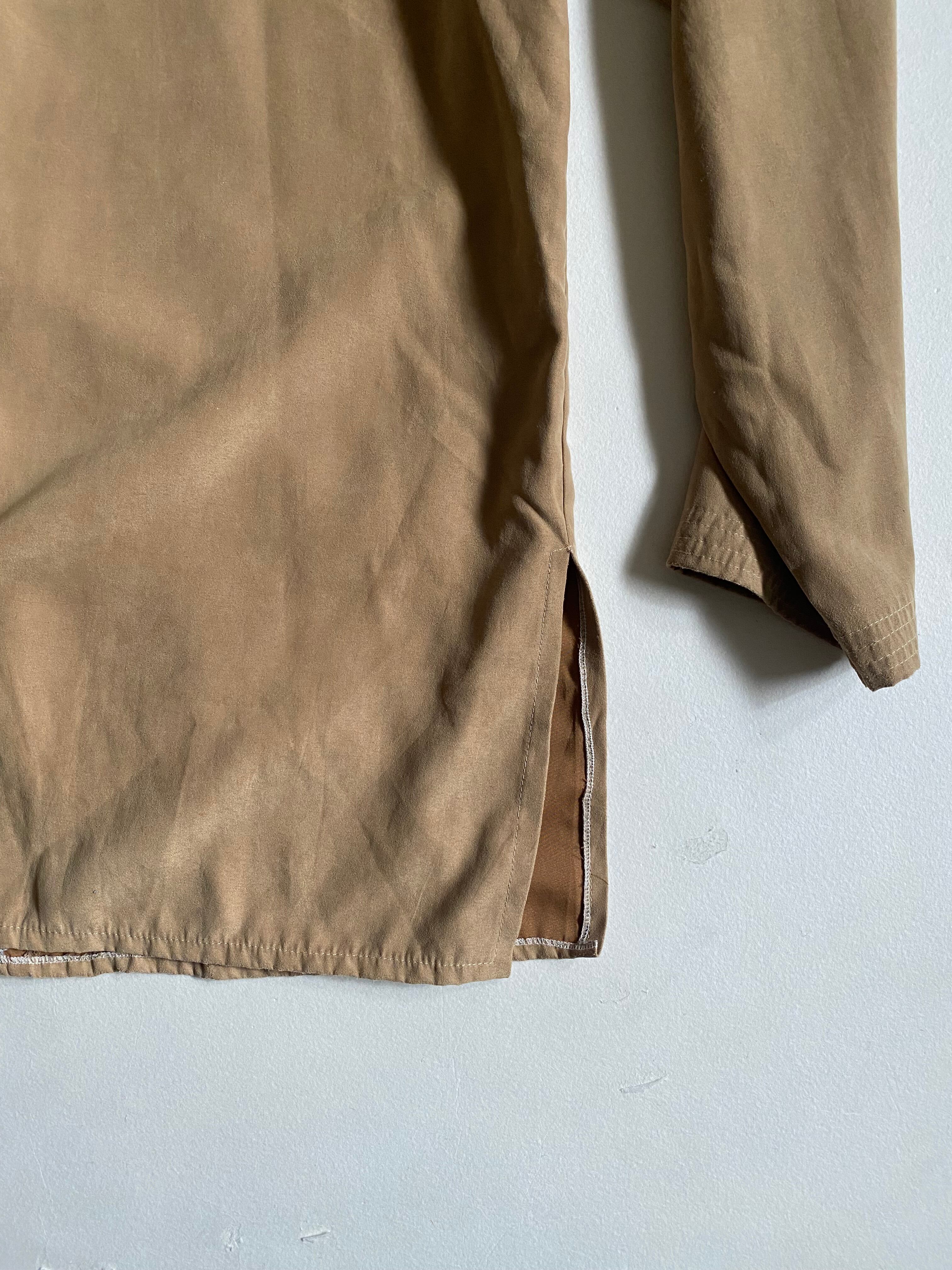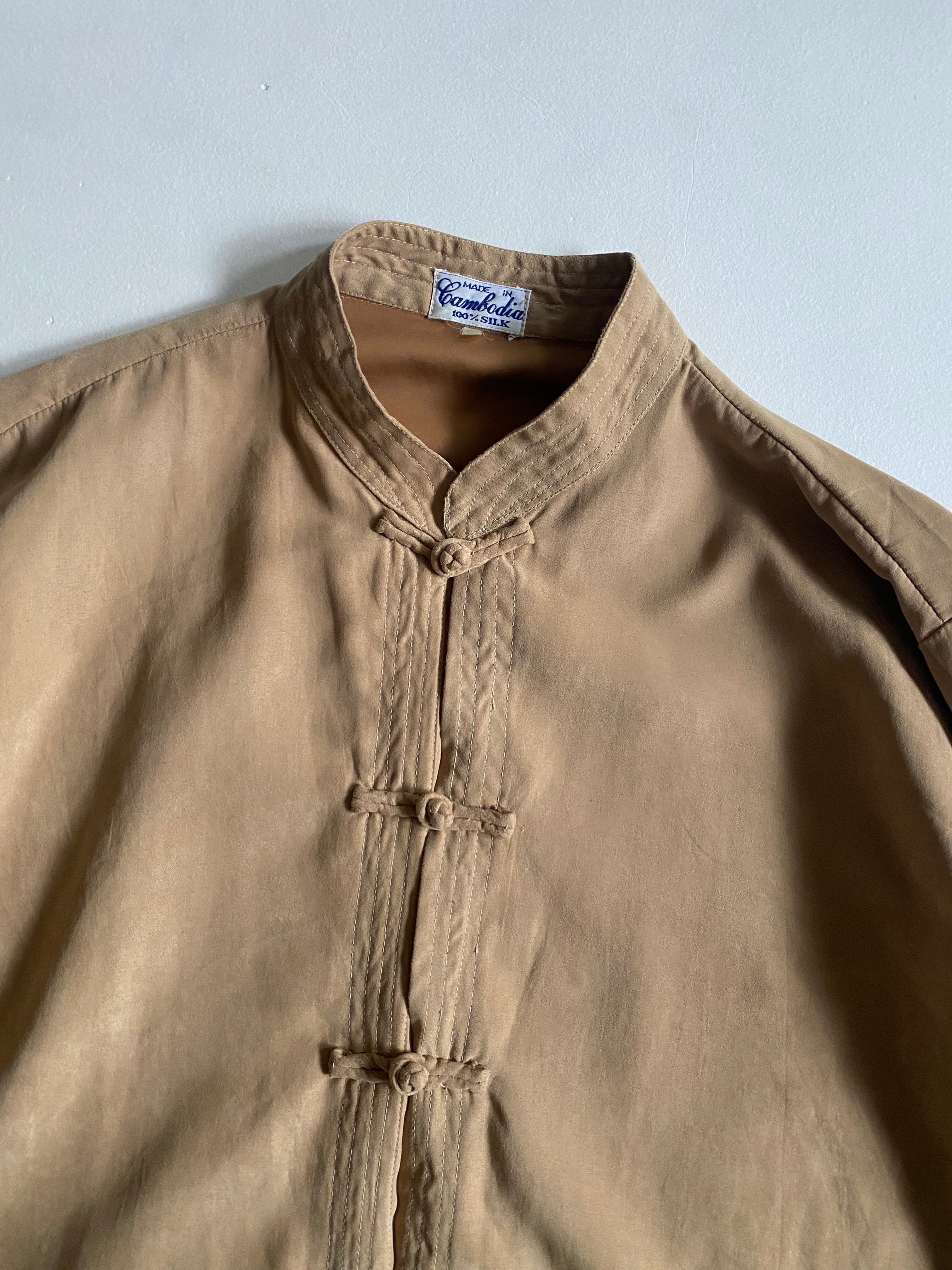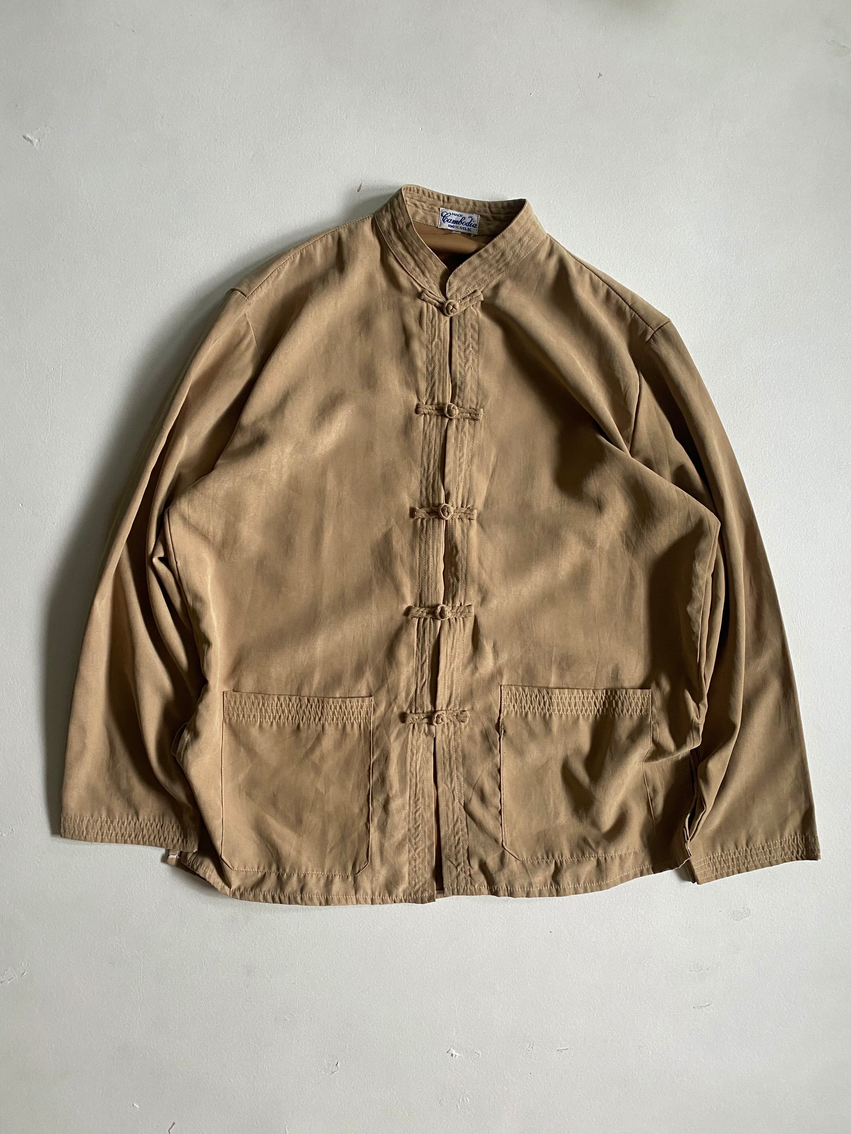 80s- silk 100% china shirtです。このチャイナシャツは、しっかりとしたシルク素材を使用しており、滑らかな手触りと高級感を兼ね備えた逸品です。特徴的なトリプルステッチで縁取られたデザインが、シンプルながらも洗練された印象を与えます。