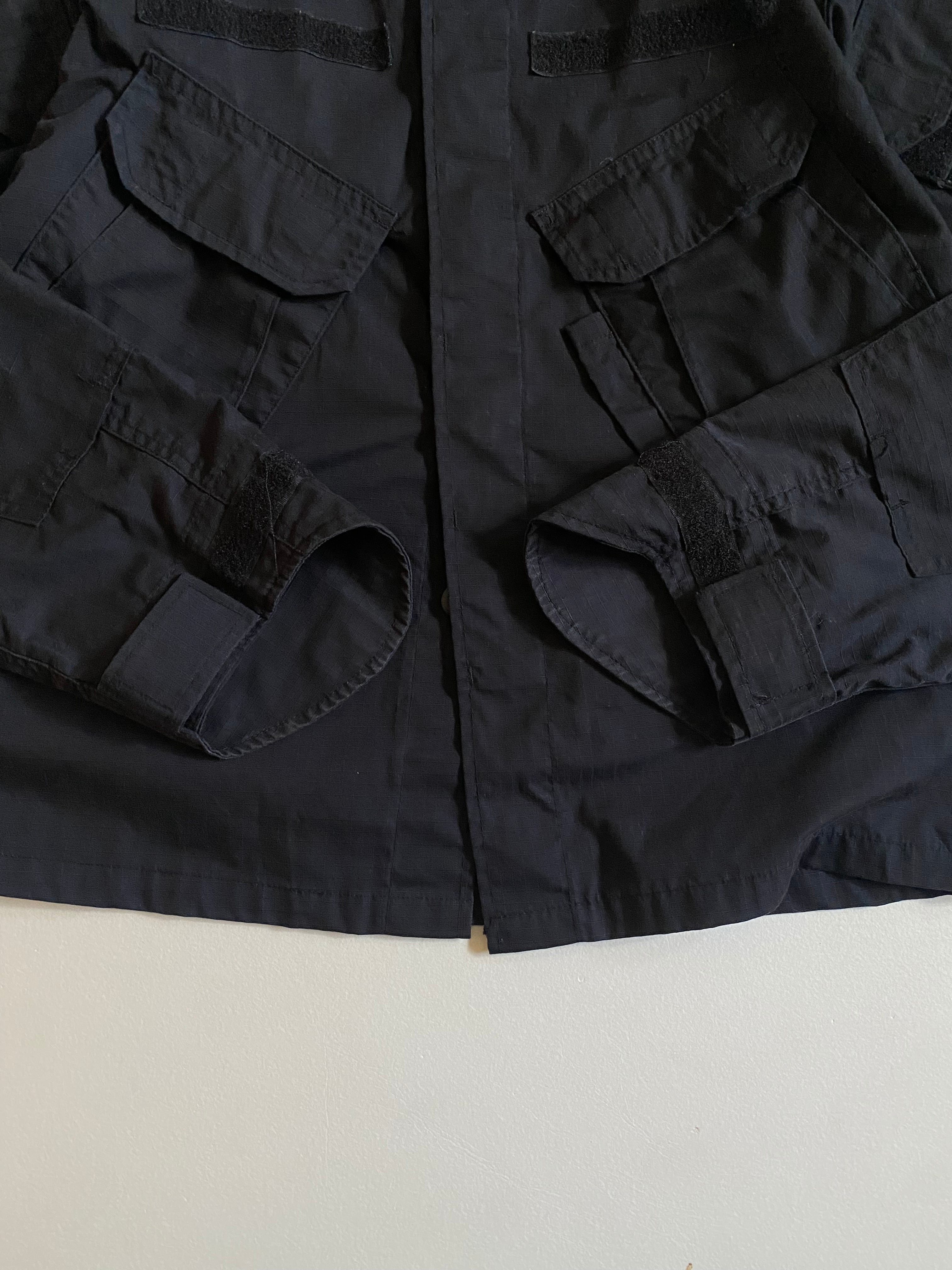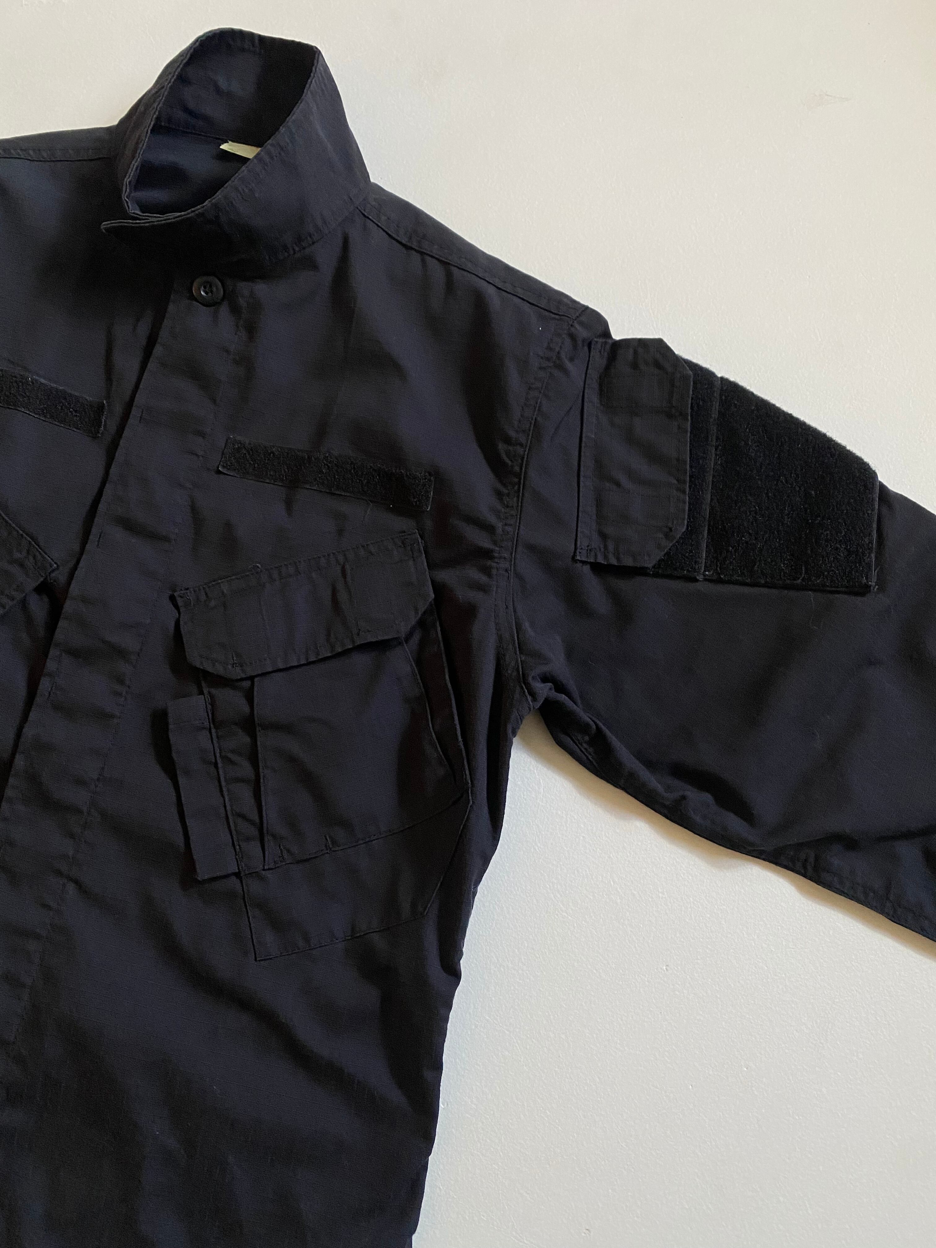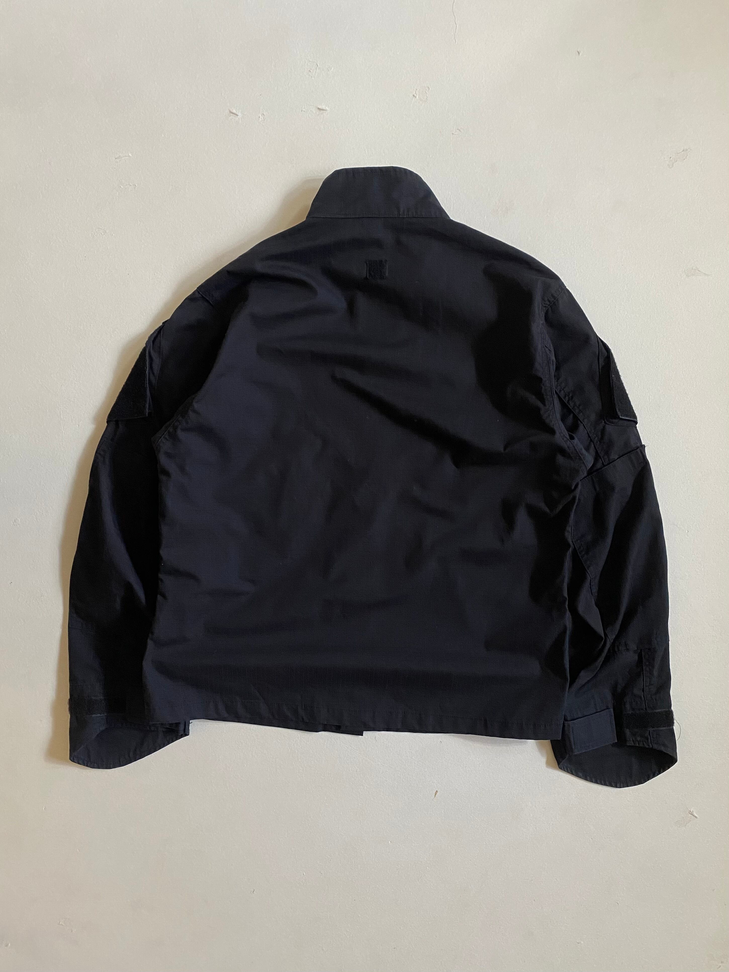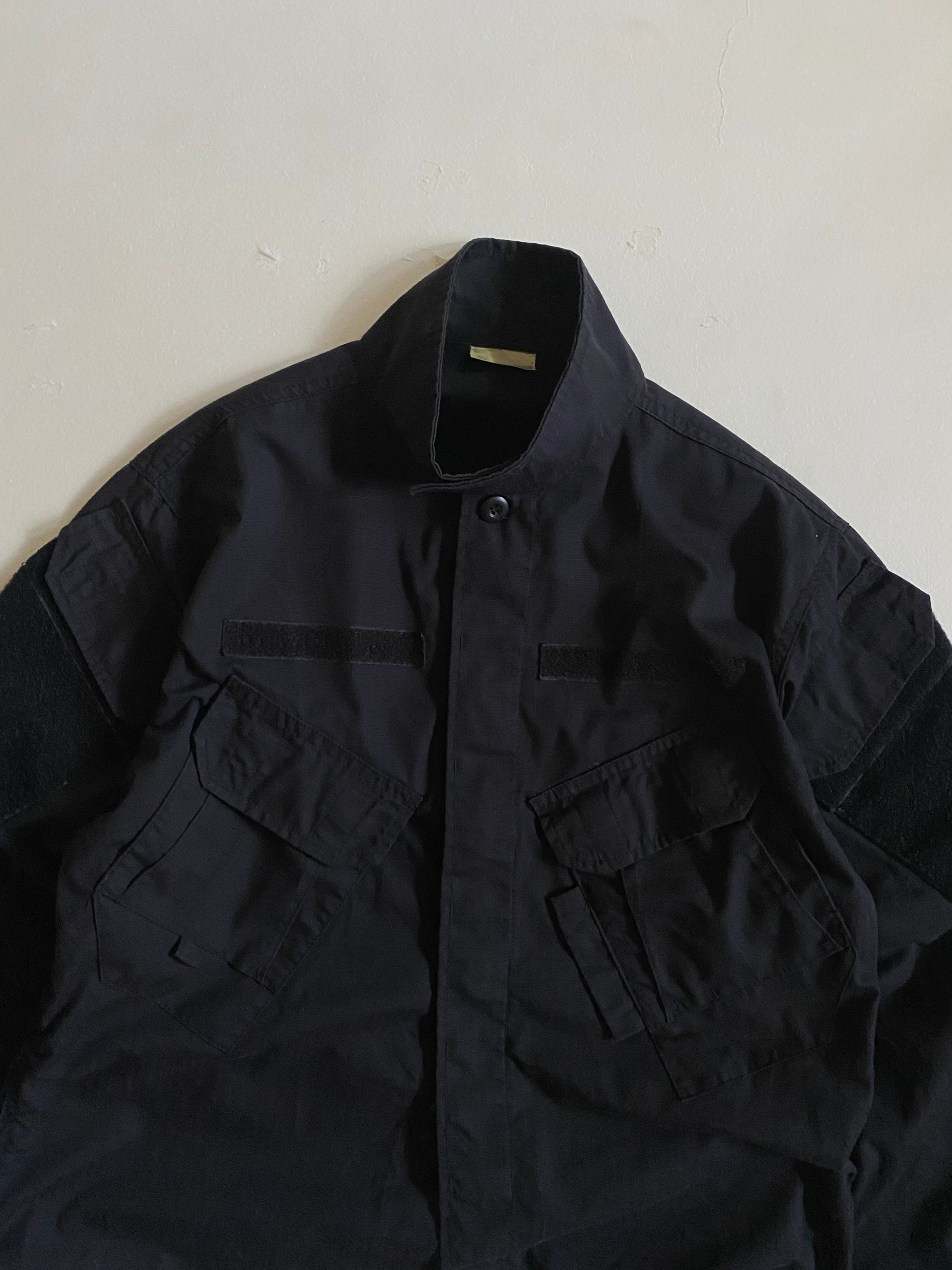 us military ocp jacket Blackです。このジャケットは、ボックスシルエットと大きな胸ポケットが特徴で、機能性とデザインが見事に融合しています。リップストップ素材の黒が、シンプルでありながらもクールな印象を与え、さまざまなシーンで活躍します。
