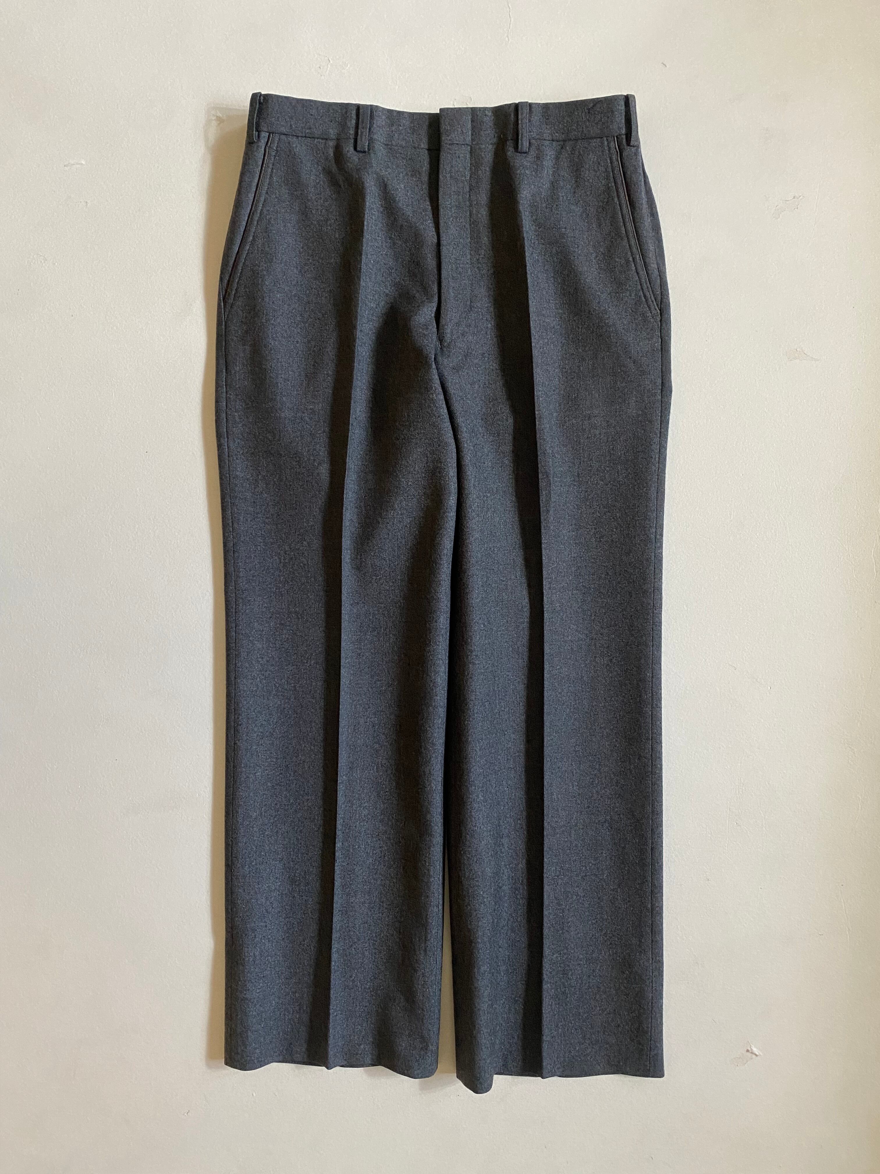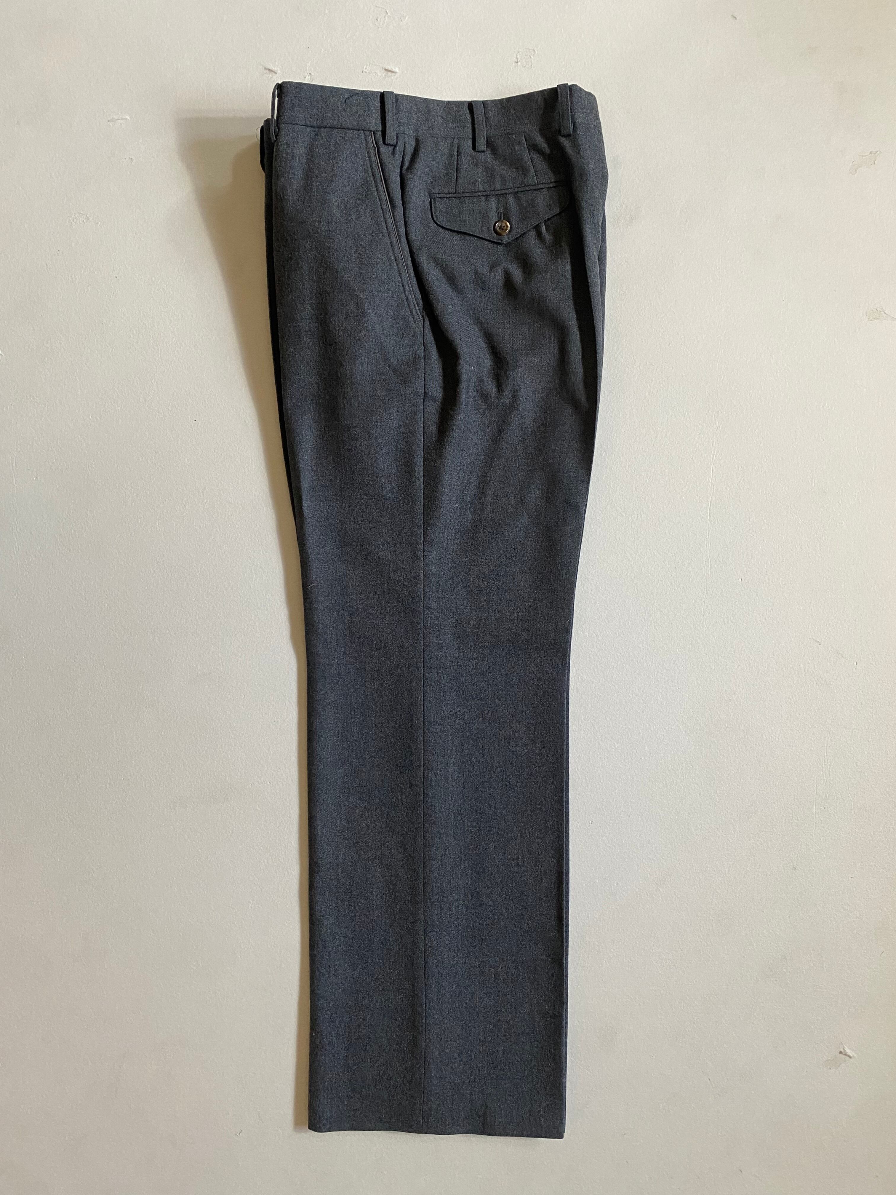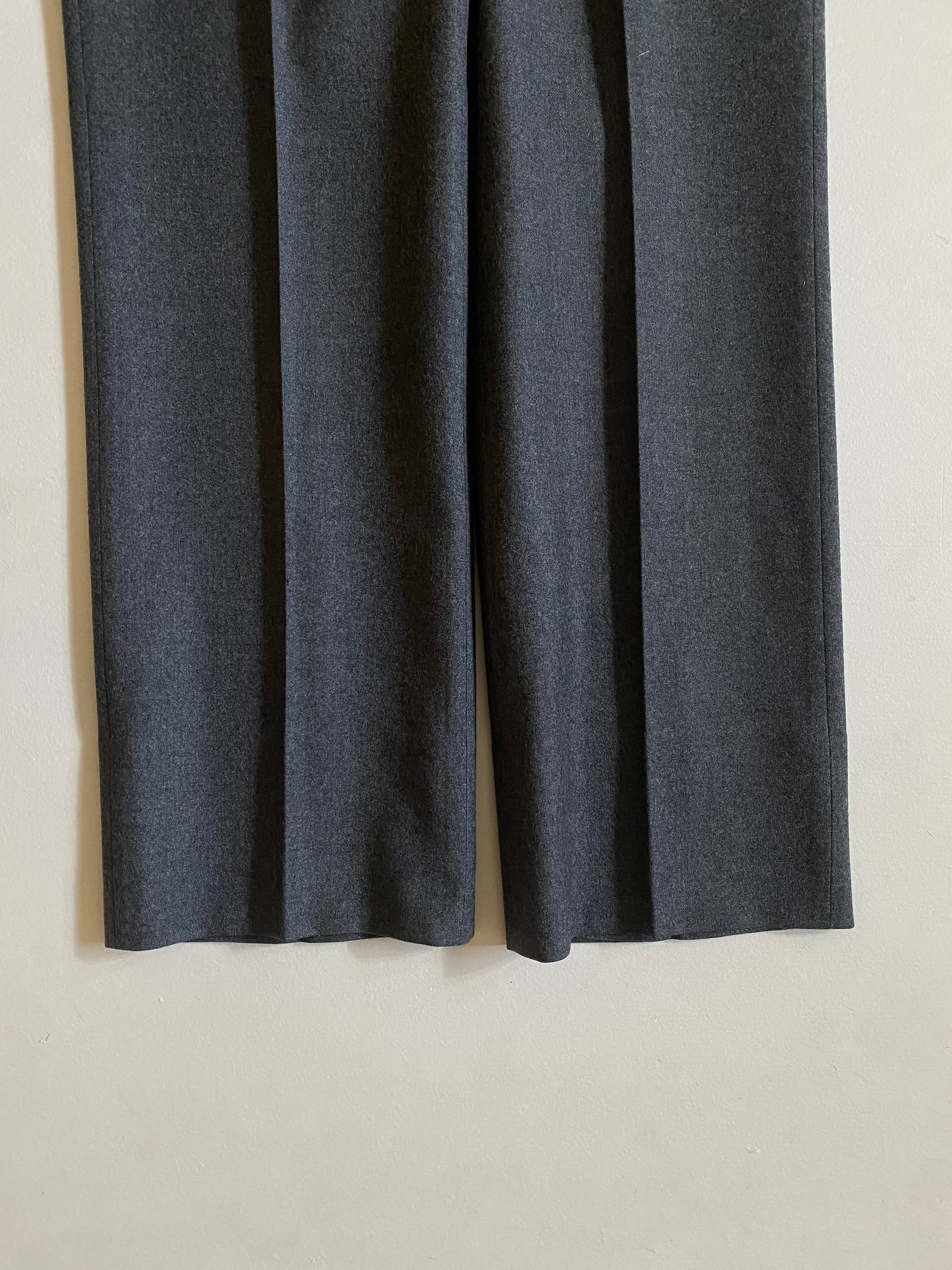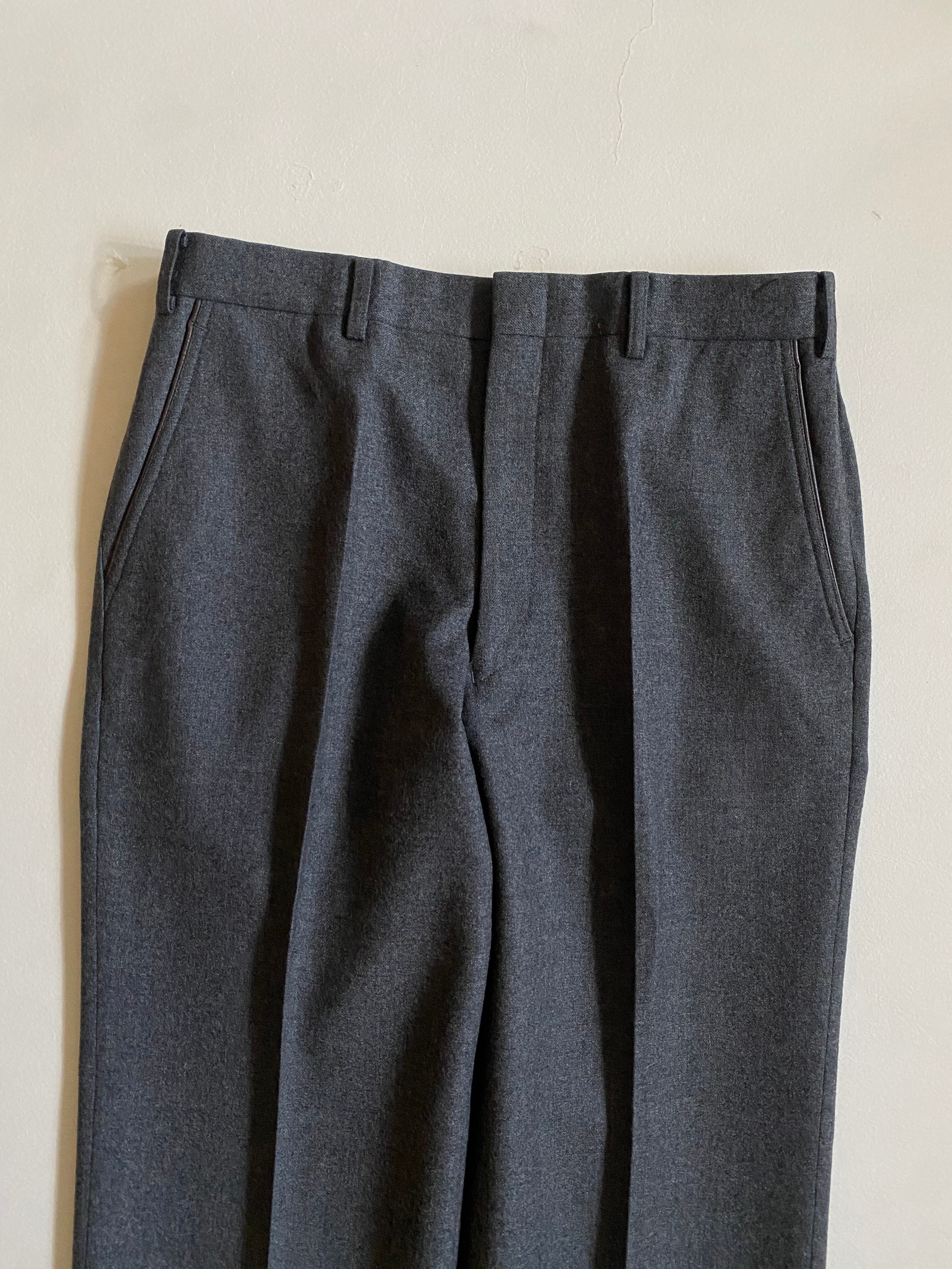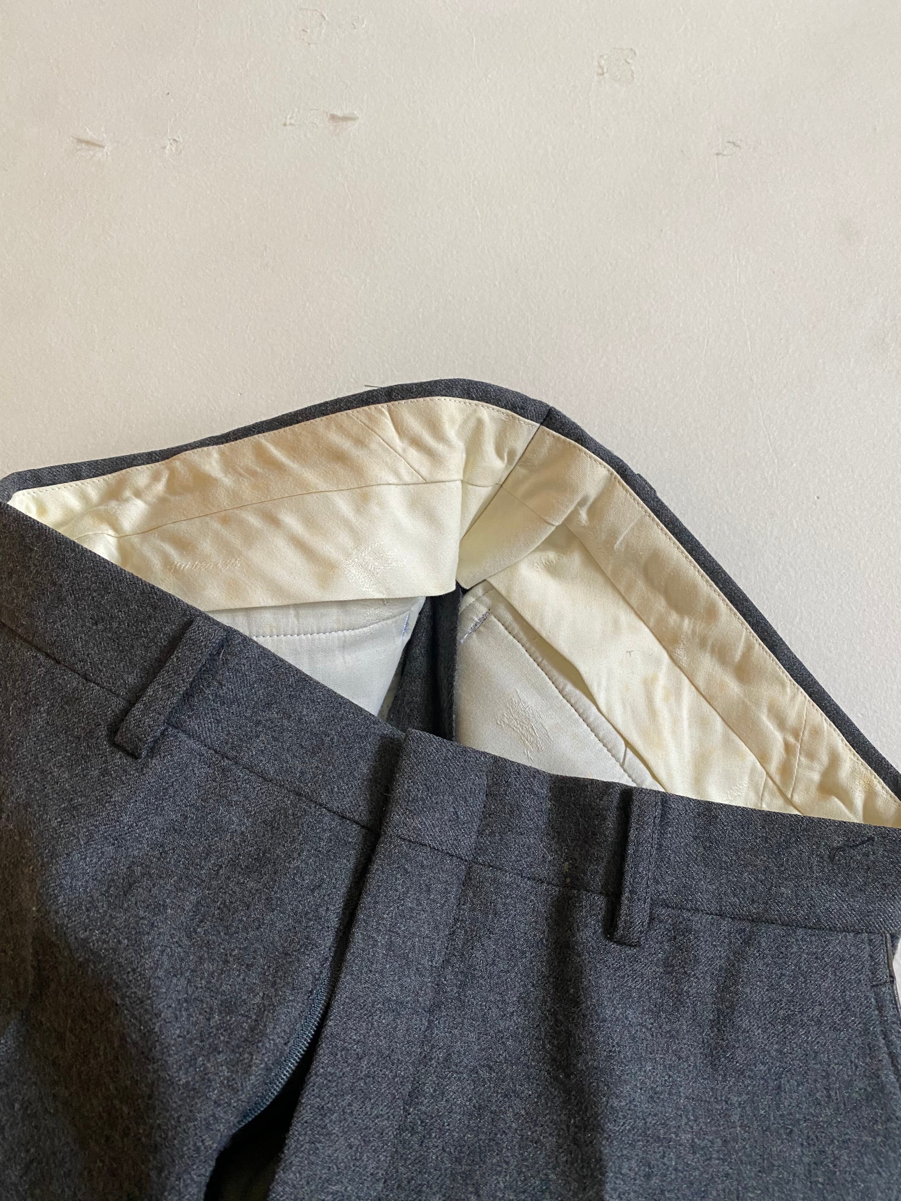 90s- Burberrys leather piping slacksです。このスラックスは、優雅なグレーのウール素材が特徴で、ポケットの縁に施されたブラウンのレザーパイピングが際立ちます。洗練されたデザインが、大人の魅力を引き立てる一着です。