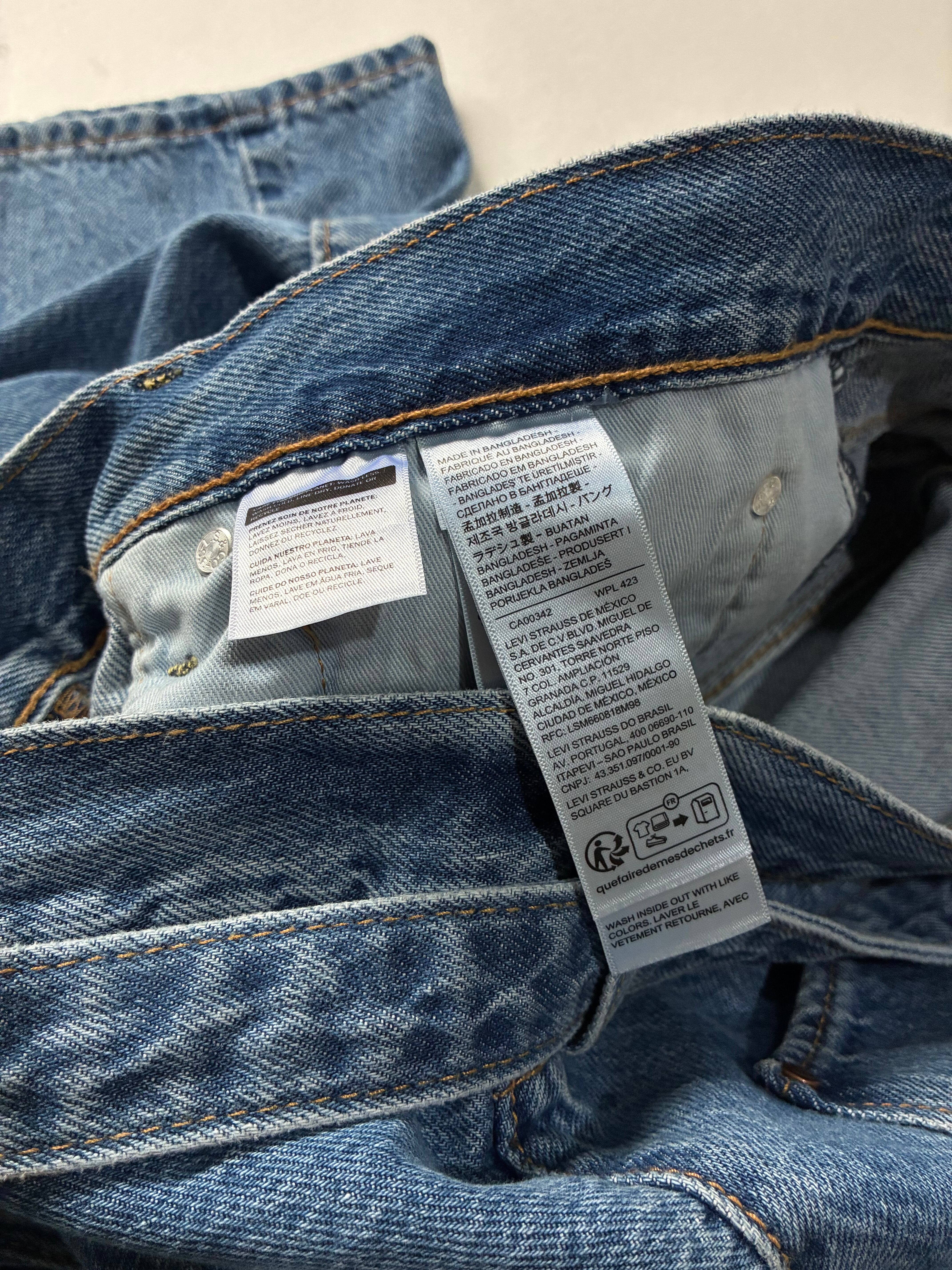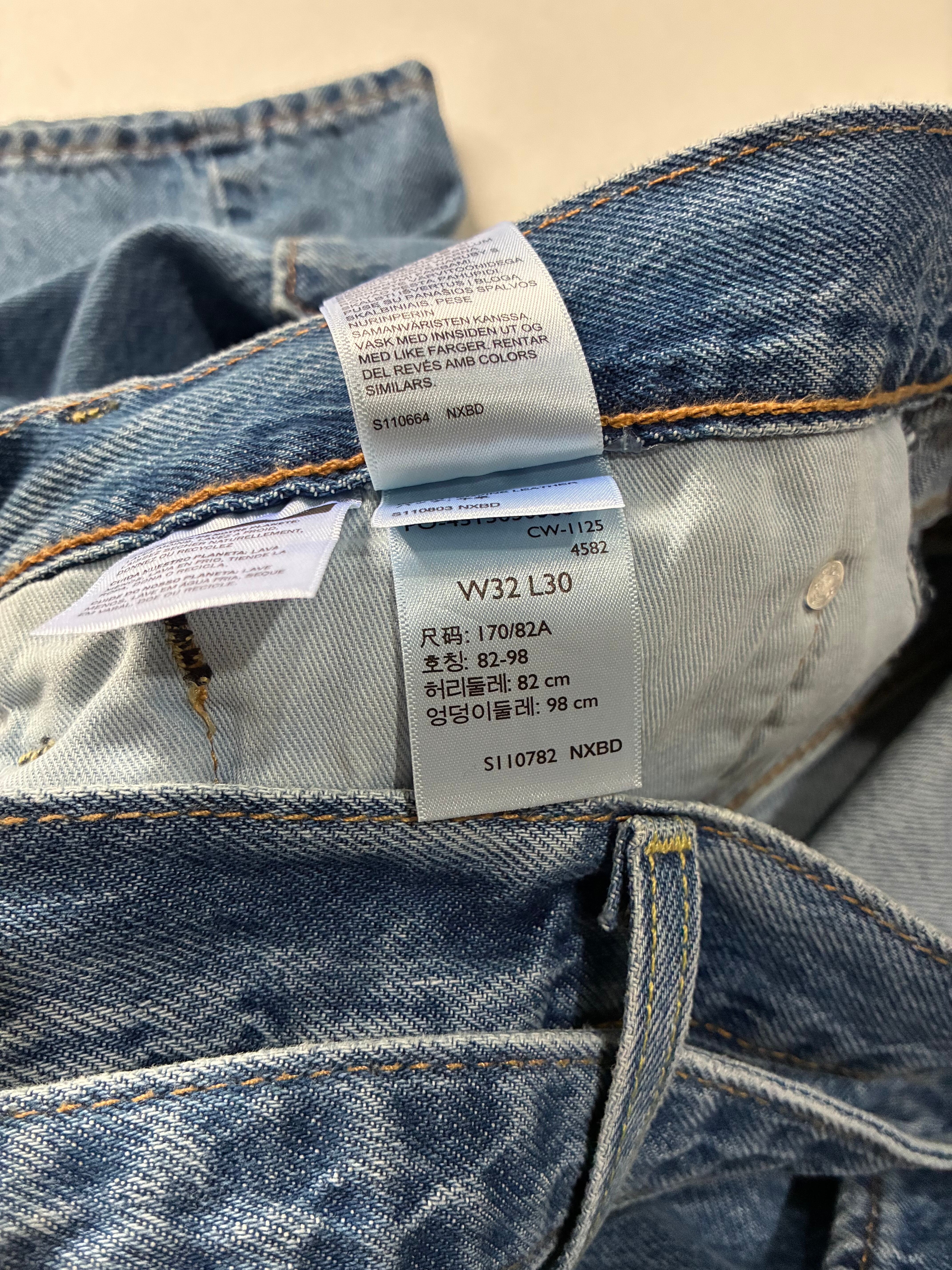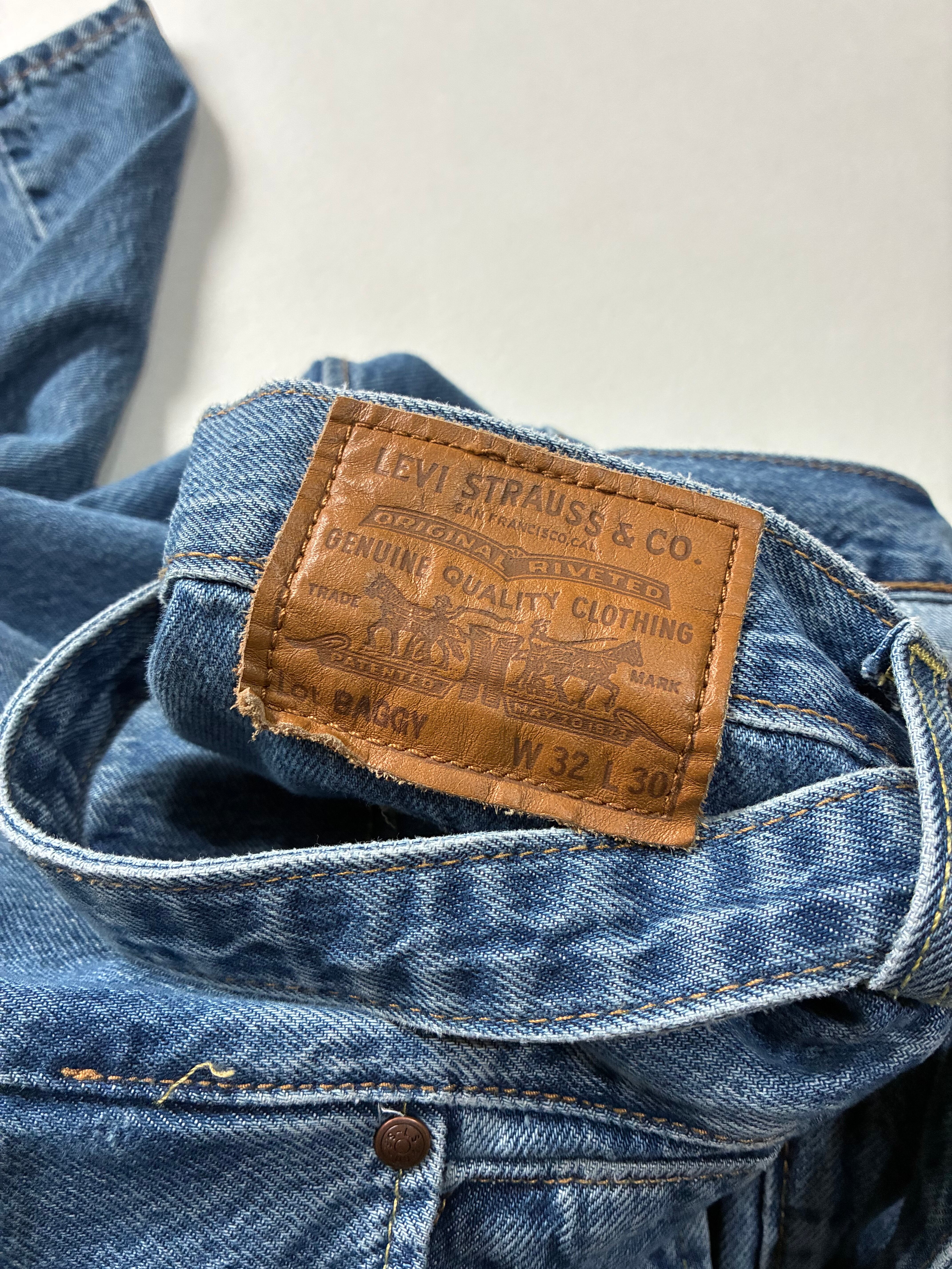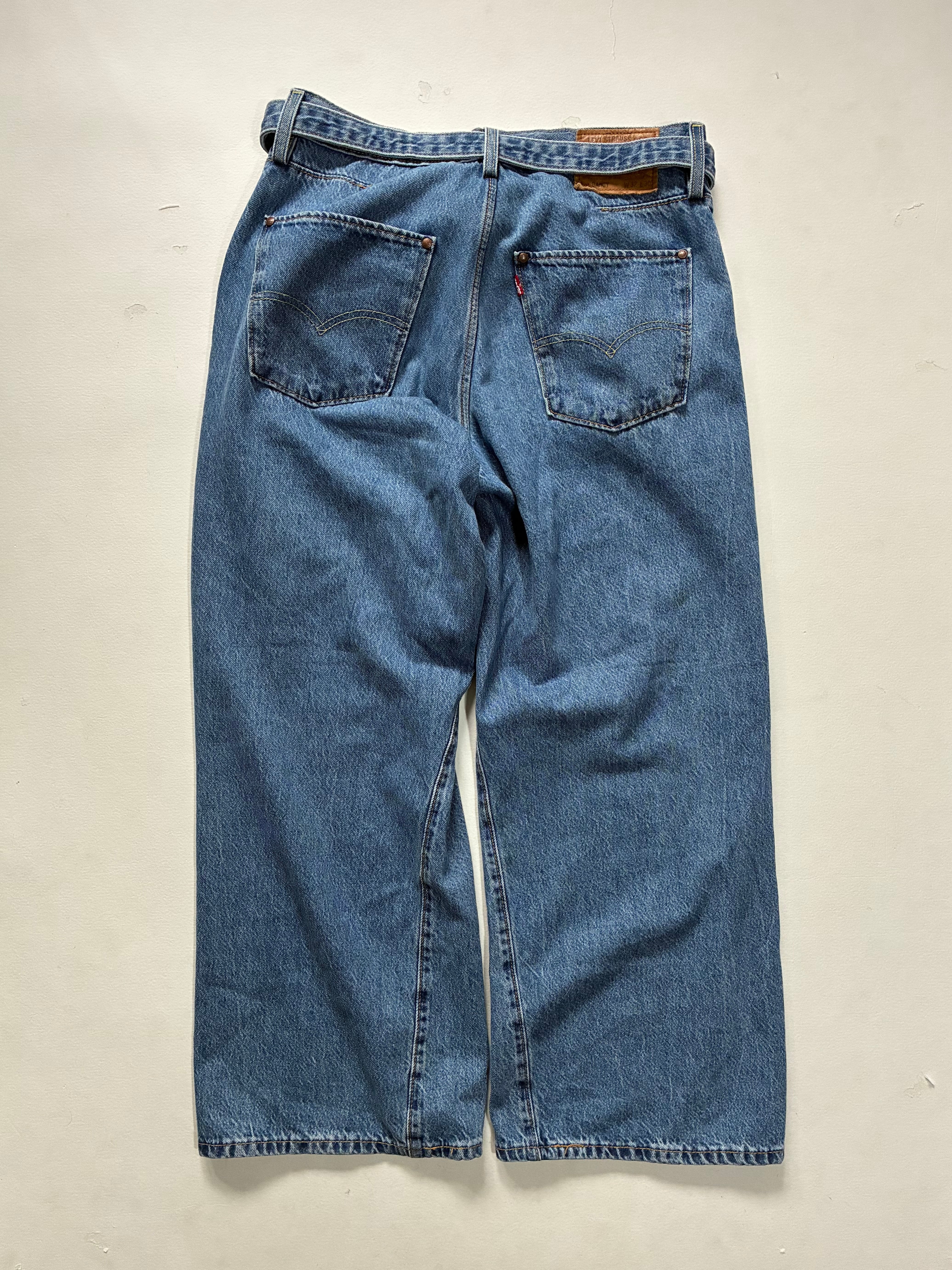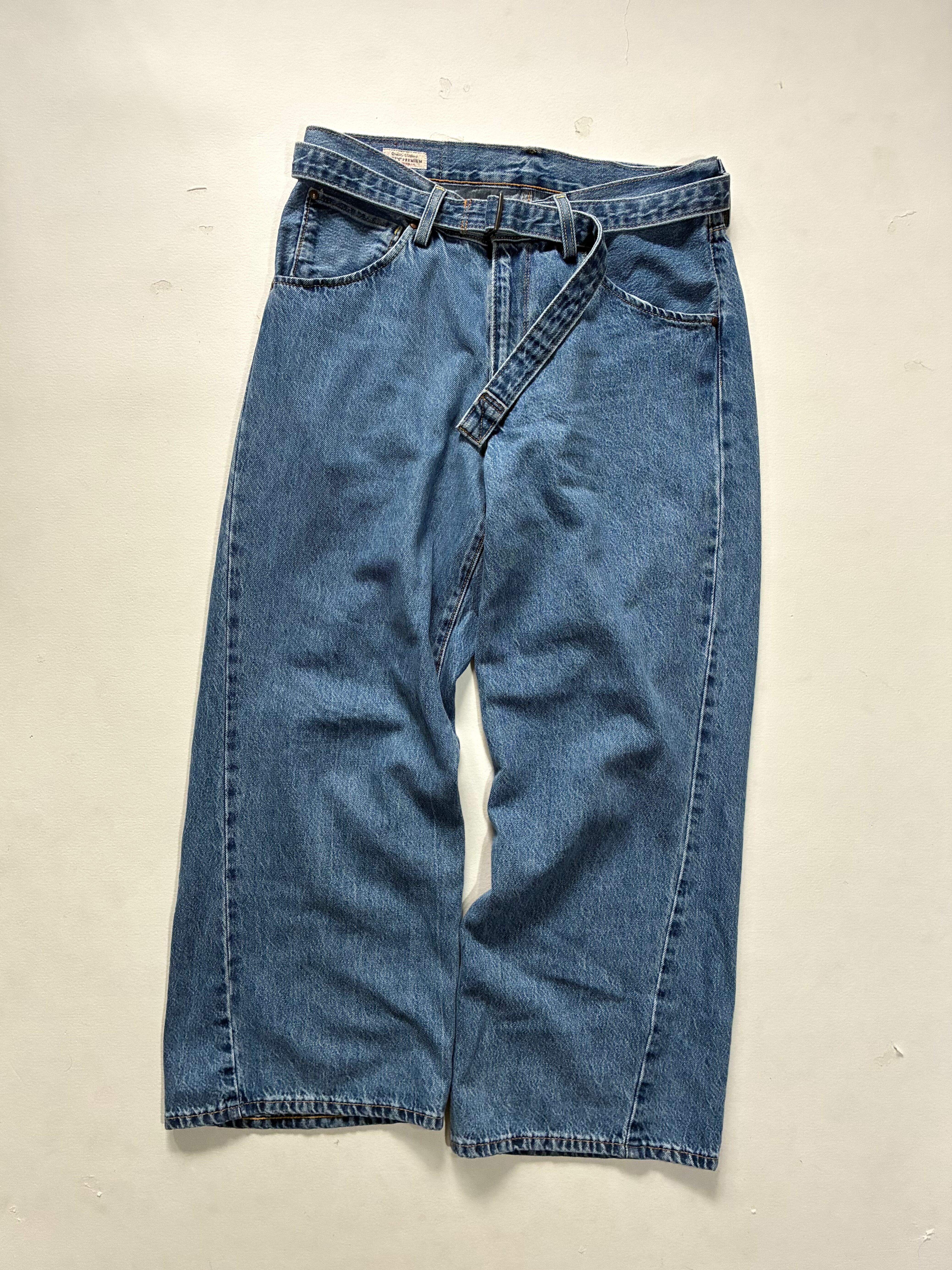 levis premium belted baggy denimです。共地でできたベルトによる独特のデザインが特徴で、スーパーワイドなシルエットが魅力です。春夏にぴったりな色の具合が、軽やかさを演出し、様々なスタイルに合わせやすい一着です。