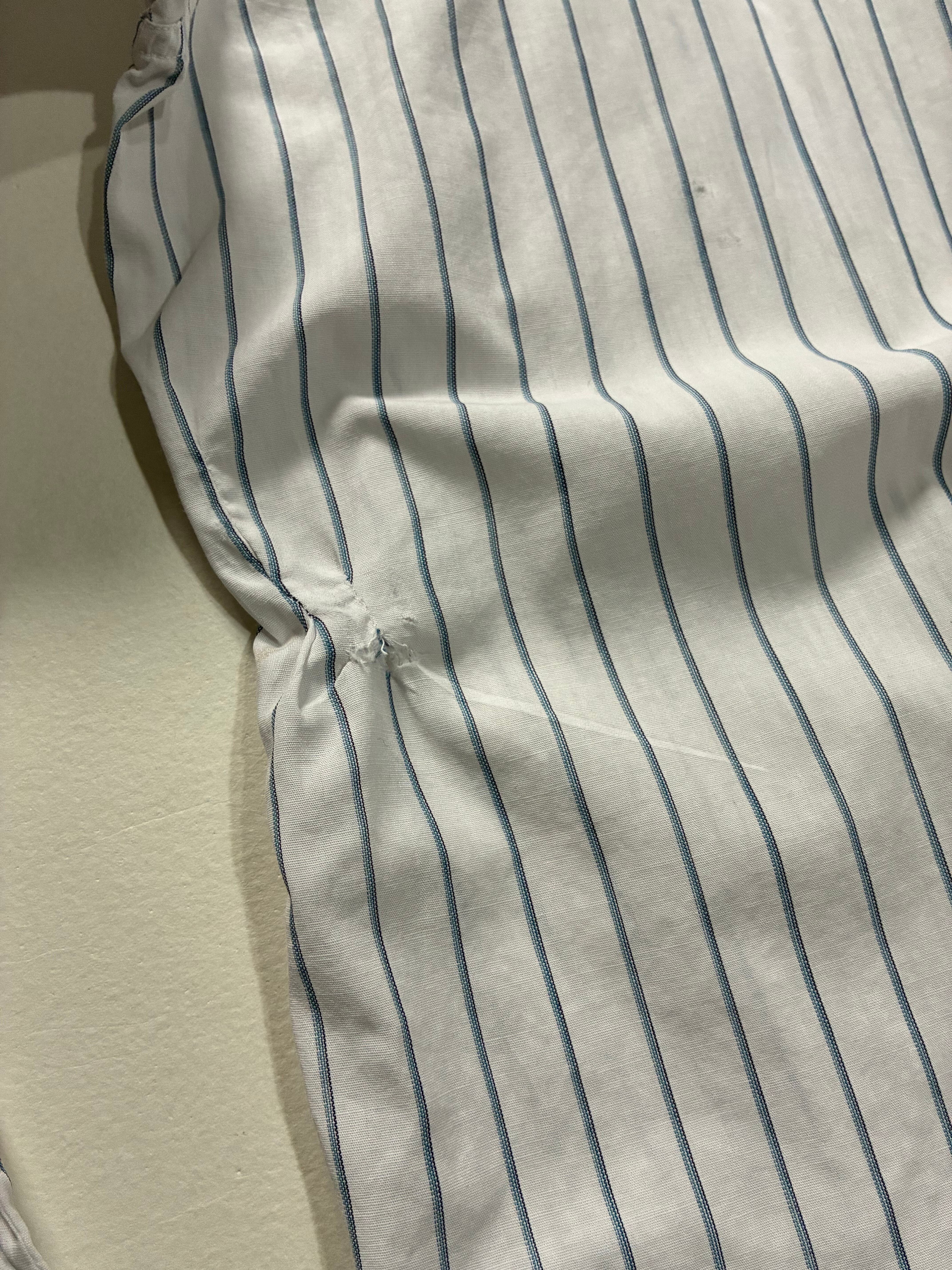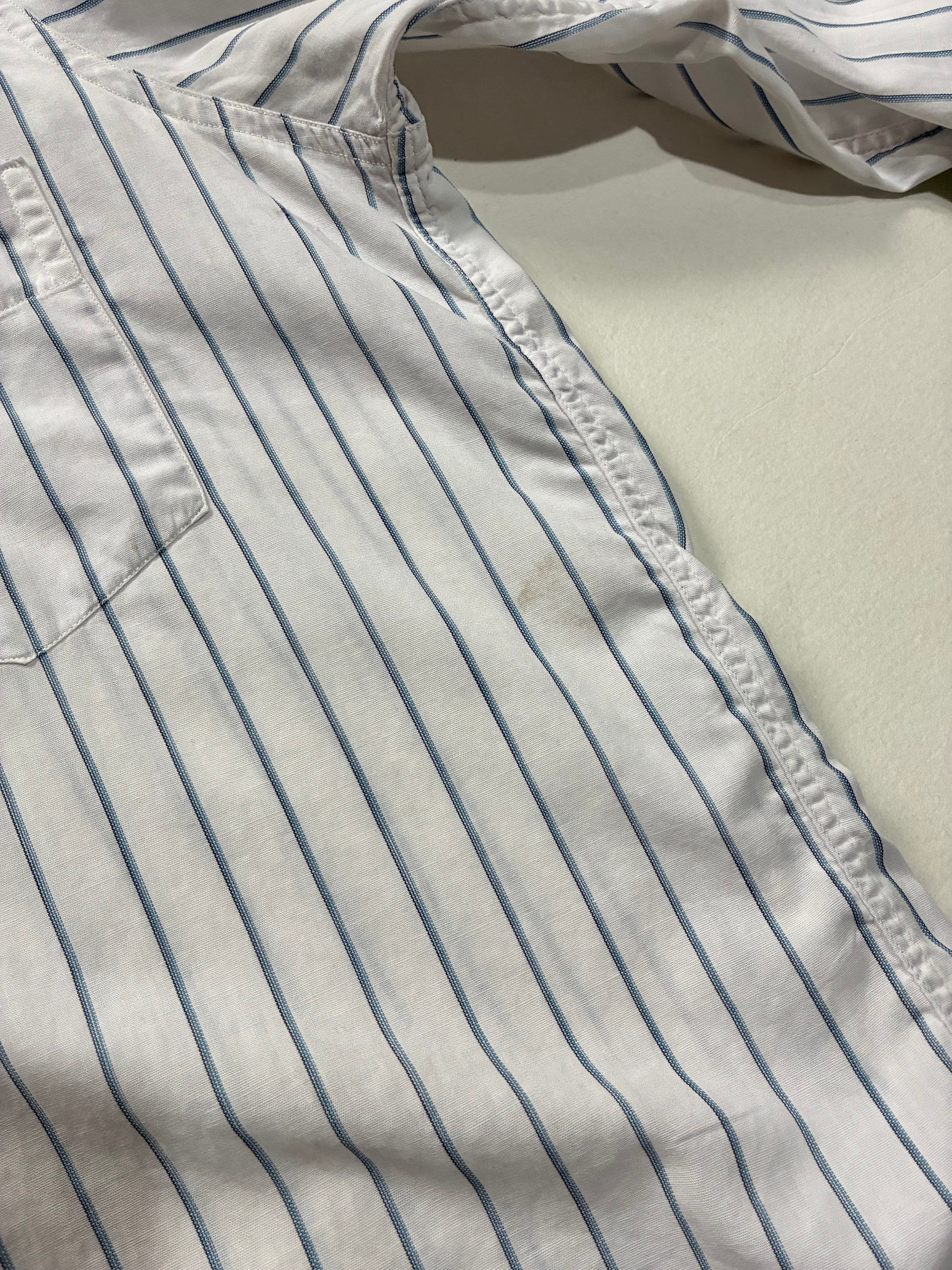 白に青のストライプが際立つ、60sスタイルのヴィンテージシャツです。小ぶりな襟と背中のギャザーが程よいアクセントとなっており、マチ付きの裾が動きやすさとデザイン性を両立させています。着心地に優れた素材感も魅力の一つで、まさにこの時代のテイストを感じさせる一着です。