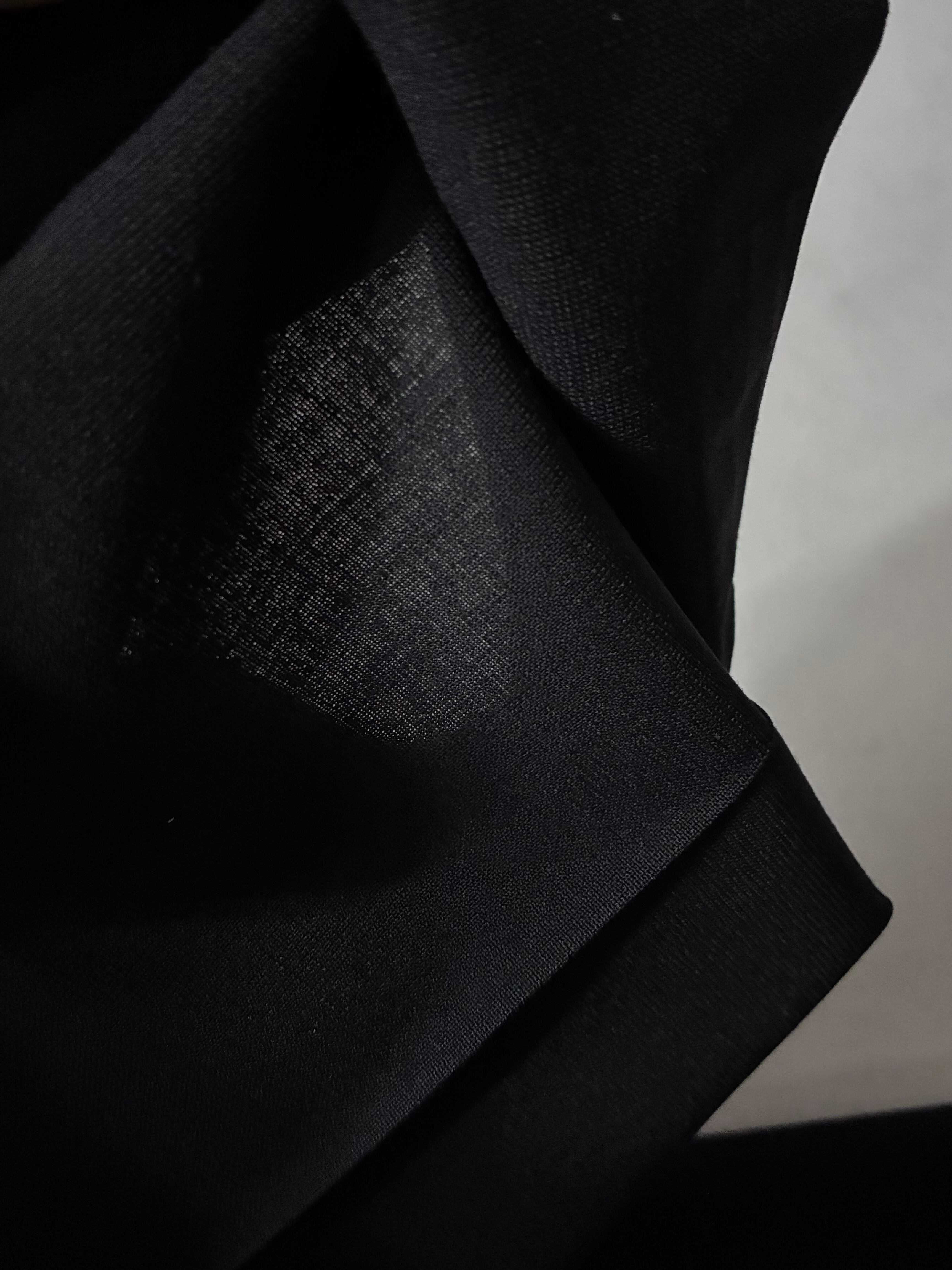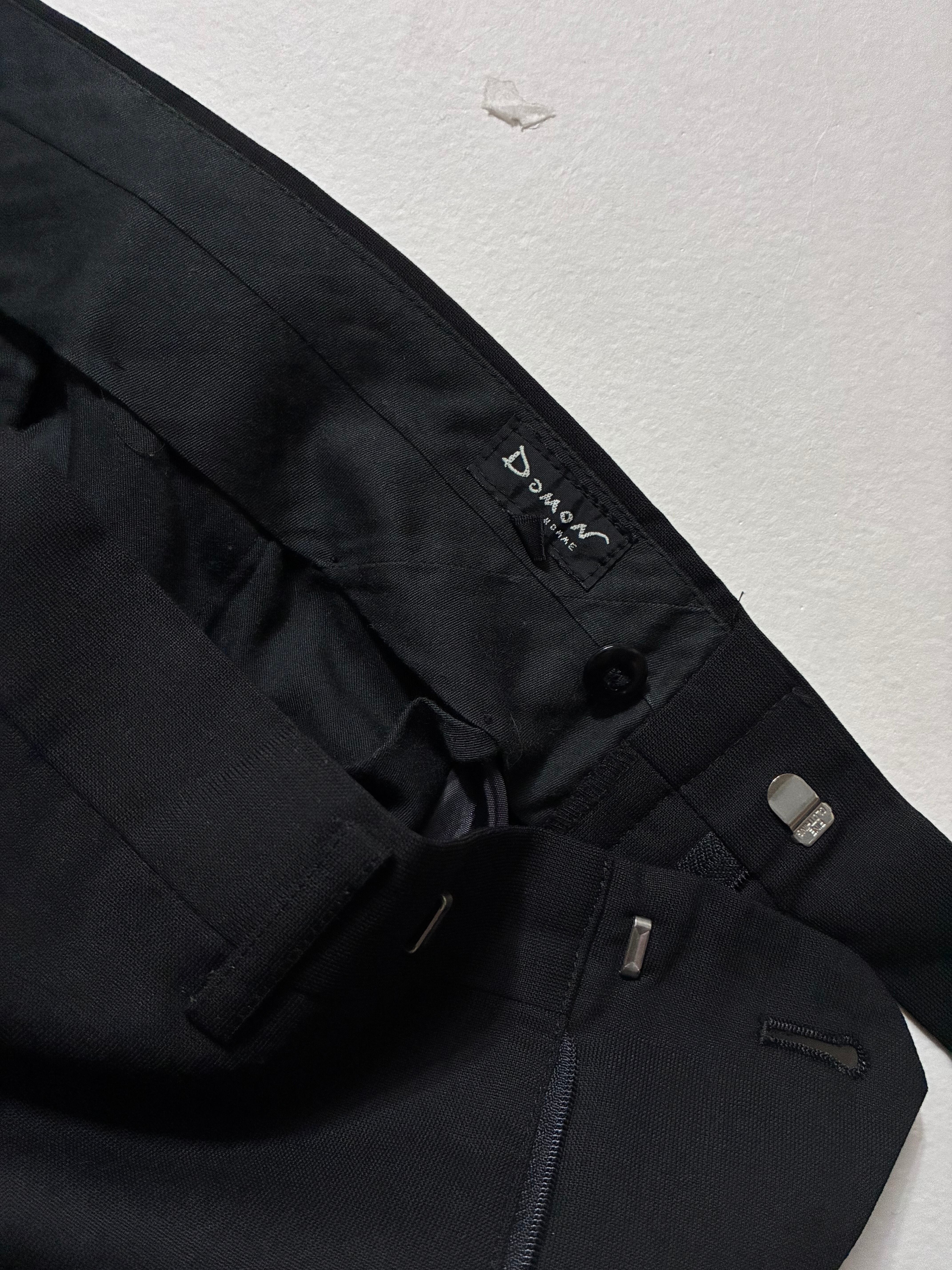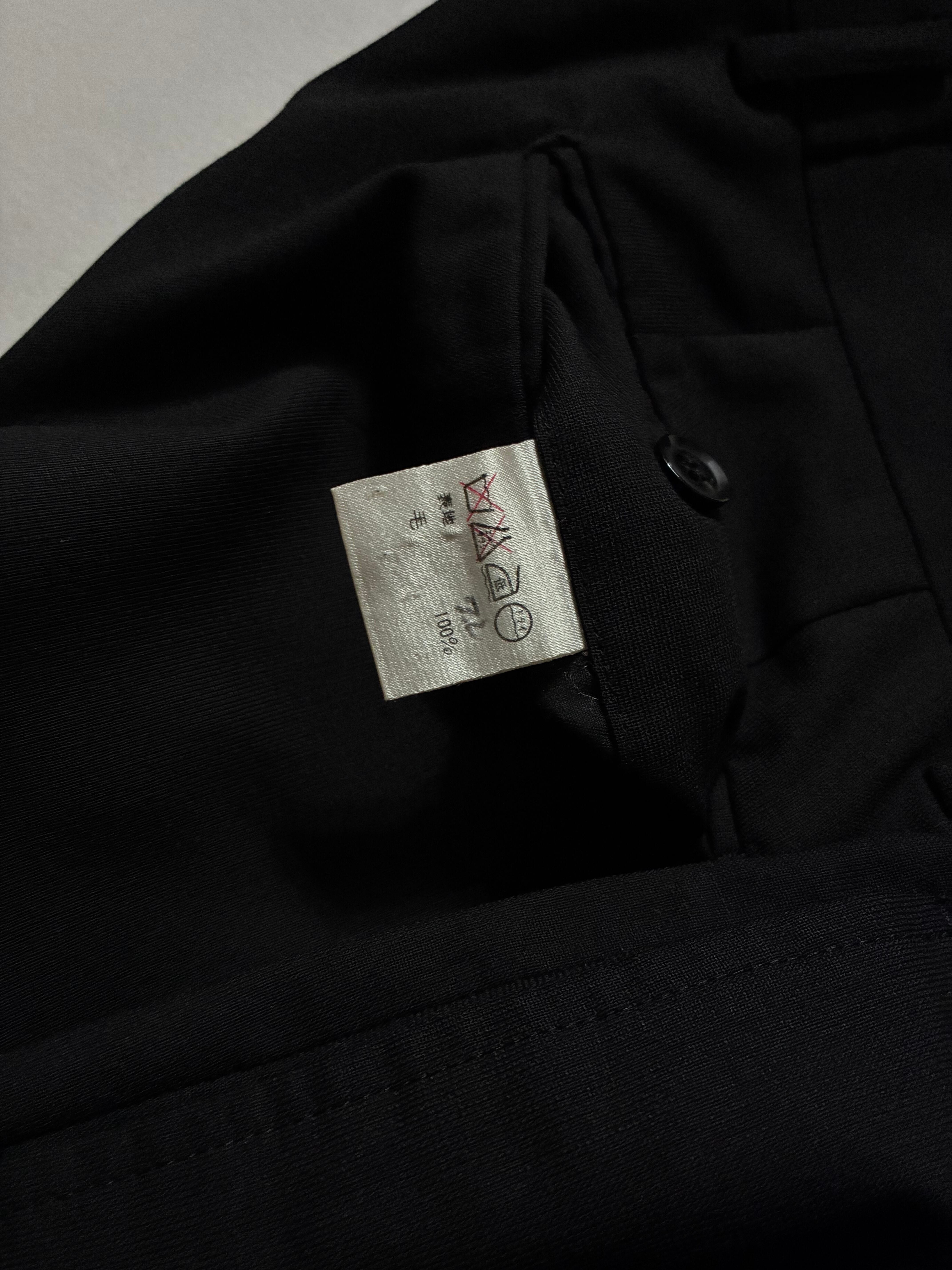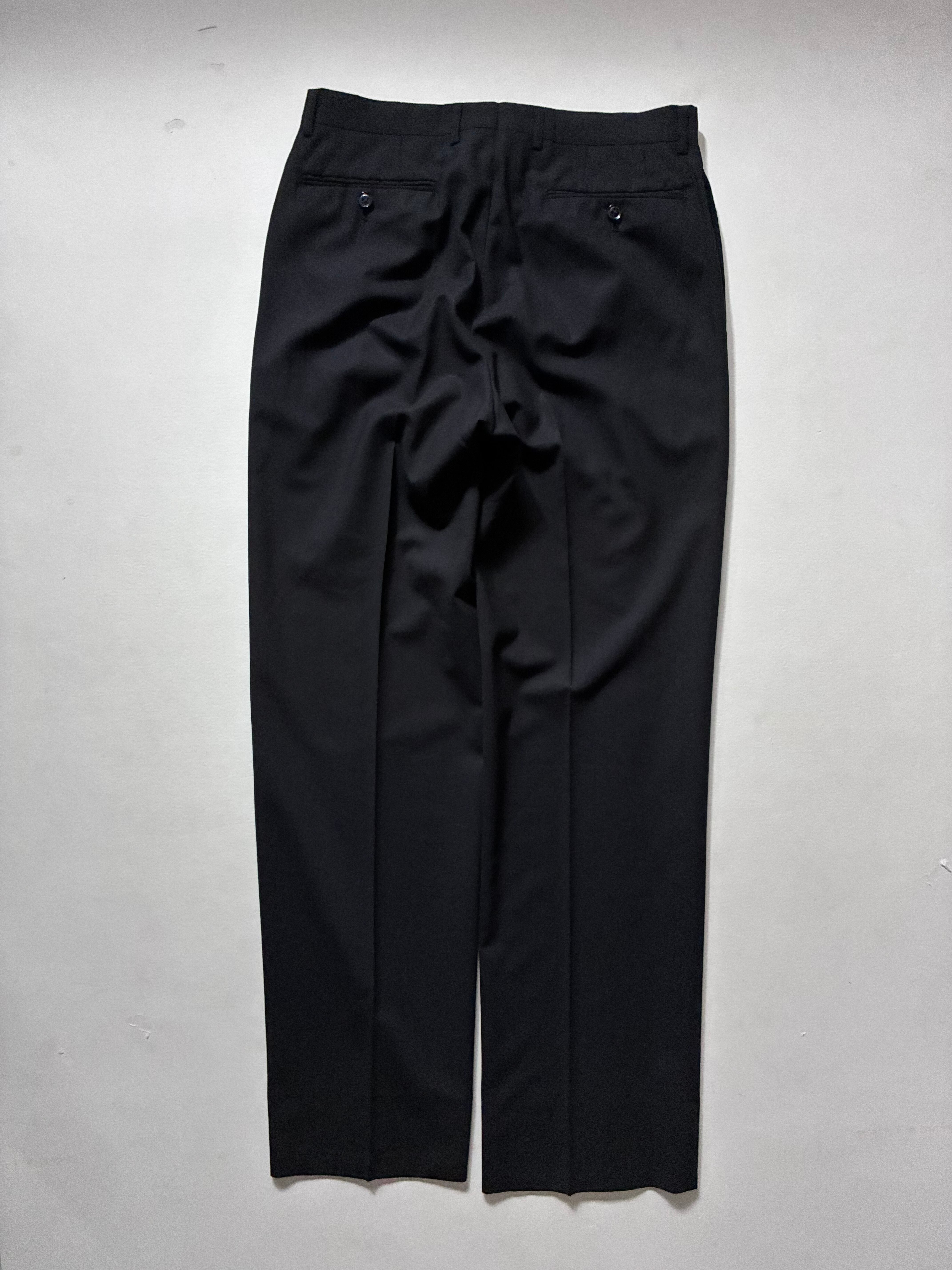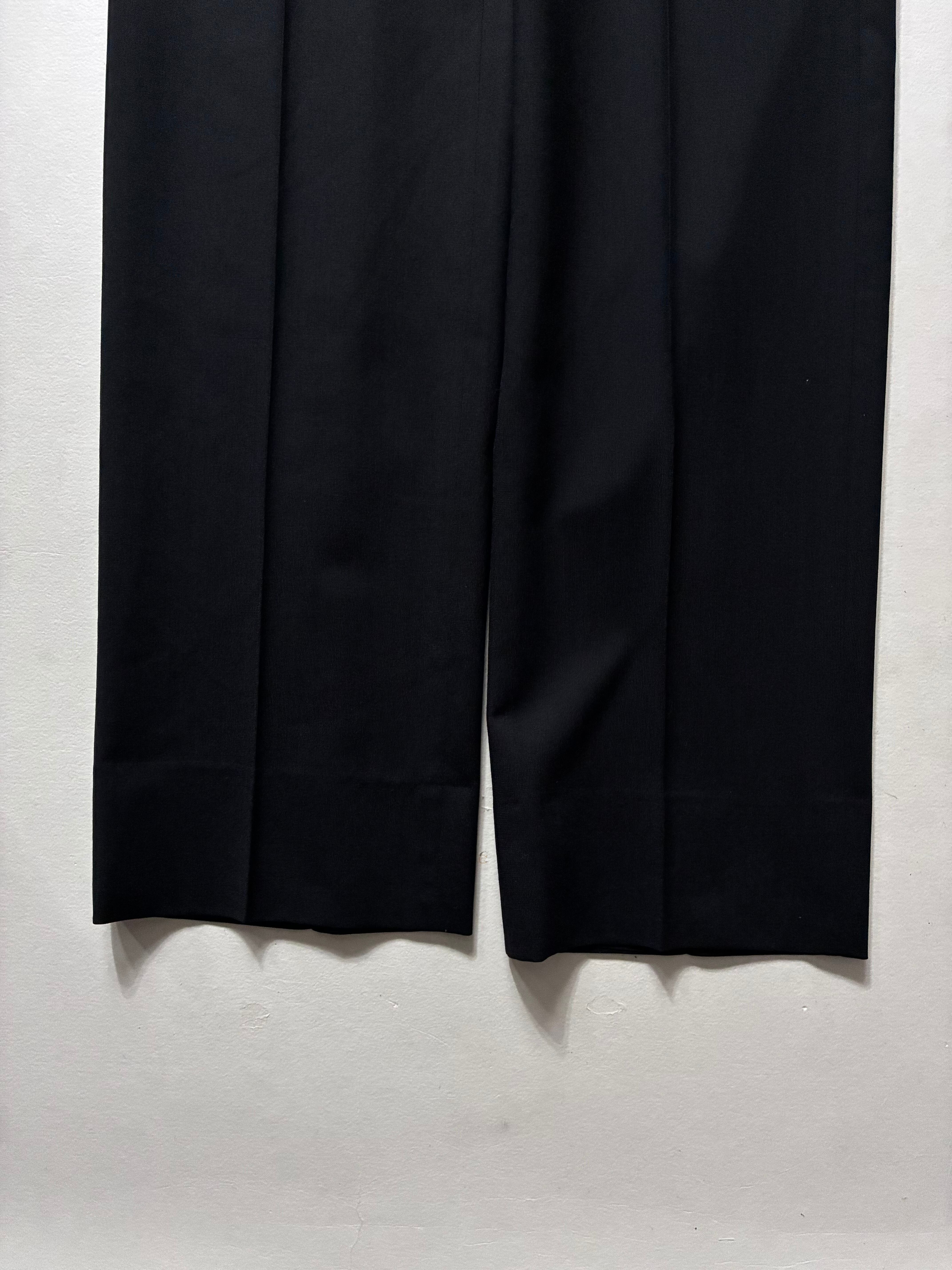 シンプルなブラックのウールスラックス。ノータックで仕上げた絶妙な微ワイドシルエットが特徴で、スタイルと快適性を両立させた一品です。シンプルながらも存在感を持ち、どのシーンでも活躍すること間違いなしです。