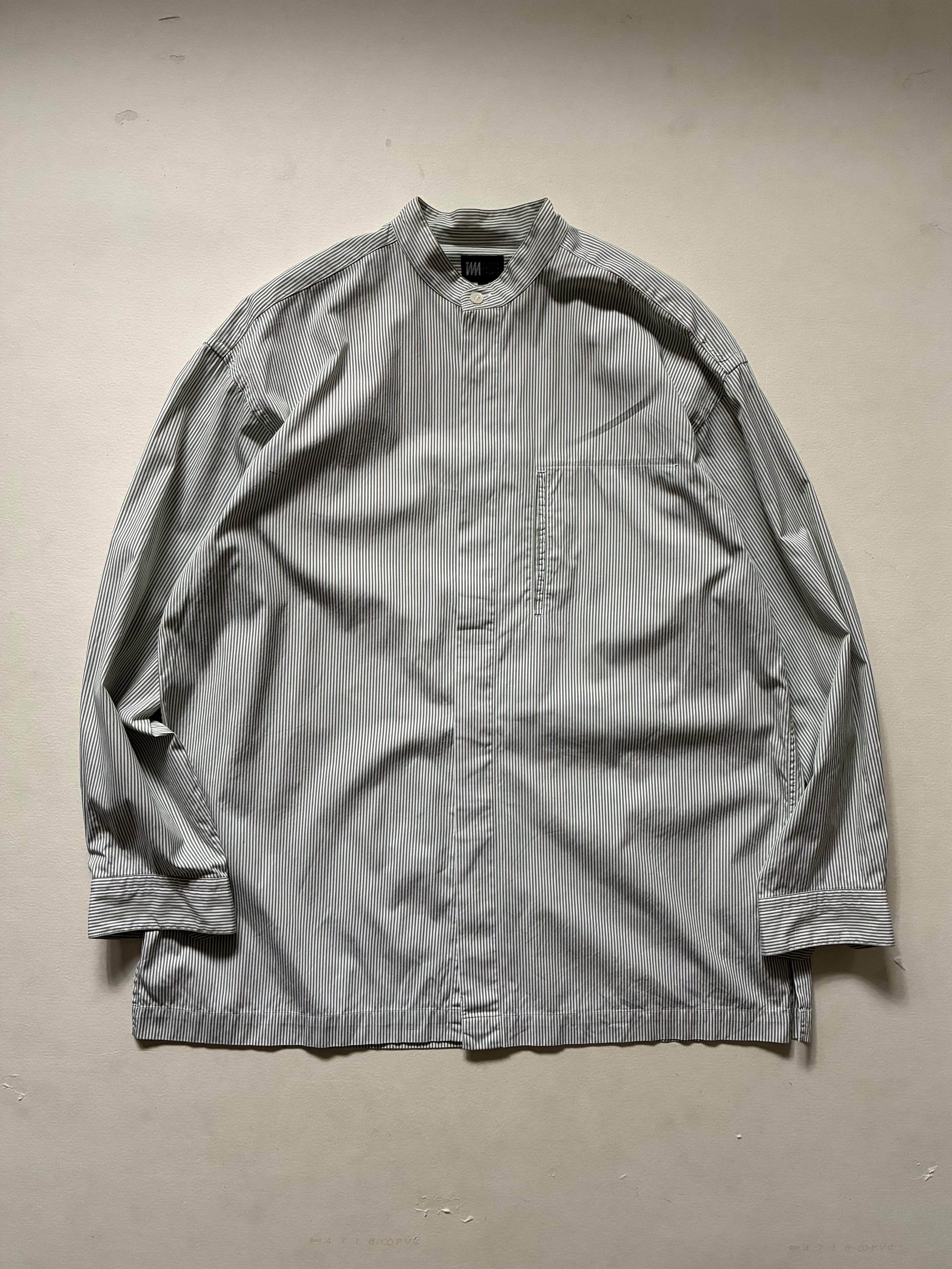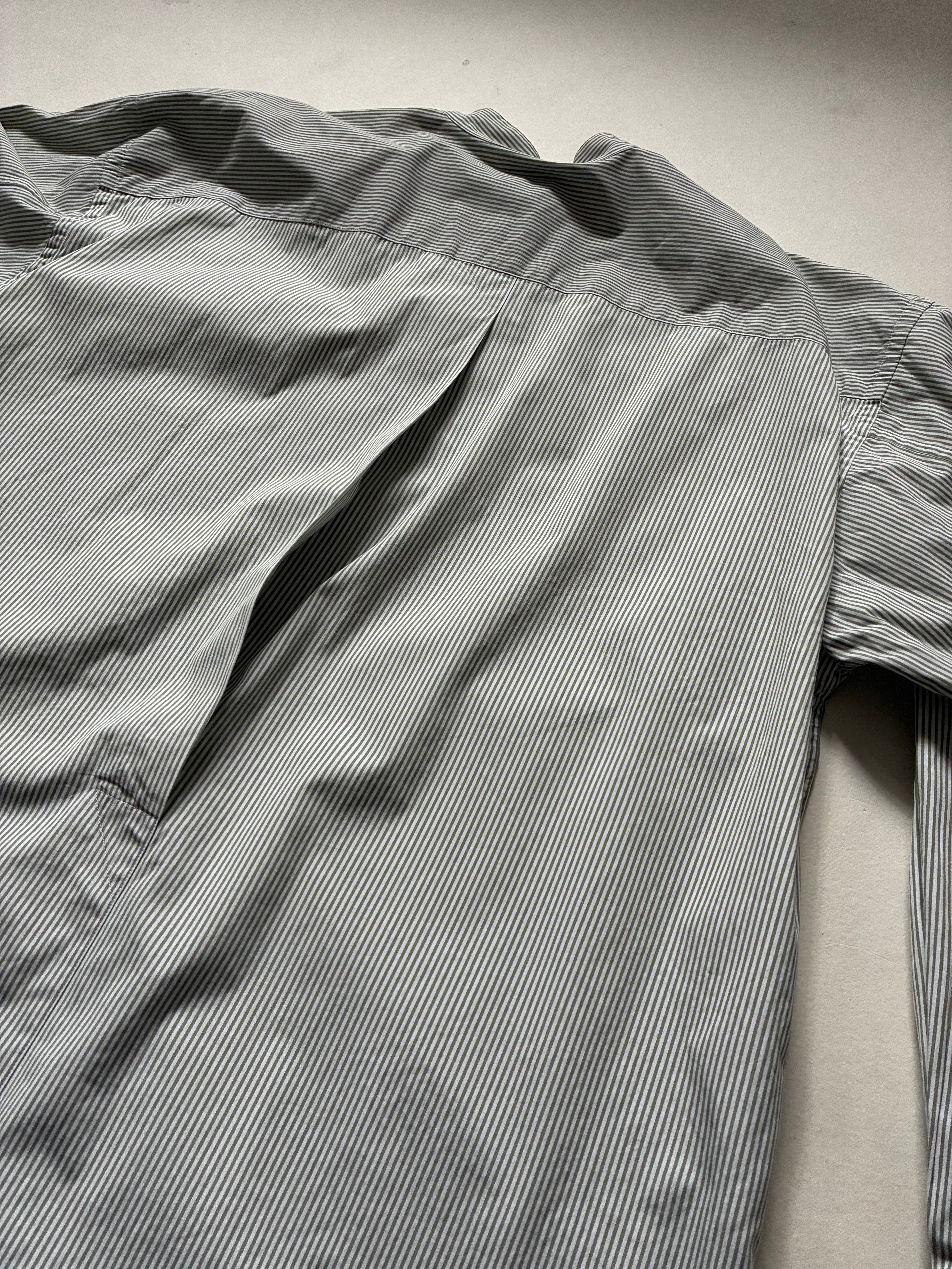 90s- im issey miyake stripe shirtは、グリーン×ホワイトのストライプが魅力のシャツです。立ち襟にボックスカット、スリット、比翼、胸ポケットと、シンプルなシャツながらもミヤケらしいデザインが光ります。独自のデザインと落ち着いた色合いが、コーディネートの幅を広げてくれる一枚です。