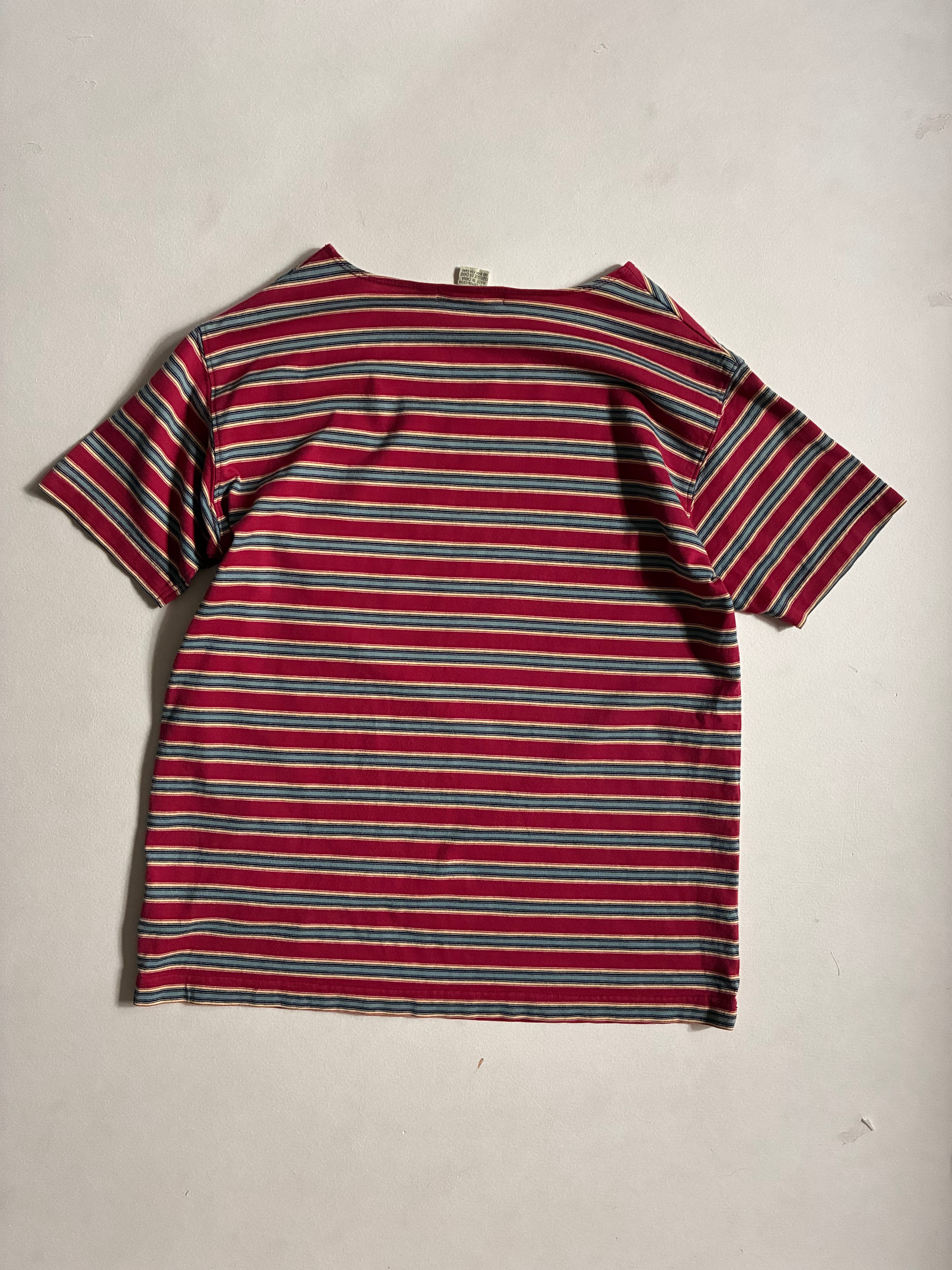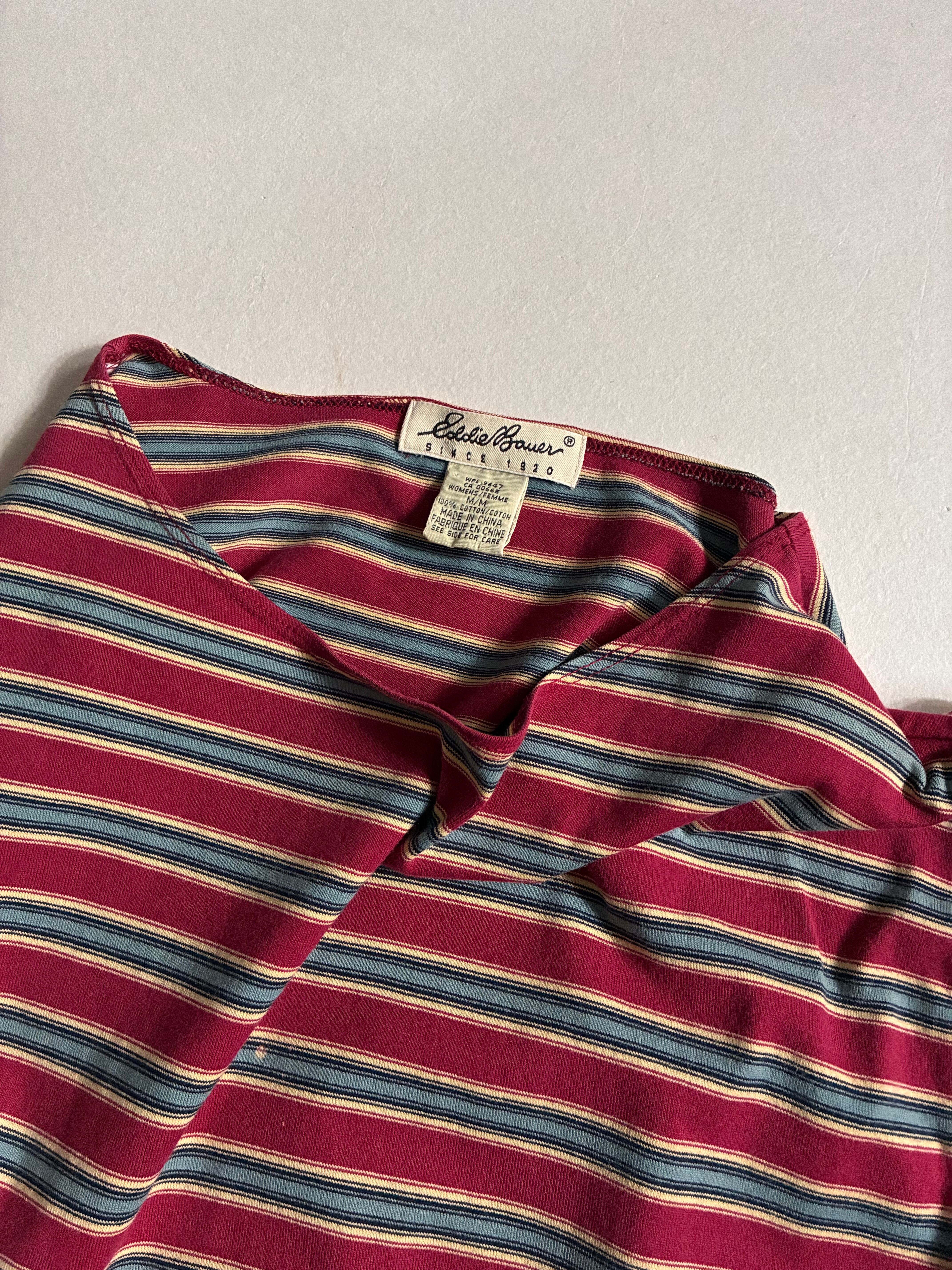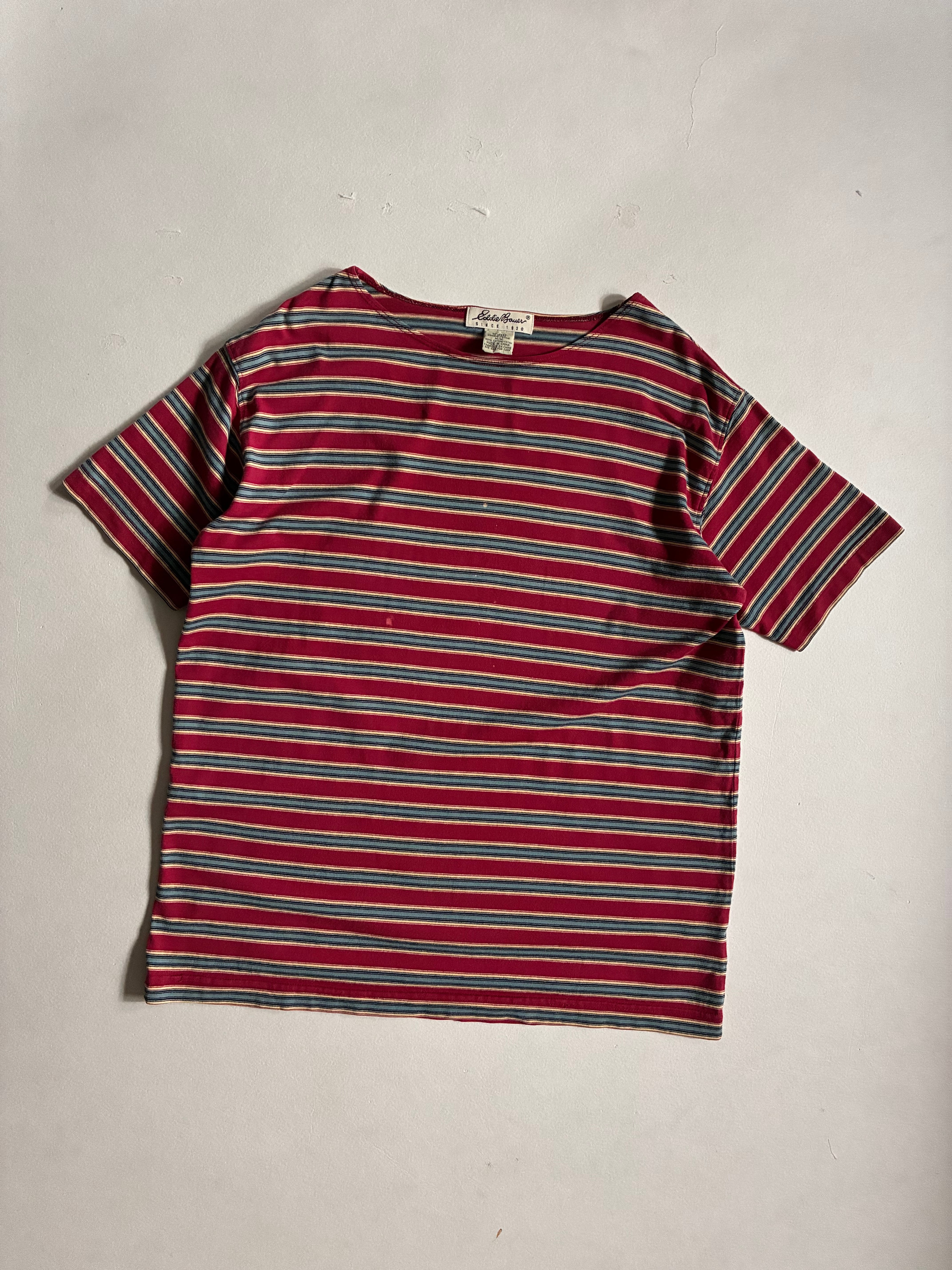 00s- eddie bauer border T-shirtは、ナイスなカラーのボーダーTシャツです。襟のリブがないスッキリとしたデザインが魅力で、シンプルながらも洗練された印象を与えます。さらりとした着心地で、様々なスタイルに対応可能です。