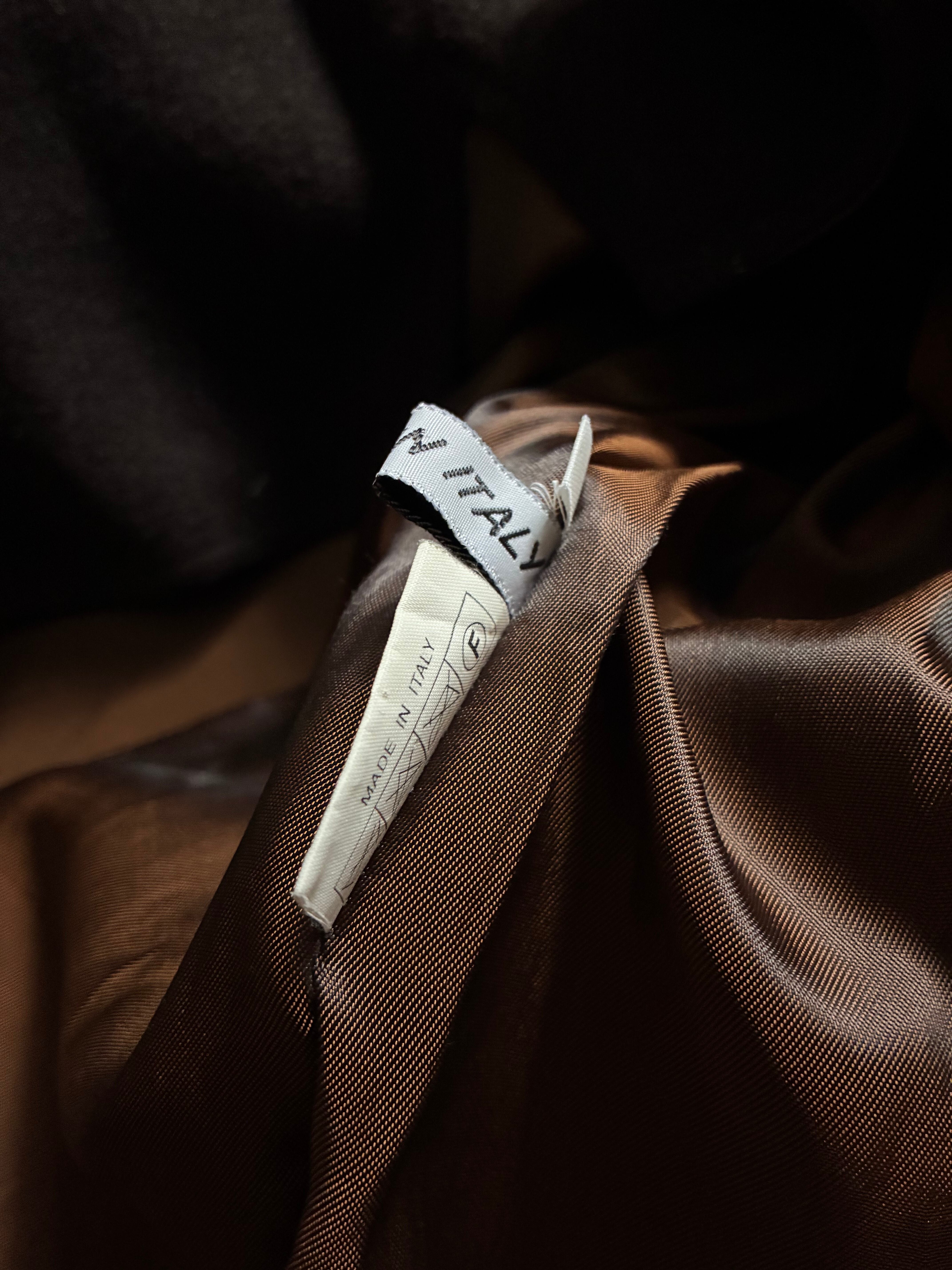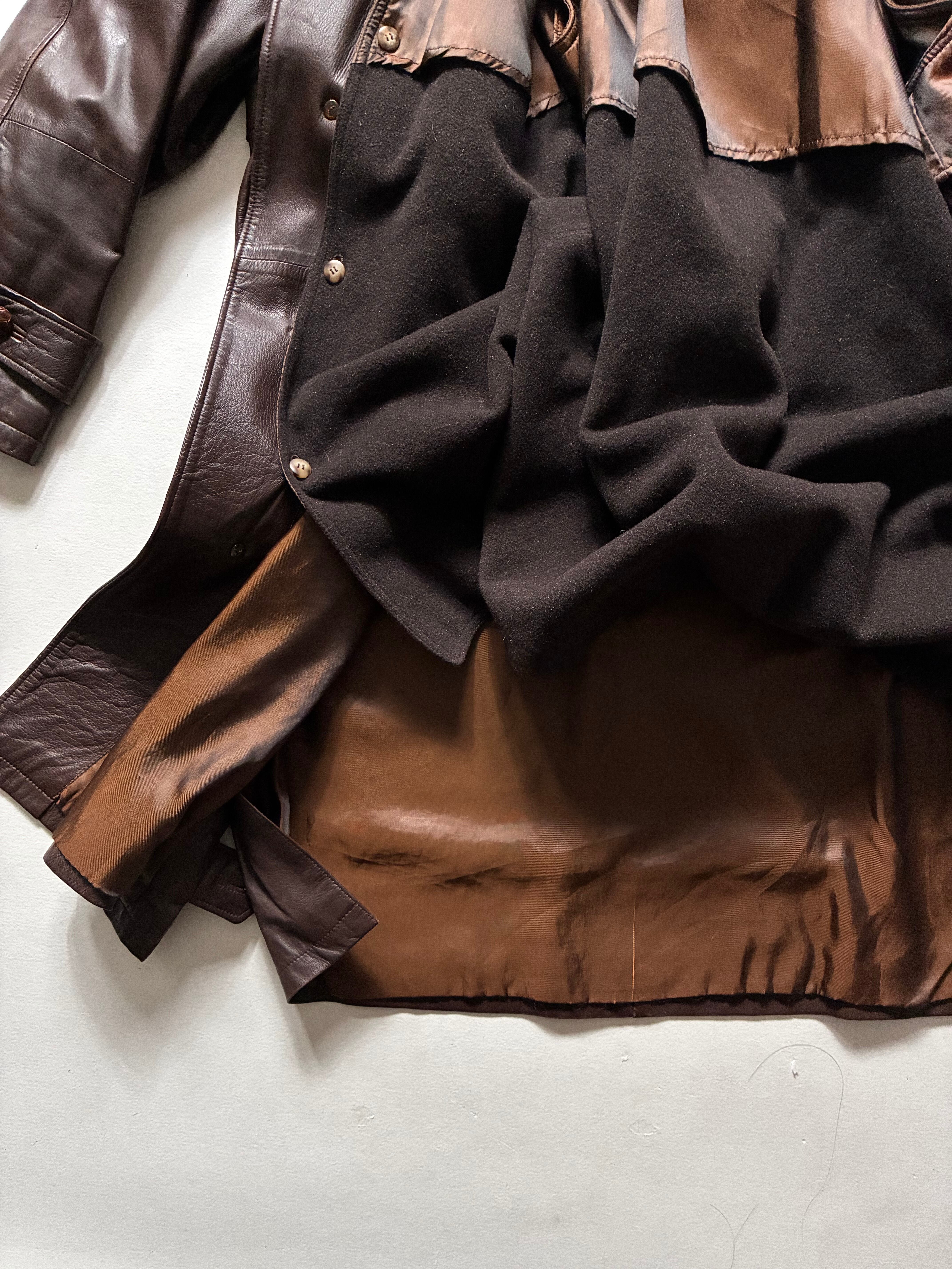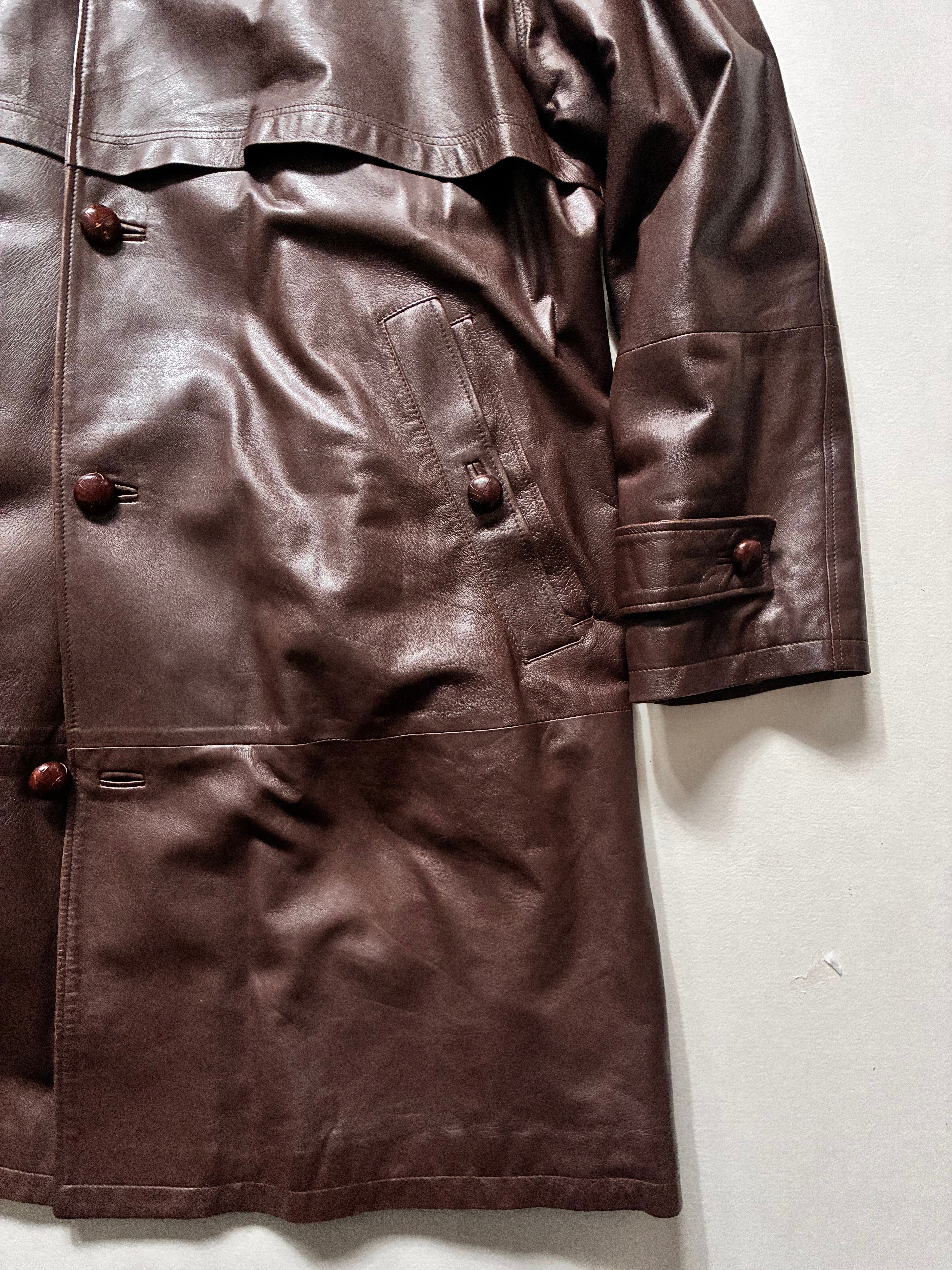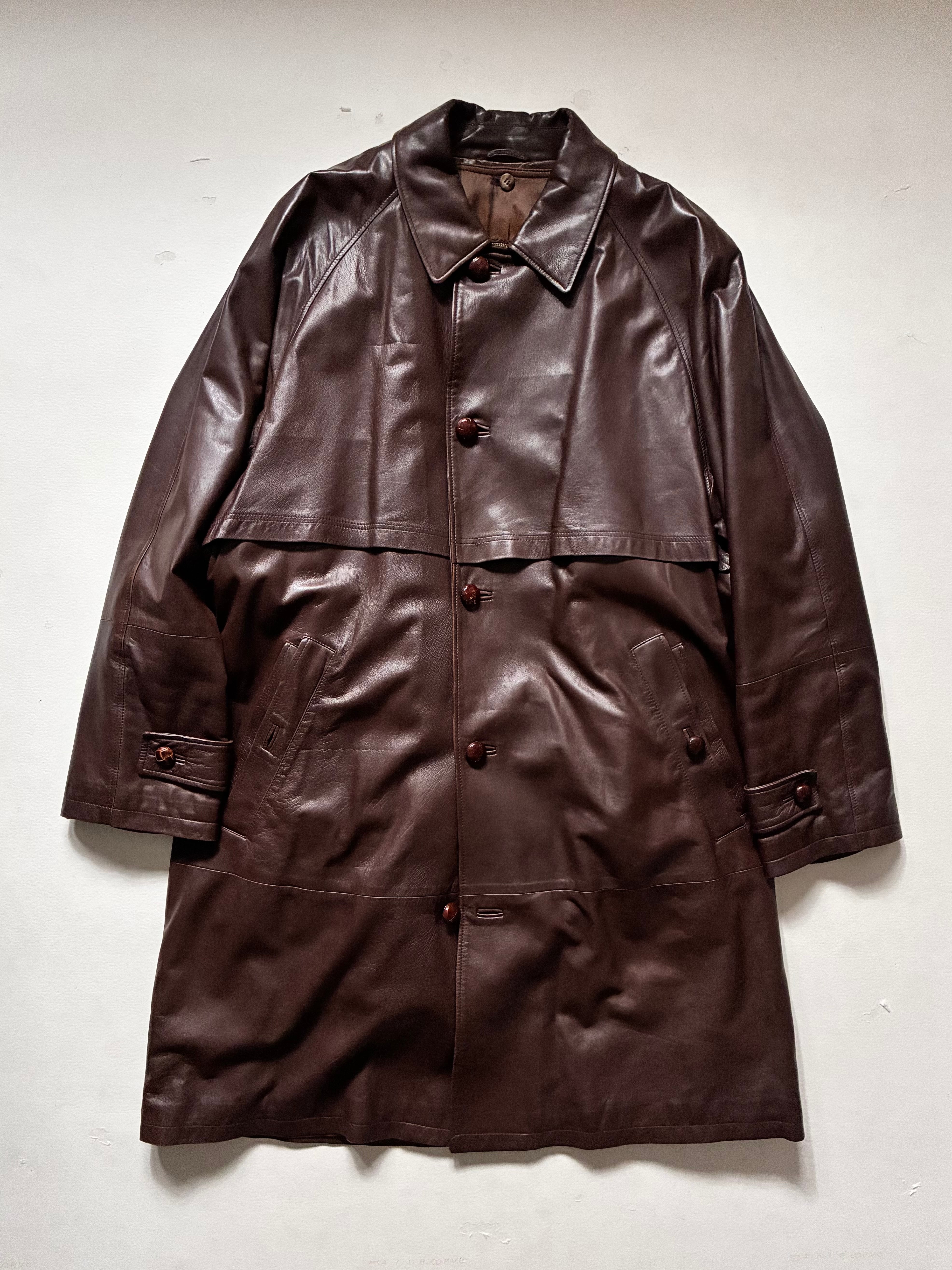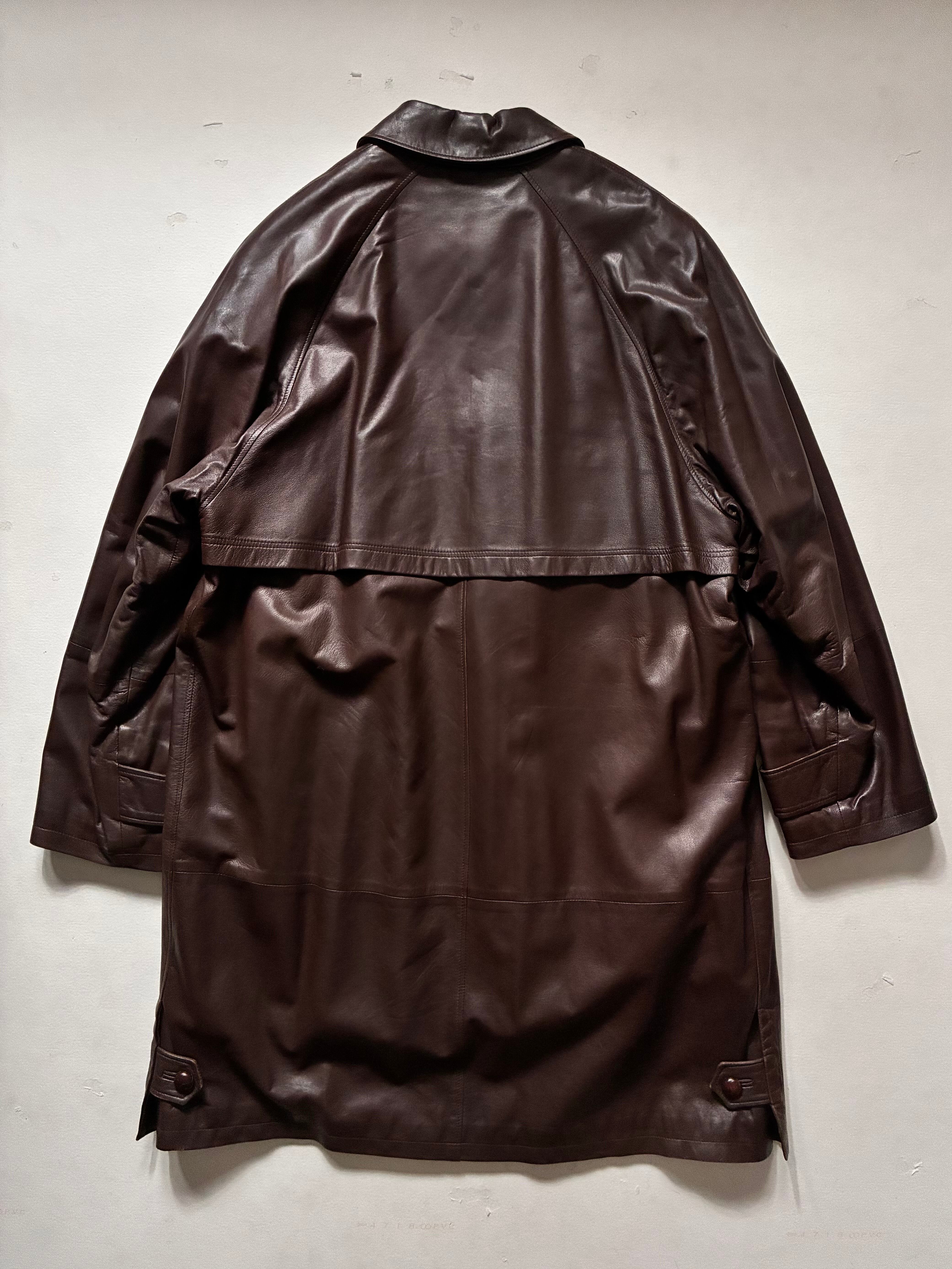 しなやかなダークブラウンのレザーコートです。取り外し可能なライナーが付いており、長いシーズンを通してご活用いただけます。ゆったりとしたサイズ感と丸いシルエットが特徴で、レザーコート特有のマトリックス感がなく、ラグランの肩の落ちも絶妙です。