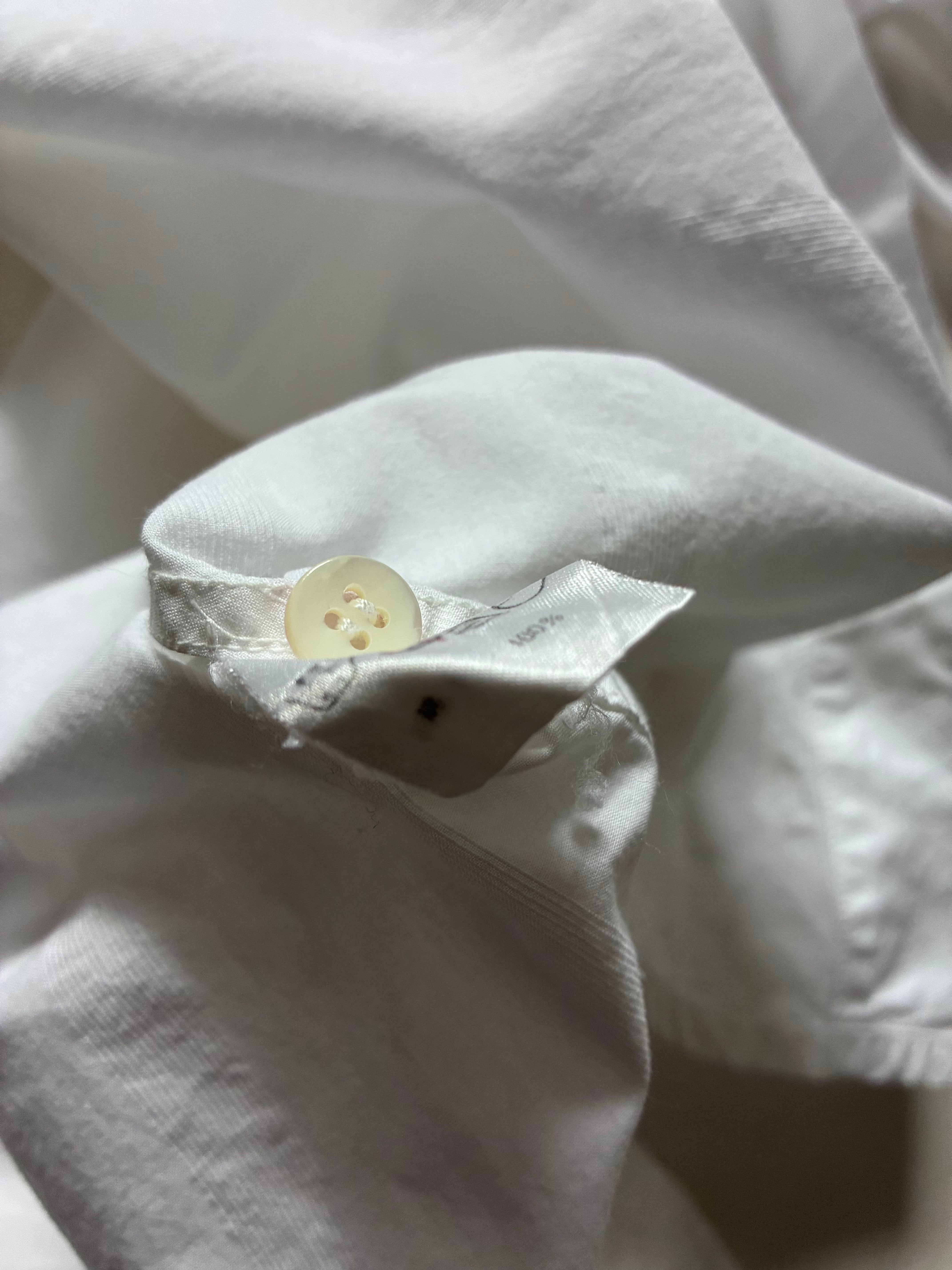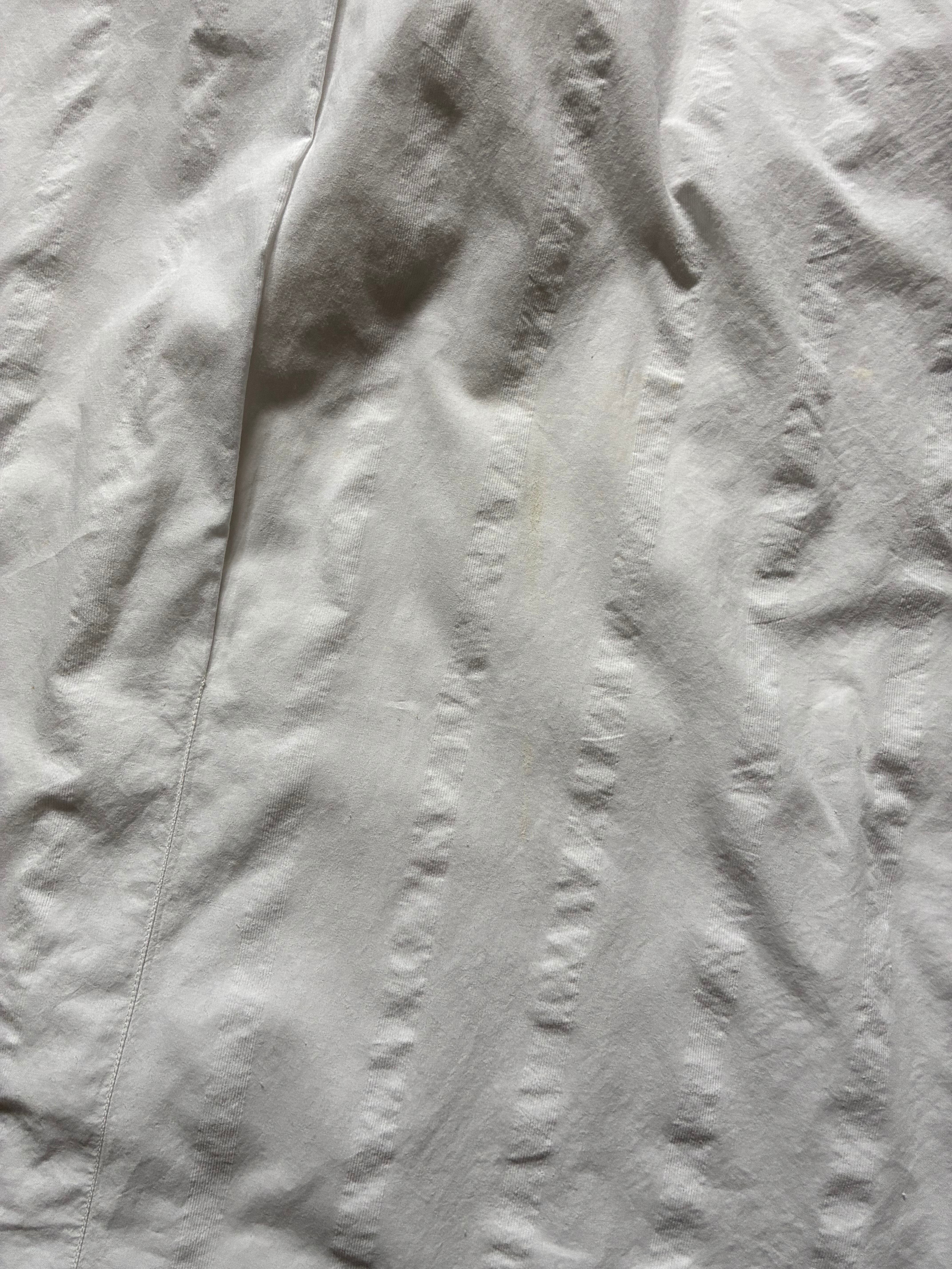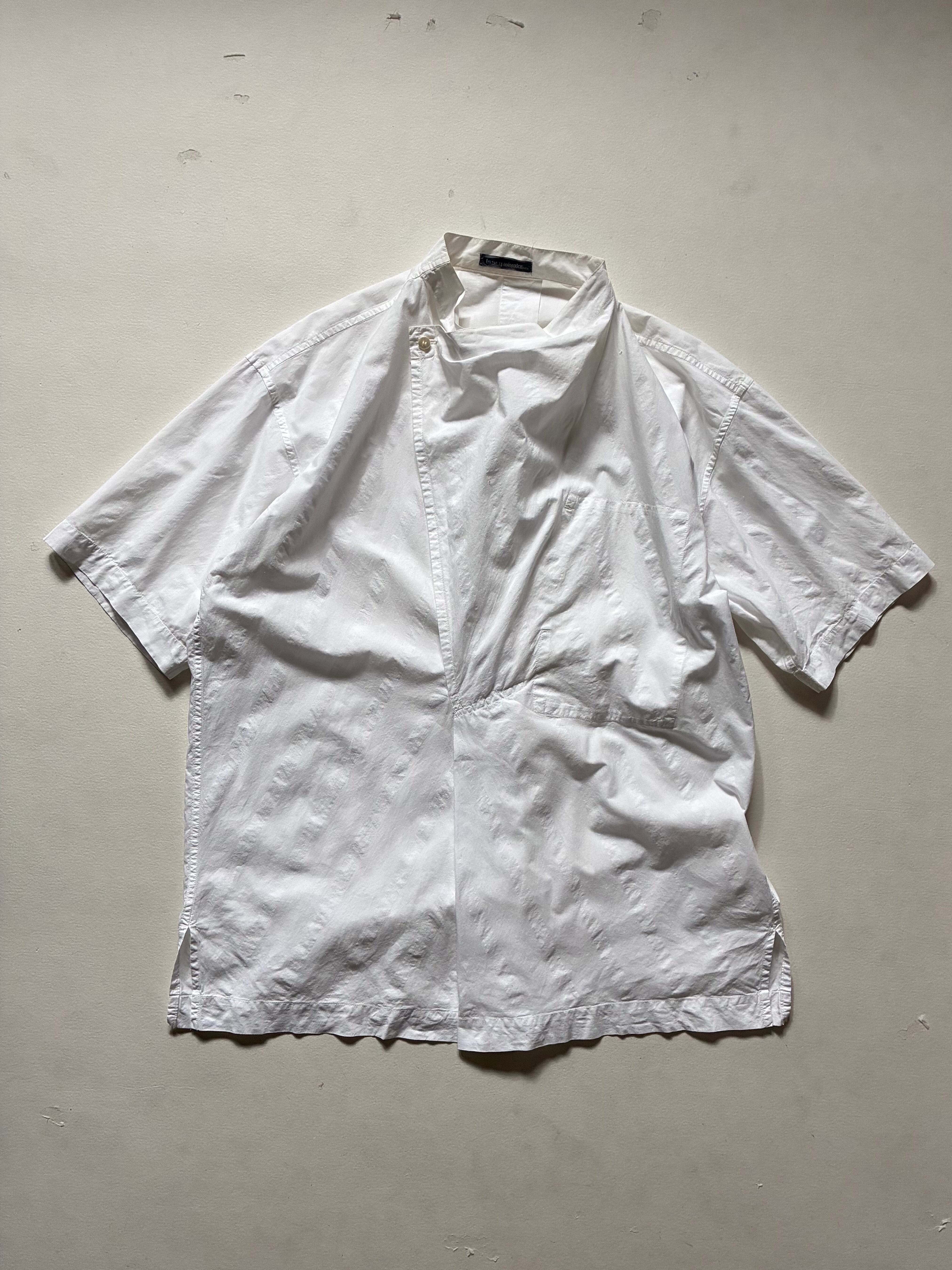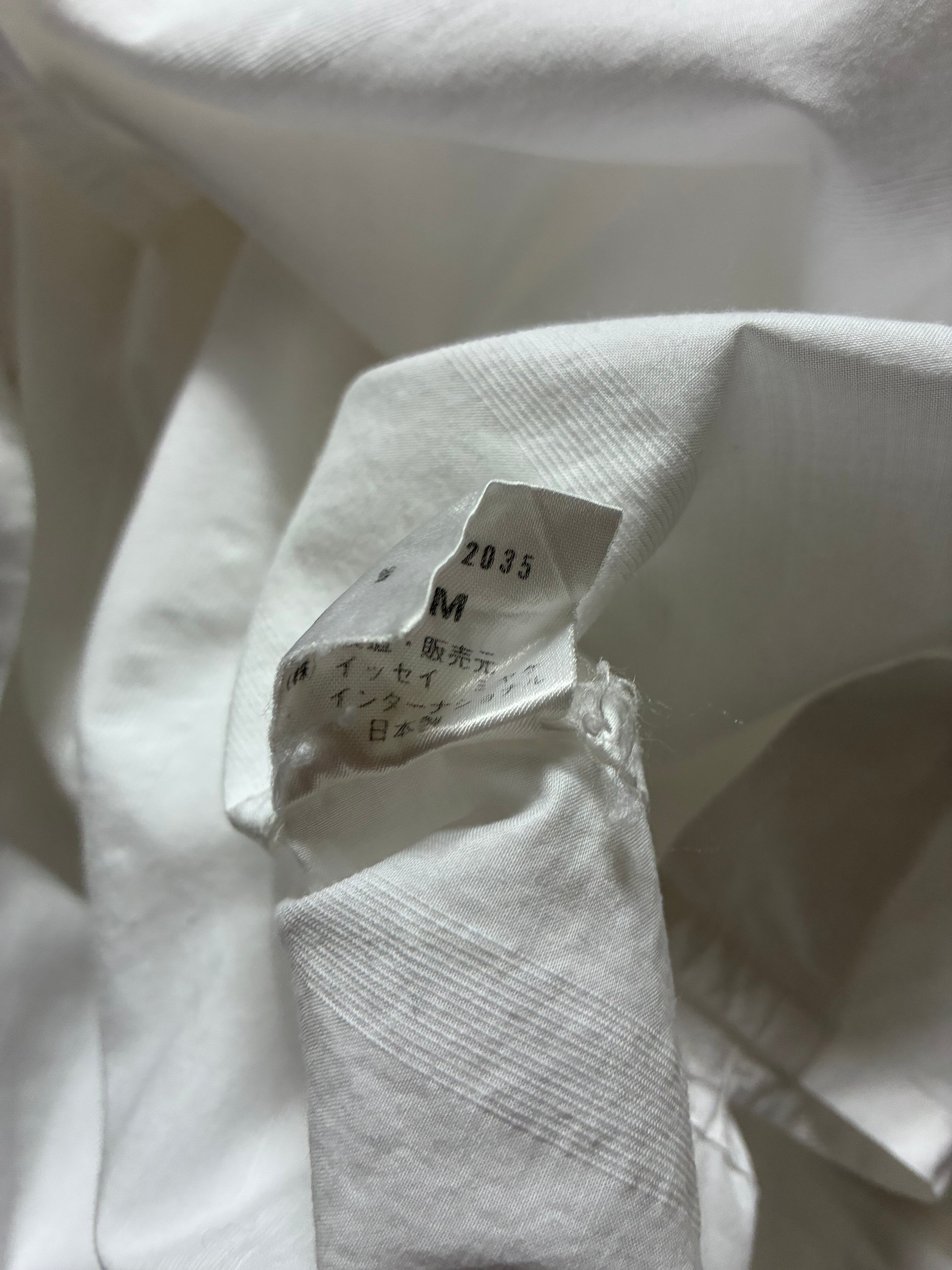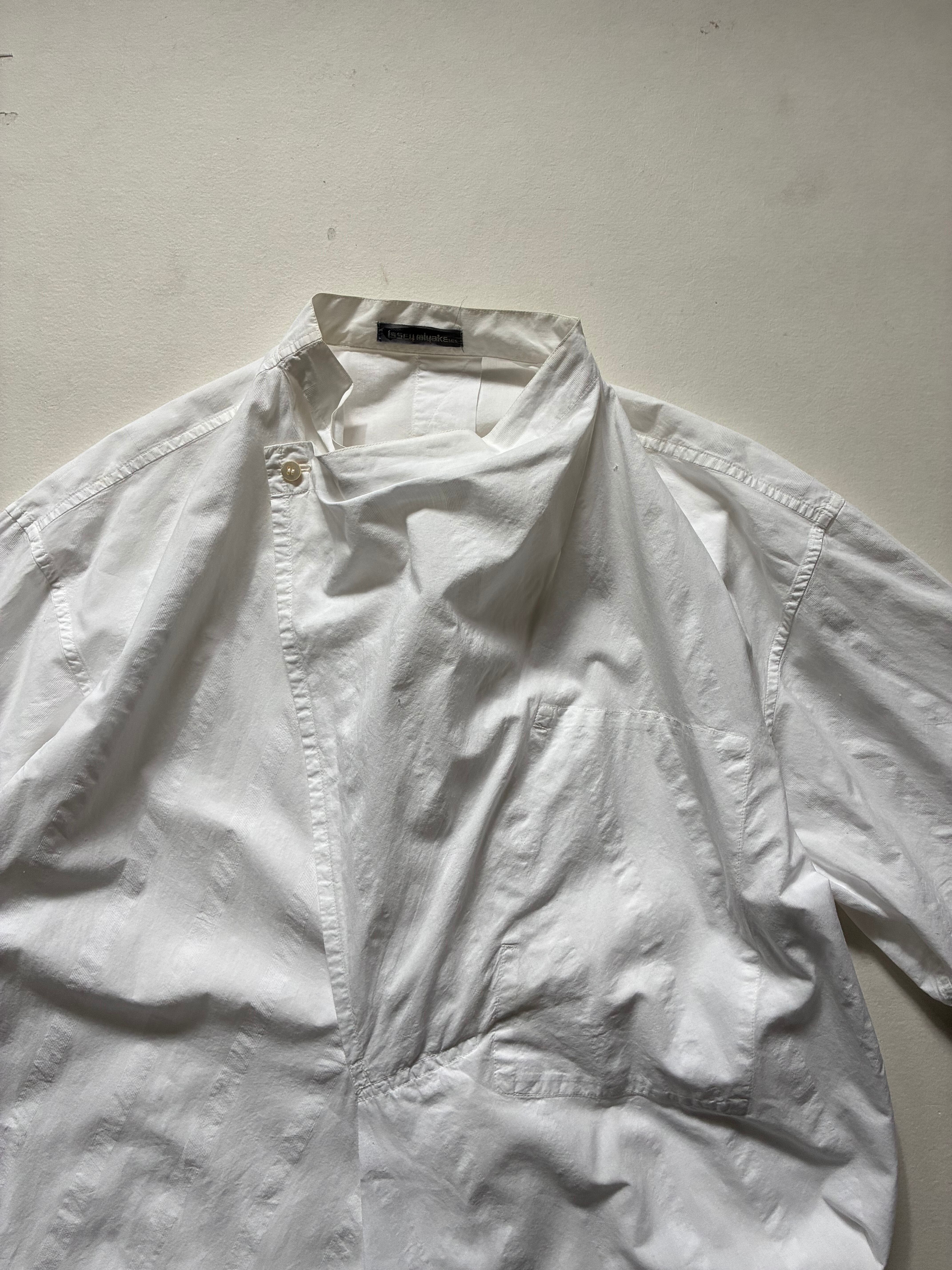 80年代のイッセイミヤケが放つ独特の魅力を持つストライプシャツです。変わった襟パターンと太いシアサッカーのような素材感が特徴で、同色のストライプがシンプルながらも洗練された印象を与えます。