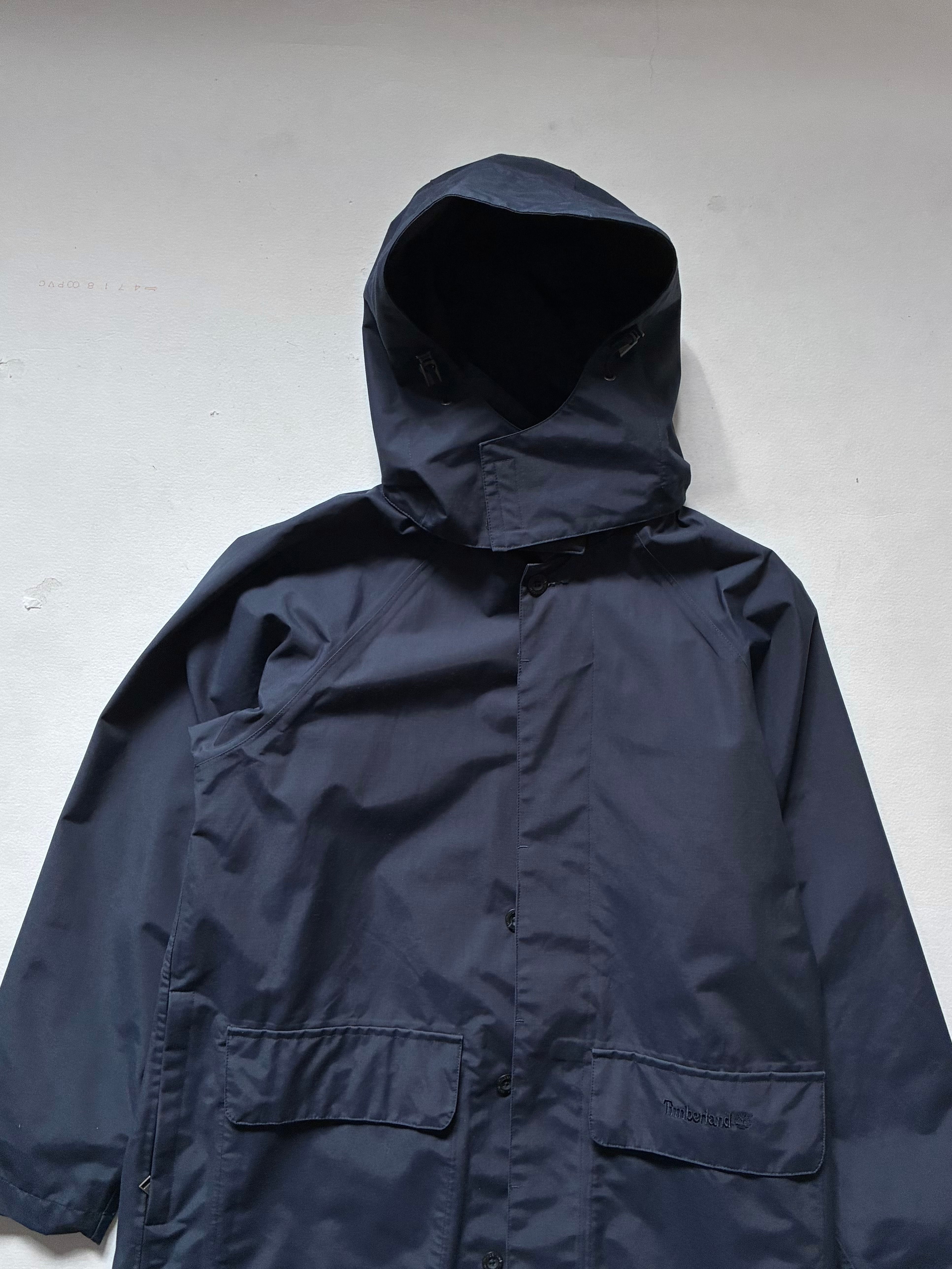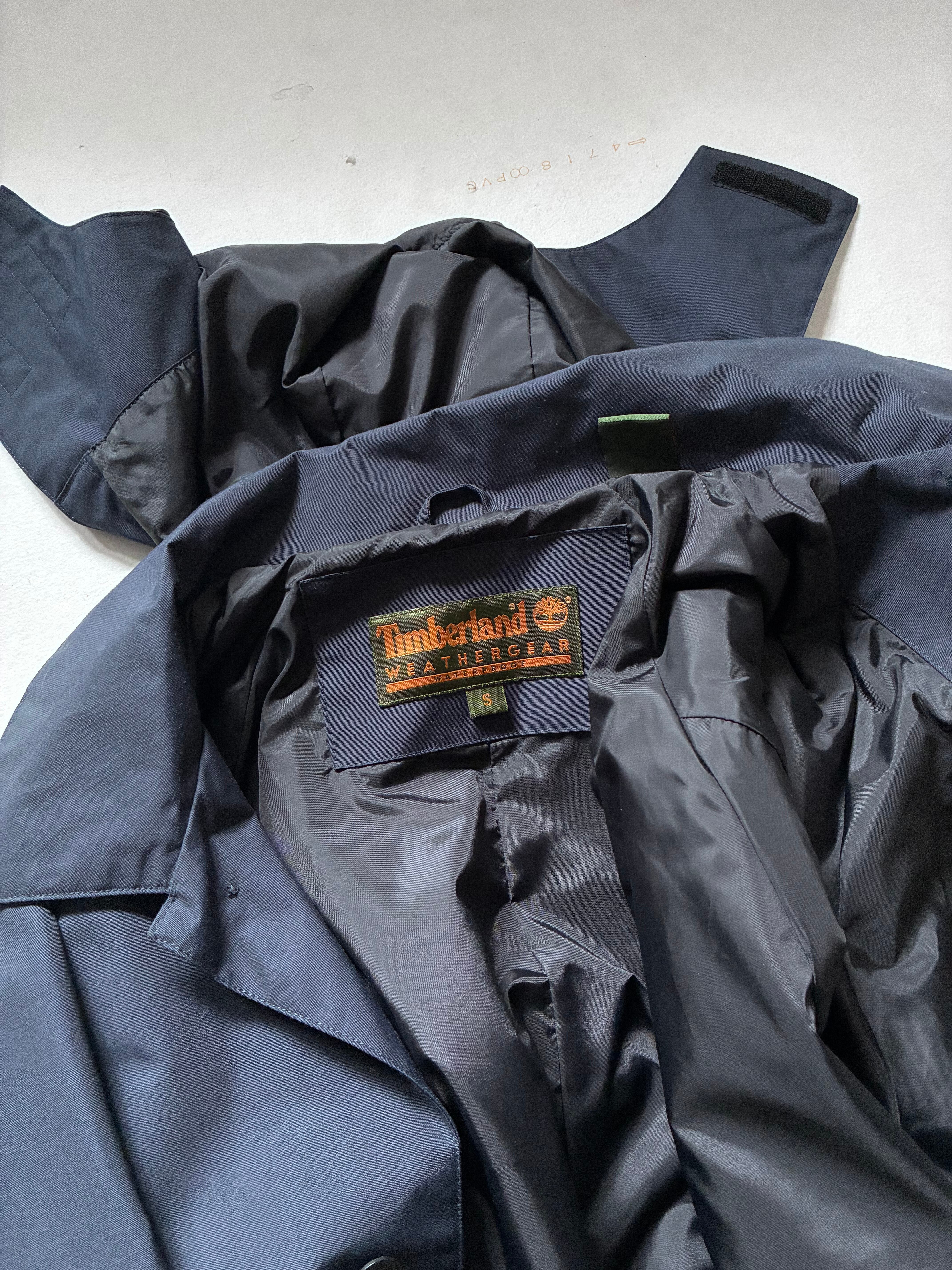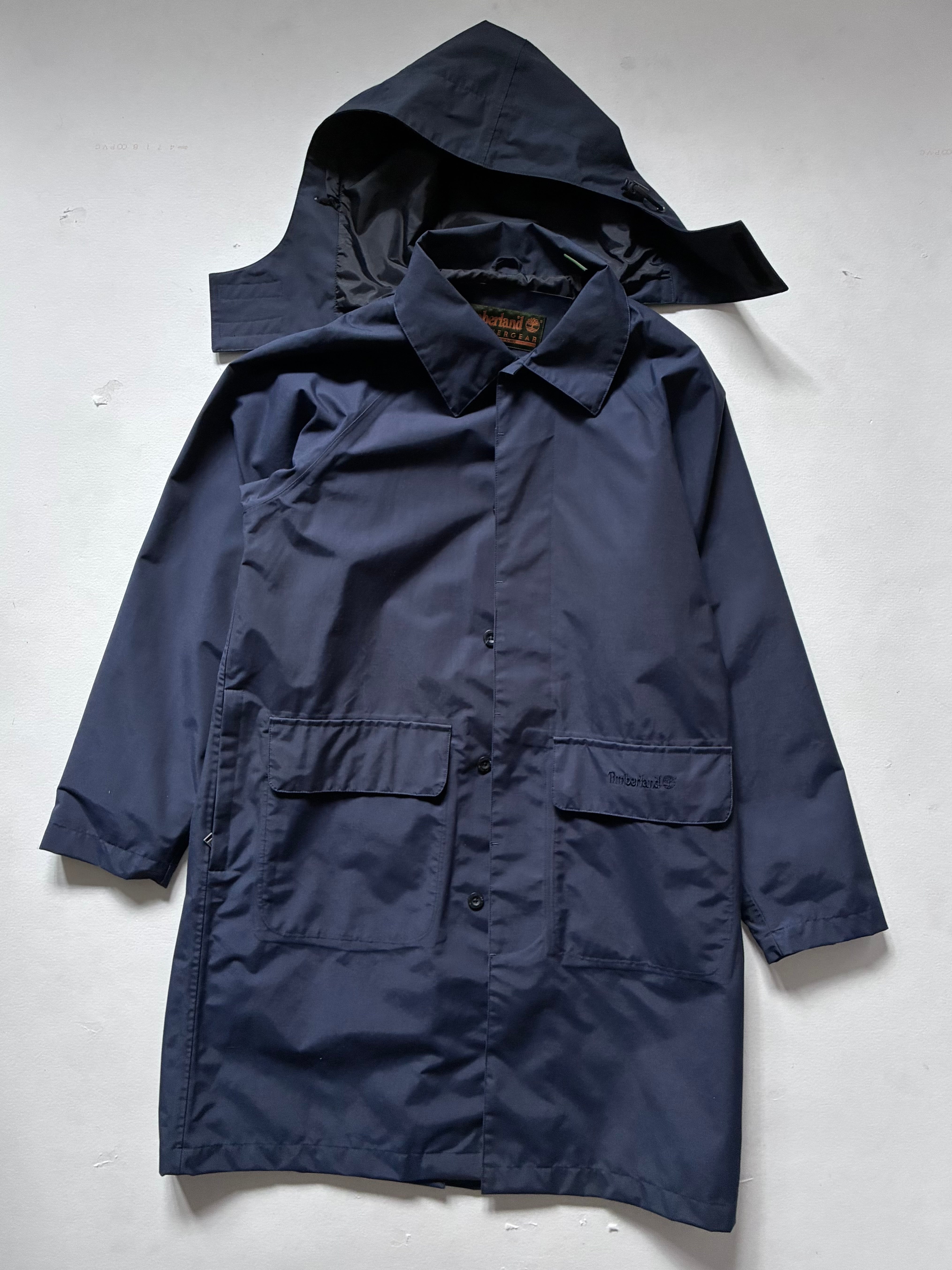 00s-ティンバーランドのウェザーギアコートは、機能性とスタイルが融合した魅力的な一着です。ソリッドなネイビーカラーに、着脱式のフード、ハリ感のあるコットンナイロン素材が特徴で、悪天候でも安心して着ることができます。