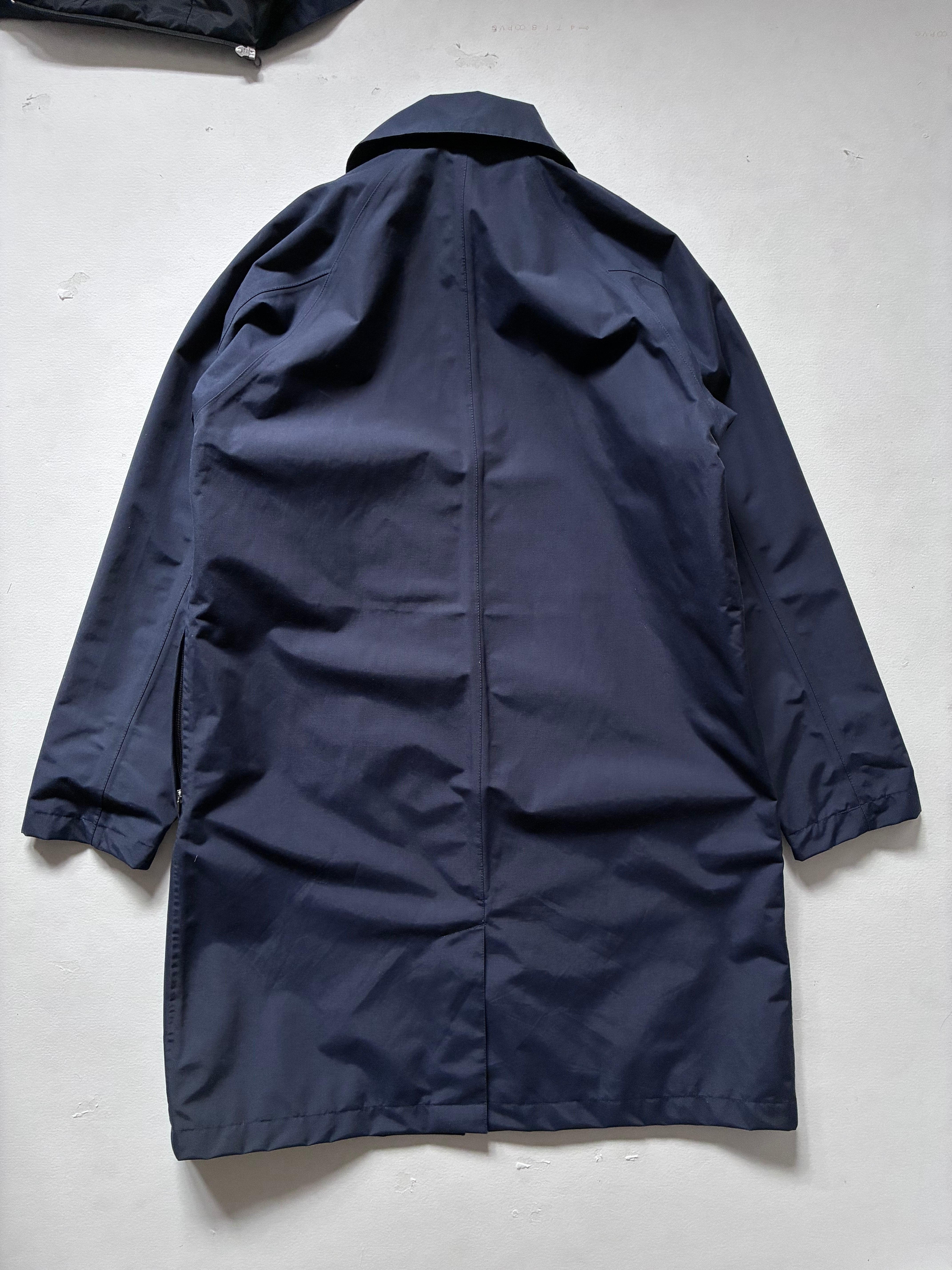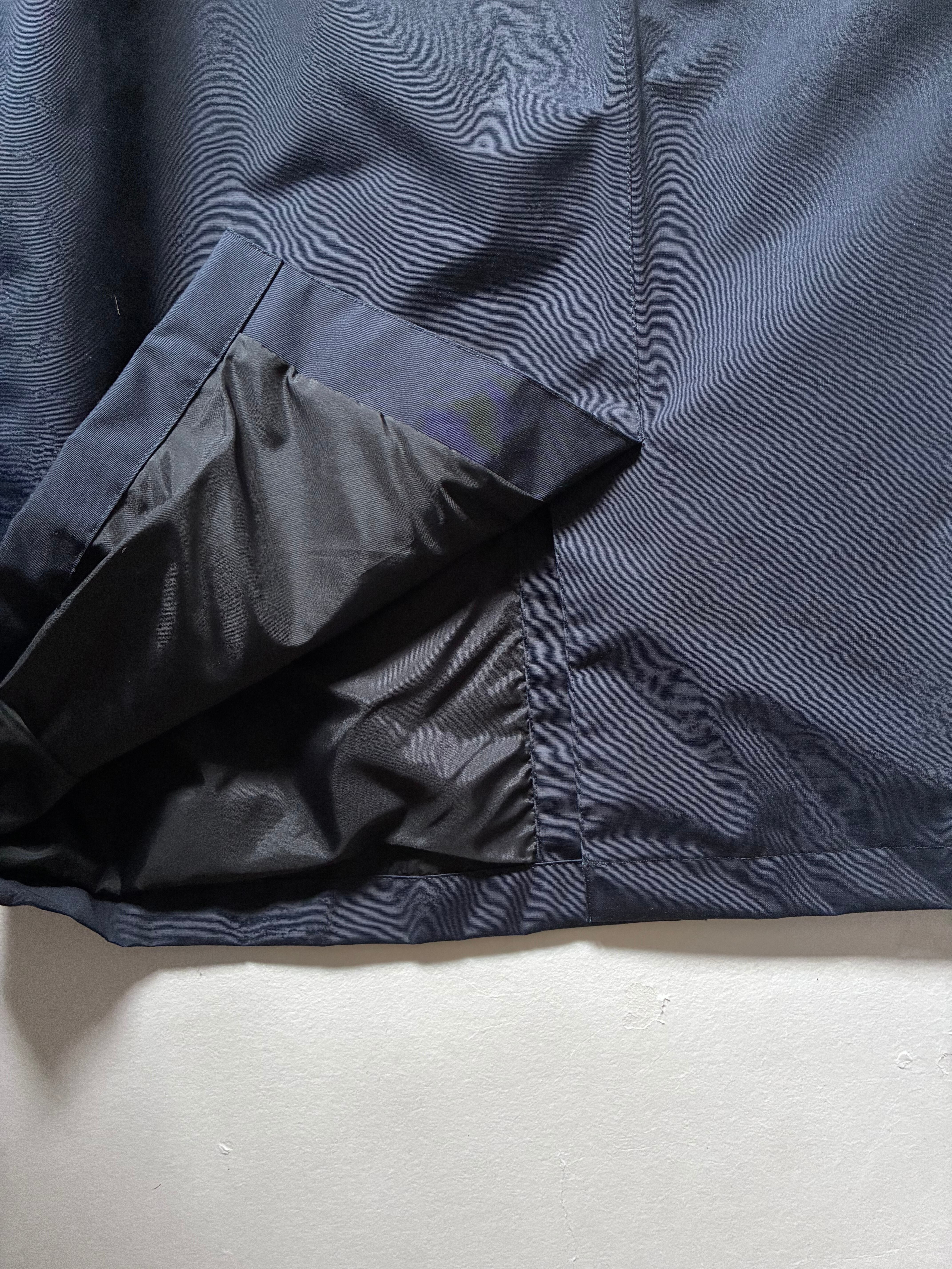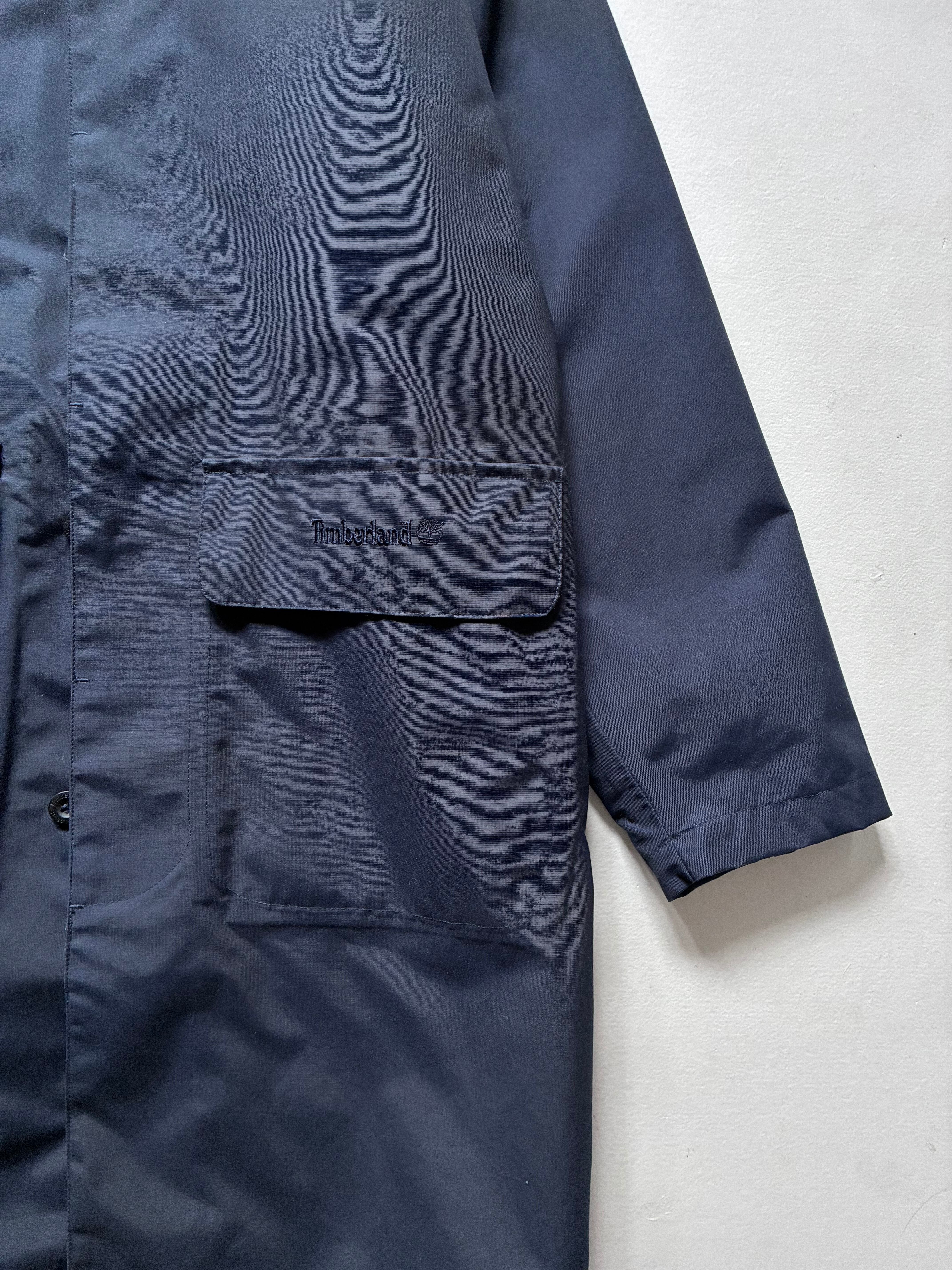 00s-ティンバーランドのウェザーギアコートは、機能性とスタイルが融合した魅力的な一着です。ソリッドなネイビーカラーに、着脱式のフード、ハリ感のあるコットンナイロン素材が特徴で、悪天候でも安心して着ることができます。