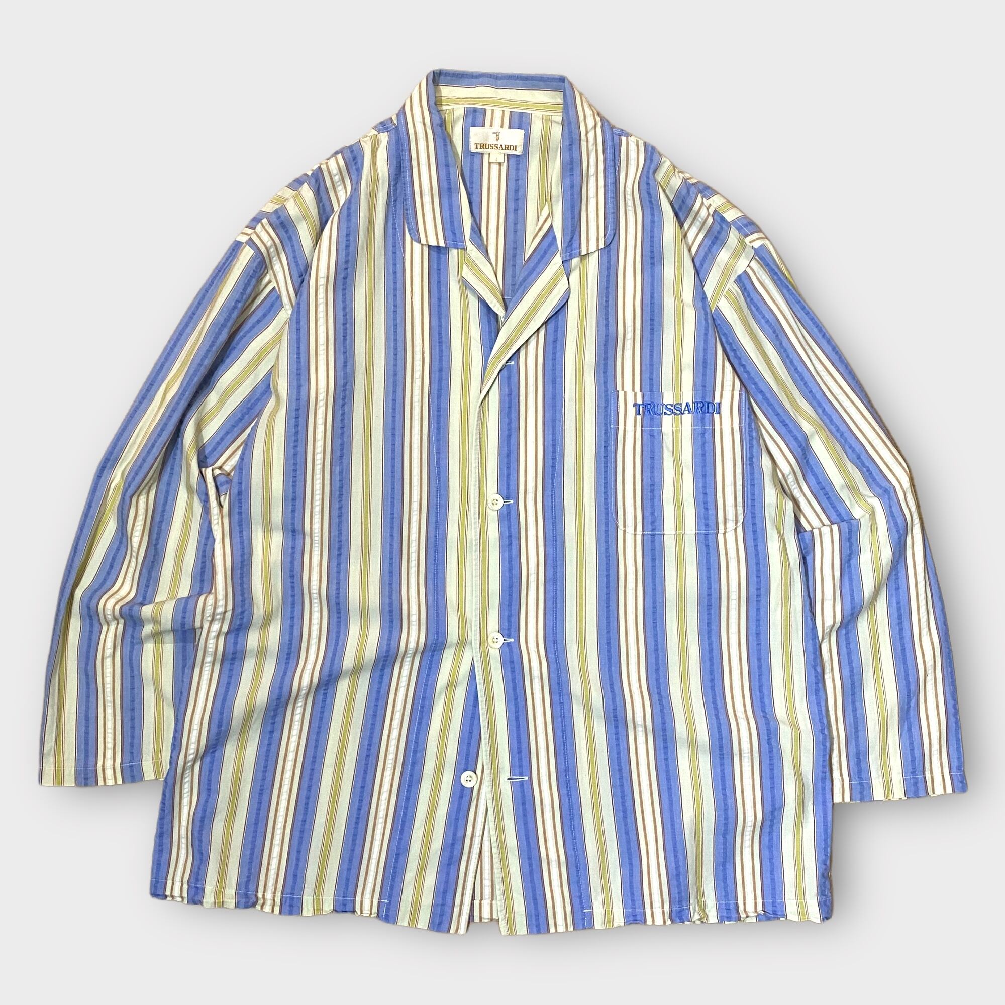 90s TRUSSARDIパジャマジャケットは、軽さと品のあるストライプ柄が特徴的。着心地の良さと洗練されたデザインでどんなシーンにも活躍します。ルームウェアとしてだけでなく、外出時の羽織りとしてもオシャレに決まる一着です。